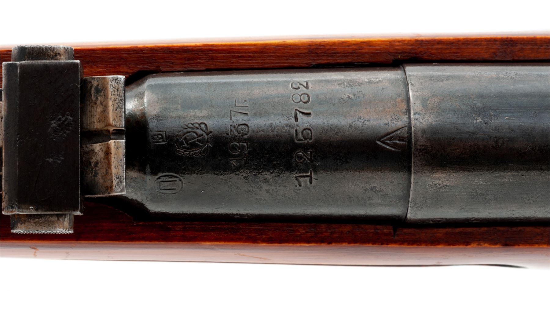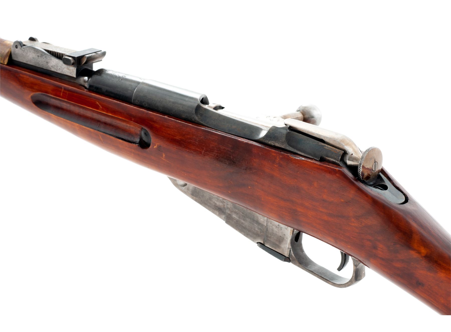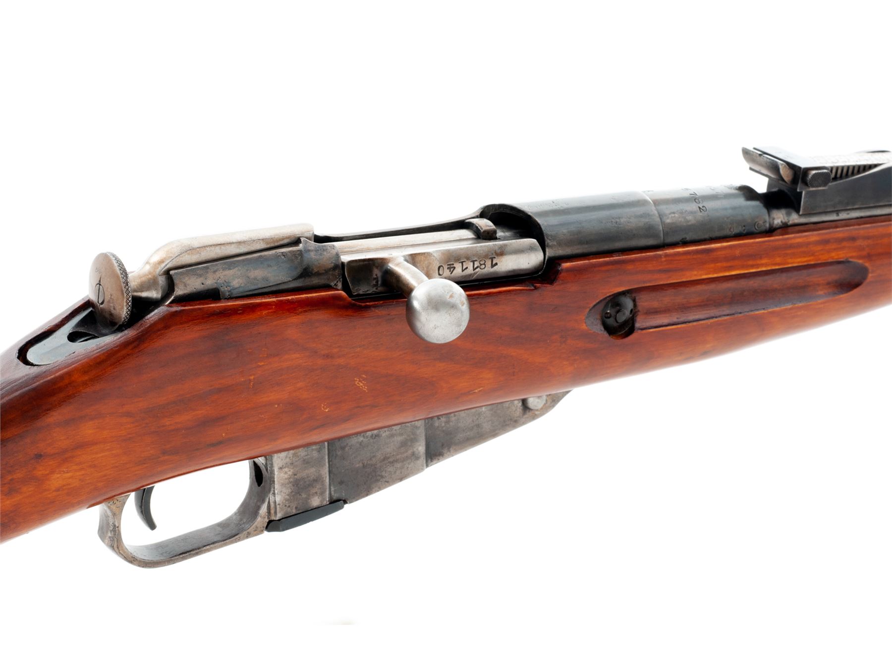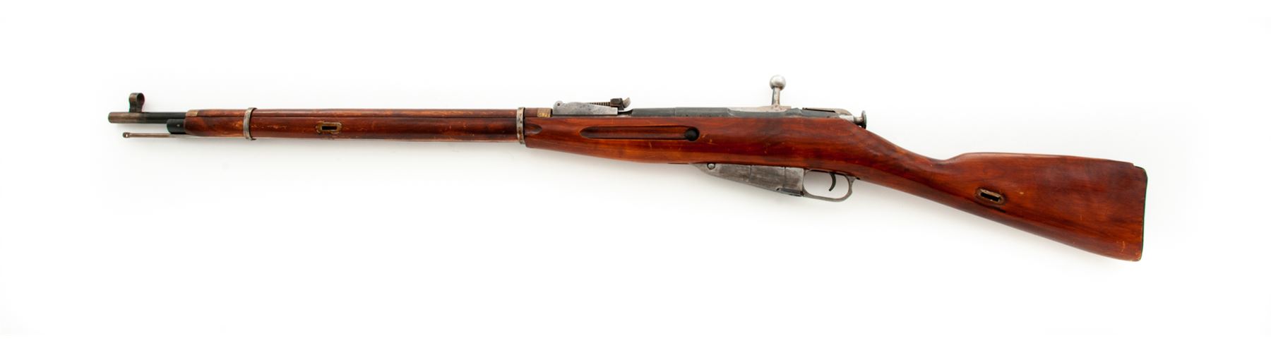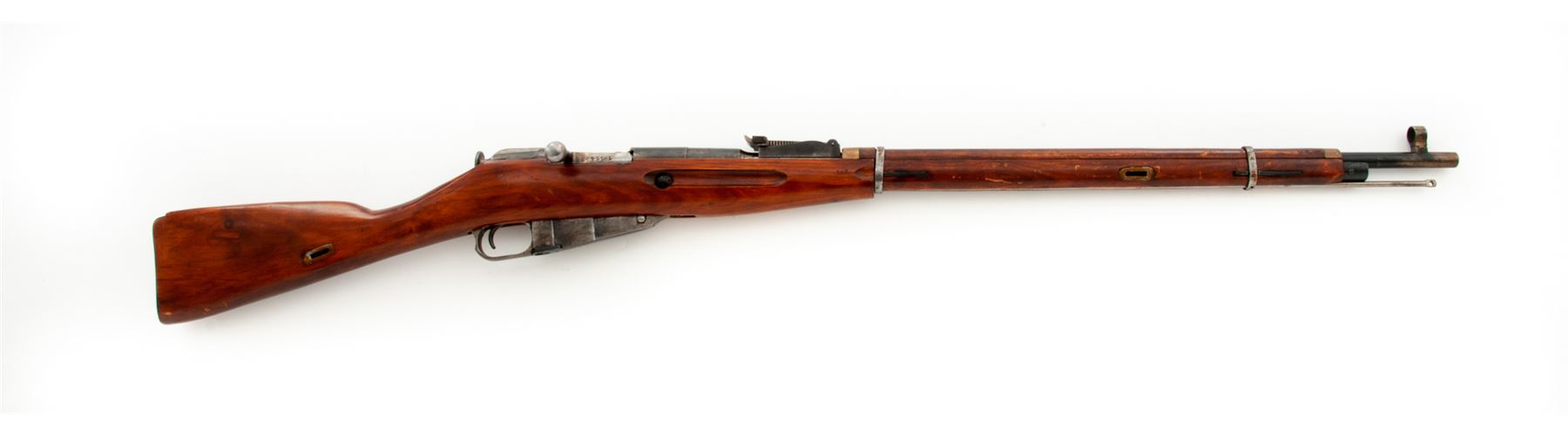 Soviet M91/30 Mosin-Nagant Bolt Action Rifle, #125782, 7.62x54R cal., 28.7'' barrel, blued finish, hardwood stock, hooded post front sight and adjustable tangent rear sight. Marked on barrel shank with ''(Soviet crest)/1937r'' and the Izhevsk Arsenal fletched arrow inside triangle stamp. Partial arsenal re-work stamp on right side of buttstock. Includes cleaning rod that has a non-standard tip. Arsenal repair on right side of buttstock. All numbers are mismatched. Bolt handle has been heated and partially turned down and back. Condition overall is very good as refinished, with approx. 70% of the reblued finish remaining on the metal, the thinned areas turned a bronze color at the muzzle. Wood is very good with extensive thinning and scratches to the shellac finish on the forend and overall handling marks. Action is smooth, bore is dark forward of the chamber with overall light frosting. No visible import stamps. Est.: $200-$350. (C&R)
