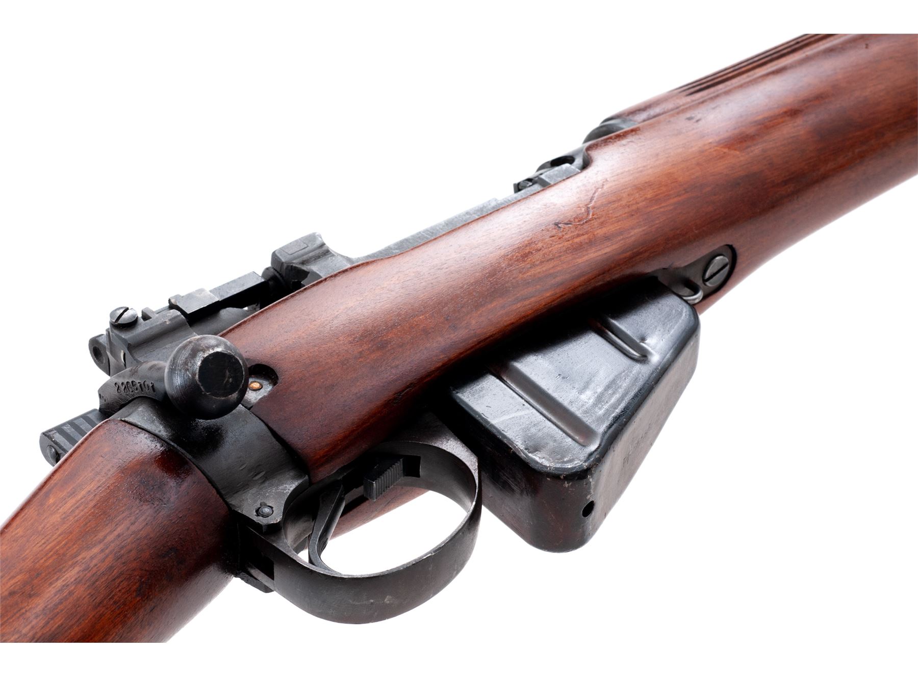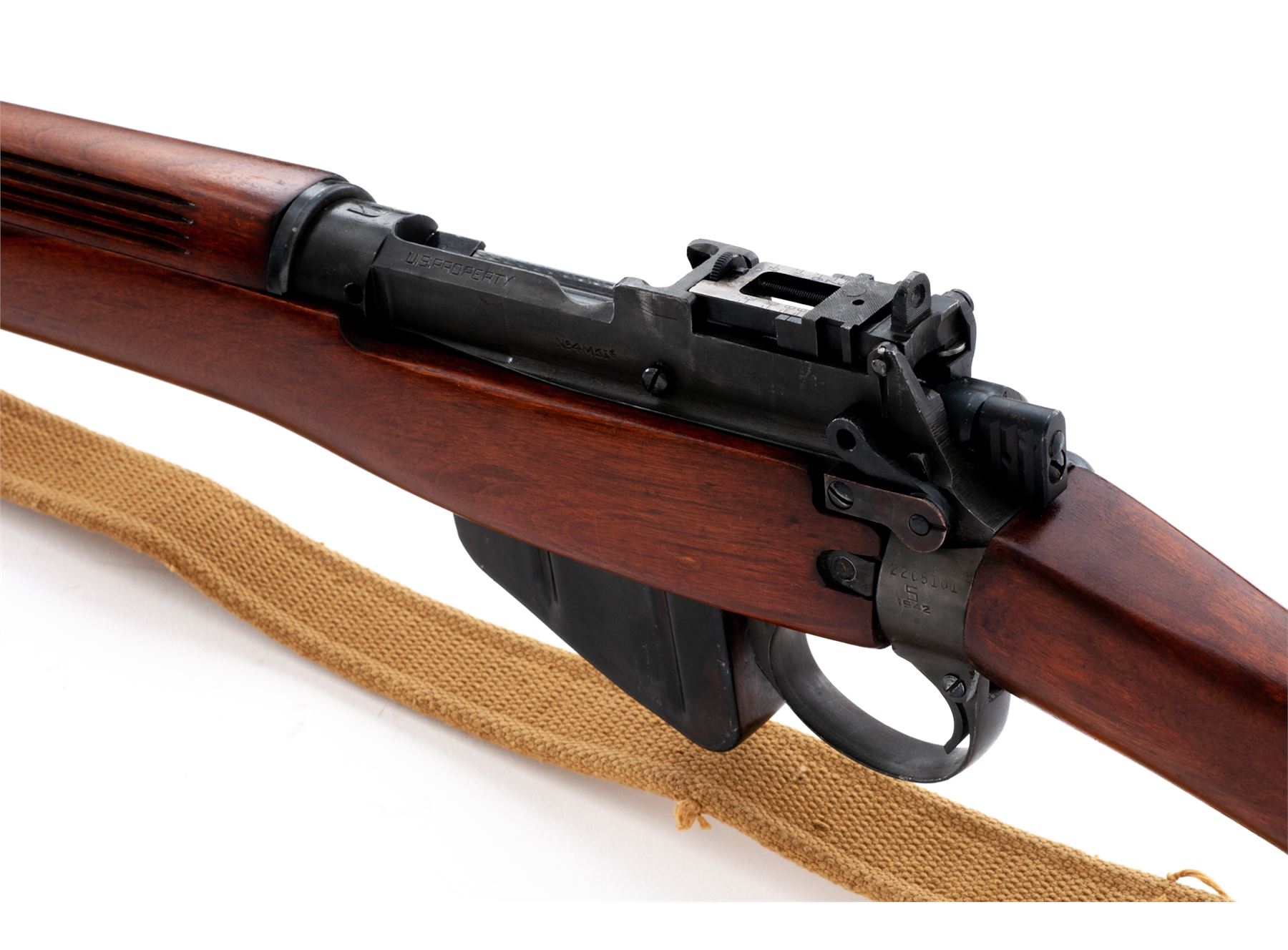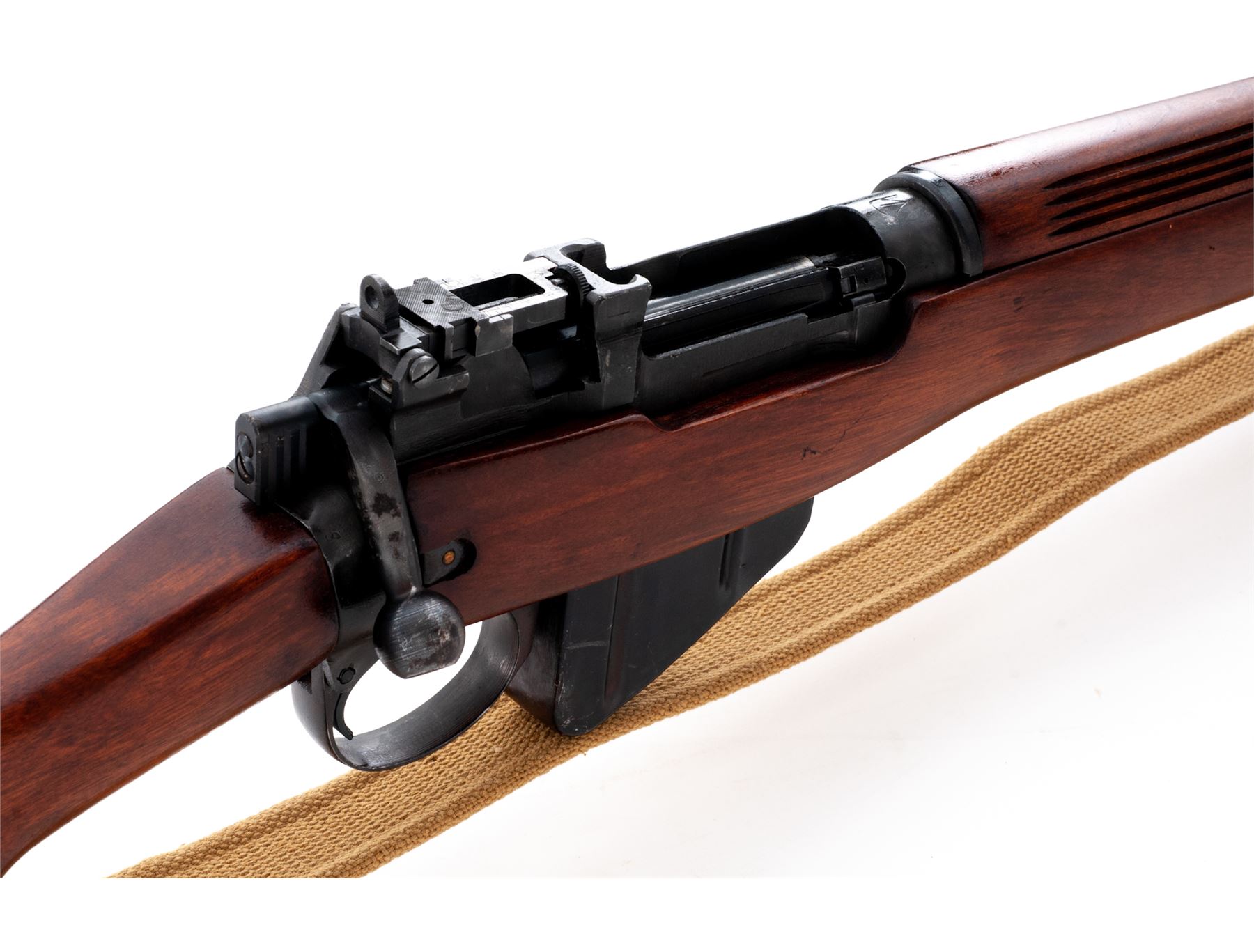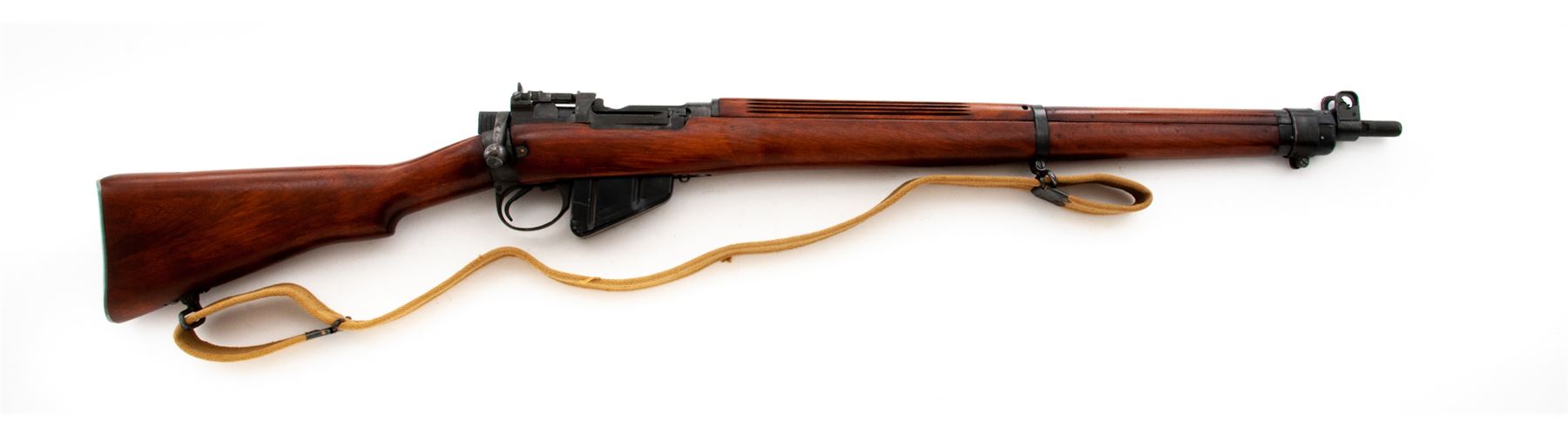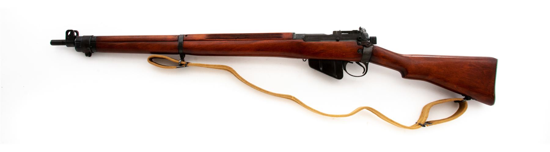 British No.4 Mk 1* Lee-Enfield Bolt Action Rifle, #22C5101, .303 British cal., 25.2'' barrel, phosphate/blue finish, hardwood stock, blade front sight with protecting ears and adjustable folding leaf rear sight with aperture. Marked on left side of action body with the ''Block S'' of the Savage Stevens Co./1942'', and on left side of receiver ''No. 4. Mk 1*'' and ''U.S.PROPERTY'' indicating mfg. in the U.S. for the British under the ''Lend Lease'' act of WWII. South African ''Broad Arrow inside U'' property mark stamped on chamber with #2 bolt head. Matching numbers on rear of bolt handle, no numbers on forend. Magazine is for a British No.4 Mk 2 and is engraved with a mismatched serial number. Condition overall is very good with about 85% finish remaining on the metal, with patina on the magazine and front sight and cleaning/polishing on the bolt handle. Wood has been sanded smooth and stained showing a few scratches. Two-groove bore has a couple of stains, otherwise bright with very good rifling. Action is smooth. Import stamped on left side of receiver. Includes a cotton sling ink stamped ''S 1943 (Canadian(broad arrow)C)'' in excellent condition. Est.: $300-$450. (C&R)