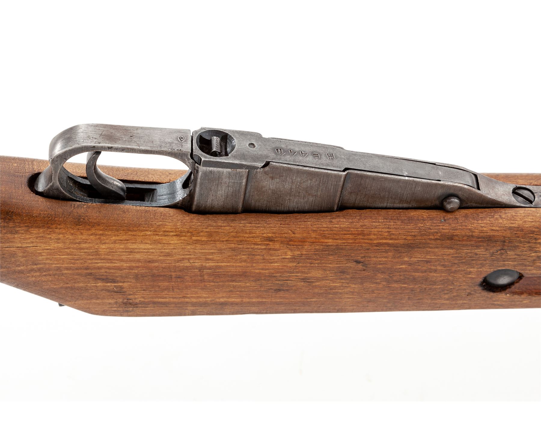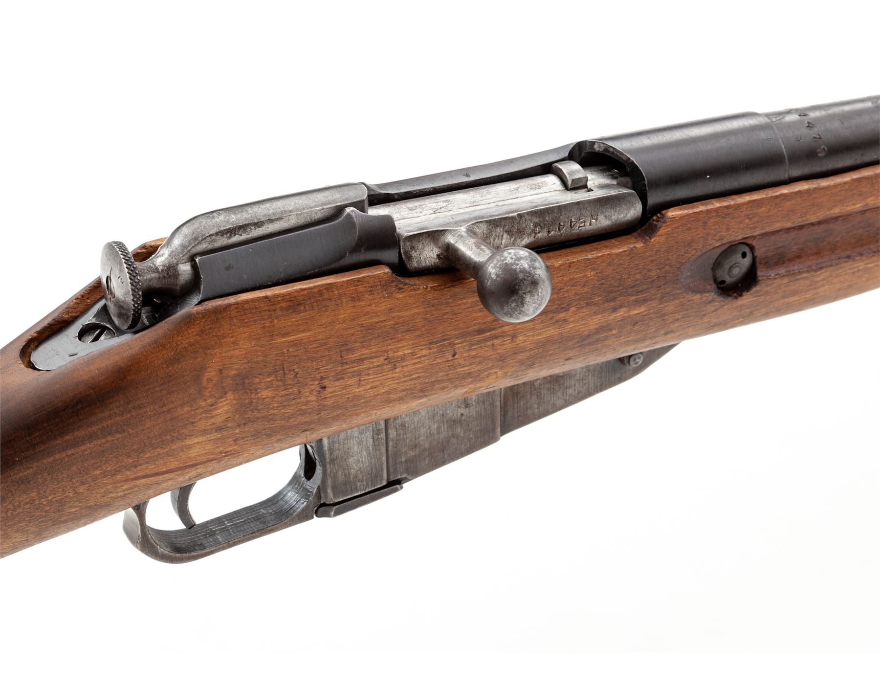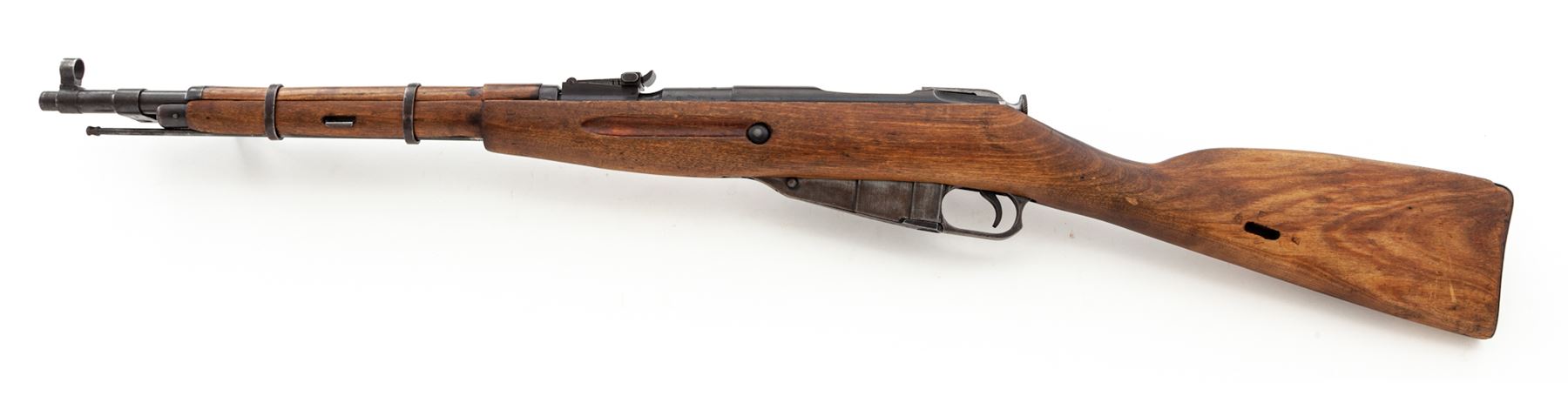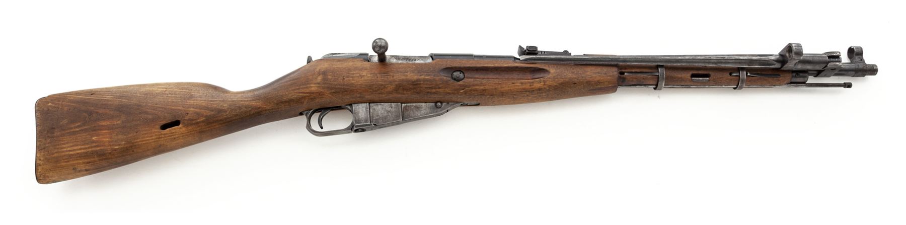 Soviet M44 Mosin-Nagant Bolt Action Rifle, with folding bayonet and capture bring-back paperwork, #HE4411, 7.62x54R cal., 20.4'' barrel, blued finish, hardwood stock, hooded post front sight and adjustable tangent rear sight, with cleaning rod. Marked on barrel shank with Soviet crest over ''1945r'' and the fletched arrow inside triangle of the Izhevsk Arsenal. Faint stamps on right side of buttstock. Matching numbers. Rear barrel band is jammed forward of locking bar. Attached ''FIREARMS REGISTRATION 11ND-MCASET-5510.6 (11-60)'' shows rifle with serial #HE4477, and under ''WHERE PURCHASED'' says ''WAR SUV.''''WHEN PURCHASED'' has a date of ''1951''. Condition overall is very good with less than 70% finish remaining on the metal, with thinning across the magazine and browning on the bolt. There are rust spots across the bayonet collar and blade. Wood has been sanded and refinished with a coat of stain and shows a few light handling marks. Action is smooth, bore is very good with slight darkening in the grooves and very good rifling. No visible import stamps. Bayonet operates smoothly. Est.: $500-$700. (C&R)