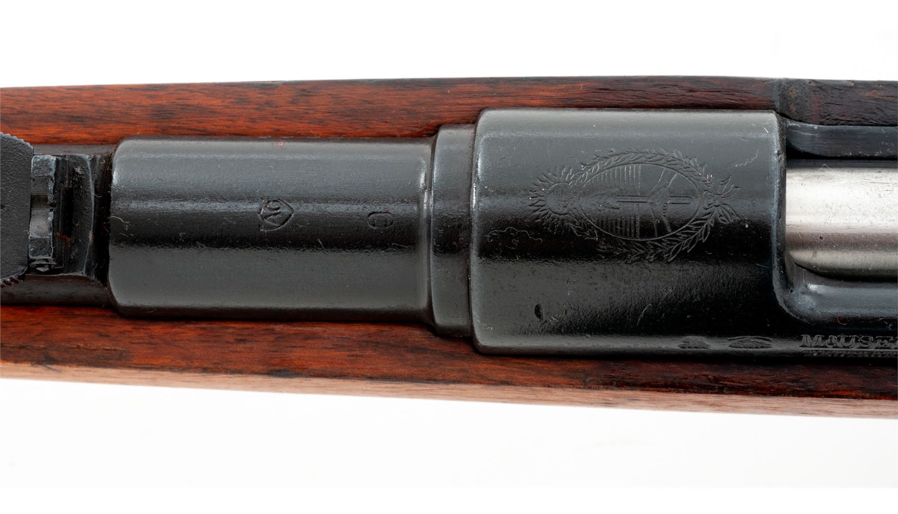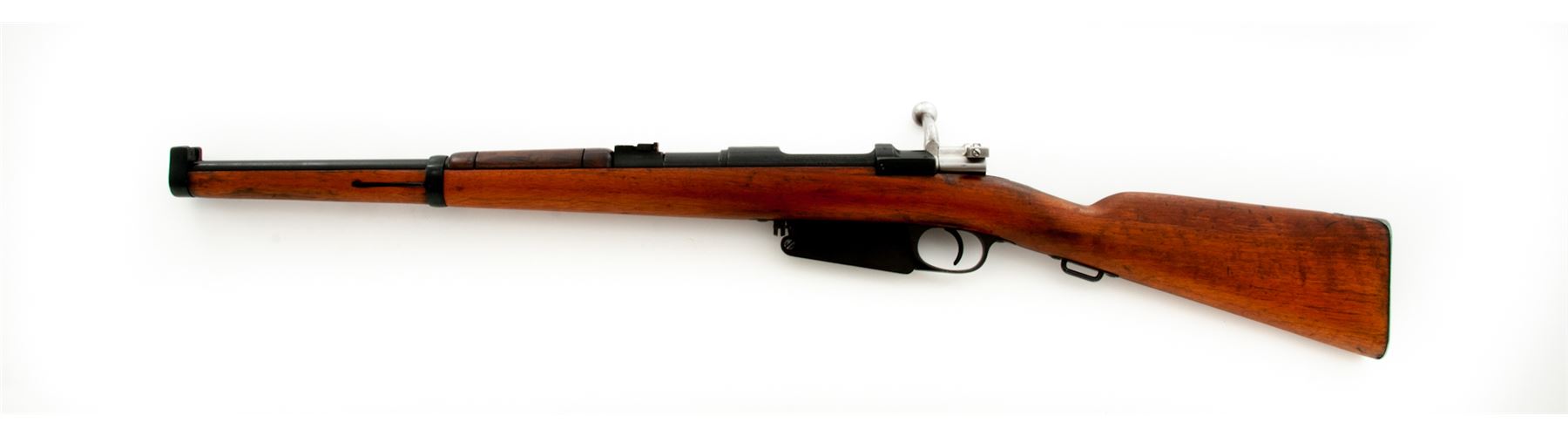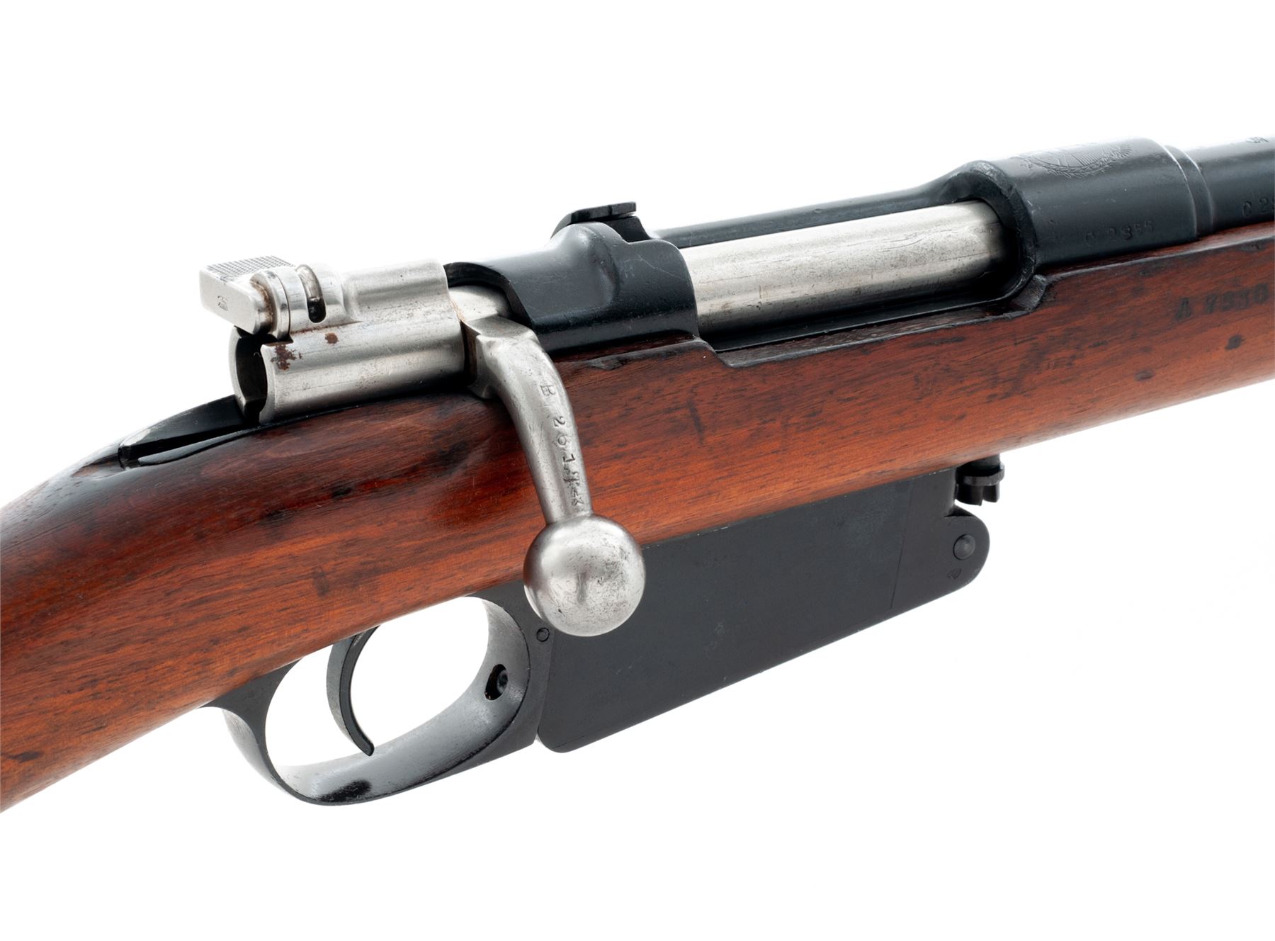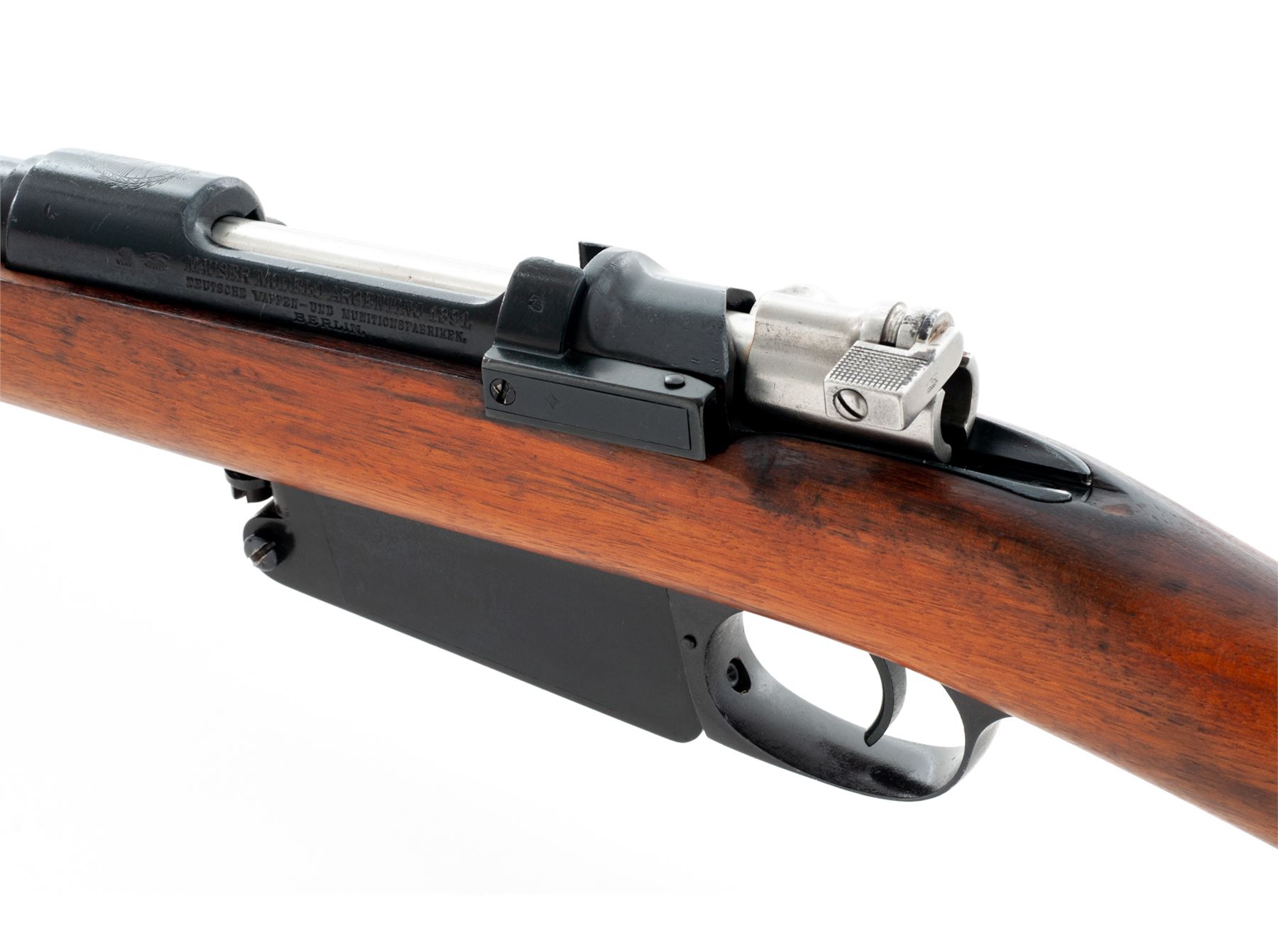 Argentine M1891 Mauser Bolt Action Carbine, #C2855, 7.65x53mm cal., 17.6'' barrel, blued finish, hardwood stock, inverted ''V'' front sight with protecting ears and adjustable folding leaf rear sight. Marked on receiver ring with intact Argentine crest. ''AG'' inside shield stamped on barrel. Left side receiver rail marked ''MAUSER MODELO ARGENTINO 1891 DEUTSCHE WAFFEN-UND MUNITIONSFABRIKEN.BERLIN''. Faint Argentine crest on right side of buttstock. Mismatched numbers. Condition overall is very good with almost all of the dark refinish remaining on the metal with light patina on the buttplate. Stock has been sanded and oiled over old handling marks. Handguard retains its original finish and shows scratches and handling marks. Action is smooth, bore is very good with very good rifling. No visible import stamps. Est.: $300-$500. (C&R)