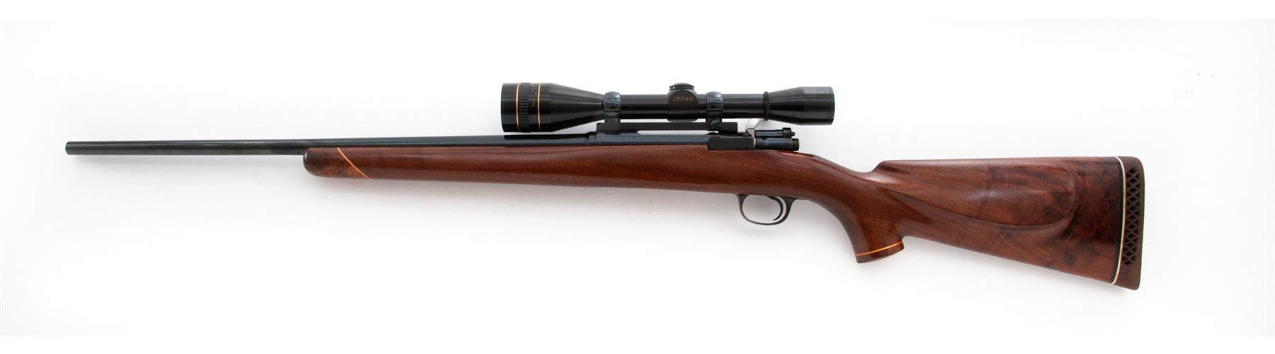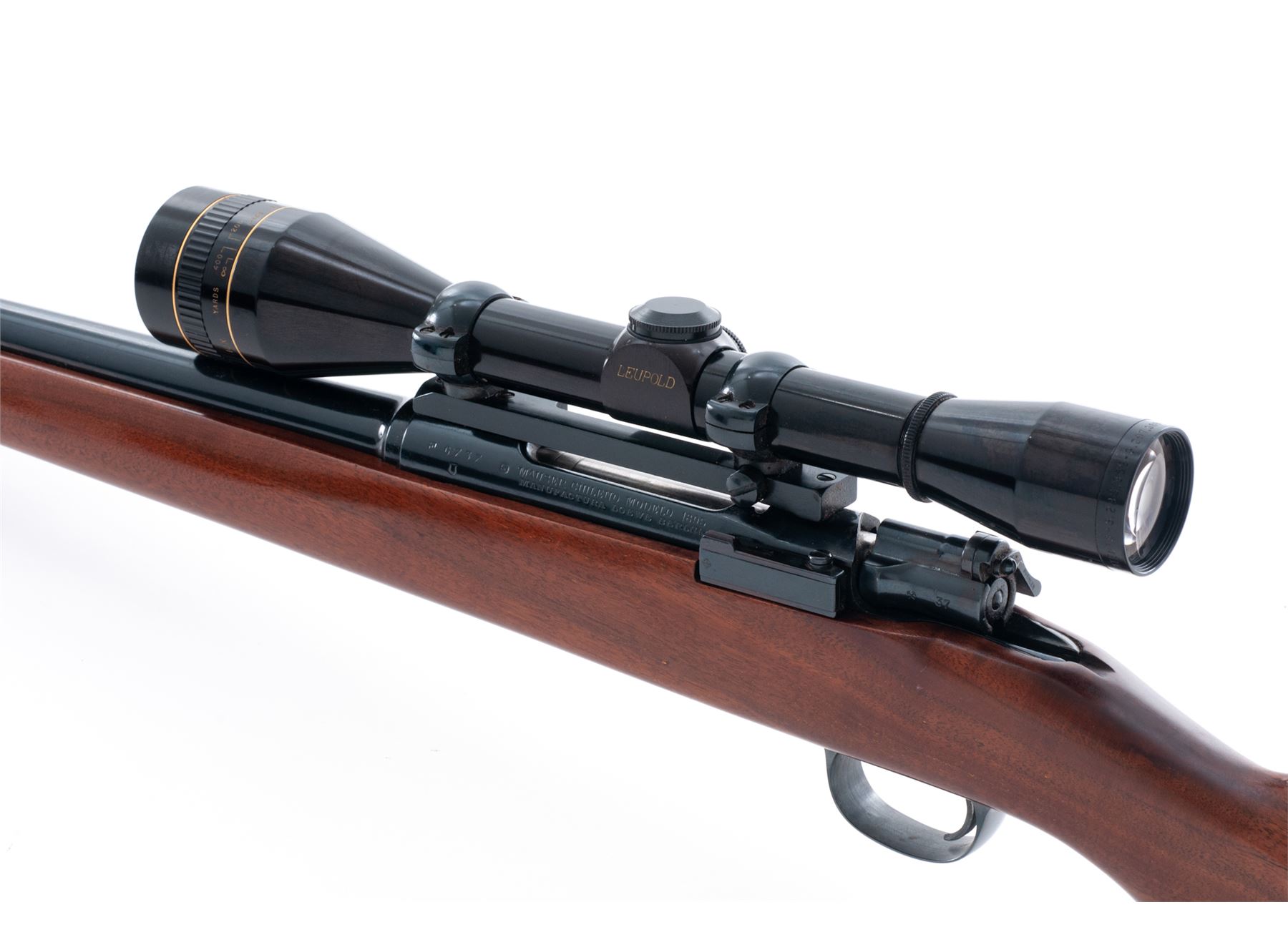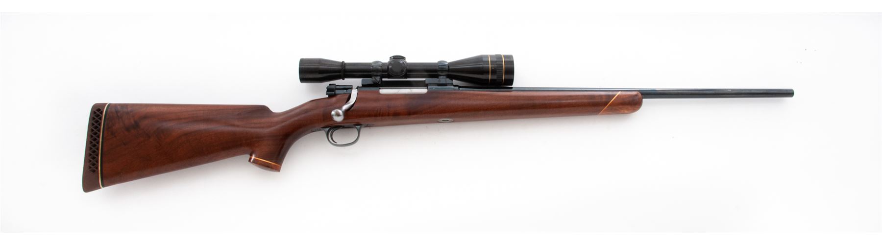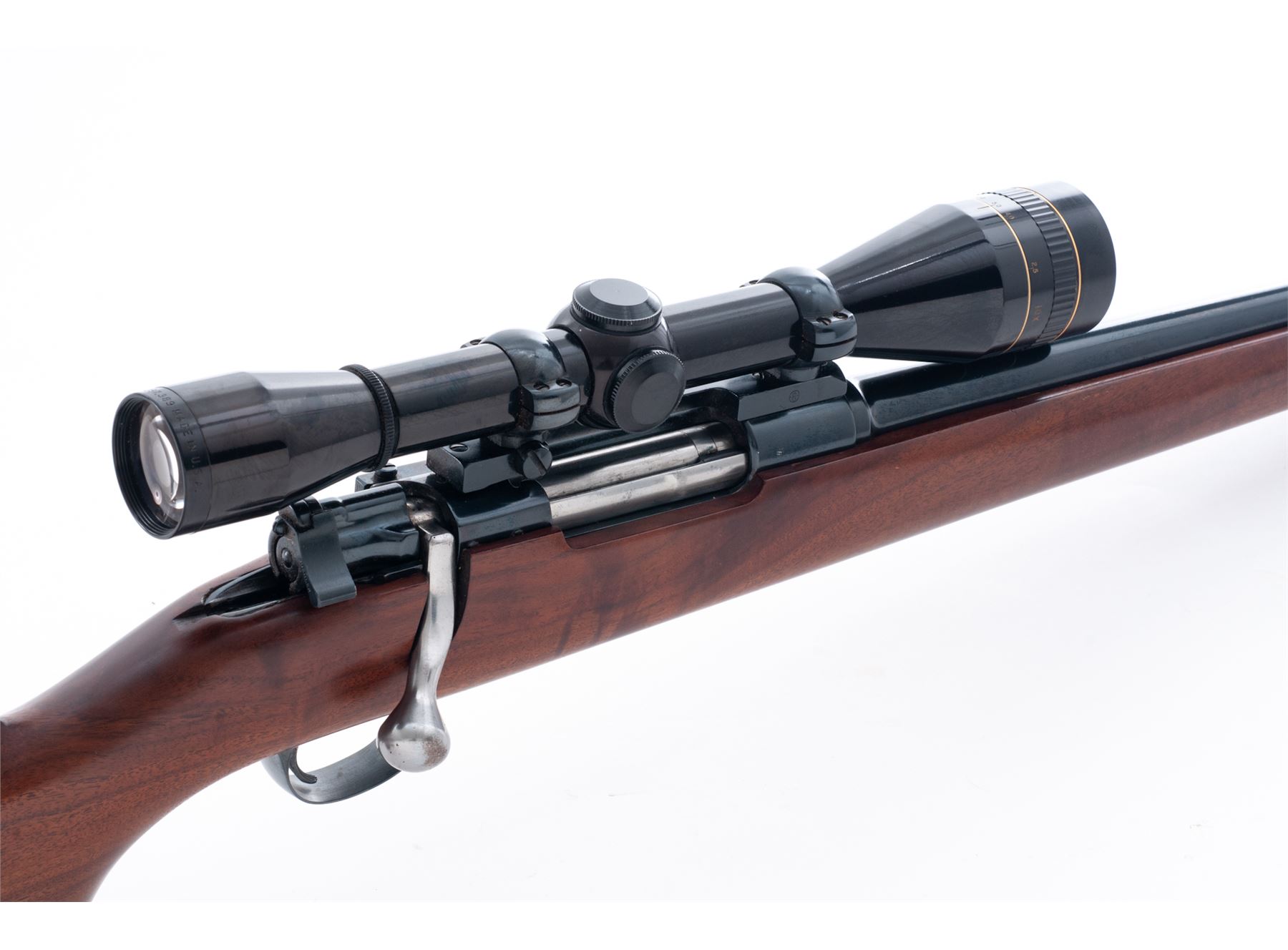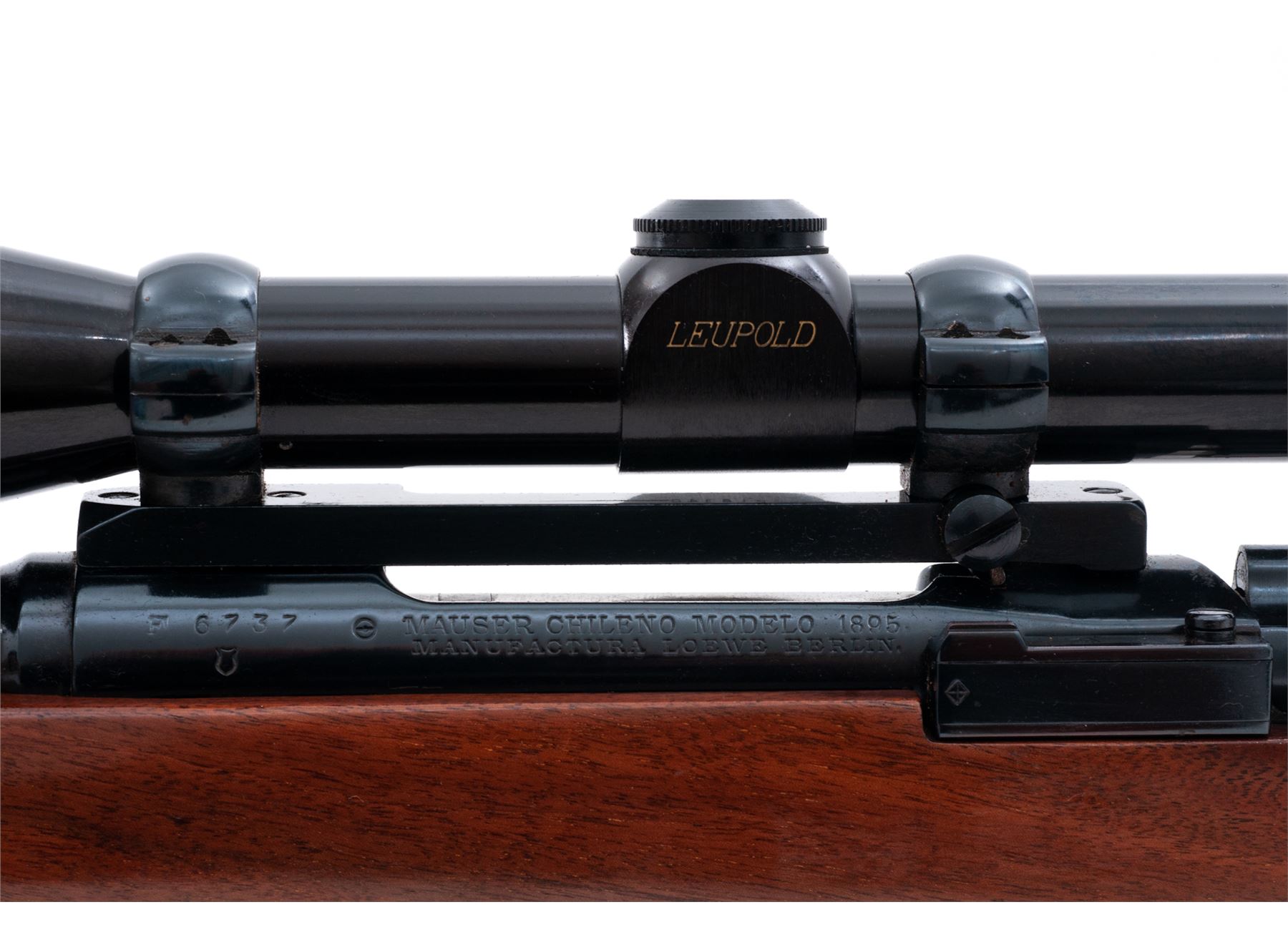 Sporterized Model 1895 Chilean Mauser Action Single Shot Bolt Action Rifle, #F6737, .222 Rem. CF cal., blued 23'' round barrel; blued receiver marked at left breech area, ''Mauser Chileno Modelo 1895'' over Manufactura Loewe Berlin'' in two lines, and mounted with a 13'' gloss black Leupold 10-power scope; polished bolt handle; blued grooved trigger and loop triggerguard; satin finished deluxe-grain walnut pistol-grip stock with rootwood forend cap and blond-wood spacer, matching pistol-grip cap and spacer, gracefully carved cheekpiece and rubber buttpad with black and white spacers. Condition is excellent, the steel parts retaining approx. 98% of a later blue-black finish. Stock is smooth, solid and unmarked showing lovely grain and color. Action is smooth; bore is bright with defined rifling, scope optics are clear. Est.: $400-$600. (Antique)