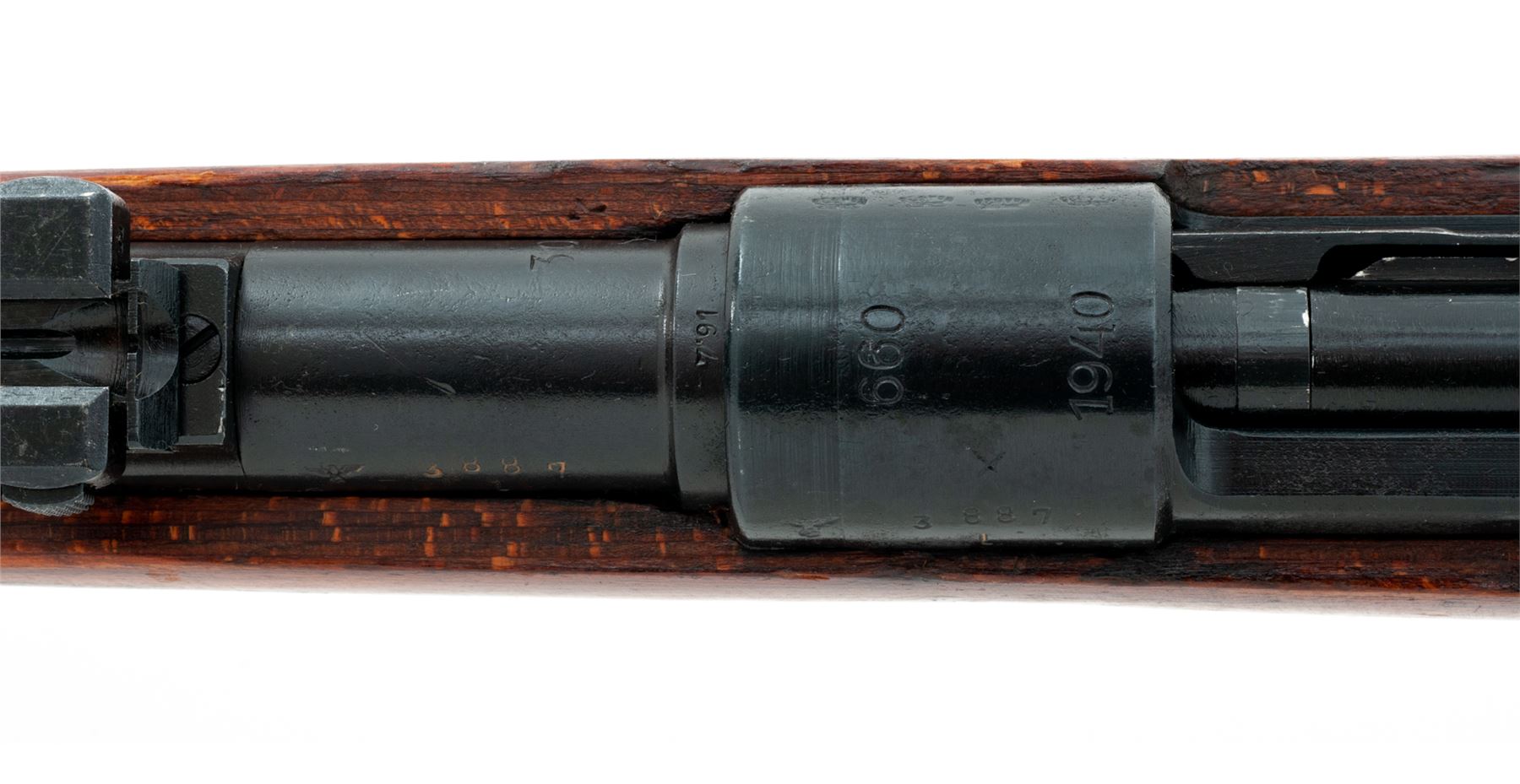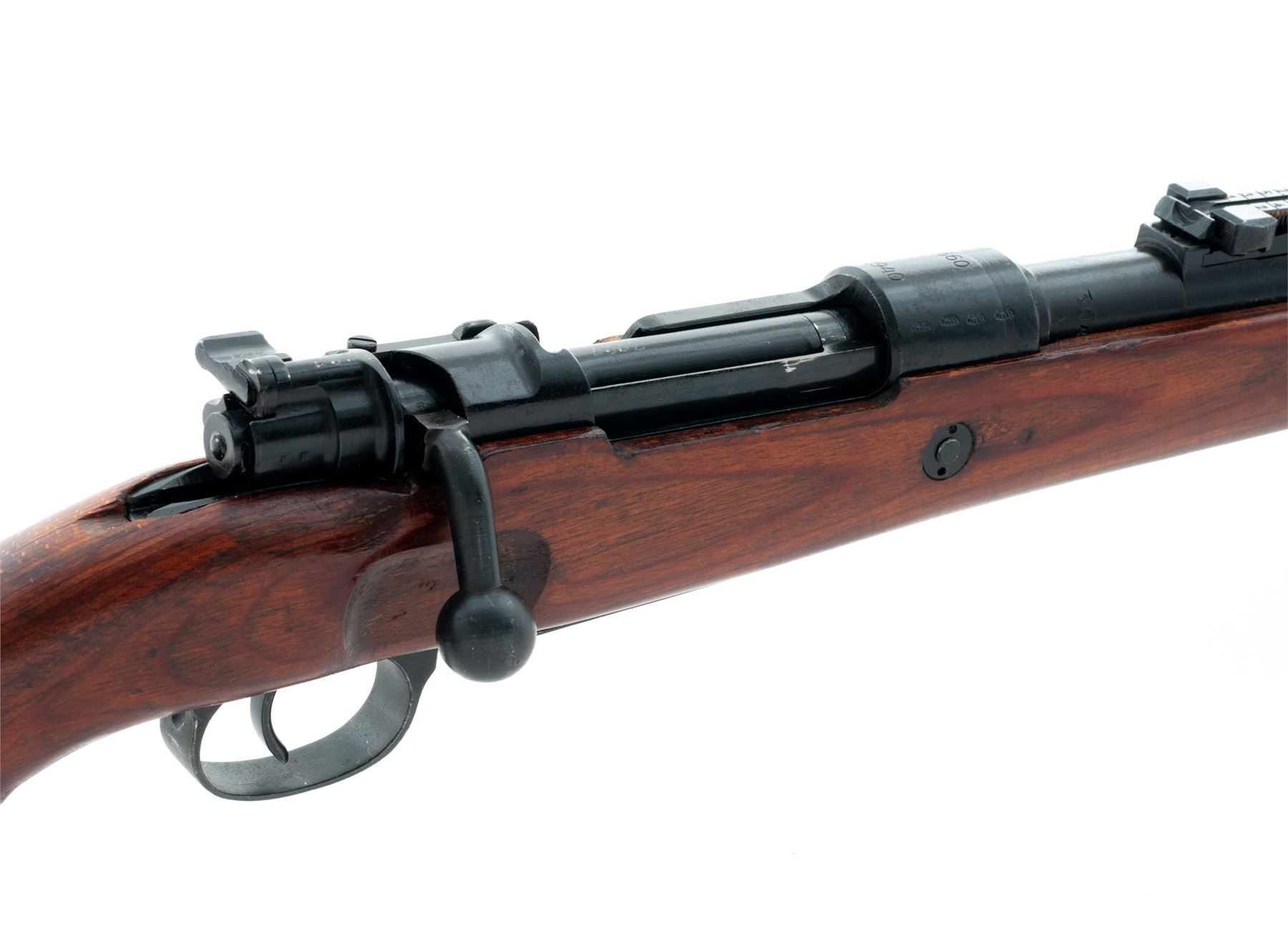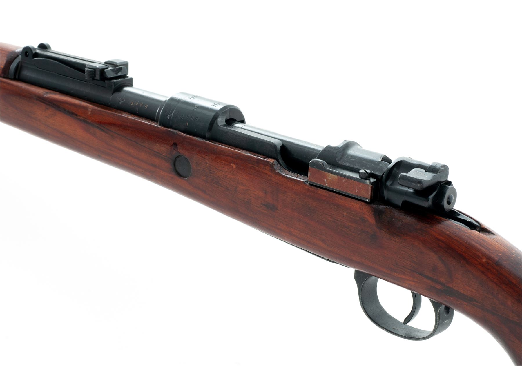 Russian Capture German Kar98k Mauser Bolt Action Rifle, #3887L, 8x57mm cal., 23.62'' barrel, blued finish, laminated stock with cup style buttplate, inverted ''V'' front sight and adjustable tangent rear sight. Marked on receiver ring ''660/1940''. Eagle stamp intact on left side of receiver. ''WaA 623'' codes stamped on right side of barrel and receiver. Faint ''H'' and ''WaA'' stamps on right side of buttstock. Original serial numbers match on barrel and receiver. All other parts have been electric pencil renumbered to match with serial number also stamped into the left side of buttstock. Soviet applied ''X'' on left side of receiver. Missing cleaning rod and front triggerguard locking screw. Condition overall is very good with almost all of the dark Soviet refinish remaining on the metal, which was applied over light pitting on the receiver. Wood is very good with a few light handling marks to the Soviet shellac finish. Action is smooth, bore is very good. Import stamped on right side of barrel. Est.: $500-$700. (C&R)