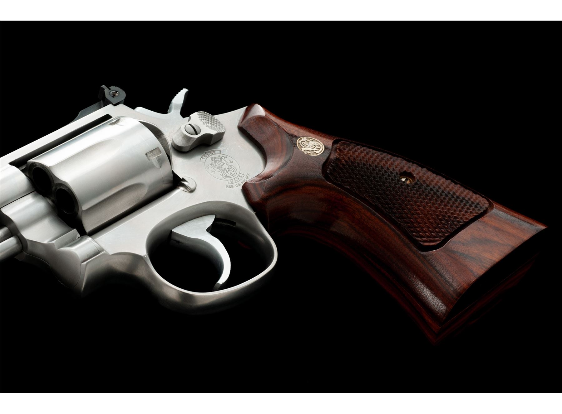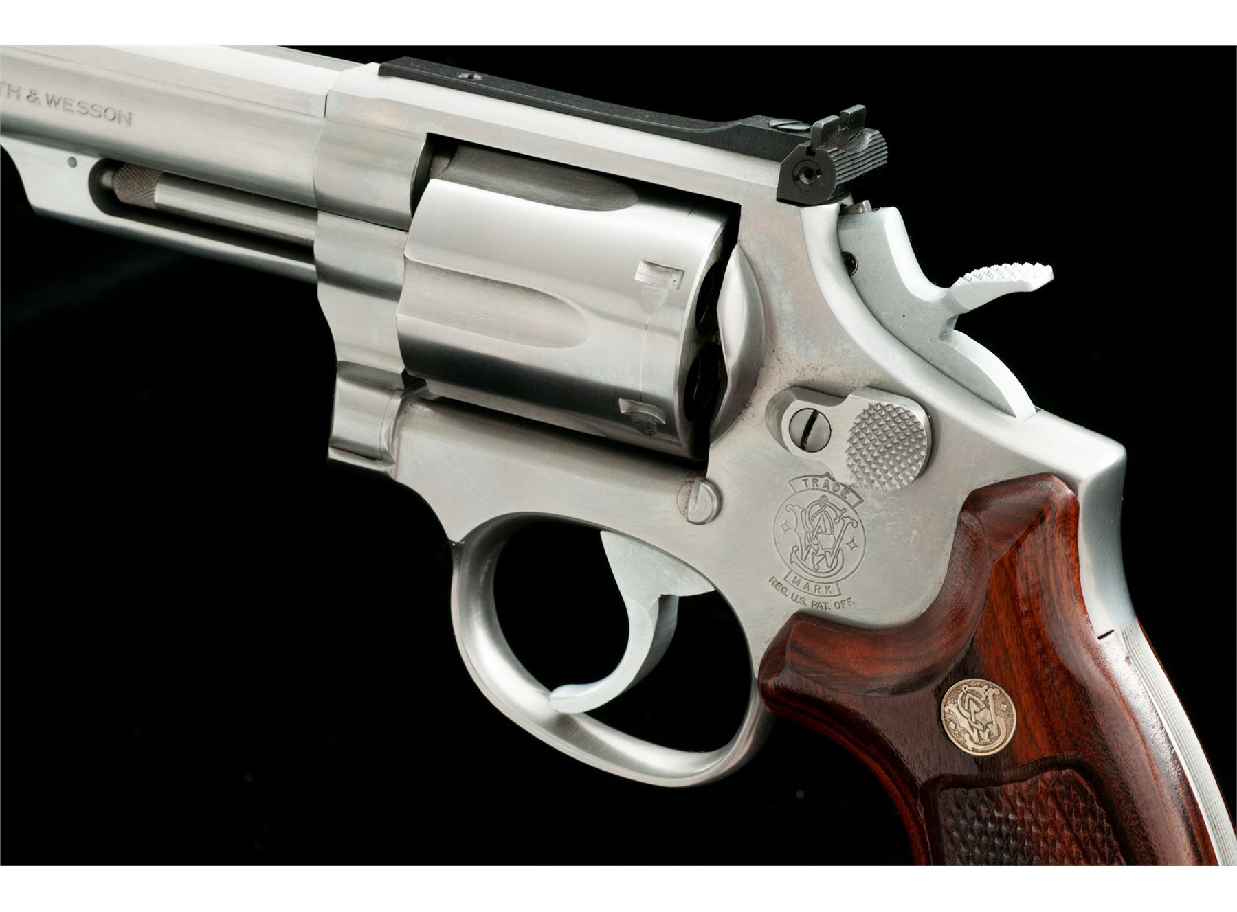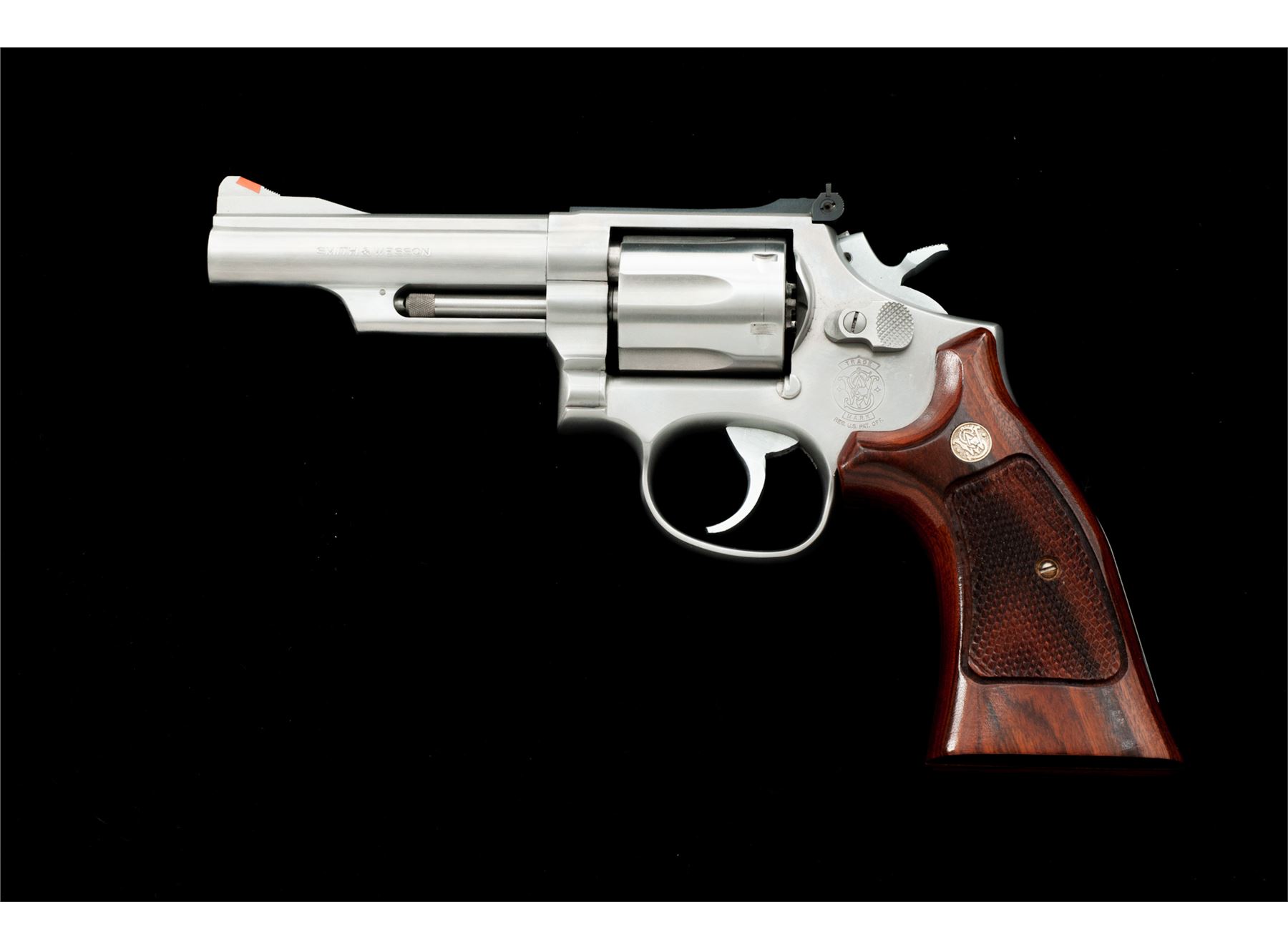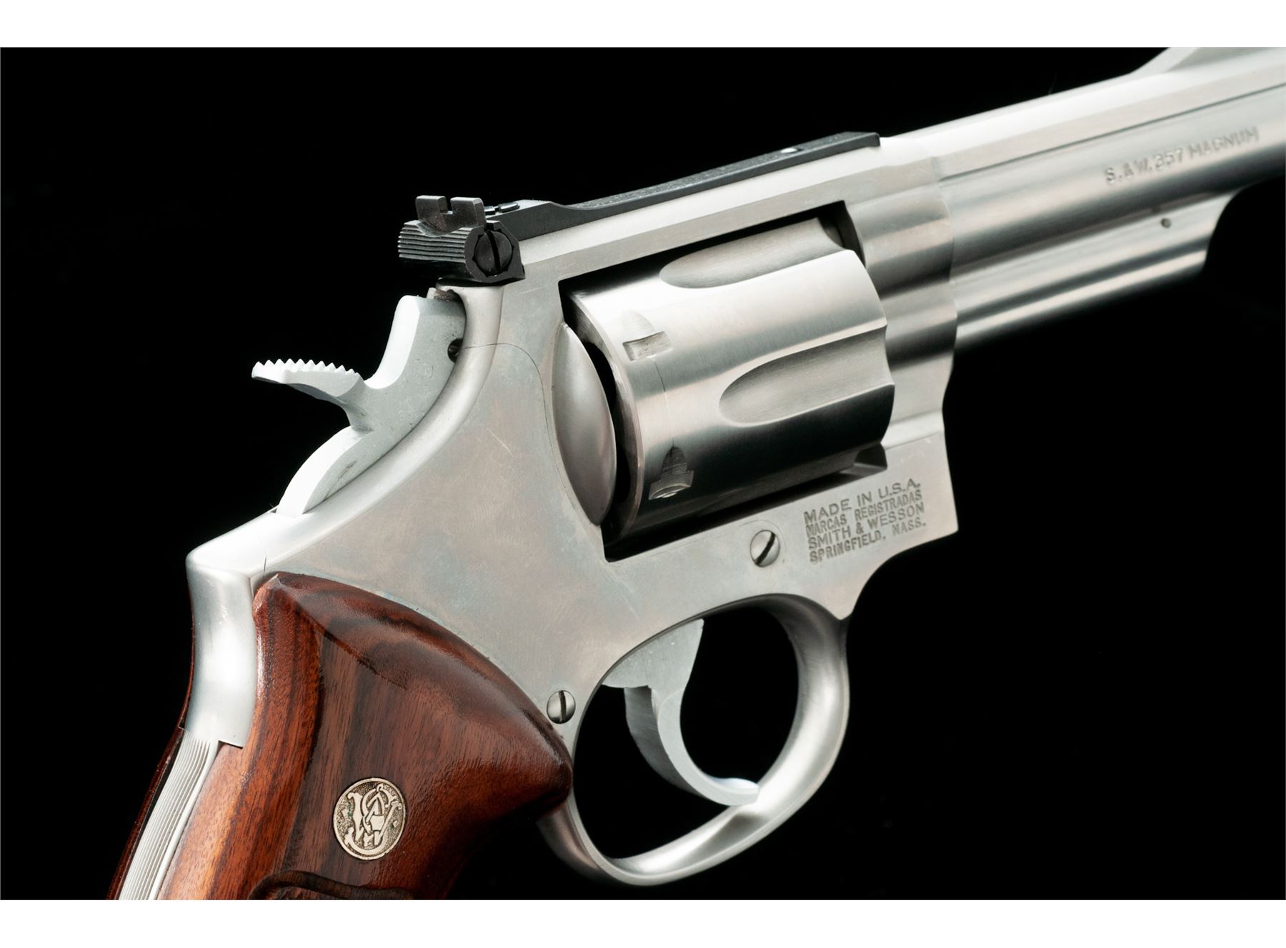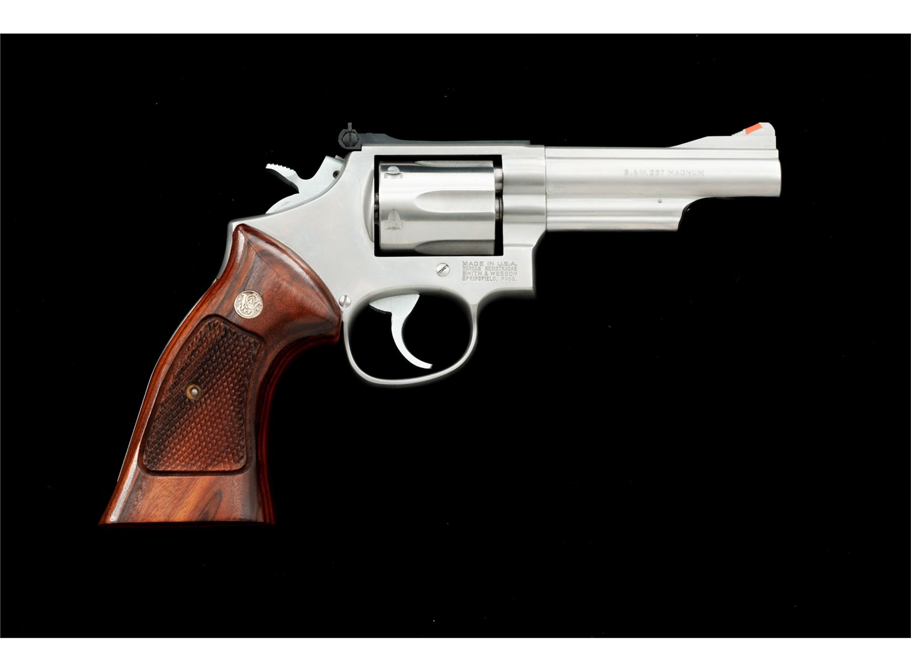 Smith & Wesson Model 66-3 Combat Magnum Double Action Revolver, #BHF9151, .357 mag. cal., 4'' barrel, satin stainless steel, factory checkered square butt Goncalo Alves target grips with S&W medallions, red ramped front sight and micrometer click adjustable rear sight. Overall the condition is excellent. Metal shows signs of only light use, with a few slight scratches to the sideplate; cylinder with a light index line. Factory lettering is crisp. Grips appear near new with only a few very minor handling marks, checkering shows no noticeable wear. Excellent crisp action and bright bore. Est.: $400-$600. (Modern/PPT)