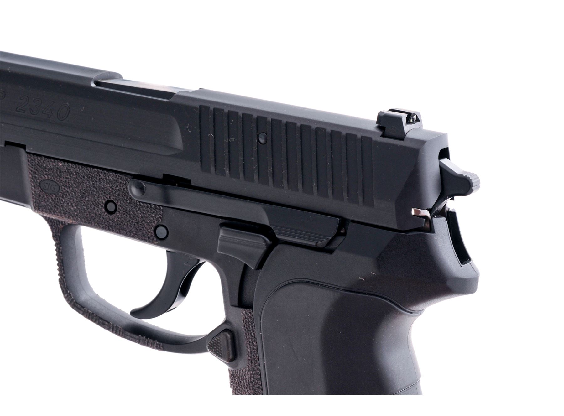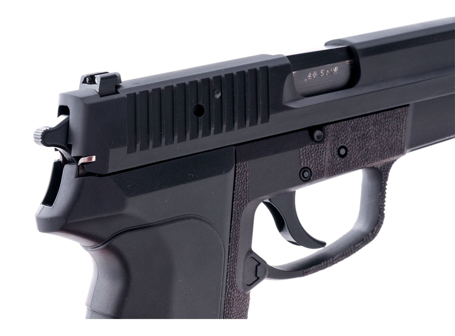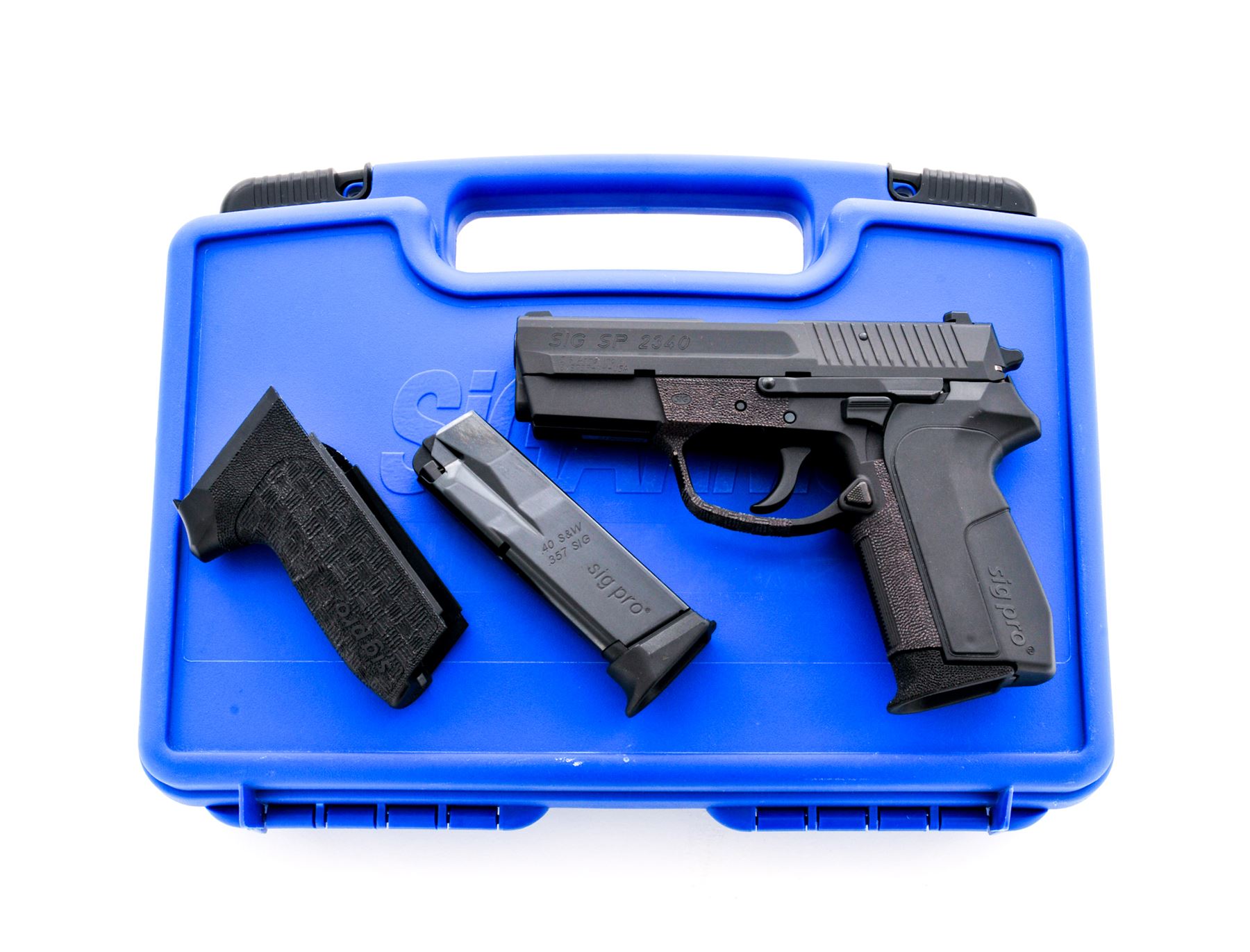 Sig Sauer Model SP2340 Semi-Automatic Pistol, double/single action, #SP0055613, .40 S&W cal., 3.75'' barrel, black slide, black polymer frame which has been hand stippled on the front strap and around the triggerguard, interchangeable backstrap, 3-dot night sights, and two (2) factory 10-round magazines. One of the magazine bases has been hand stippled. In original blue plastic Sigarms case with matching end label, owner's manual, gun lock, and additional backstrap that has been hand checkered. Condition is excellent showing just light handling marks. Custom stippling was nicely done and someone put some time into doing it. Action is smooth with an excellent bright bore. Est.: $300-$500. (Modern) (Not available to Calif. residents.)