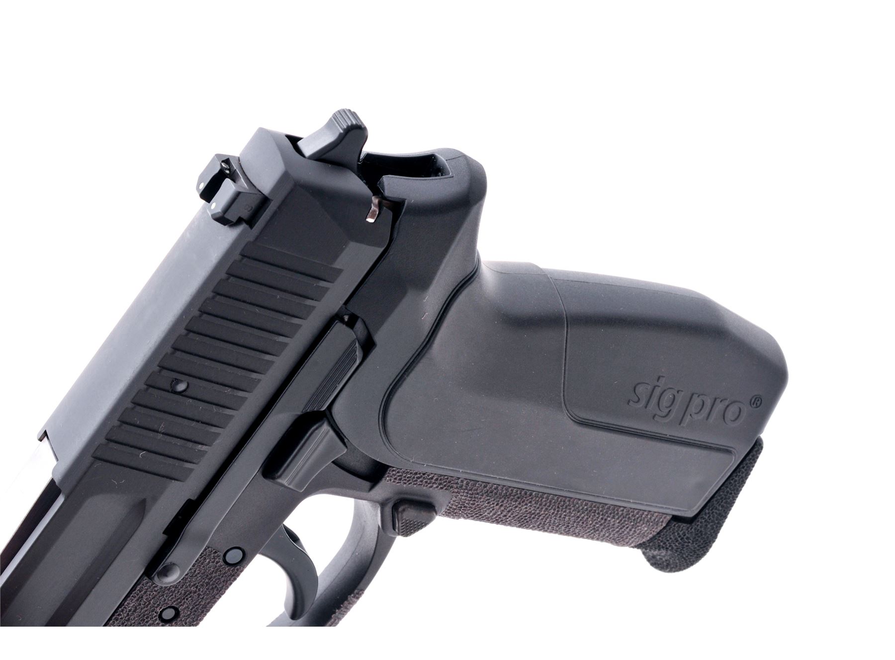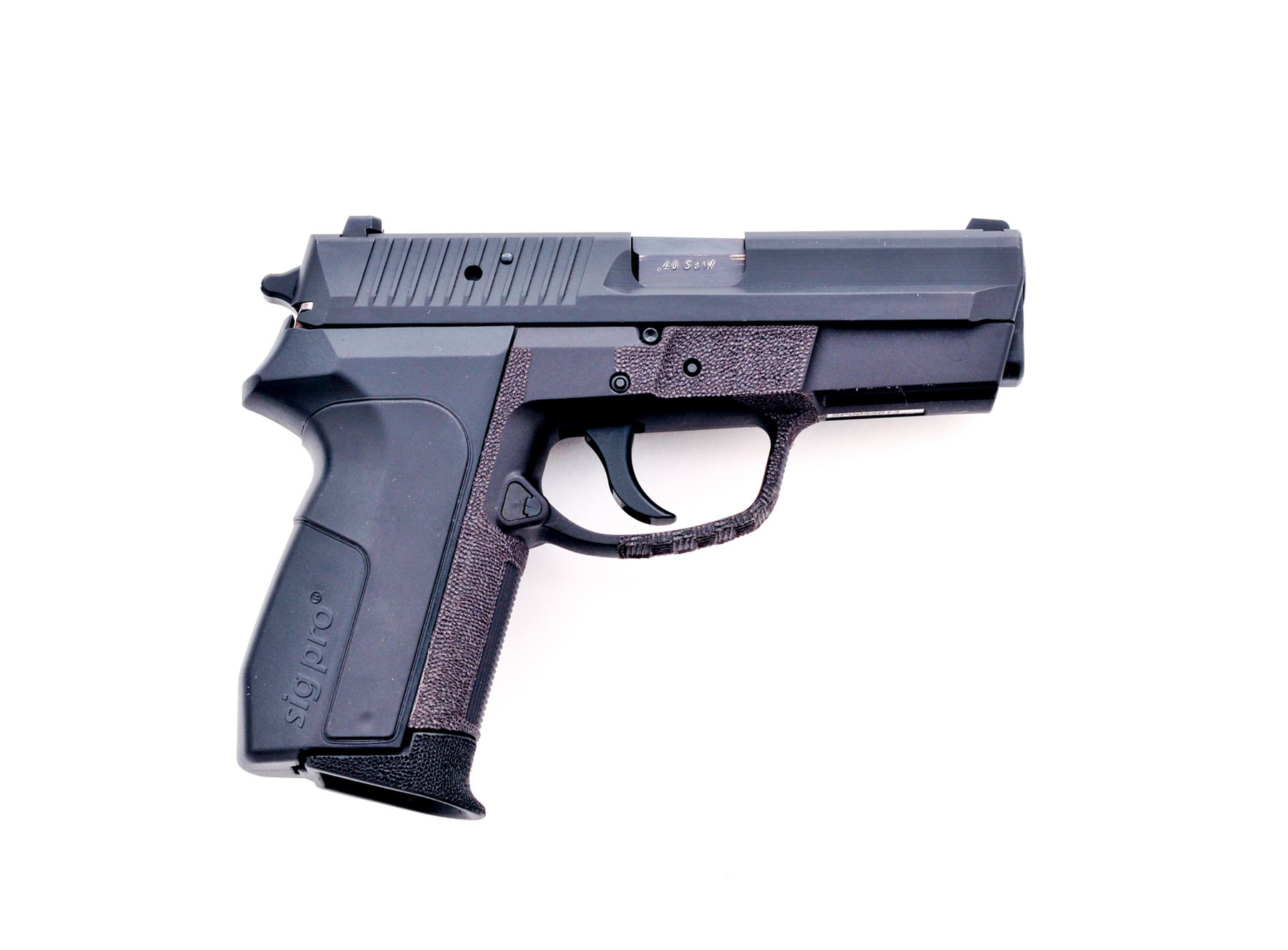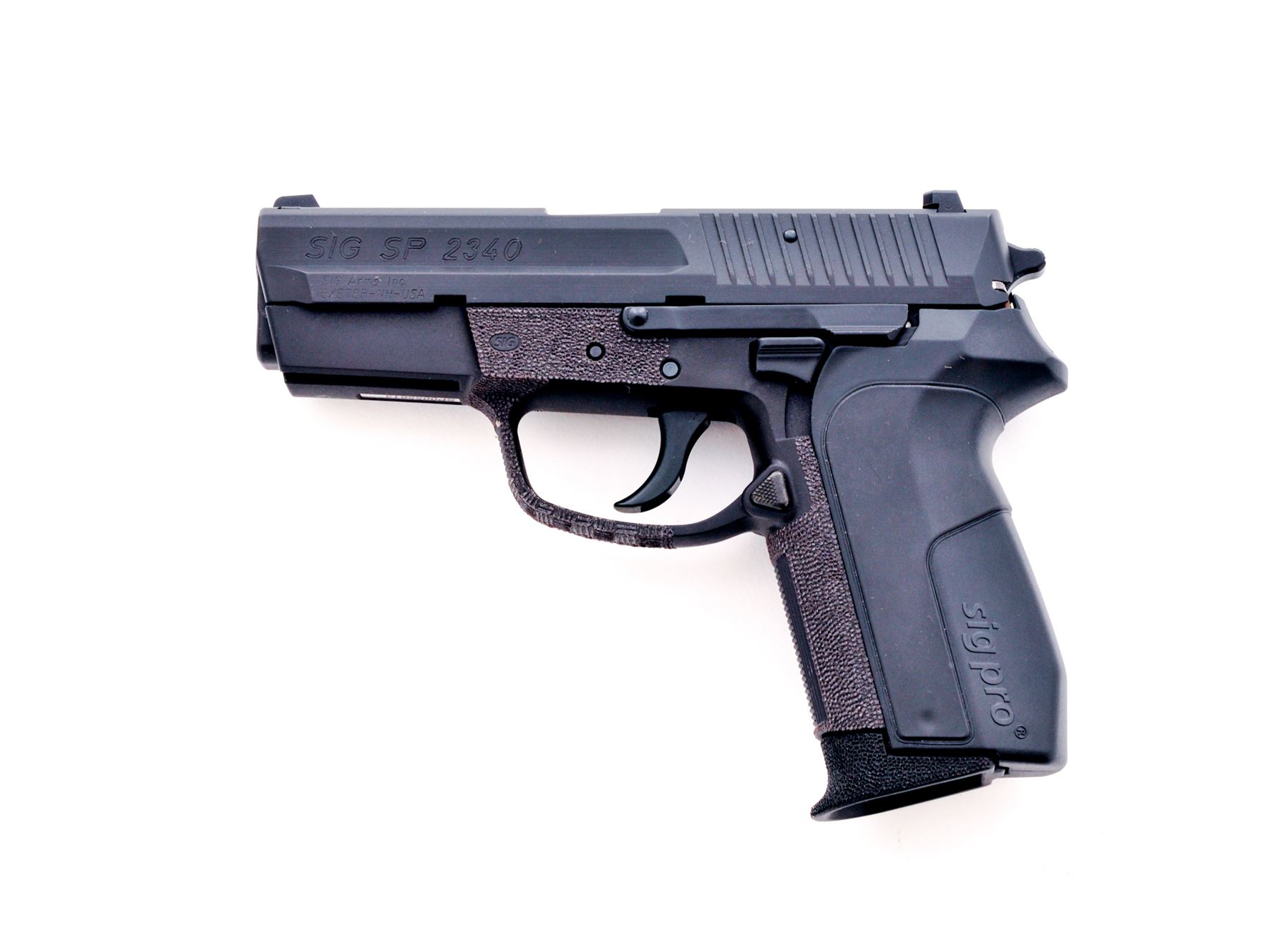 Sig Sauer Model SP2340 Semi-Automatic Pistol, double/single action, #SP0055613, .40 S&W cal., 3.75'' barrel, black slide, black polymer frame which has been hand stippled on the front strap and around the triggerguard, interchangeable backstrap, 3-dot night sights, and two (2) factory 10-round magazines. One of the magazine bases has been hand stippled. In original blue plastic Sigarms case with matching end label, owner's manual, gun lock, and additional backstrap that has been hand checkered. Condition is excellent showing just light handling marks. Custom stippling was nicely done and someone put some time into doing it. Action is smooth with an excellent bright bore. Est.: $300-$500. (Modern) (Not available to Calif. residents.)