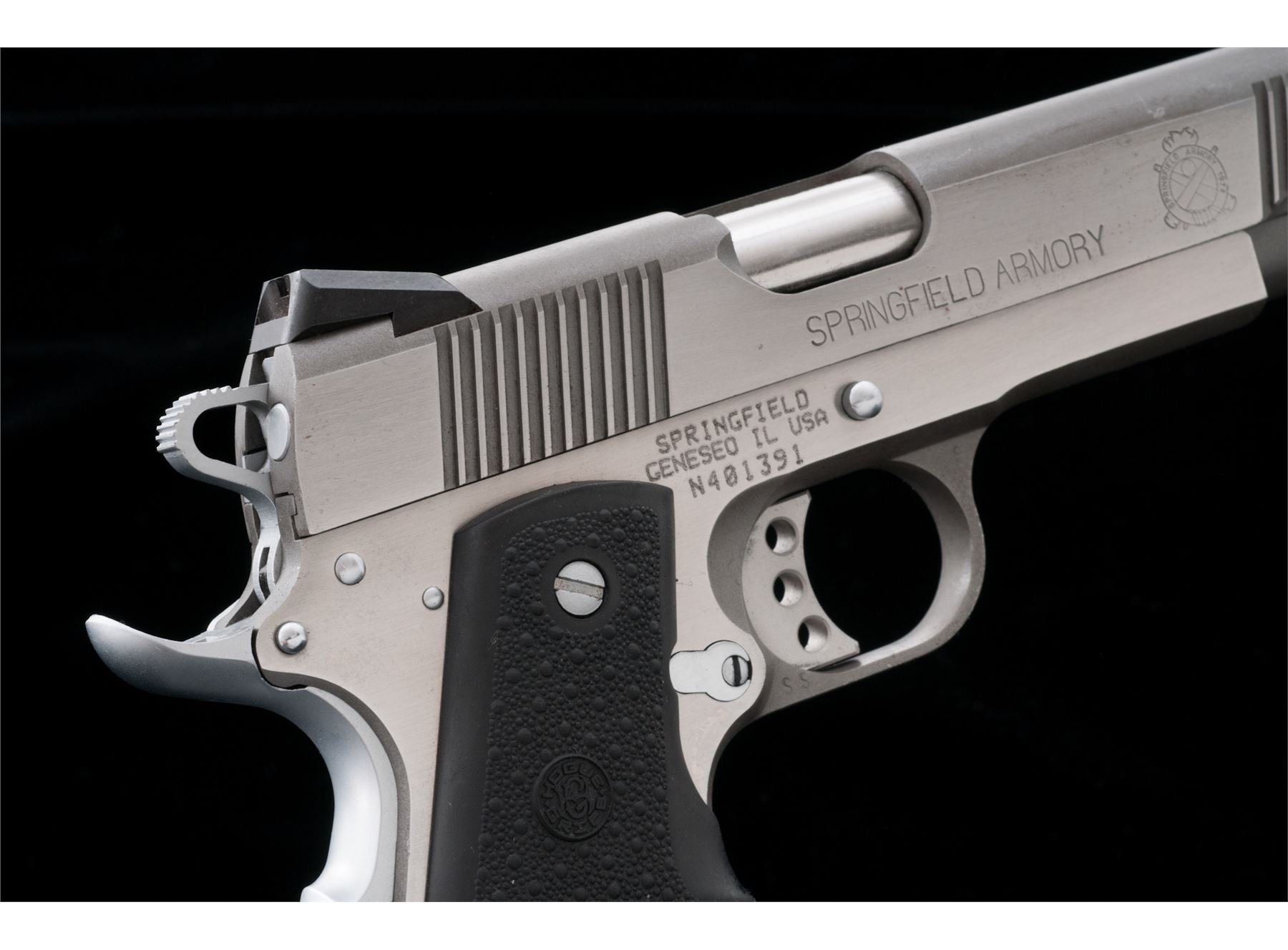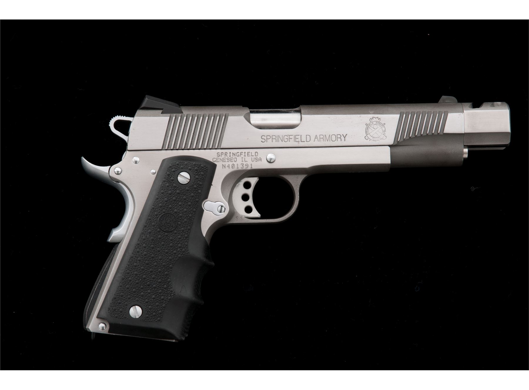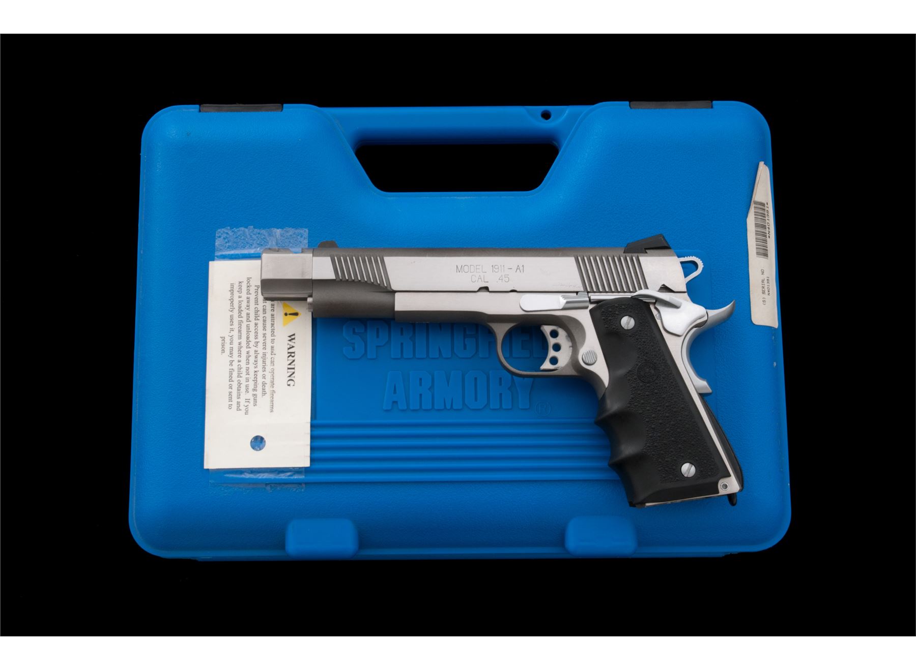Springfield Armory Model 1911-A1 Semi-Automatic Pistol, N401391, .45 ACP cal., 5'' barrel, stainless steel, slide with a 1'' ported extension, wraparound black rubber Hogue grips with finger grooves, skeletonized hammer and trigger, fixed blade front sight, Novak's rear sight, lanyard ring, no magazine. Bottom of frame is marked ''FI Brazil''; lower right side of triggerguard is marked ''SS''. In original blue plastic SA case with matching end label. Condition is very good with moderate scuffs and small scratches from range use. Factory lettering is clear and defined. Action is smooth; bore shows normal light wear and rates as near excellent. Est.: $400-$600. (Modern) (Not available to Calif. residents.)