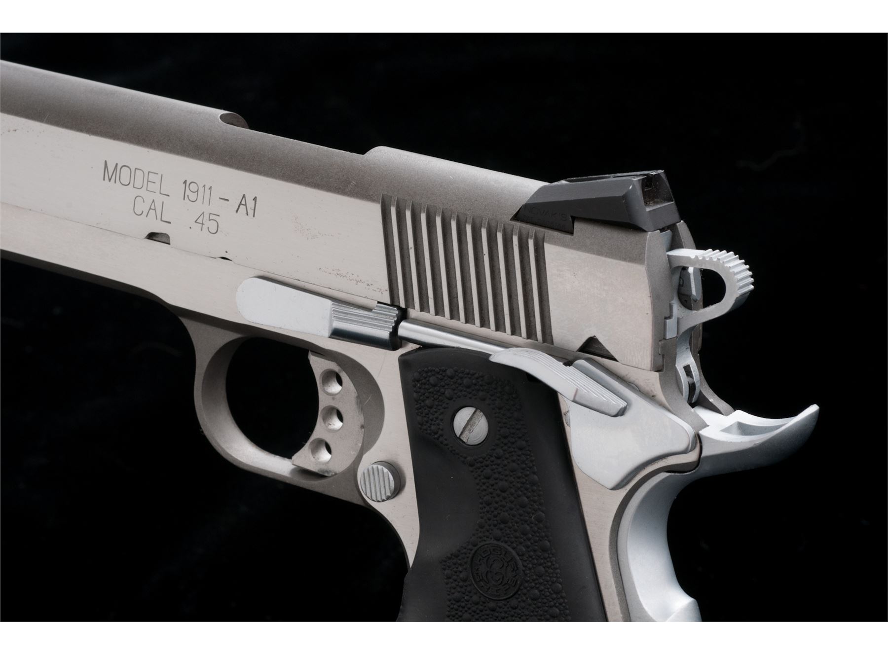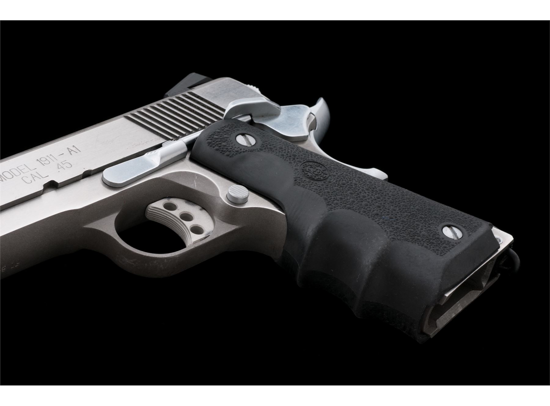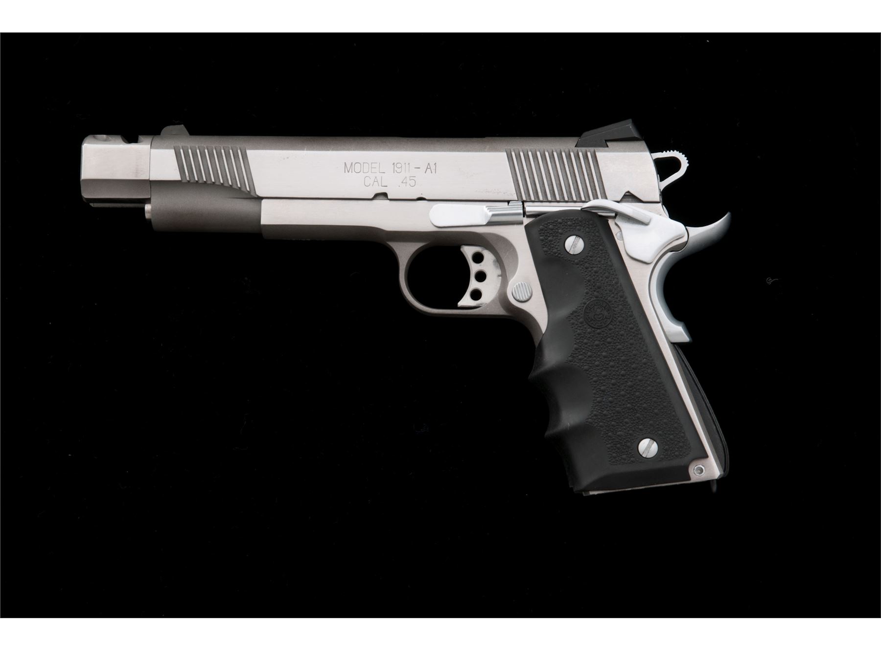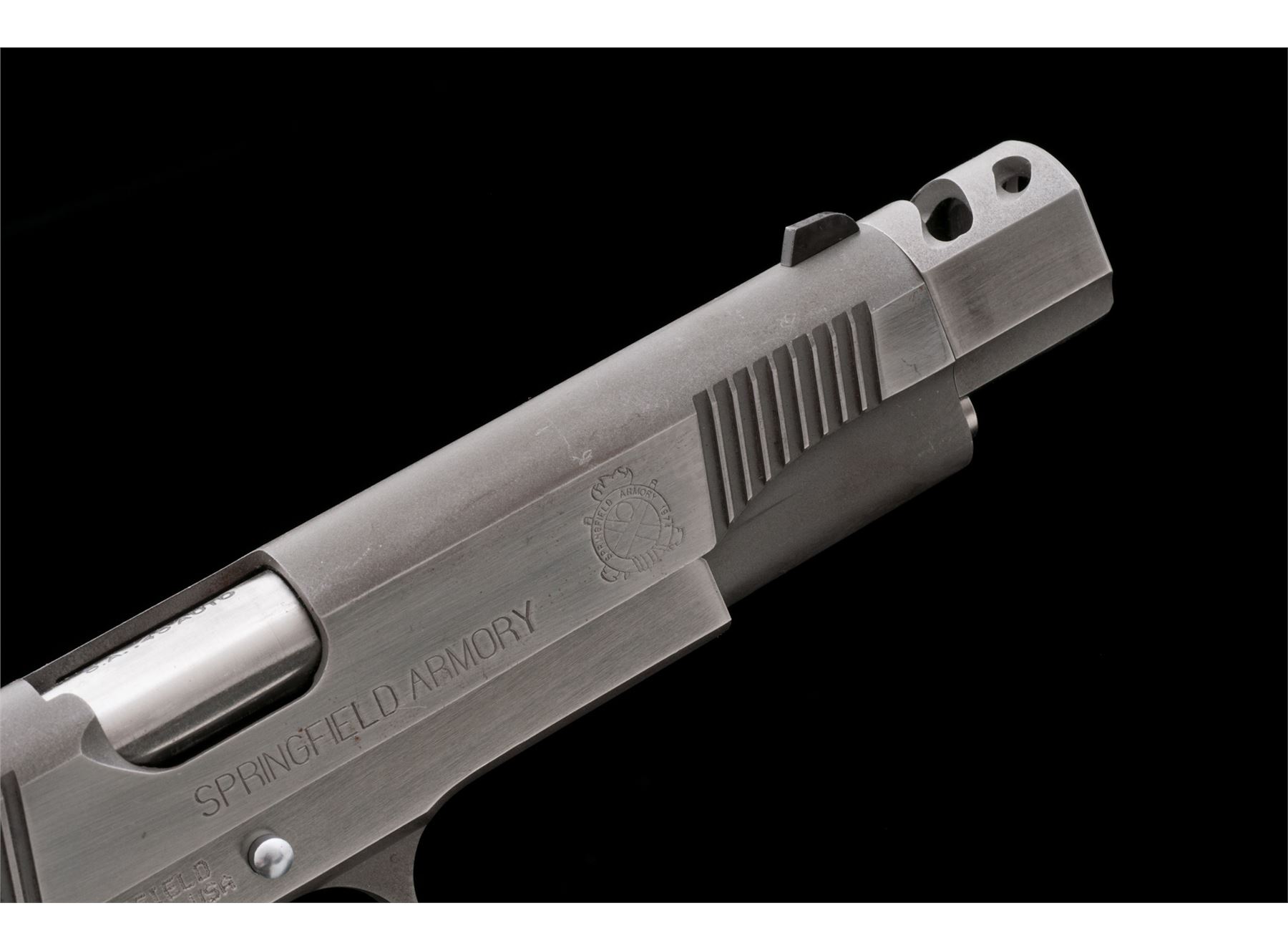 Springfield Armory Model 1911-A1 Semi-Automatic Pistol, N401391, .45 ACP cal., 5'' barrel, stainless steel, slide with a 1'' ported extension, wraparound black rubber Hogue grips with finger grooves, skeletonized hammer and trigger, fixed blade front sight, Novak's rear sight, lanyard ring, no magazine. Bottom of frame is marked ''FI Brazil''; lower right side of triggerguard is marked ''SS''. In original blue plastic SA case with matching end label. Condition is very good with moderate scuffs and small scratches from range use. Factory lettering is clear and defined. Action is smooth; bore shows normal light wear and rates as near excellent. Est.: $400-$600. (Modern) (Not available to Calif. residents.)
