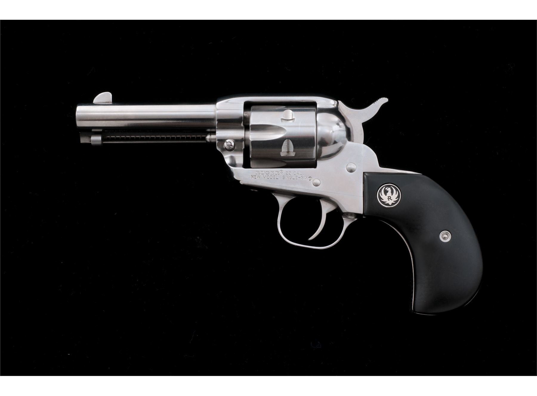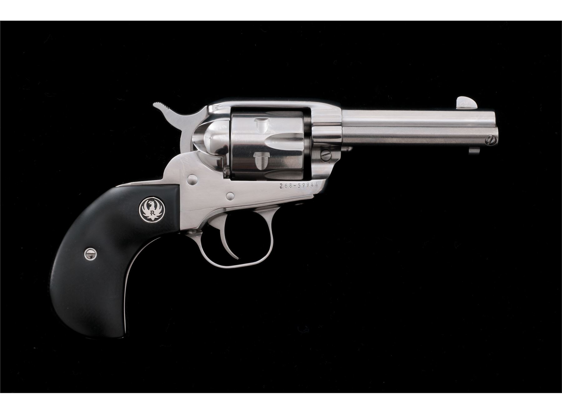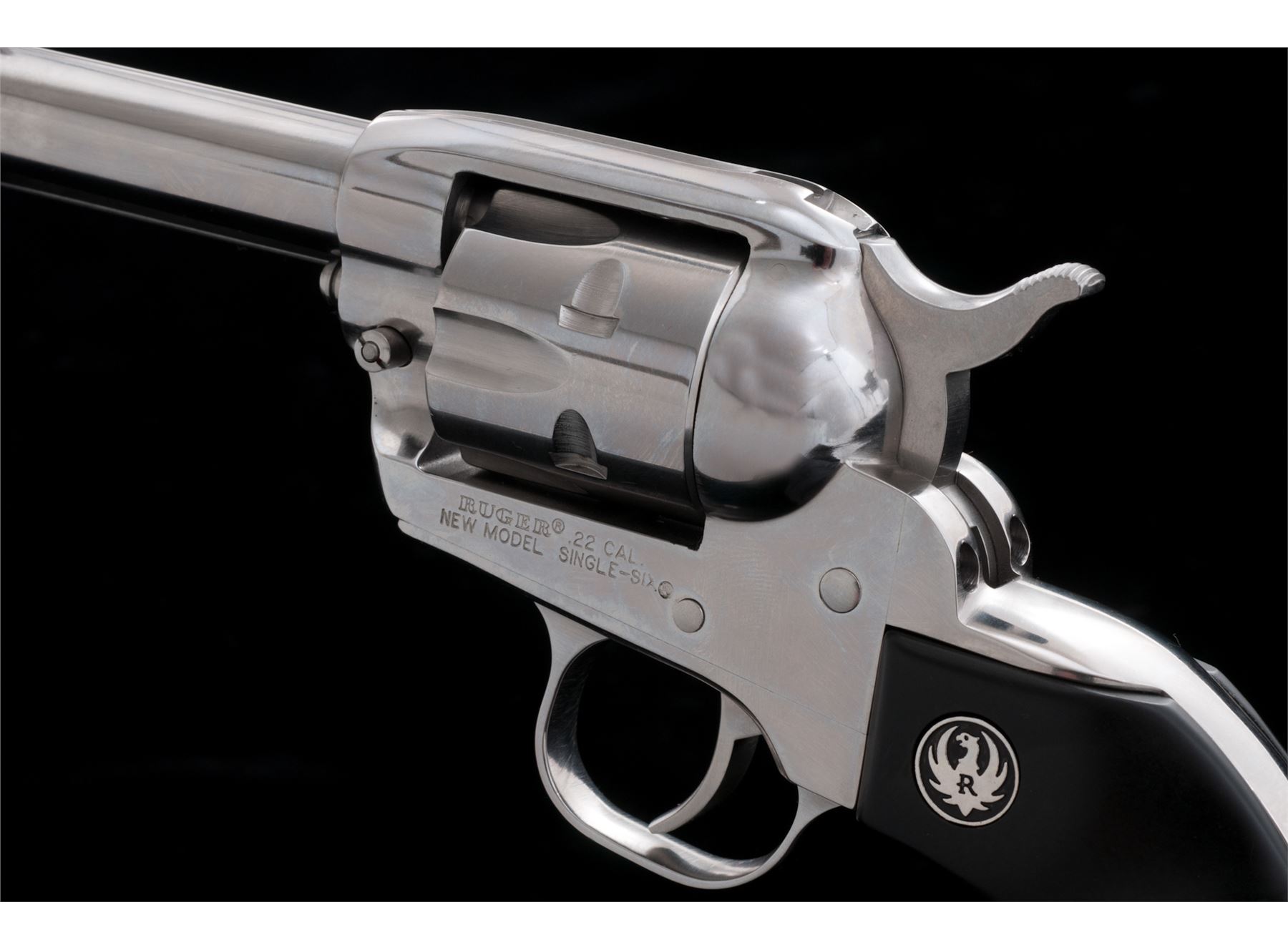 Ruger Talo Exclusive New Model Single-Six Single Action Revolver, #268-59944, .22 LR with an additional roll marked .22 Win. mag. cylinder; both are numbered to the gun. 3.75'' barrel, stainless finish, bird's head grip frame, black composite grips with silver eagle Ruger medallions, and standard fixed sights. In original gray plastic Ruger case with matching end label, owner's manual, and gun lock. Overall condition is excellent and this revolver shows signs of little use; inside of frame with a few spots of minor powder residue, cylinders with faint index lines. Metal shows light handling marks, most noticeable on right side of frame. Grips appear as new with no mentionable wear. Action is smooth and crisp; mirror bright bore rates excellent. Est.: $400-$600. (Modern/Exempt)