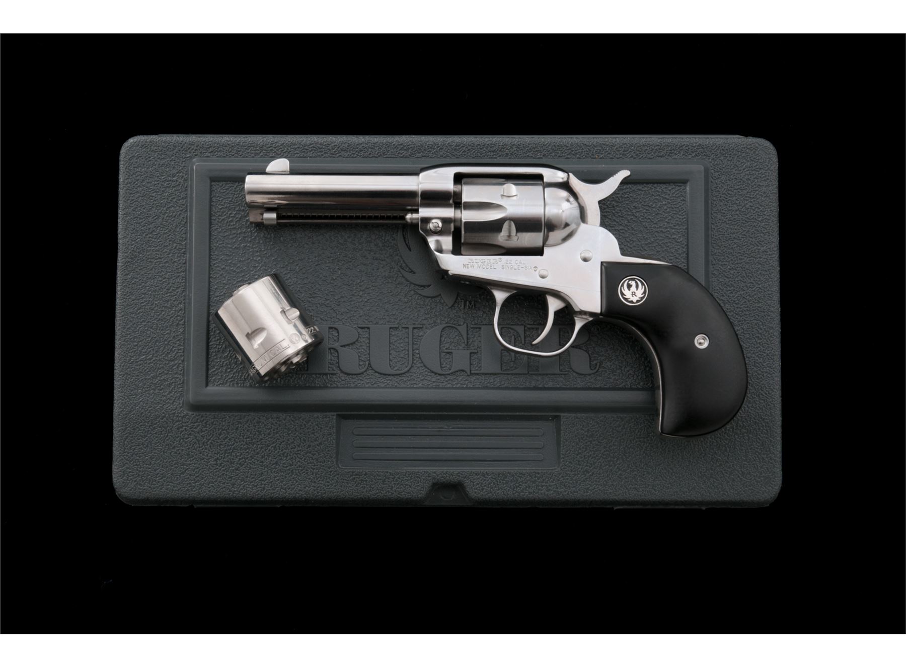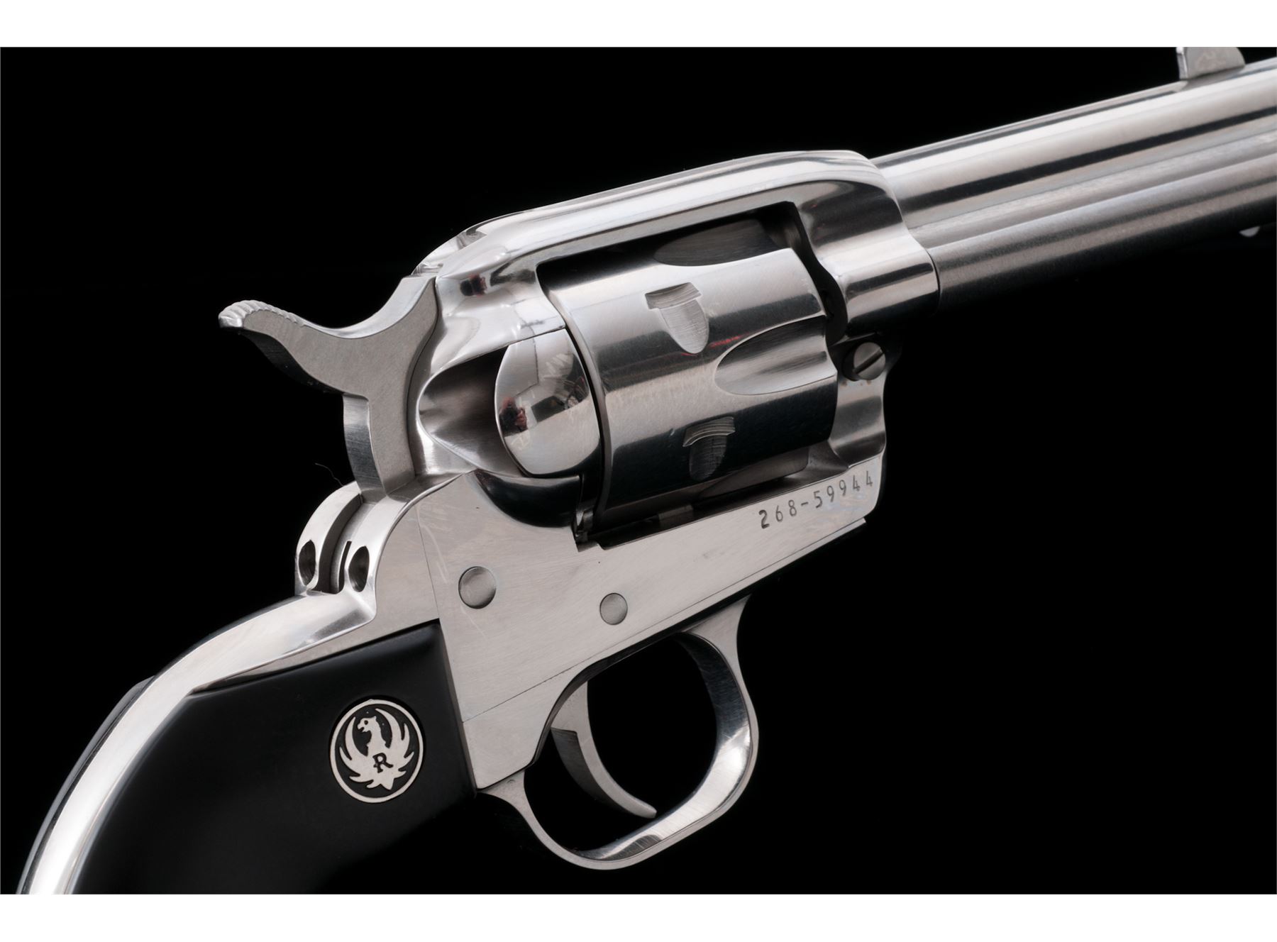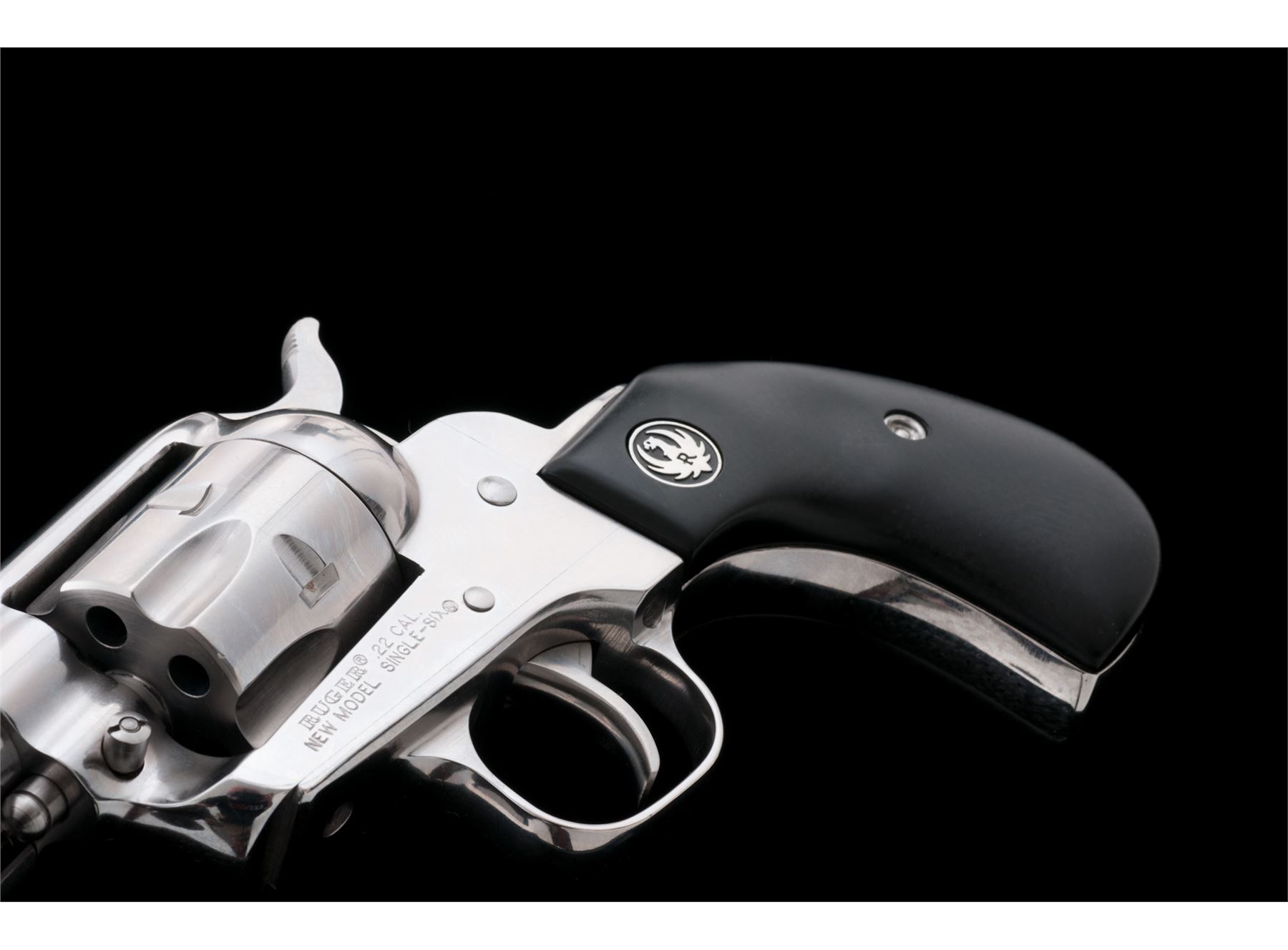 Ruger Talo Exclusive New Model Single-Six Single Action Revolver, #268-59944, .22 LR with an additional roll marked .22 Win. mag. cylinder; both are numbered to the gun. 3.75'' barrel, stainless finish, bird's head grip frame, black composite grips with silver eagle Ruger medallions, and standard fixed sights. In original gray plastic Ruger case with matching end label, owner's manual, and gun lock. Overall condition is excellent and this revolver shows signs of little use; inside of frame with a few spots of minor powder residue, cylinders with faint index lines. Metal shows light handling marks, most noticeable on right side of frame. Grips appear as new with no mentionable wear. Action is smooth and crisp; mirror bright bore rates excellent. Est.: $400-$600. (Modern/Exempt)