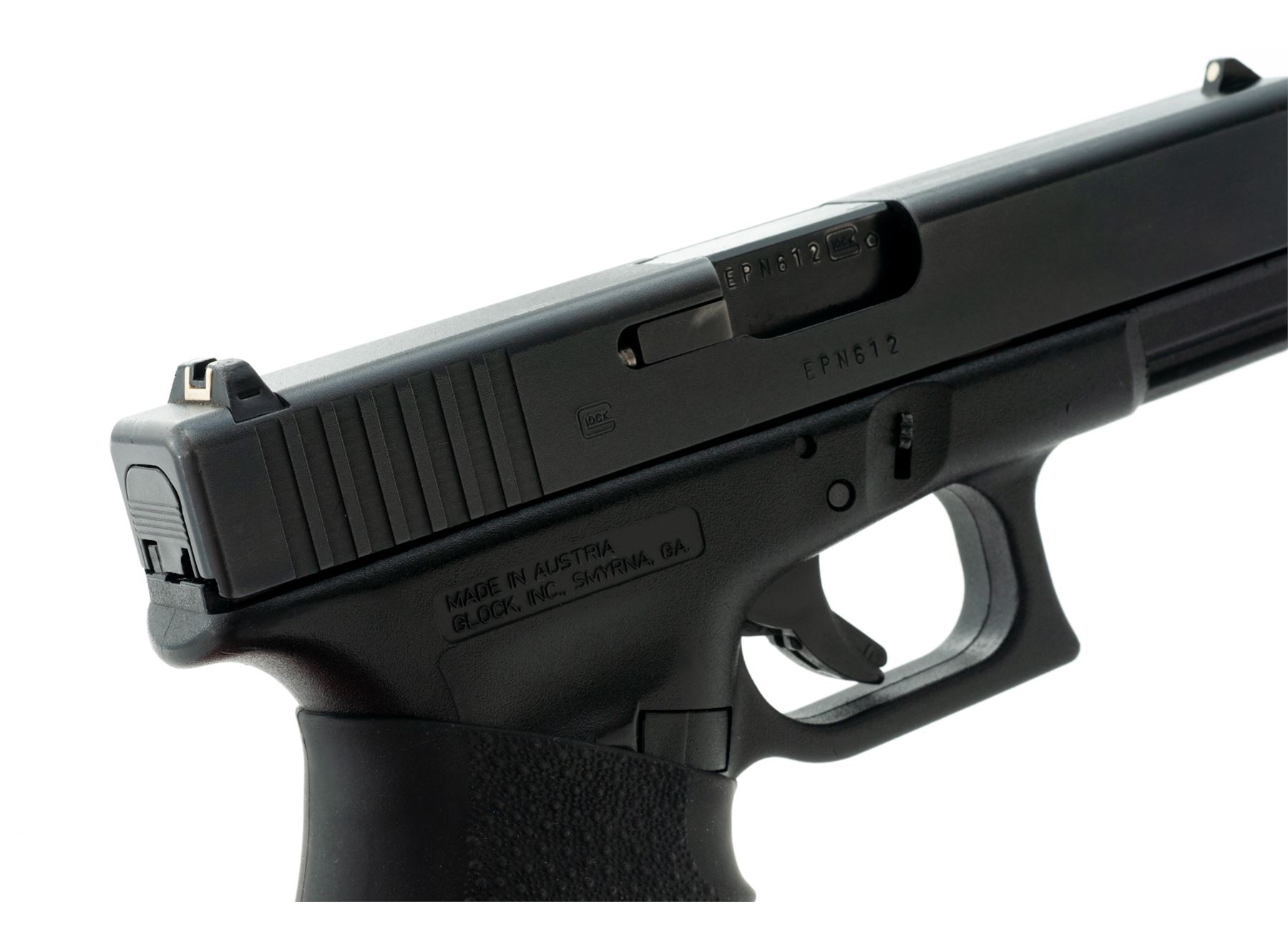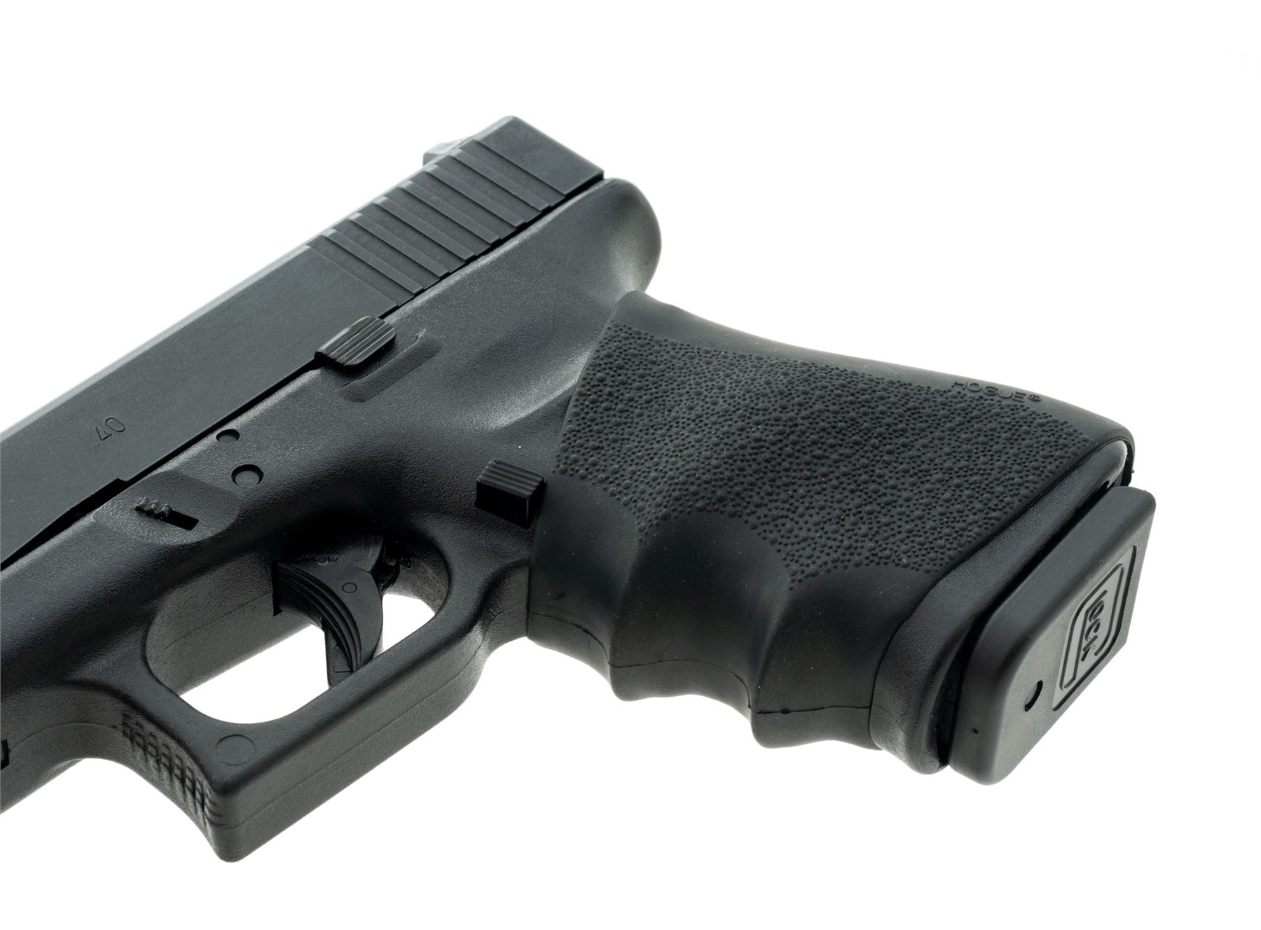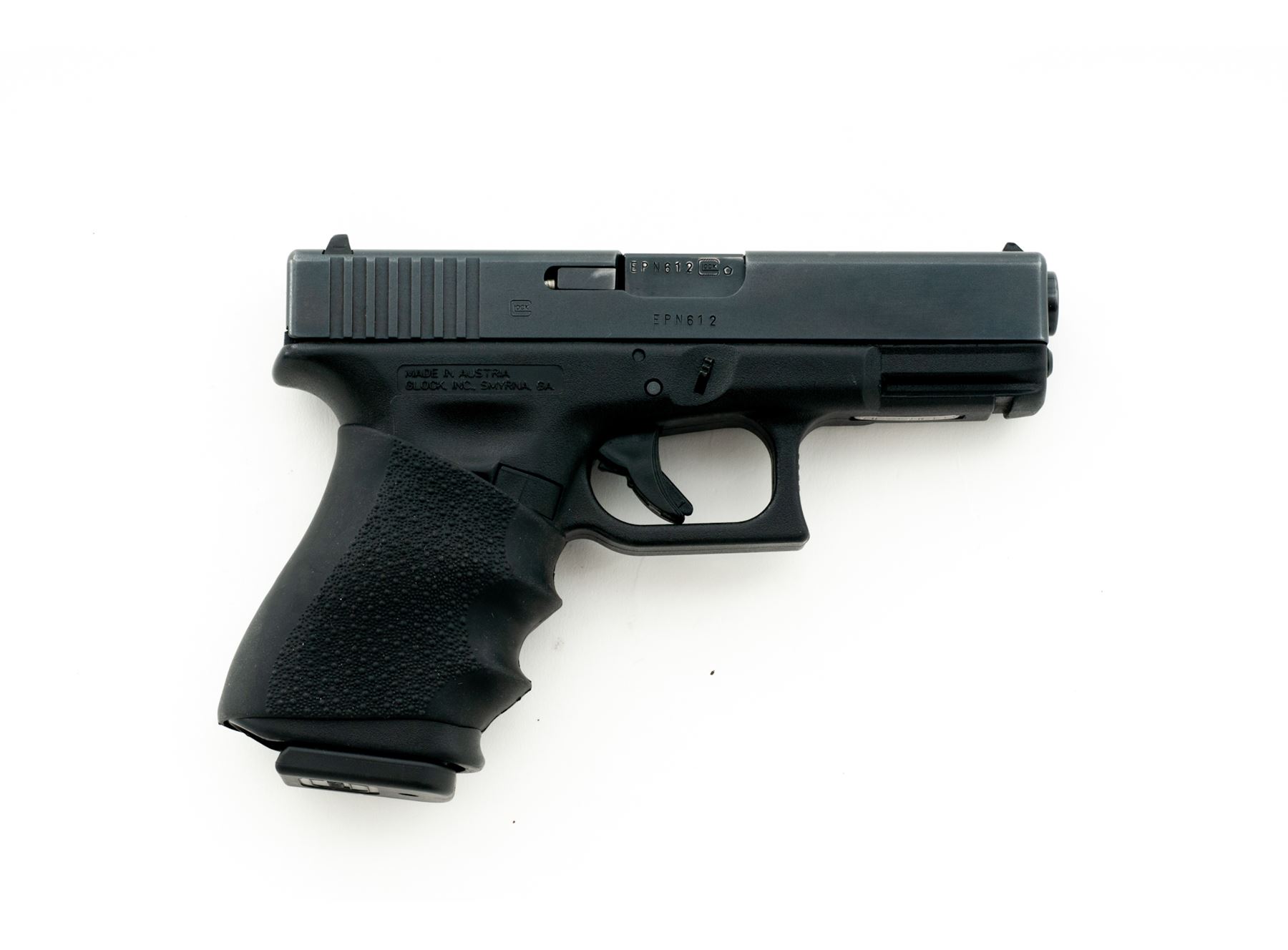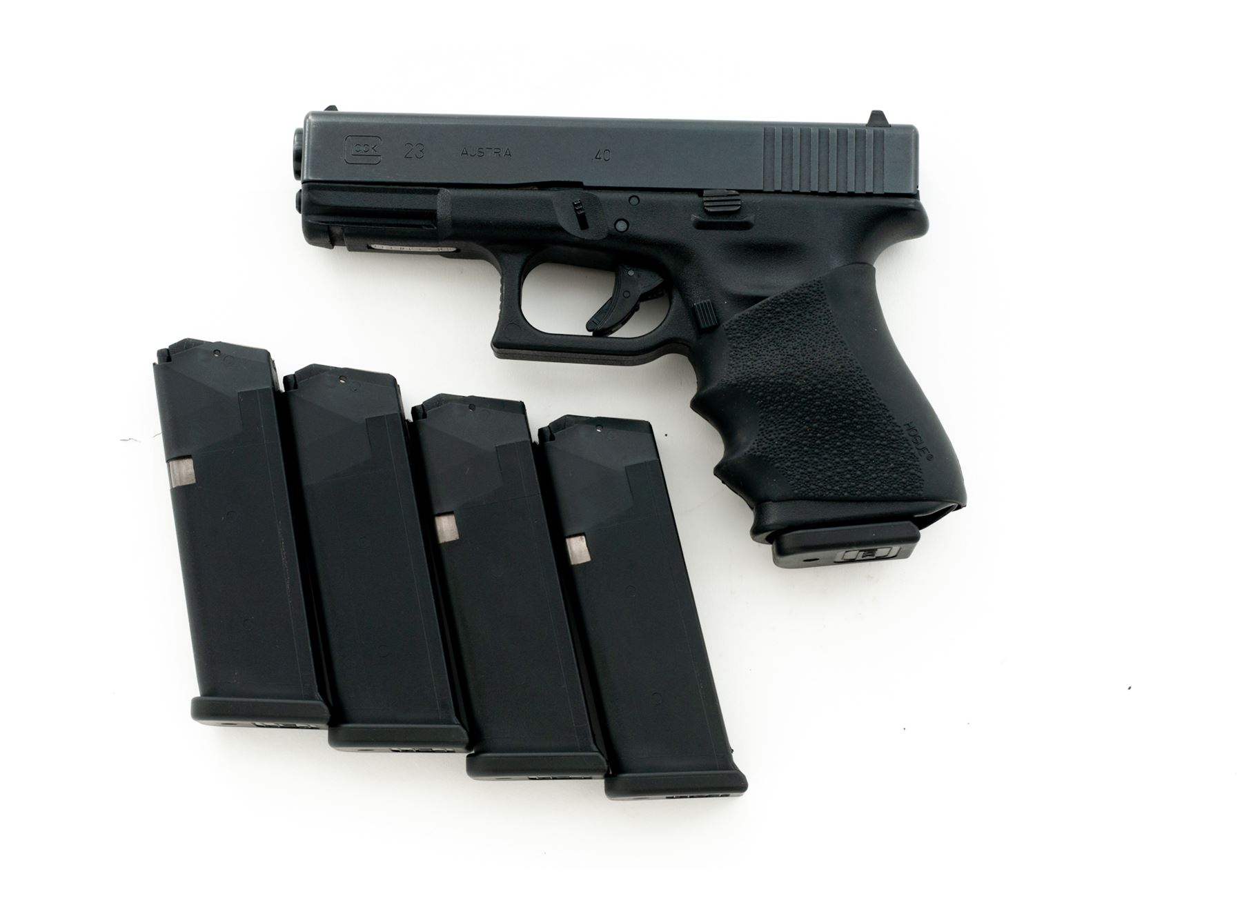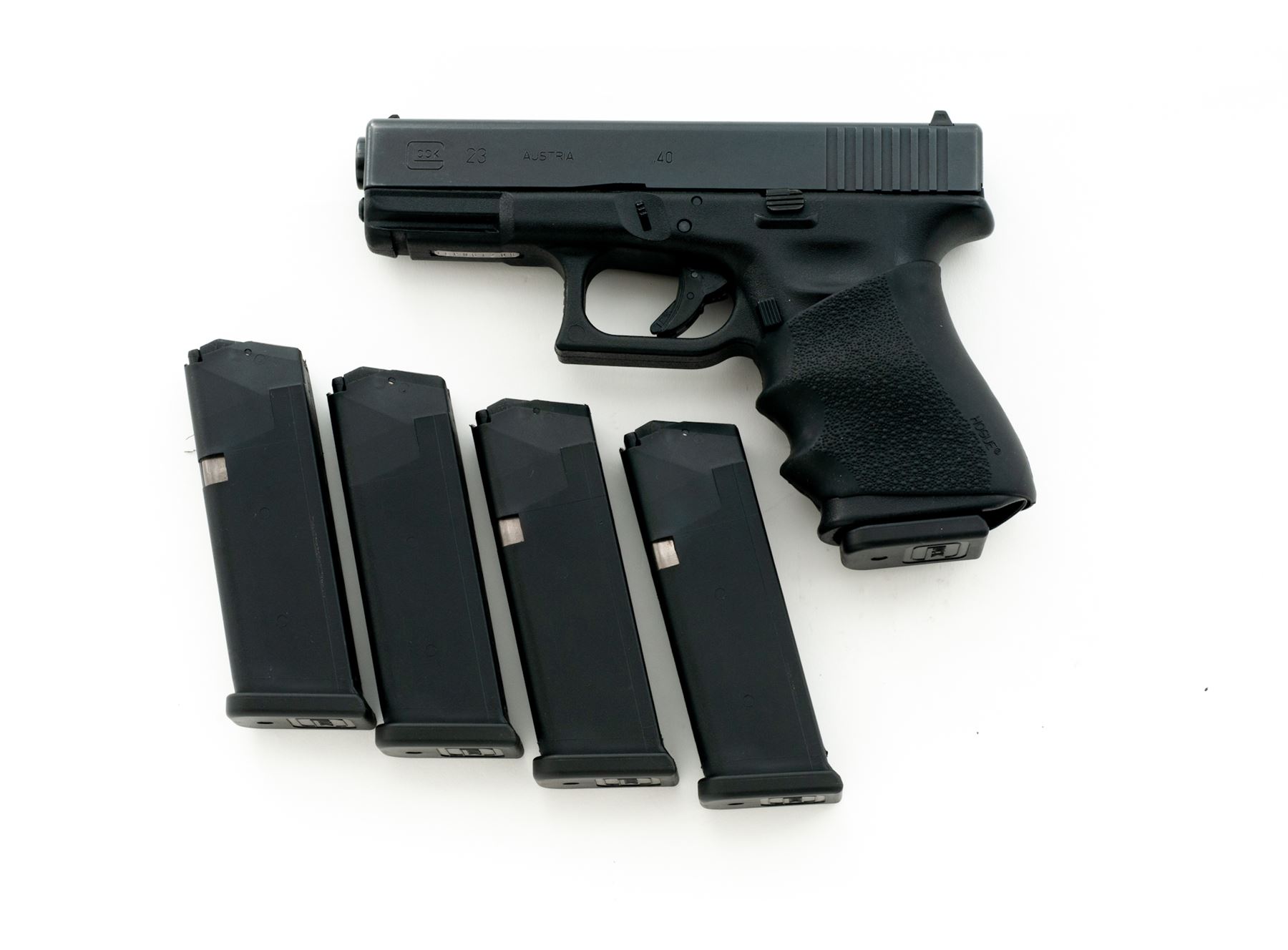Glock Model 23 Gen 3 Semi-Automatic Pistol, with five (5) magazines, #1EPN612US, .40 S&W cal., 4'' barrel, black finish, black polymer frame with finger grooves, white-dot front sight and white outline rear sight. Grip with an added slip over finger-grooved and stippled black rubber grip adapter. Included are five (5) 10-round Glock magazines, cleaning rod, and loader. Overall the condition is excellent, appearing near new. Slide shows a few slight storage and handling marks. Smooth and tight action; mirror bright bore with strong rifling; overall showing signs of minimal handling and use. Est.: $400-$600. (Modern/PPT)