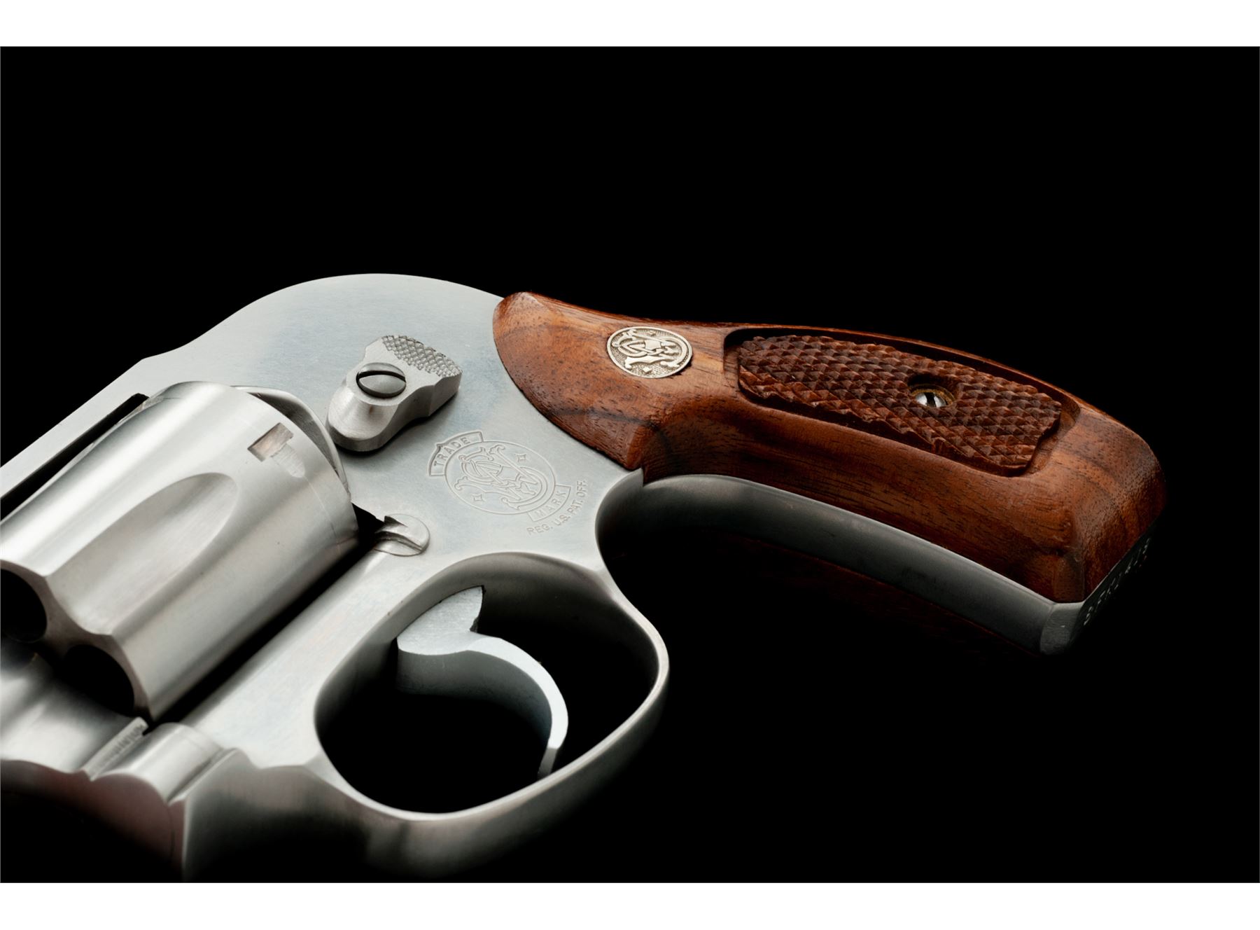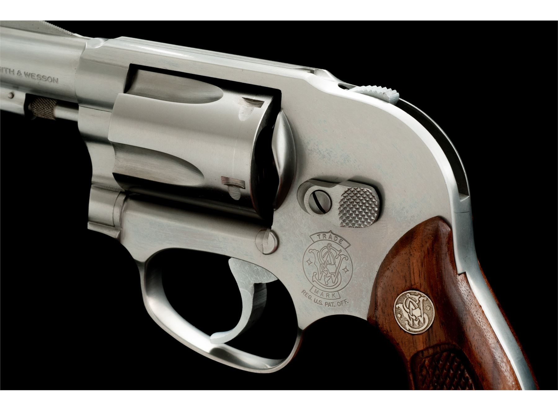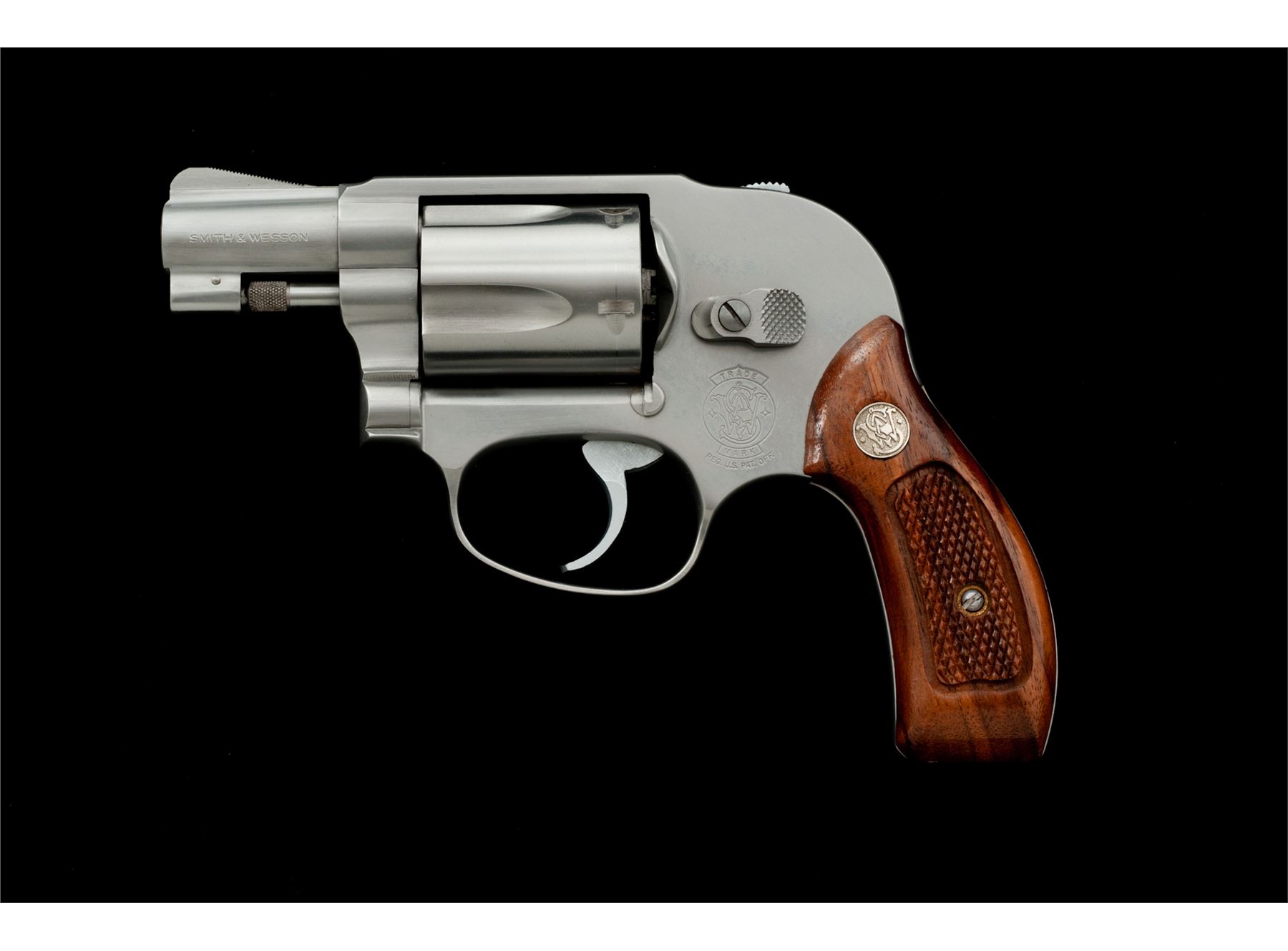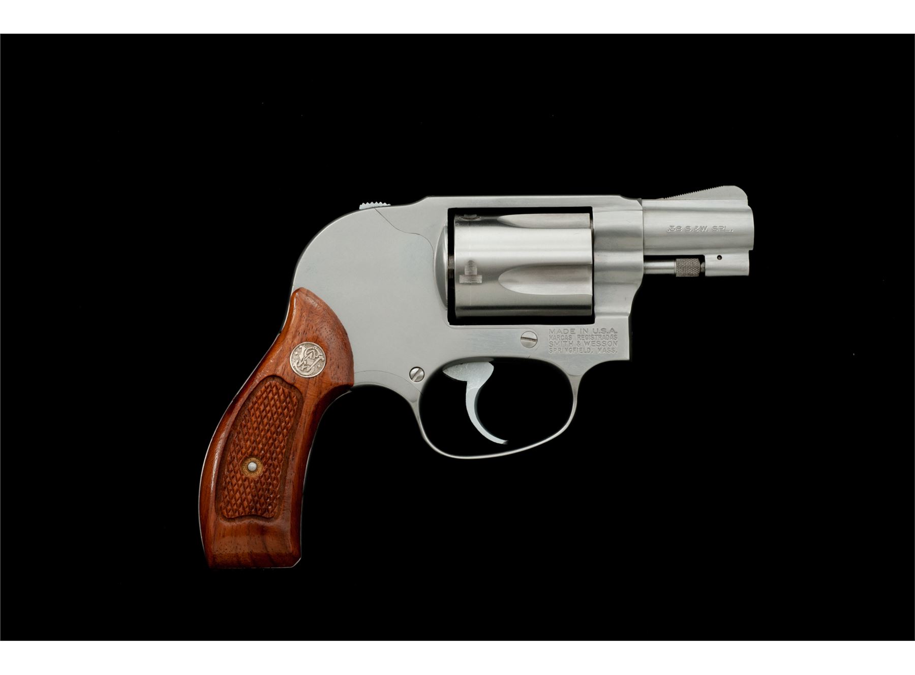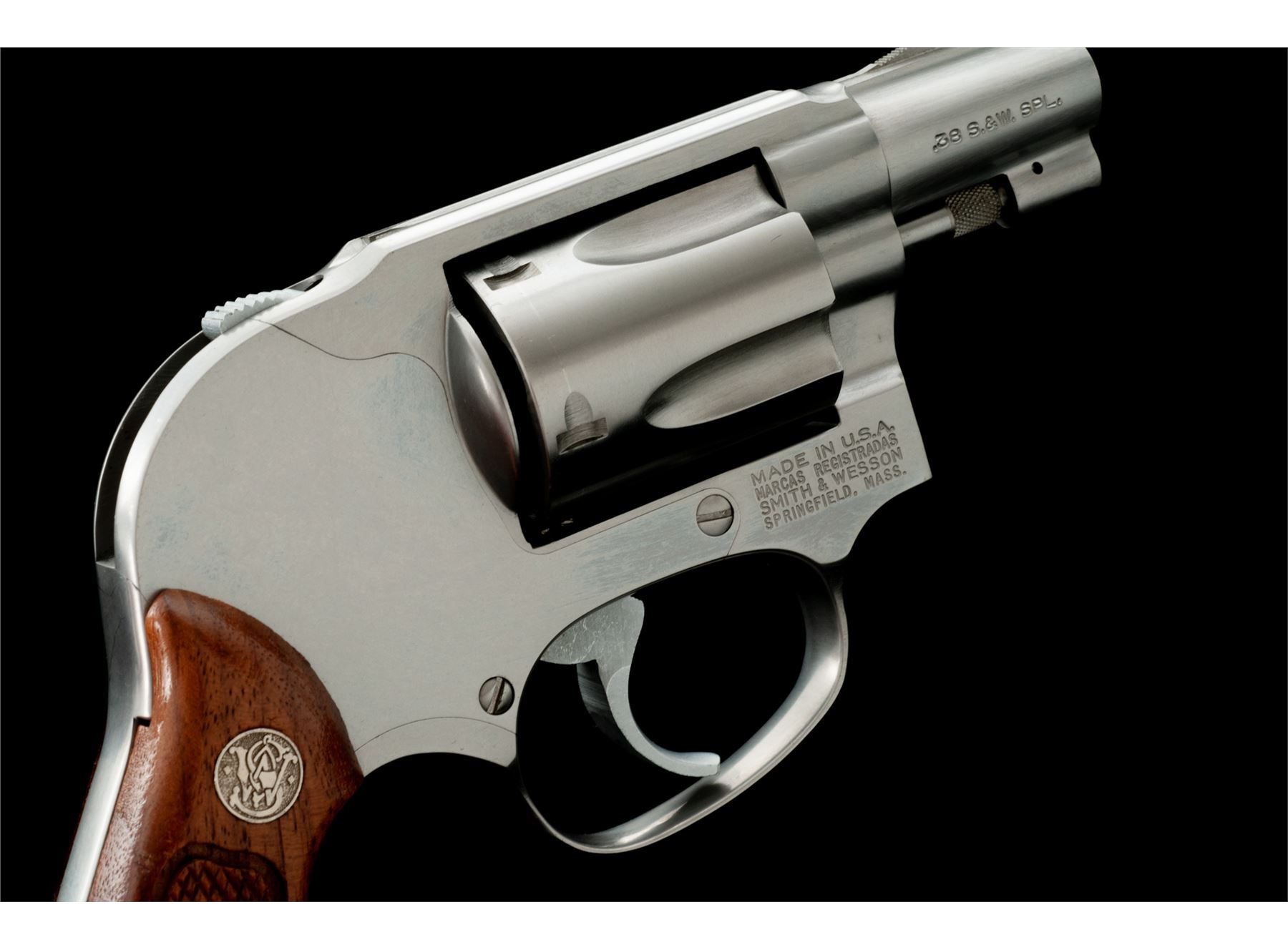 Smith & Wesson Model 649-1 Bodyguard Double Action Revolver, #BFK1419, .38 Spec. cal., 1-7/8'' barrel, satin stainless steel, factory checkered walnut grips with S&W medallions, shrouded hammer, standard fixed sights. Condition is near excellent. Metal with some micro-scratching, cylinder with a light index line. Factory lettering is clean and clear. Grips show only a few very minor handling marks and retain 99% of their original finish, checkering is mostly sharp. Crisp action; near excellent bore. Overall showing only normal signs of light range use. Est.: $350-$550. (Modern/PPT)