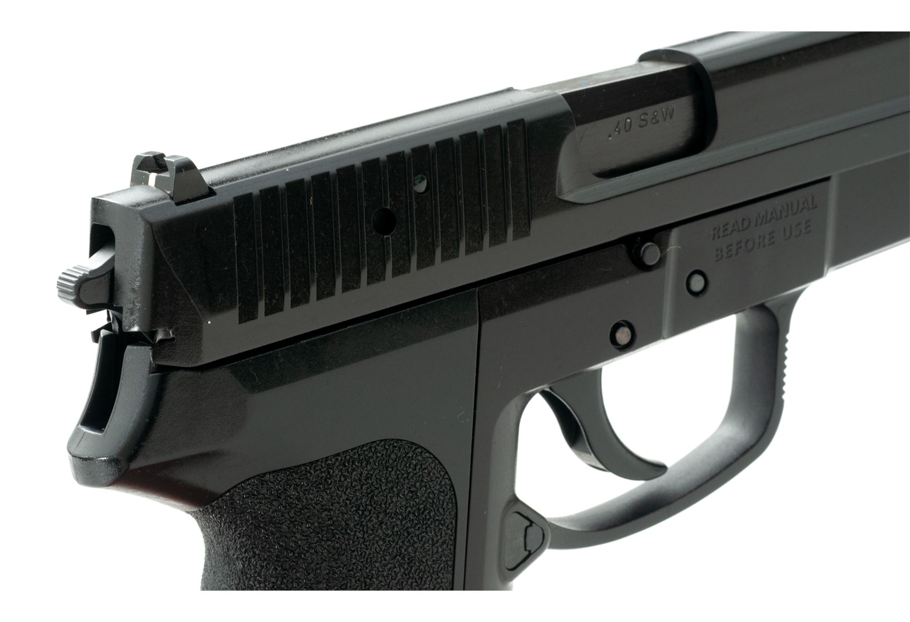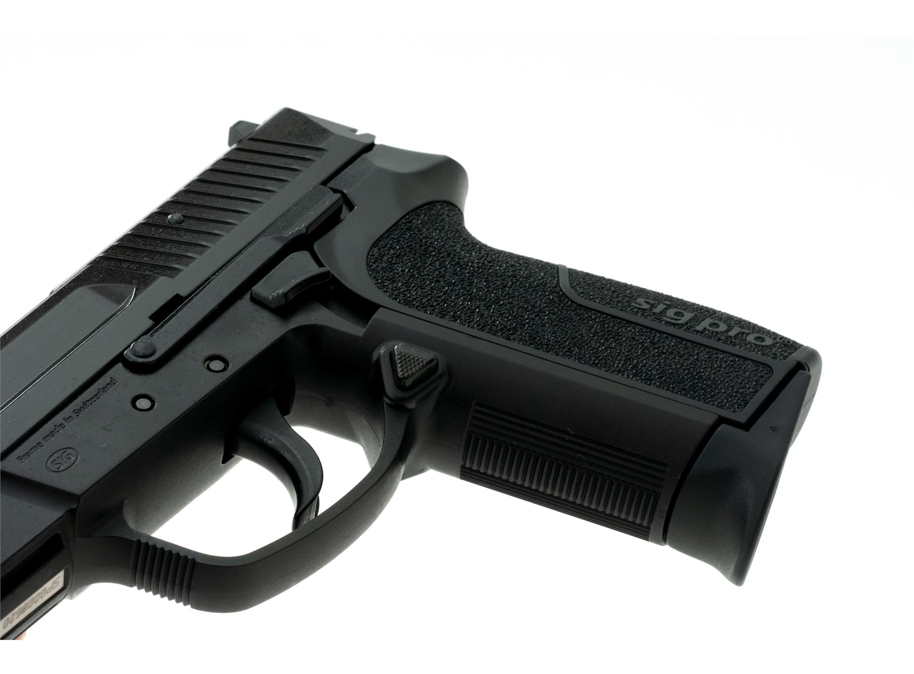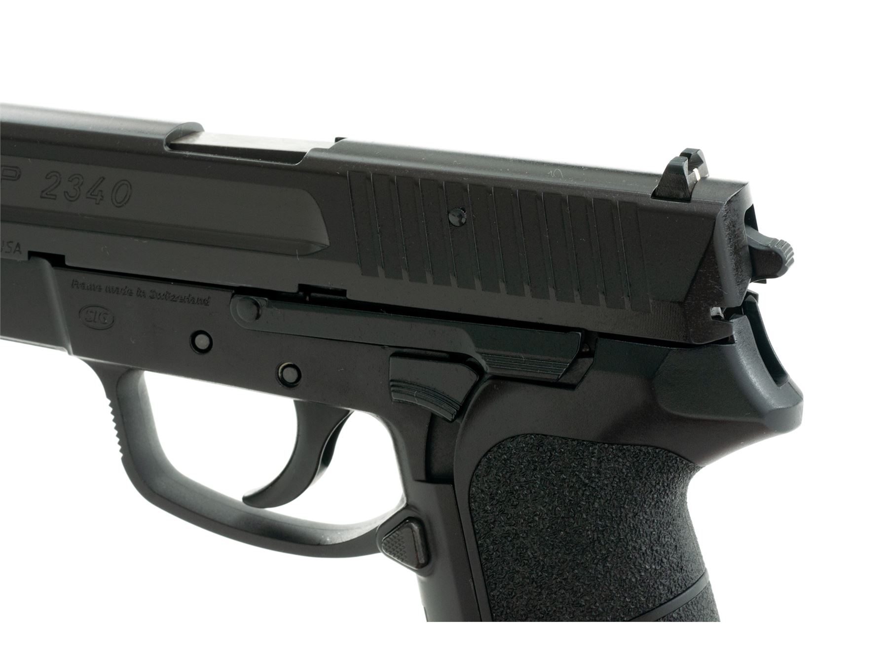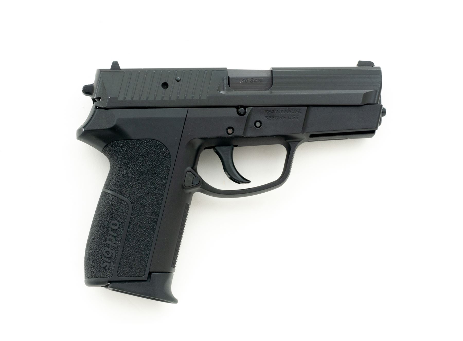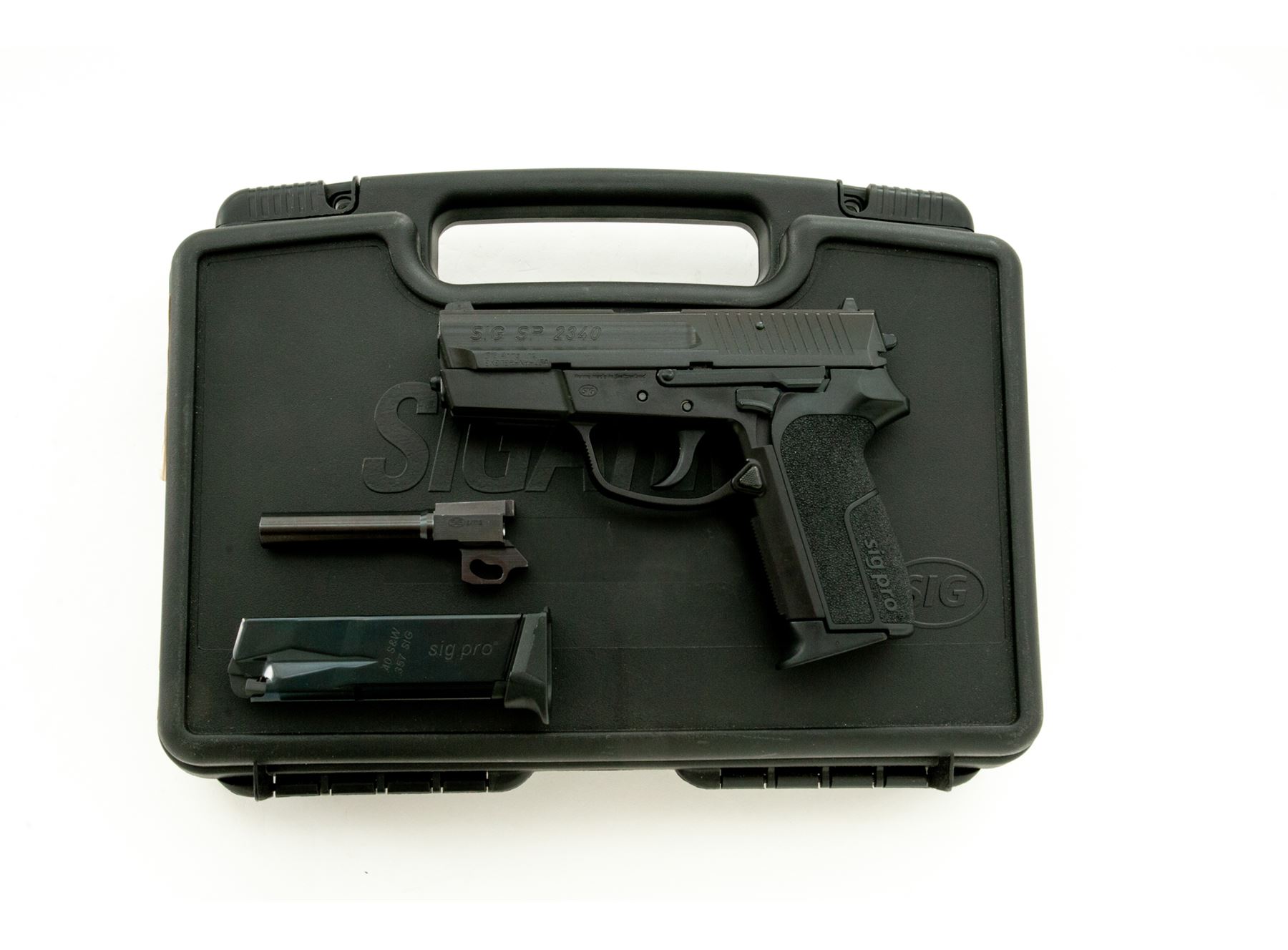 SIG Arms Model SP2340 Semi-Automatic Pistol, #SP0008620, .40 S&W cal., 3-7/8'' barrel, matte black slide, black polymer frame with interchangeable grip, fixed sights, with two (2) 10-round SIG magazines. In original black plastic case with matching end label, additional smooth grip, gun lock, and owner's manual. Condition is excellent, appearing as new, showing only a few insignificant handling marks. Excellent action and mirror bright bore. Overall appearing to have been fired very little. Est.: $300-$500. (Modern/PPT)