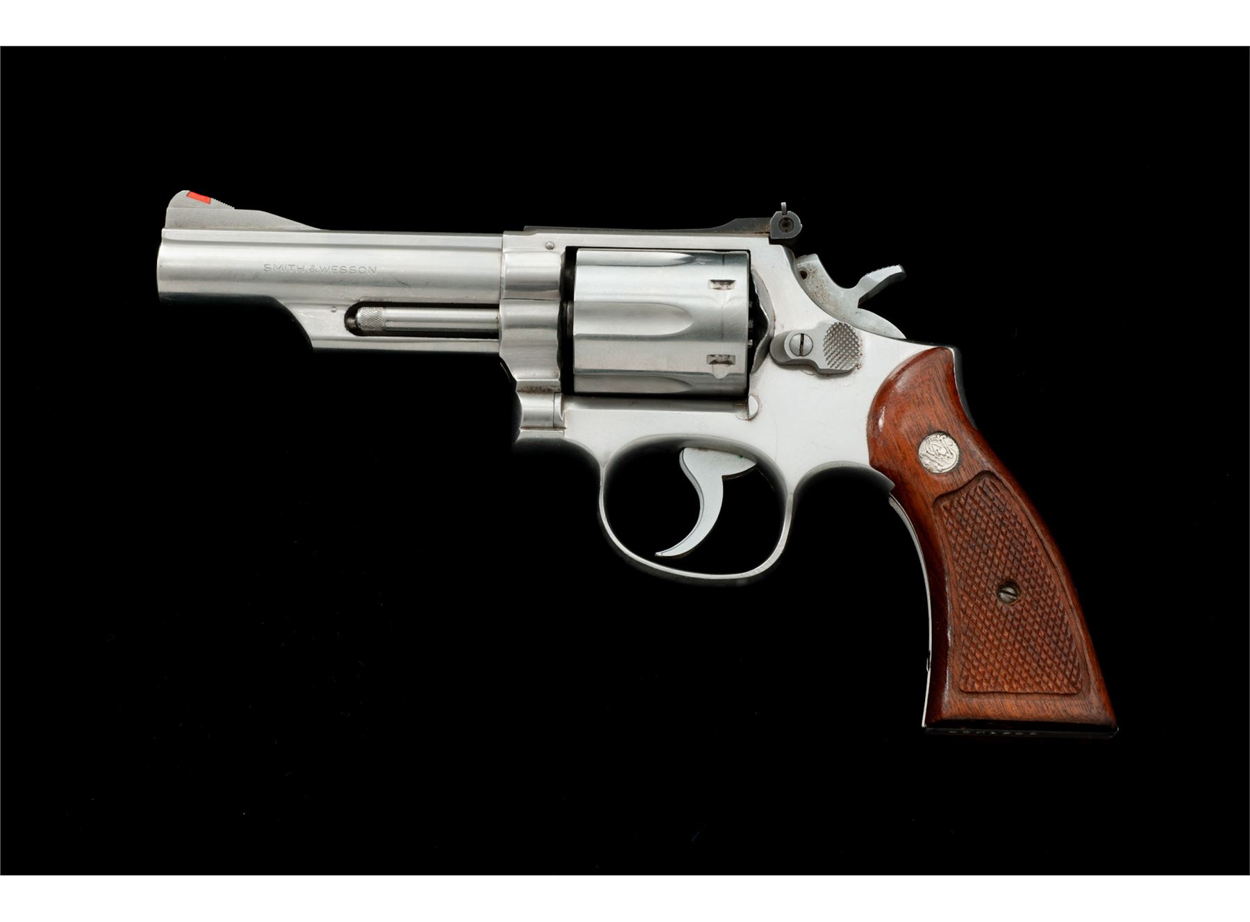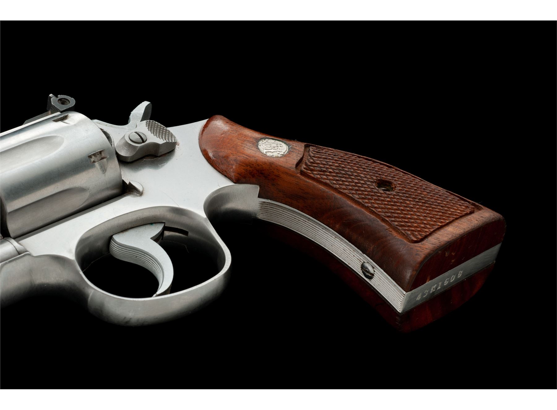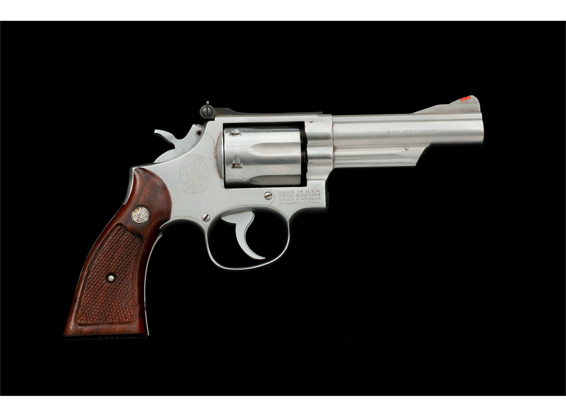 Smith & Wesson Model 66-1 Combat Magnum Double Action Revolver, #43K1608, .357 mag. cal., 4'' pinned barrel, satin stainless steel, factory checkered square butt walnut Magna grips with S&W medallions; grips are numbered to another gun. Sights include a red ramp front and adjustable micrometer click rear sight. Condition is good. Metal with overall light scuffs and scratches; recoil shield is a little dented but it does not affect the function of the revolver. Factory lettering is clear. Grips rate a little higher than the metal with scattered handling marks and moderate darkening, retaining most of their finish. Crisp action, excellent bore. Est.: $250-$450. (Modern/PPT)