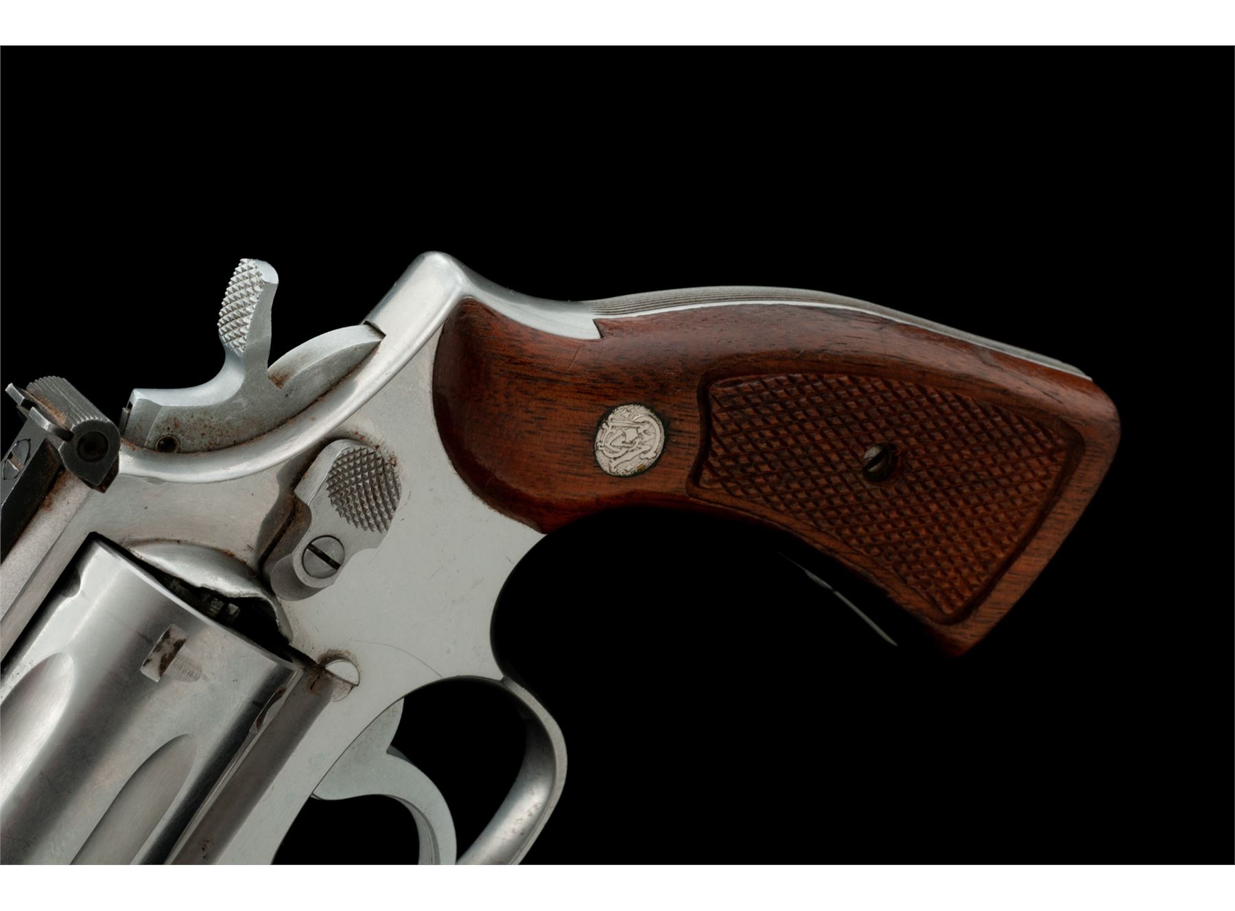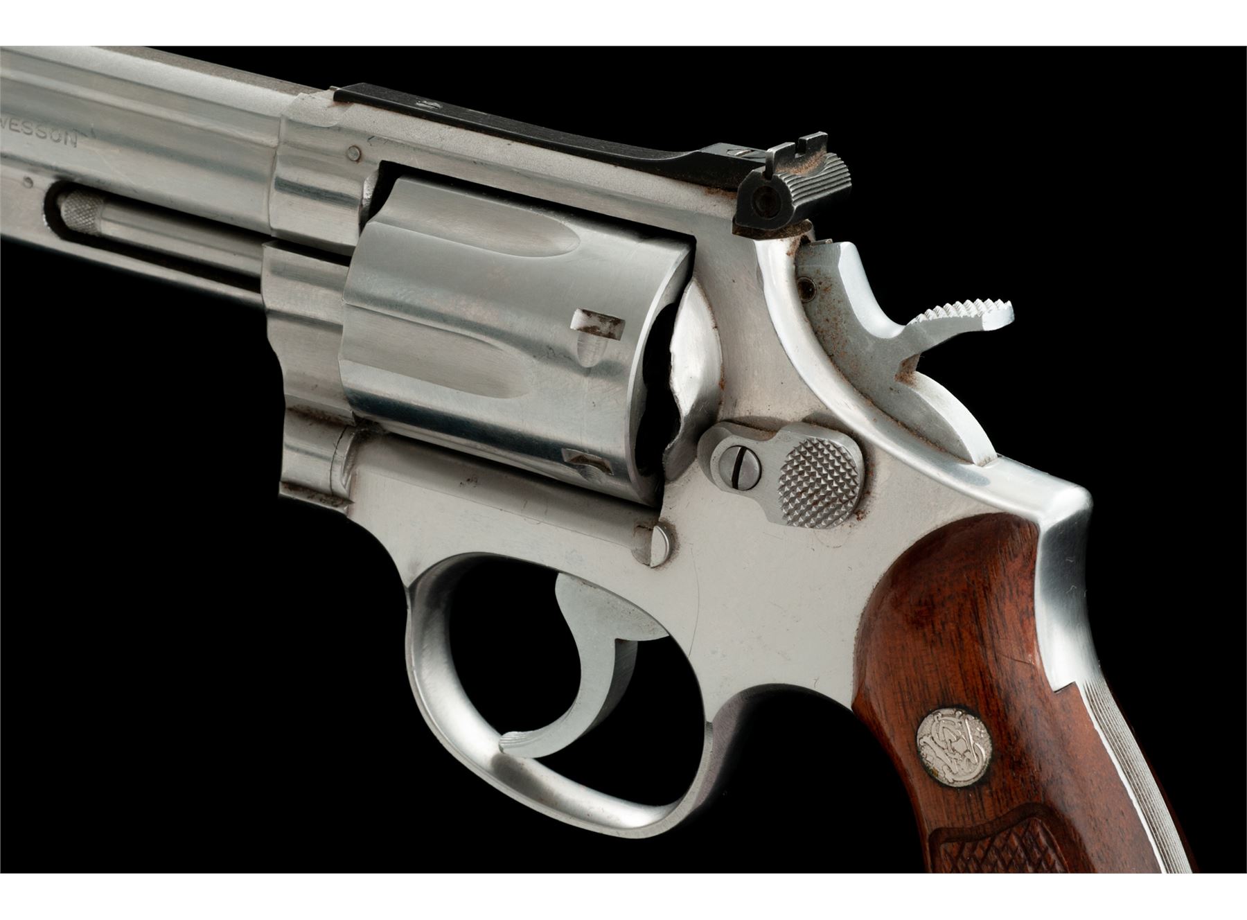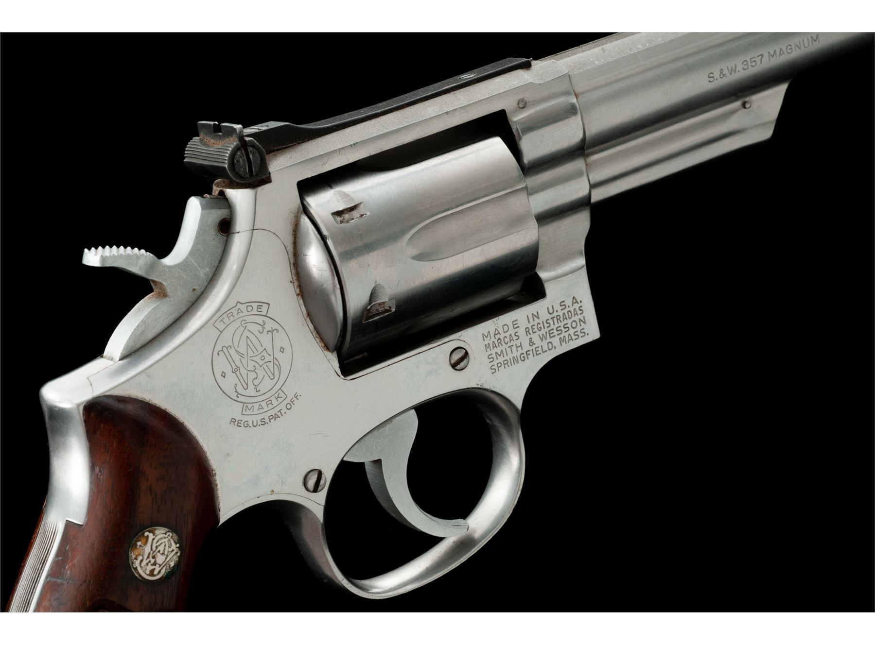 Smith & Wesson Model 66-1 Combat Magnum Double Action Revolver, #43K1608, .357 mag. cal., 4'' pinned barrel, satin stainless steel, factory checkered square butt walnut Magna grips with S&W medallions; grips are numbered to another gun. Sights include a red ramp front and adjustable micrometer click rear sight. Condition is good. Metal with overall light scuffs and scratches; recoil shield is a little dented but it does not affect the function of the revolver. Factory lettering is clear. Grips rate a little higher than the metal with scattered handling marks and moderate darkening, retaining most of their finish. Crisp action, excellent bore. Est.: $250-$450. (Modern/PPT)