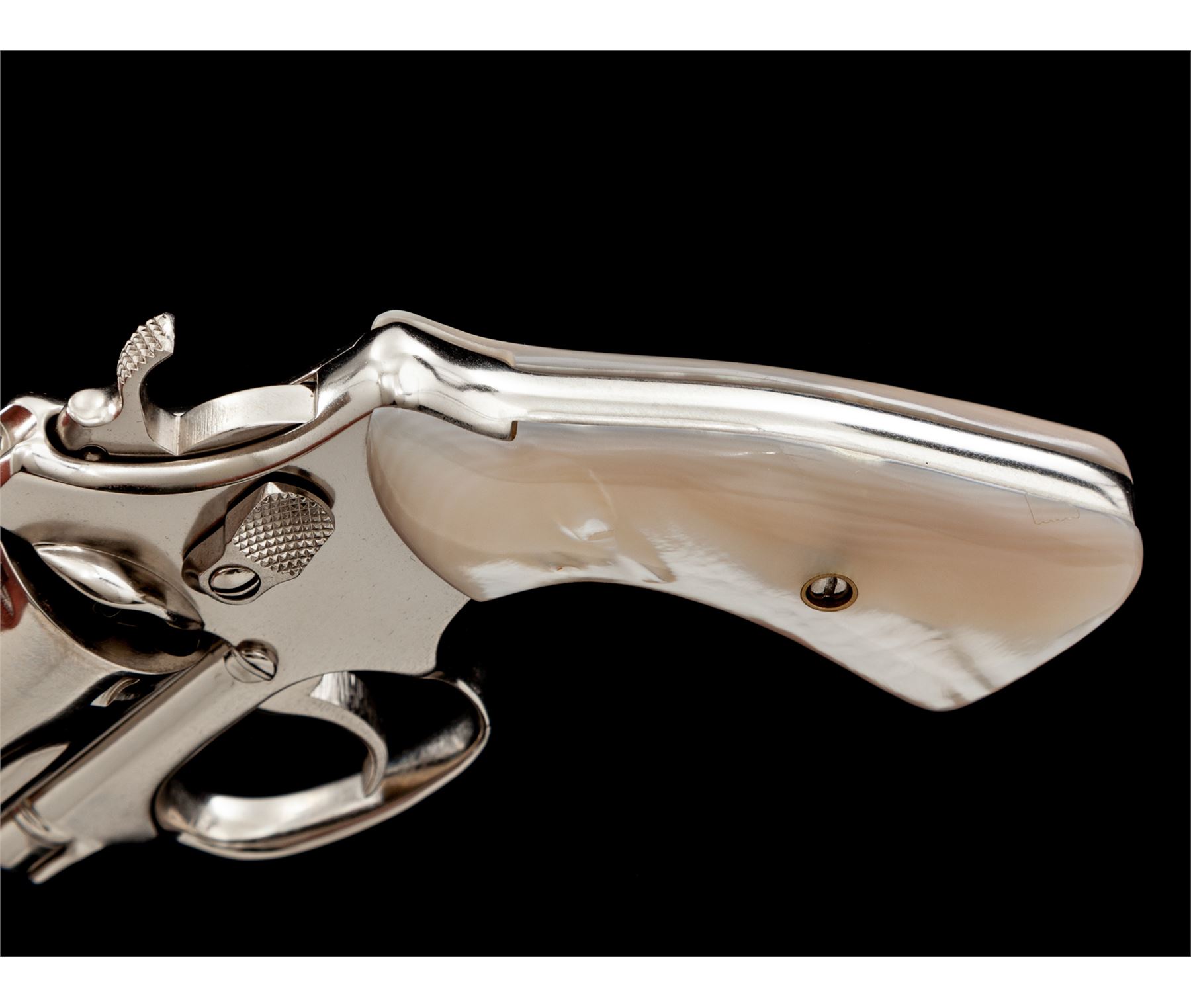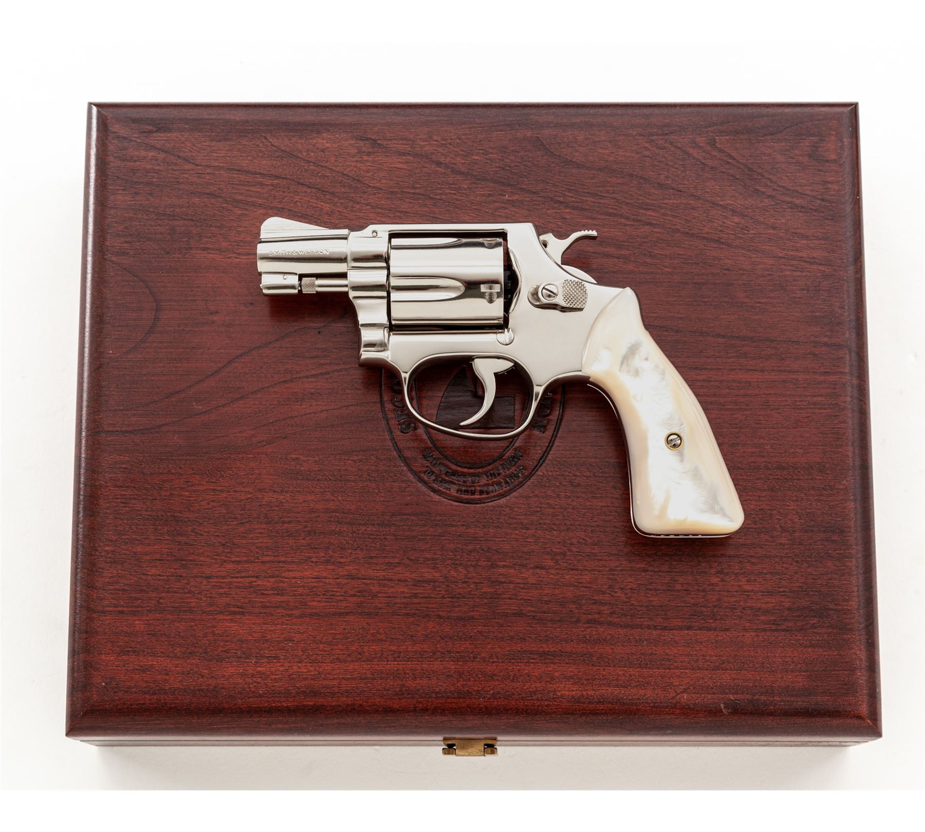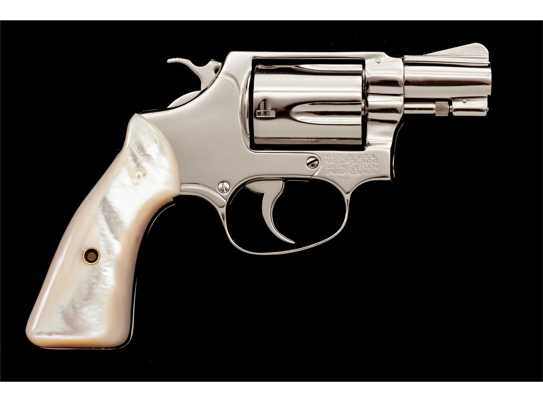 Custom Smith & Wesson Model 37 Double Action Revolver, #J94311, .38 Spec. cal., 2'' pinned barrel, lightweight frame, nickel finish, pearl grips, with fixed sights. Lightly tuned action with 2.6 lb. single action trigger pull, with all custom work by George DeLio. All in Second Amendment Foundation red satin lined presentation case. Condition appears near new as expertly renickeled, with the faintest index mark to cylinder and no caliber markings to right side of barrel. Grips with slight pinkish hue remain extremely iridescent. Bore is very good. Case is excellent. Est.: $350-$500. (Modern/PPT)