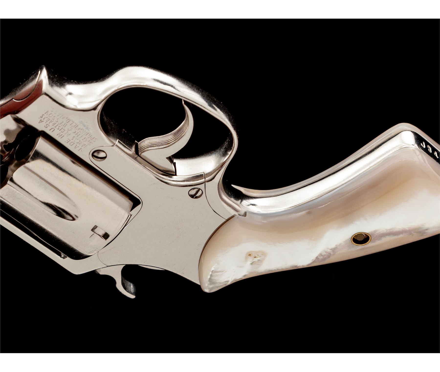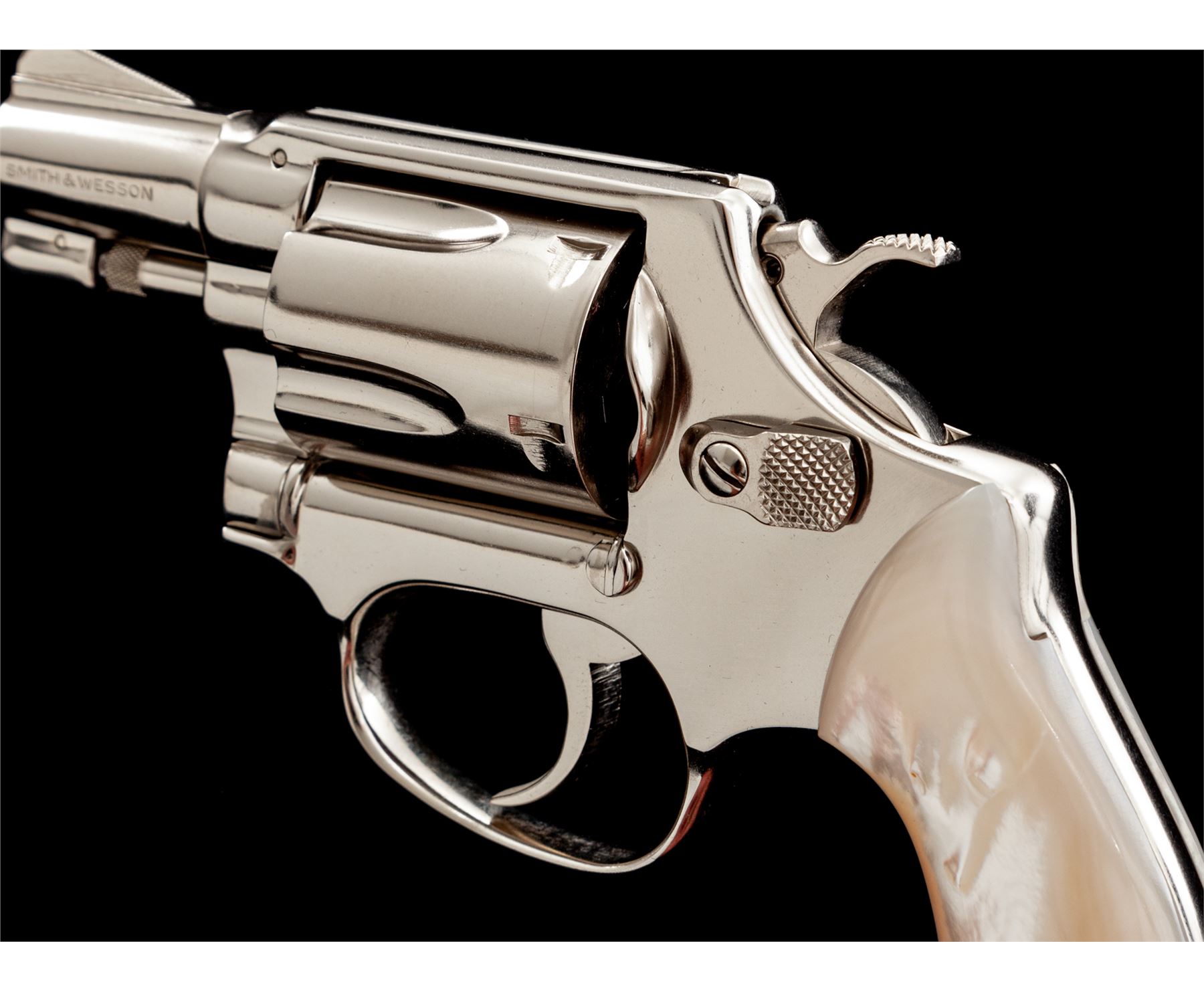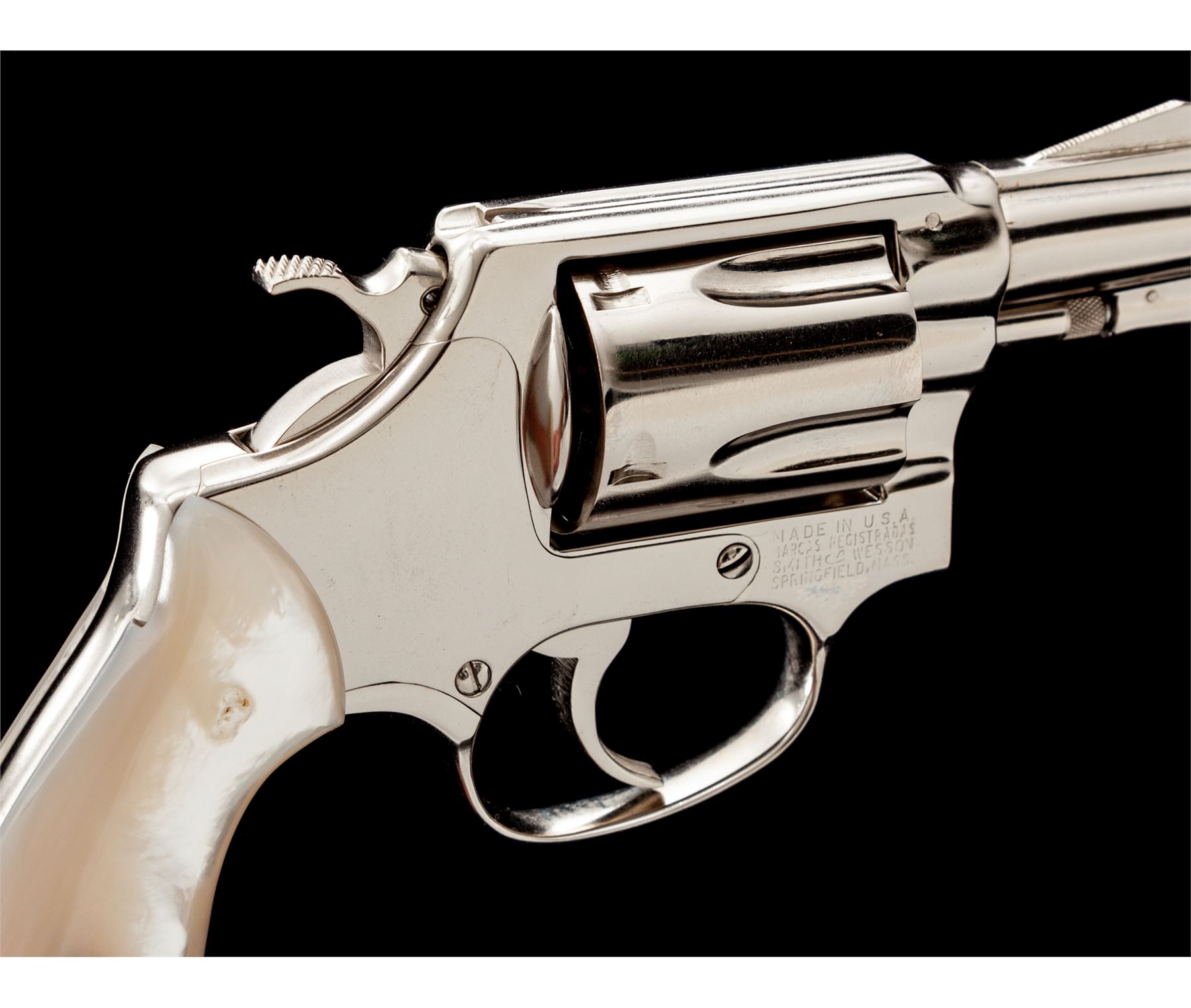 Custom Smith & Wesson Model 37 Double Action Revolver, #J94311, .38 Spec. cal., 2'' pinned barrel, lightweight frame, nickel finish, pearl grips, with fixed sights. Lightly tuned action with 2.6 lb. single action trigger pull, with all custom work by George DeLio. All in Second Amendment Foundation red satin lined presentation case. Condition appears near new as expertly renickeled, with the faintest index mark to cylinder and no caliber markings to right side of barrel. Grips with slight pinkish hue remain extremely iridescent. Bore is very good. Case is excellent. Est.: $350-$500. (Modern/PPT)