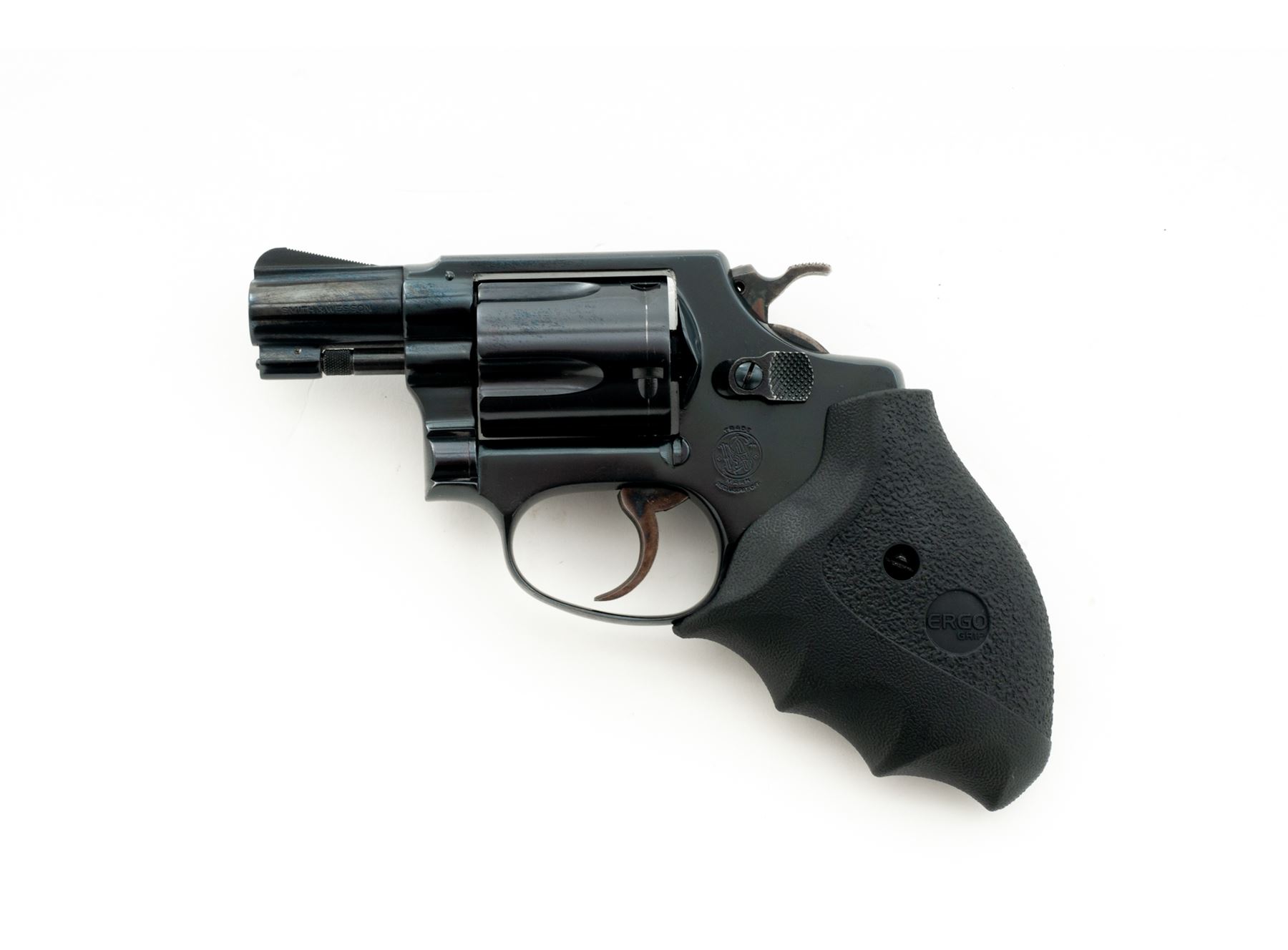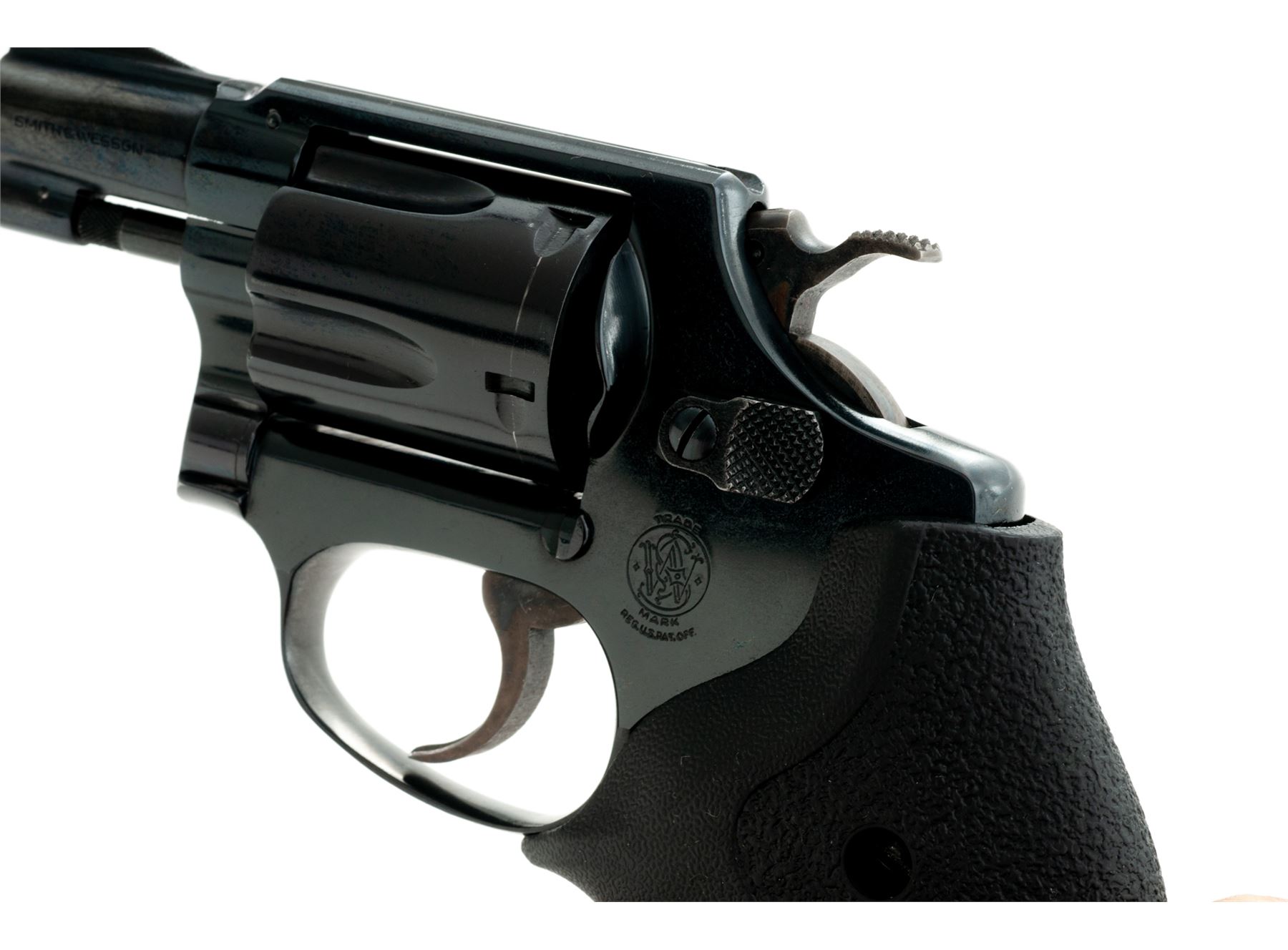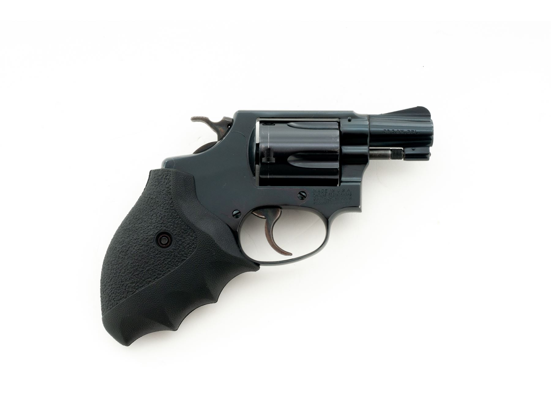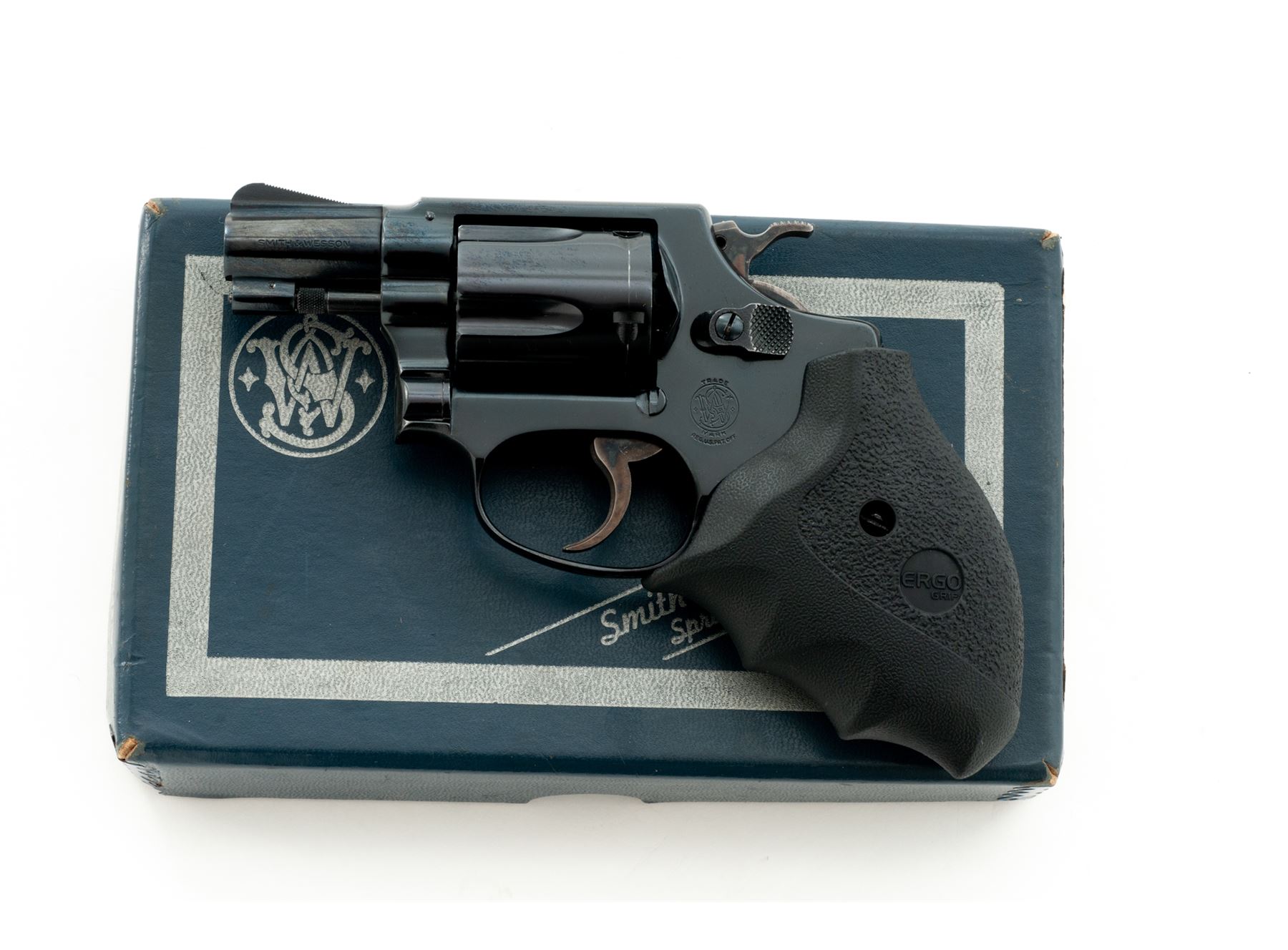 Smith & Wesson Model 36 Chief's Special Double Action Revolver, #500458, .38 Spec. cal., 1-7/8'' pinned barrel, blue finish, round butt, black rubber finger grooved Ergo grip, case hardened hammer and trigger, with standard fixed sights. In original two-piece blue box that is numbered to the gun. Revolver is in fine overall condition with approx. 97%-98% original finish; 95% case colors. Metal shows scattered light micro-scratching and small handling marks, most noticeable on the sideplate; cylinder with a thin index line. Factory lettering is clear and defined. Aftermarket grips rate as excellent with only normal slight handling marks. Excellent crisp action and bore. Box exterior shows normal light storage wear, handwritten end label is a little faded. Est.: $350-$550. (C&R/PPT)