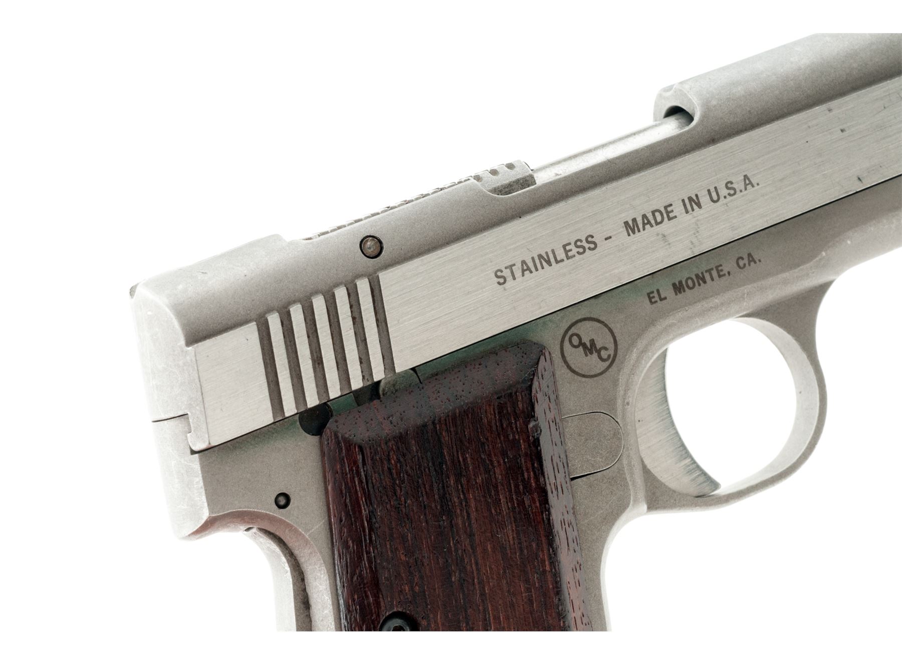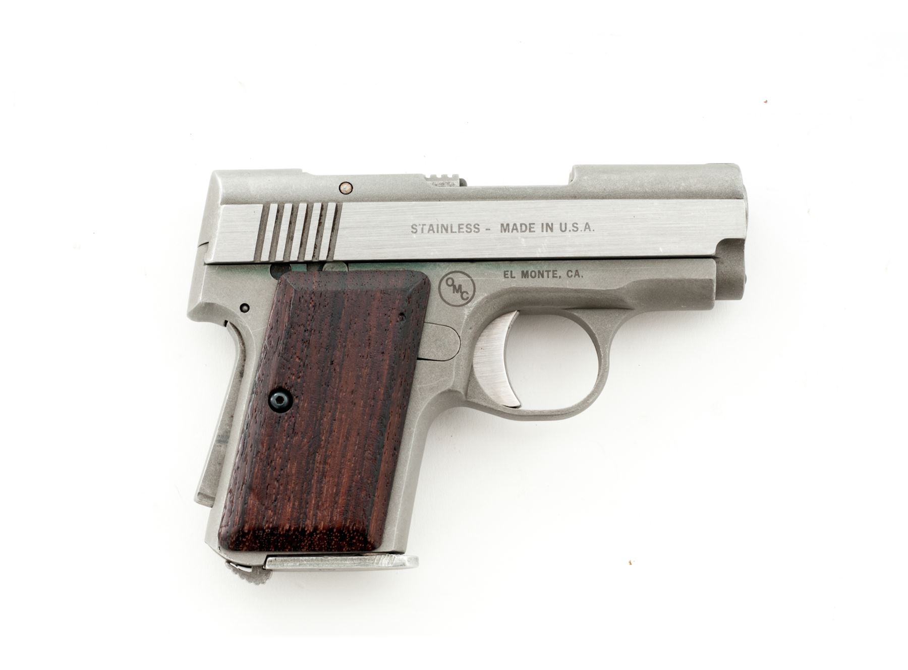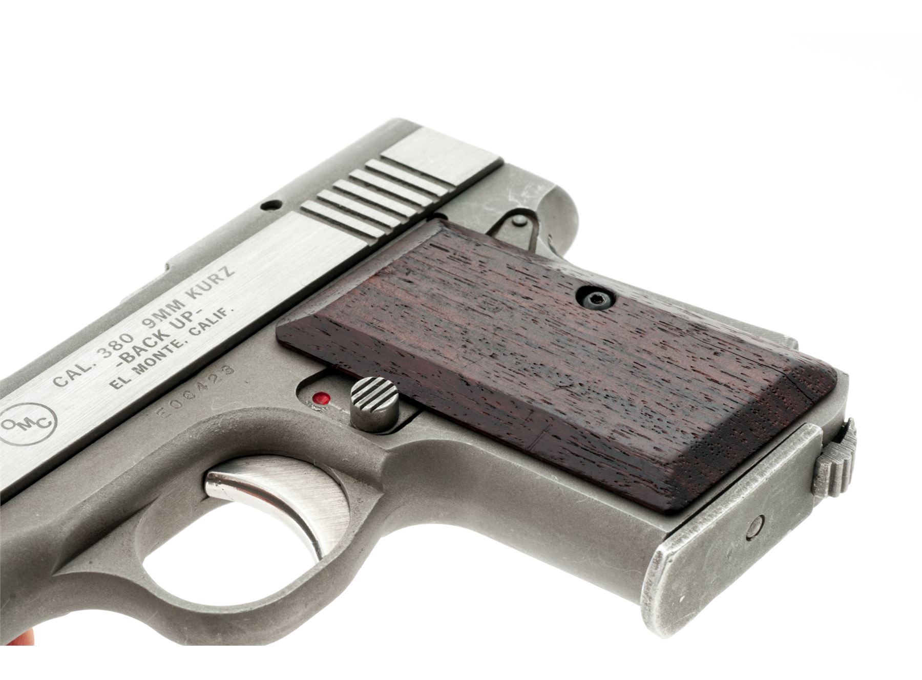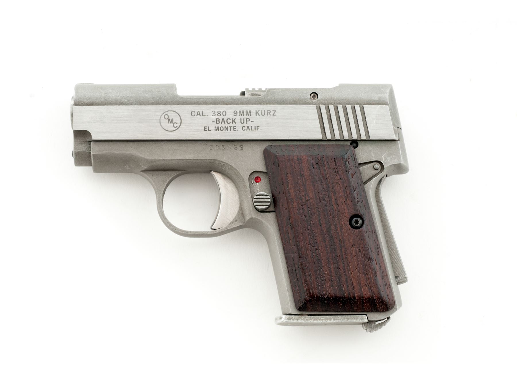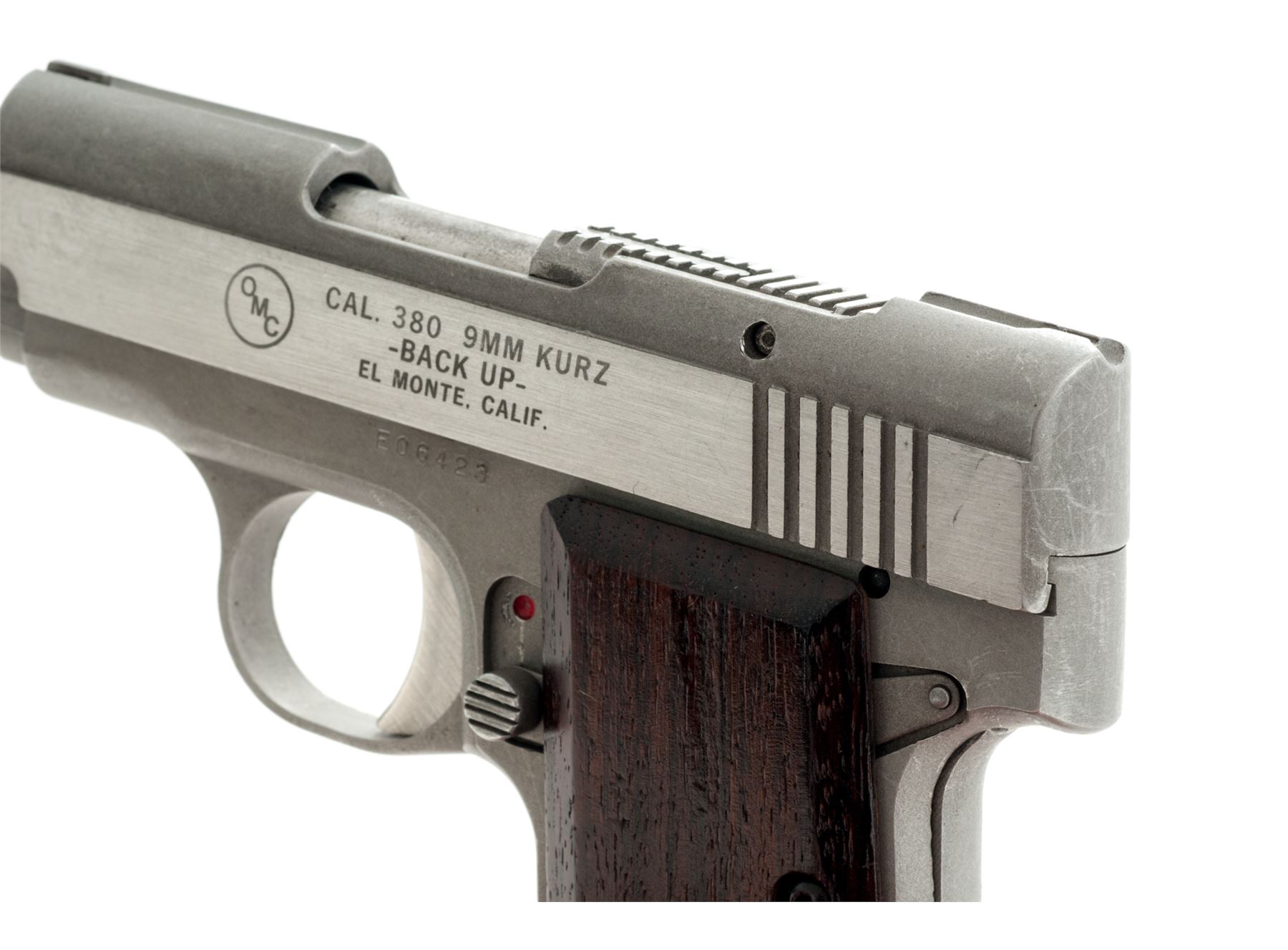 OMC Back-Up Semi-Automatic Pistol, #E06423, .380 ACP cal., 2-5/8'' barrel, stainless steel, smooth wood grips, standard integral sights, grip safety, with one magazine. Condition is very good. Metal surfaces with general moderate scuffs and scratches. Grips with intermittent shallow marks from handling. Factory lettering is clear. Action is smooth, very good bore. Est.: $200-$300. (Modern/PPT)