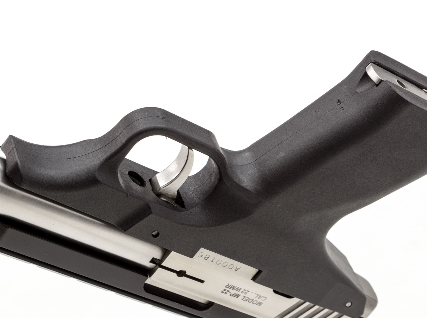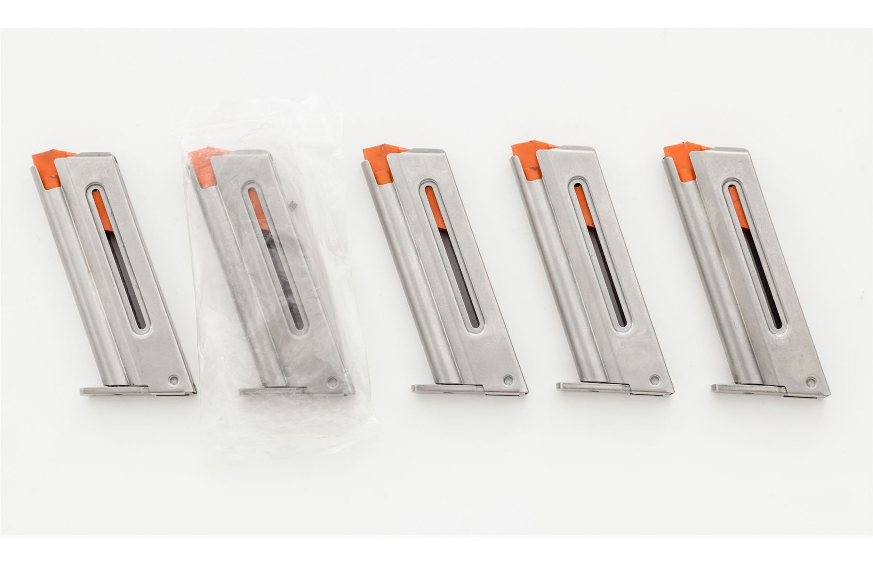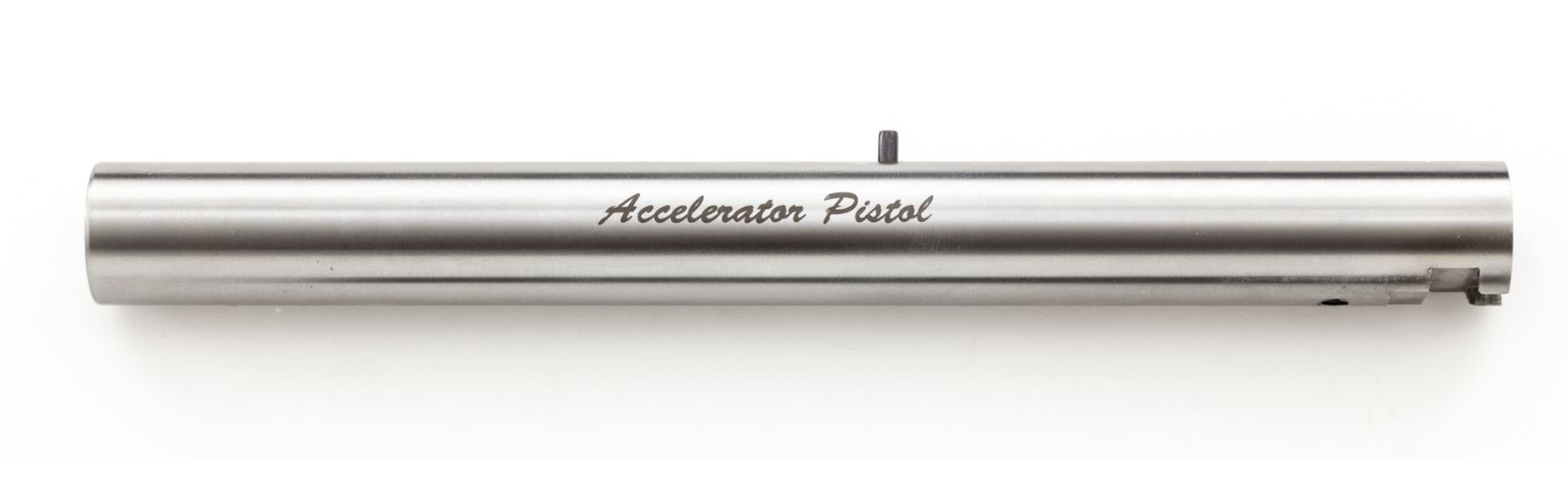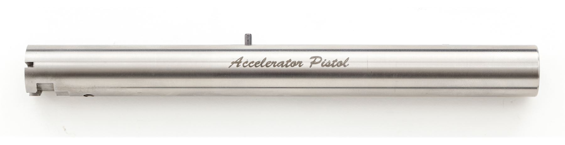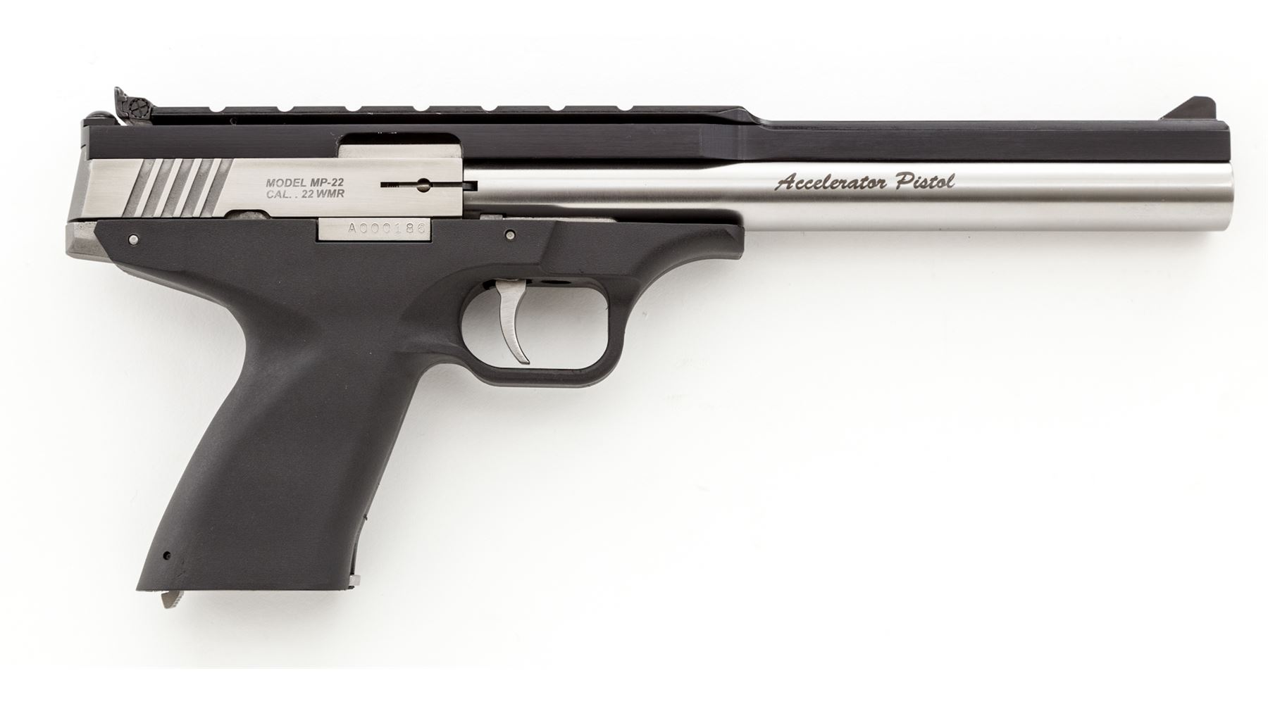Excel Arms MP-22 Accelerator Semi-Automatic Pistol, with .17 HMR & .22 Magnum barrel and six (6) magazines, #A000186, currently with a 8.5'' .17 HMR bull barrel, stainless steel, black polymer frame, integral Weaver style base with ramped front sight, and square notched fully adjustable rear sight. As previously mentioned, this pistol comes with six (6) total 9-shot magazines and an additional 8.5'' .22 magnum bull barrel. Overall this pistol rates in excellent condition showing normal light handling marks from range use. Action is smooth; both bores are bright. Est.: $500-$700. (Modern/PPT)