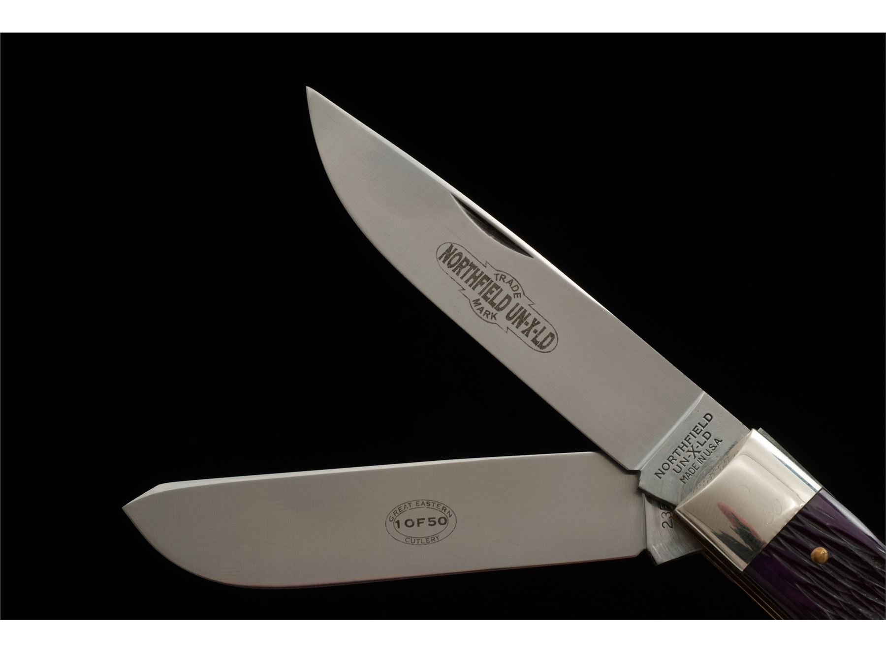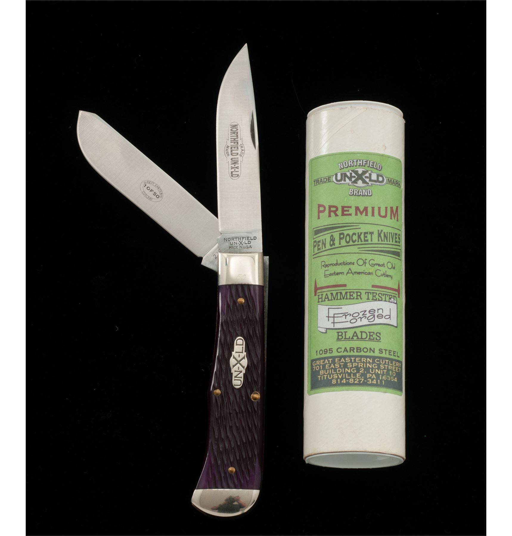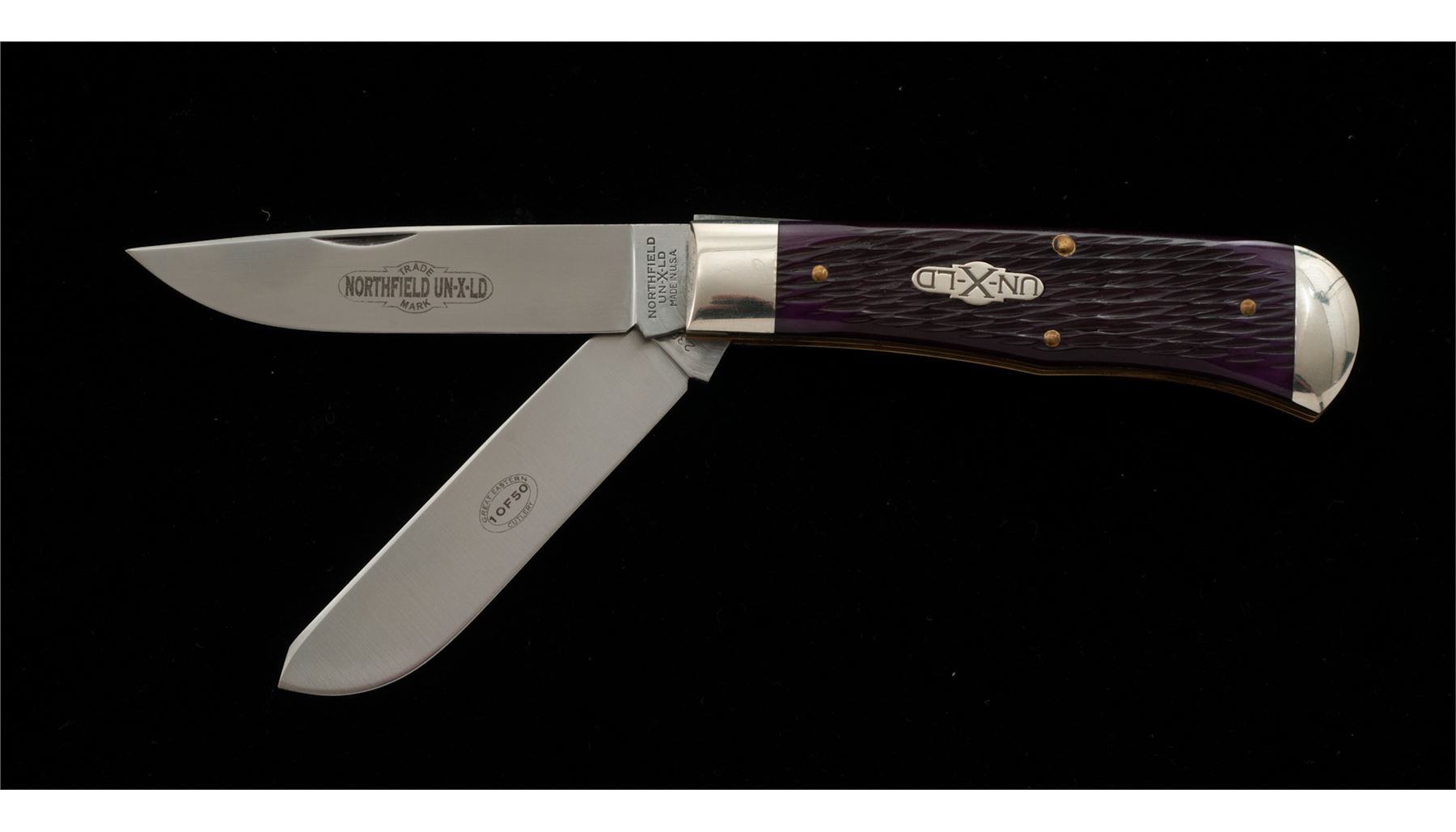 1 of Only 50 Great Eastern Cutlery UN-X-LD Trade Mark Brand Two-Blade ''End Cap'' Pattern Folding Knife, #50 of 50, 3.75'' blades; one clip-point and one spey blade. 4.5'' overall closed length, with jigged ''Purple Peach Pit'' handles with silver ''UN-X-LD'' shield, brass pins and liners, nickel silver bolsters; one of the bolsters is marked with the serial number ''50''. Knife includes the original Certificate of Authenticity that notes the serial number, official pattern no. ''235209EC'', and was mfg'd in 2009. Included is the original storage tube with Northfield UN-X-LD label. In excellent as new overall condition, never carried, with the factory edge. Est.: $200-$300.