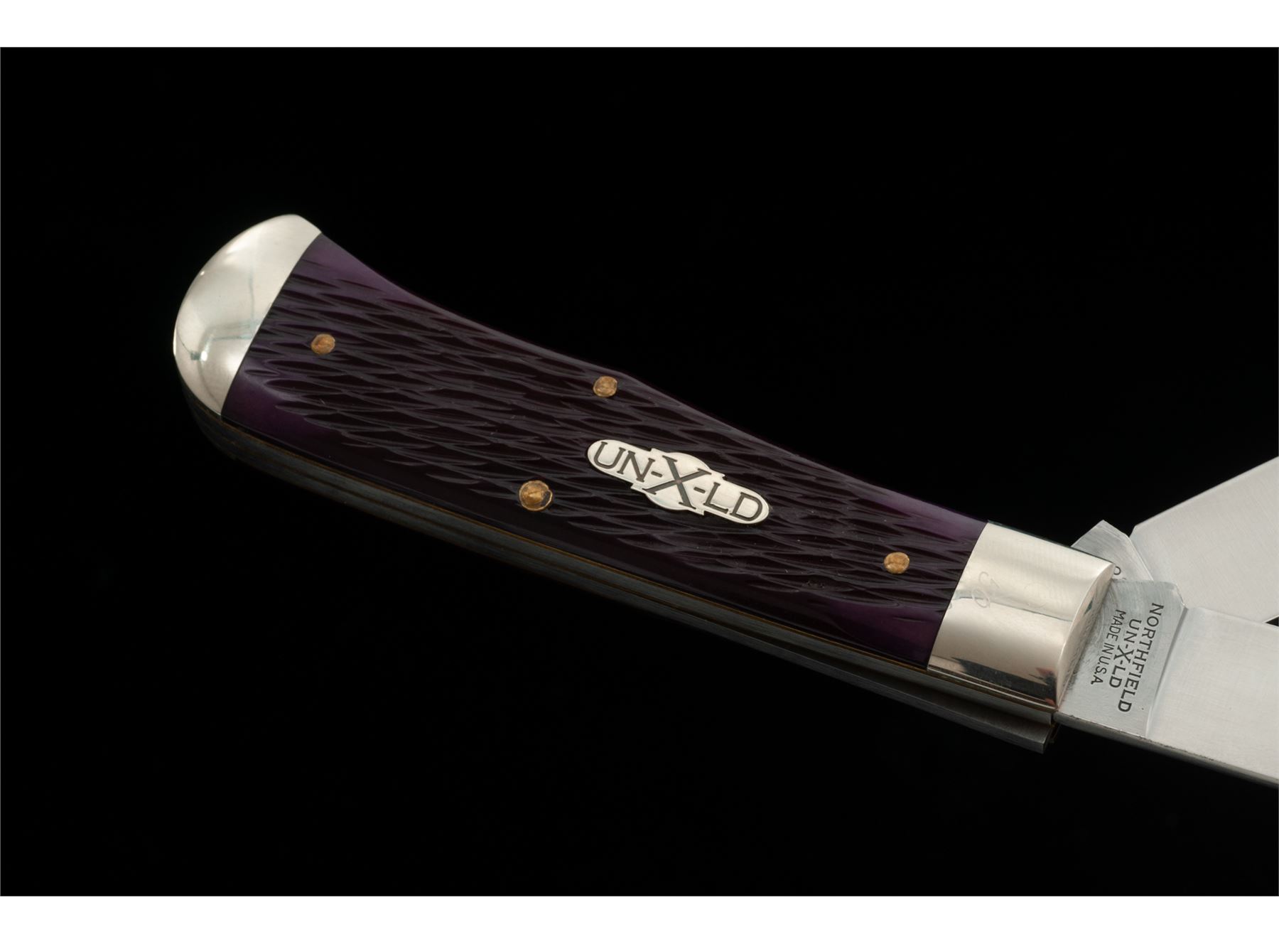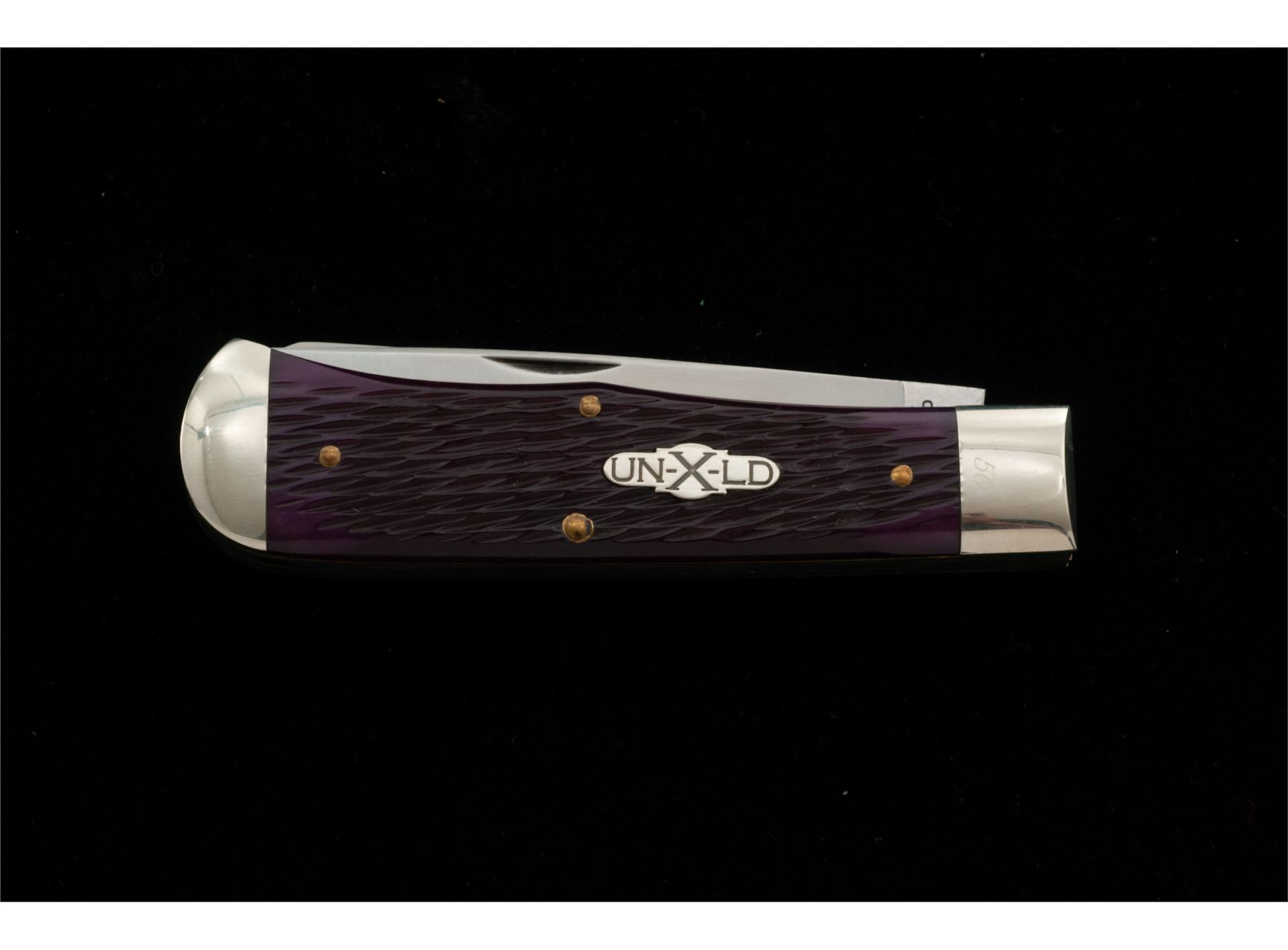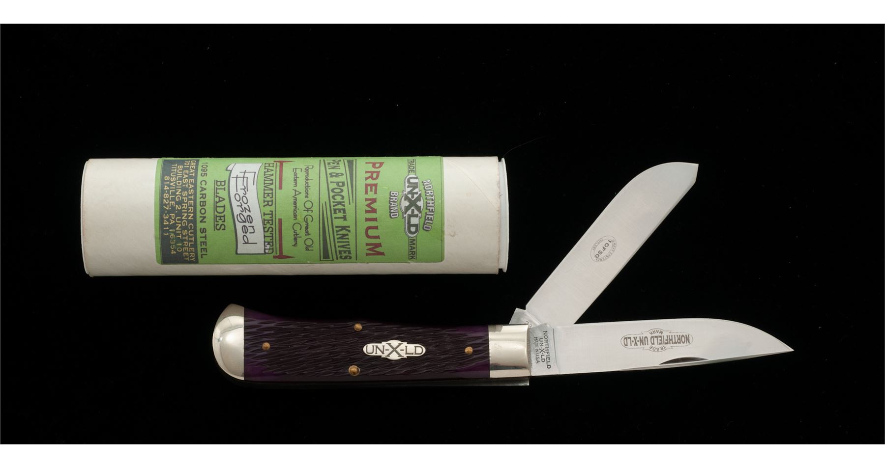 1 of Only 50 Great Eastern Cutlery UN-X-LD Trade Mark Brand Two-Blade ''End Cap'' Pattern Folding Knife, #50 of 50, 3.75'' blades; one clip-point and one spey blade. 4.5'' overall closed length, with jigged ''Purple Peach Pit'' handles with silver ''UN-X-LD'' shield, brass pins and liners, nickel silver bolsters; one of the bolsters is marked with the serial number ''50''. Knife includes the original Certificate of Authenticity that notes the serial number, official pattern no. ''235209EC'', and was mfg'd in 2009. Included is the original storage tube with Northfield UN-X-LD label. In excellent as new overall condition, never carried, with the factory edge. Est.: $200-$300.
