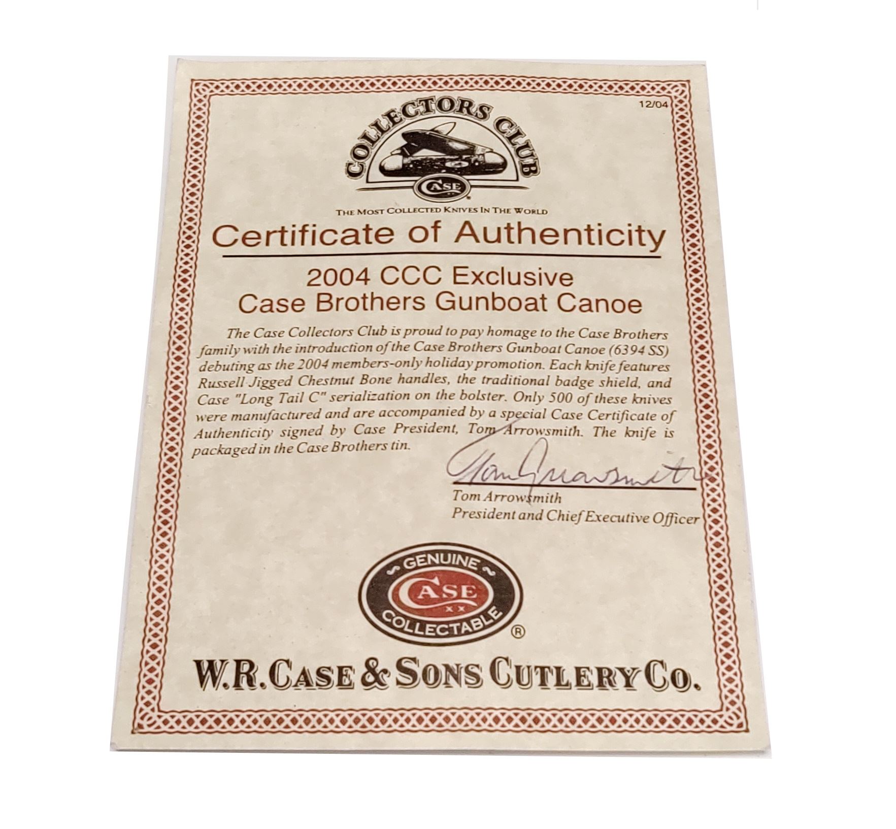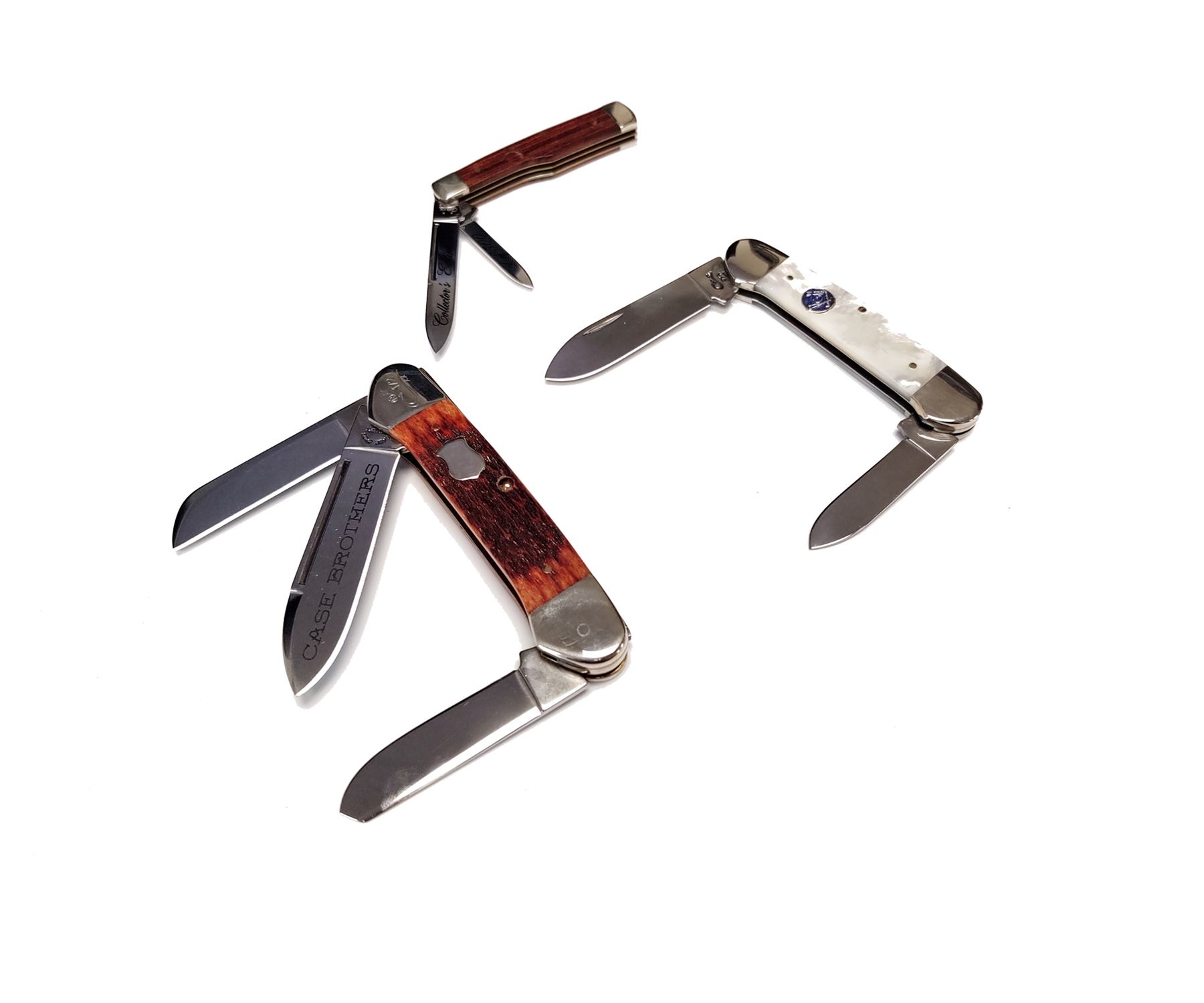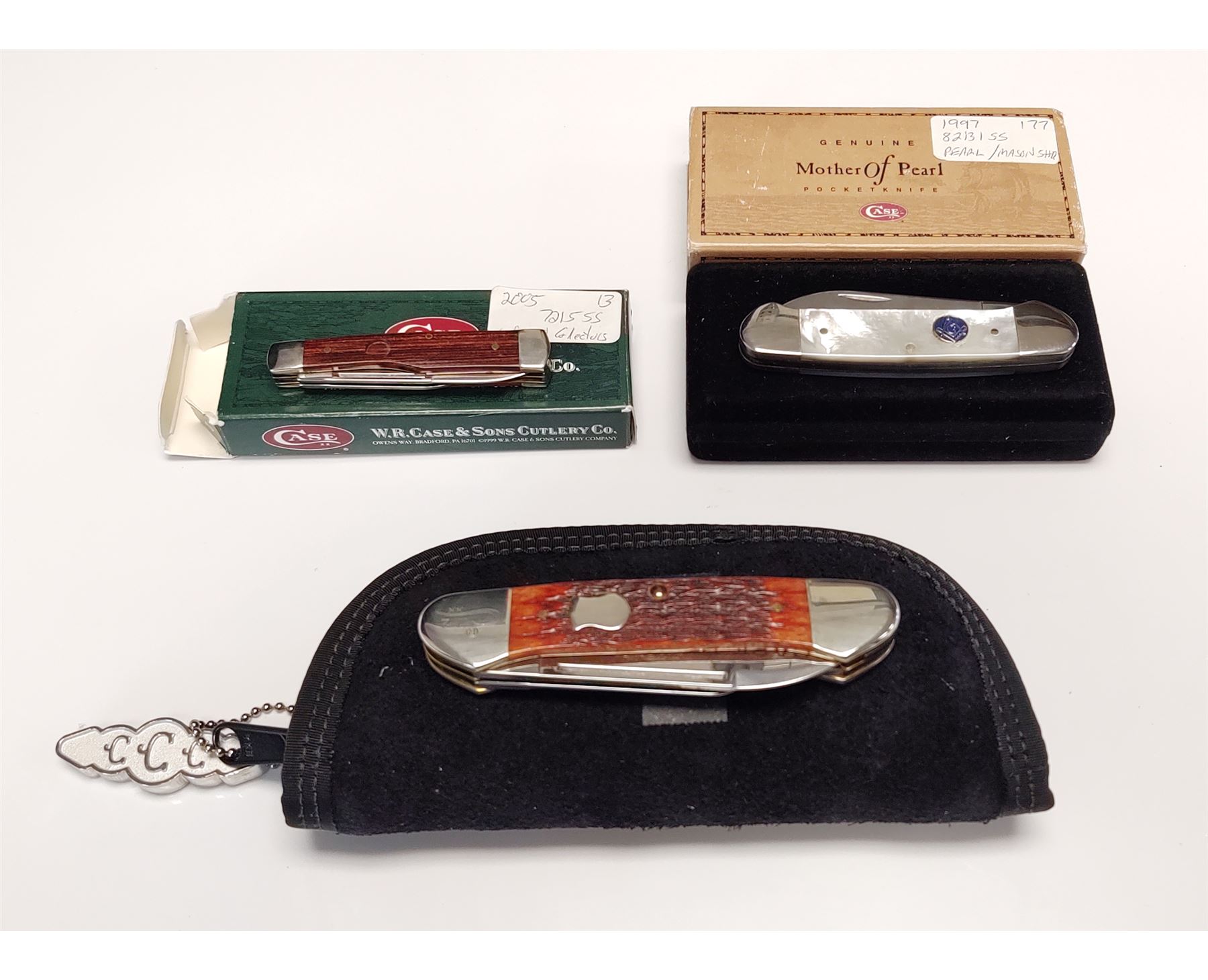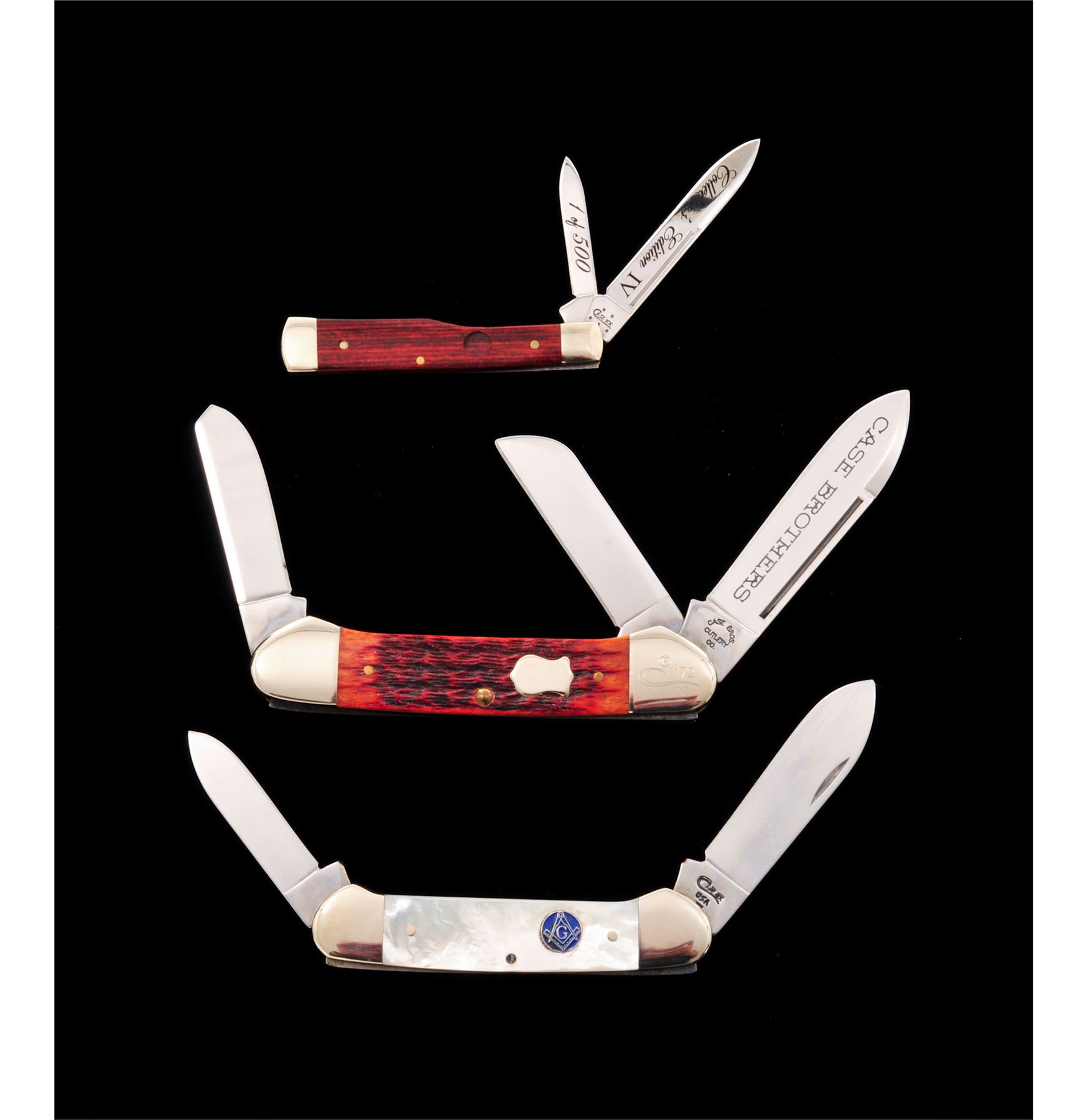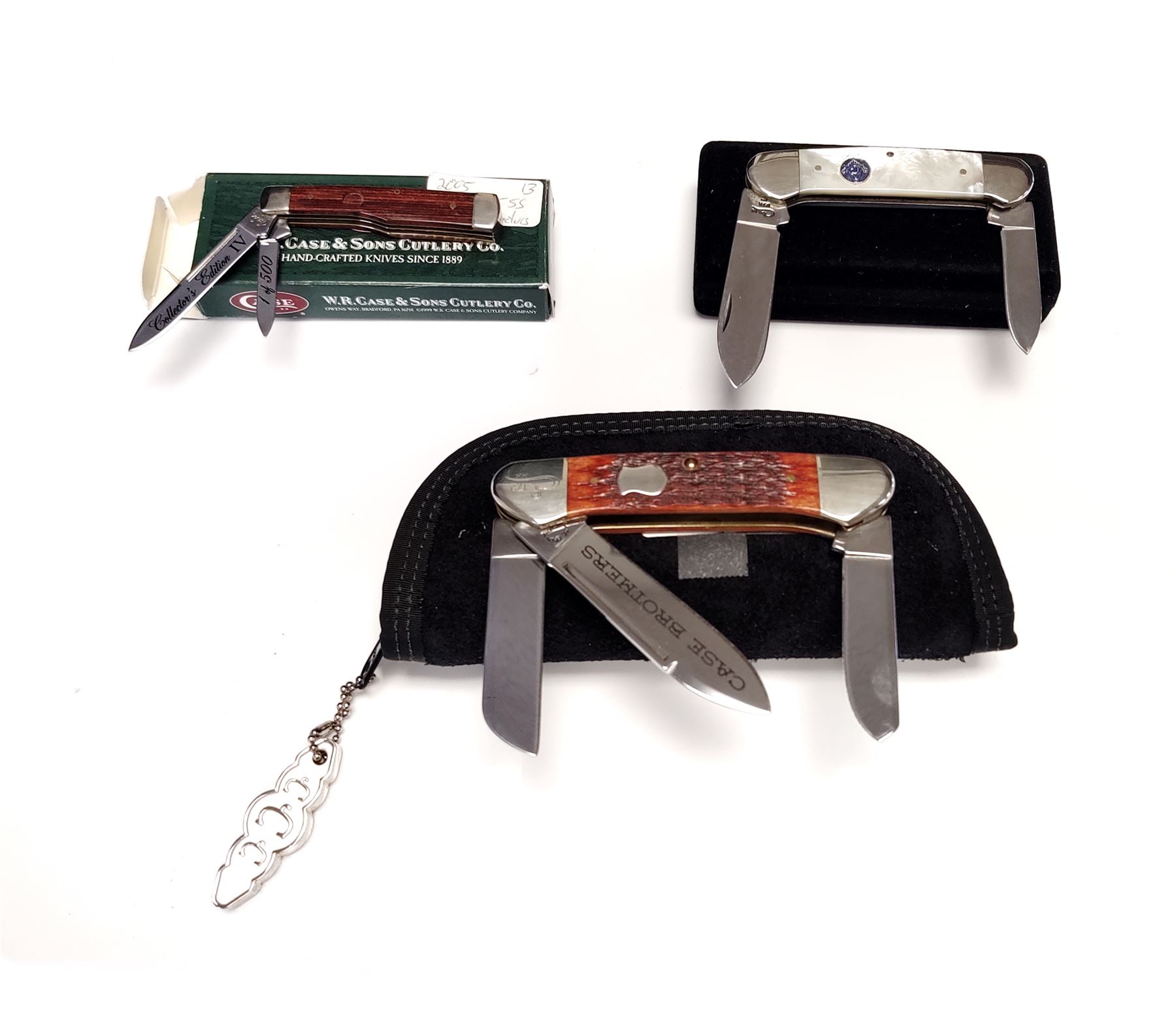 Lot of Three (3) Limited Edition Case Folding Knives: 1.) 2004 Case Collector's Club Gunboat Canoe folding knife, Model #6394 SS, with Russell jigged chestnut bone handles, COA, and CCC soft pouch. Blade is marked ''CASE BROTHERS''; tang ''CASE BROS. CUTLERY CO.''; bolster is numbered ''172''. Condition is excellent, never carried or sharpened. Bolsters show some slight micro-scratching. 2.) Mother of Pearl Series ''Canoe'' knife with mason's shield inlaid into smooth pearl handles. Mfg'd 1997. Included is the original black velvet box with correct cardboard slipcover. Condition is excellent, never carried or sharpened. Bolsters show some slight micro-scratching. Elastic band on inside of case that holds the knife in place is broken. 3.) 2005 Case Collector's Edition IV, 1 of 500, Model #7215 SS, gunstock pattern folding knife, with smooth wood handles; missing circular-shaped shield. Blades are marked ''1 of 500'' and ''Collector's Edition IV''. In mismatched Case XX box. Other than the missing shield, this knife is in excellent overall condition, never carried or sharpened. Est.: $200-$300/lot.