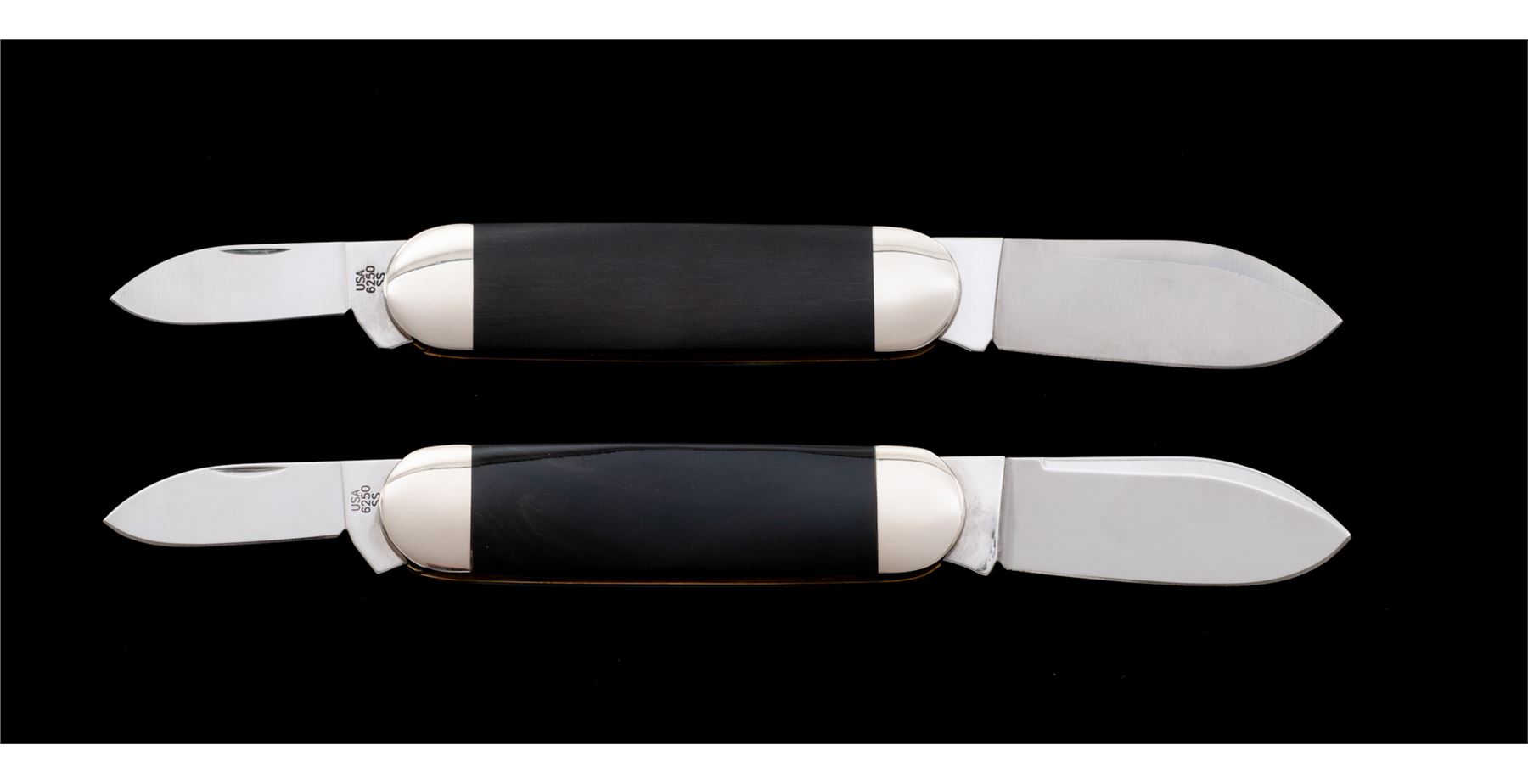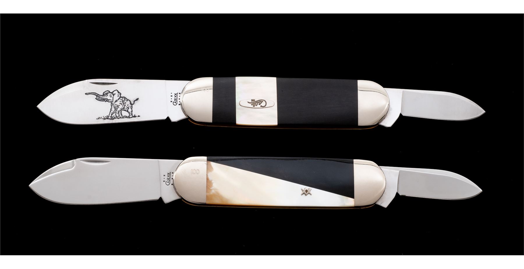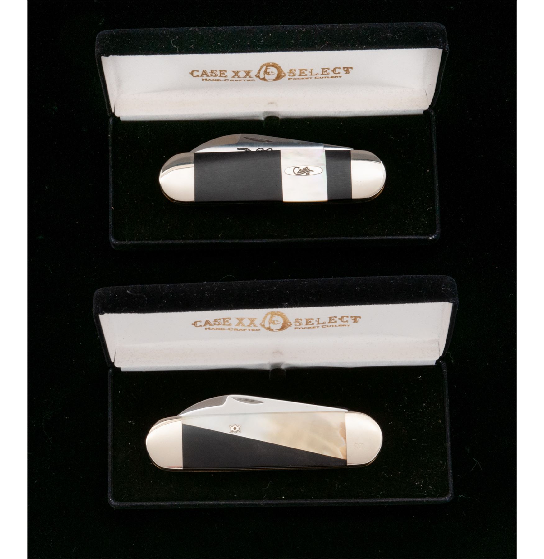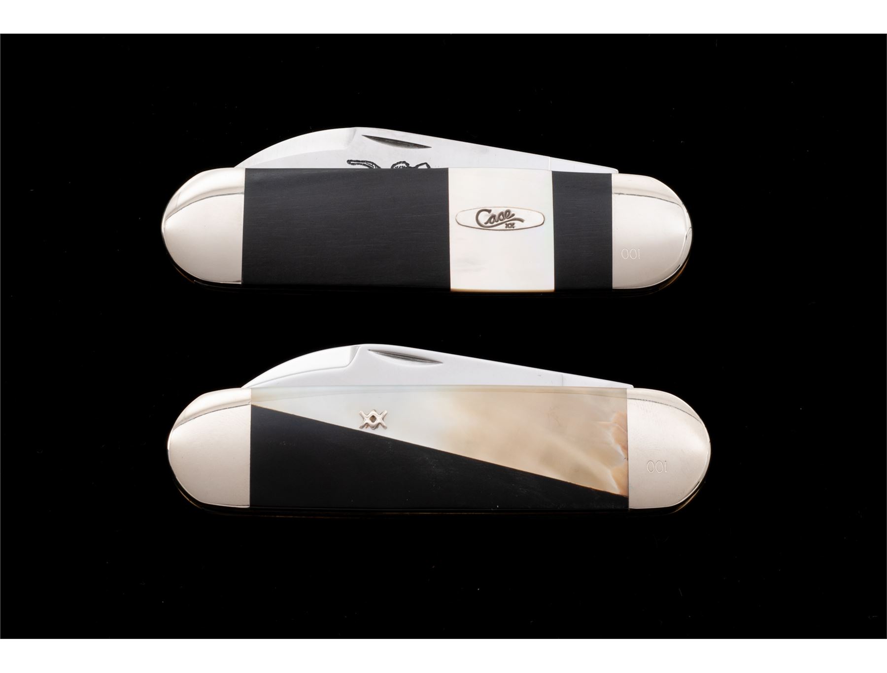 Lot of Two (2) Case #6250 SS Elephant Toe/Sunfish Knives, with Buffalo Horn and Pearl Handles: 1.) Made in 2001, etched elephant on the main blade, one of the bolsters is marked ''001'', handle with an oval ''Case XX'' shield. Condition overall is near excellent. Blades appear unused with the factory edges, blade etching and tang stamps are clear. Bolsters with scattered light scratches. Shield sits a little high and is not flush with the pearl inlay. 2.) Made in 2003, one of the bolsters is marked ''001'', pearl portion of the handle with small silver ''XX'' on the surface. Condition overall is about fine. One side of the large blade with two ¬''spots of light scratching, cutting edges appear factory, tang stamps are clear. Bolsters with general light surface scratches. Both knives measure 4.5'' closed and come in black ''Case XX Select'' clamshell cases. Est.: $300-$450/lot.
