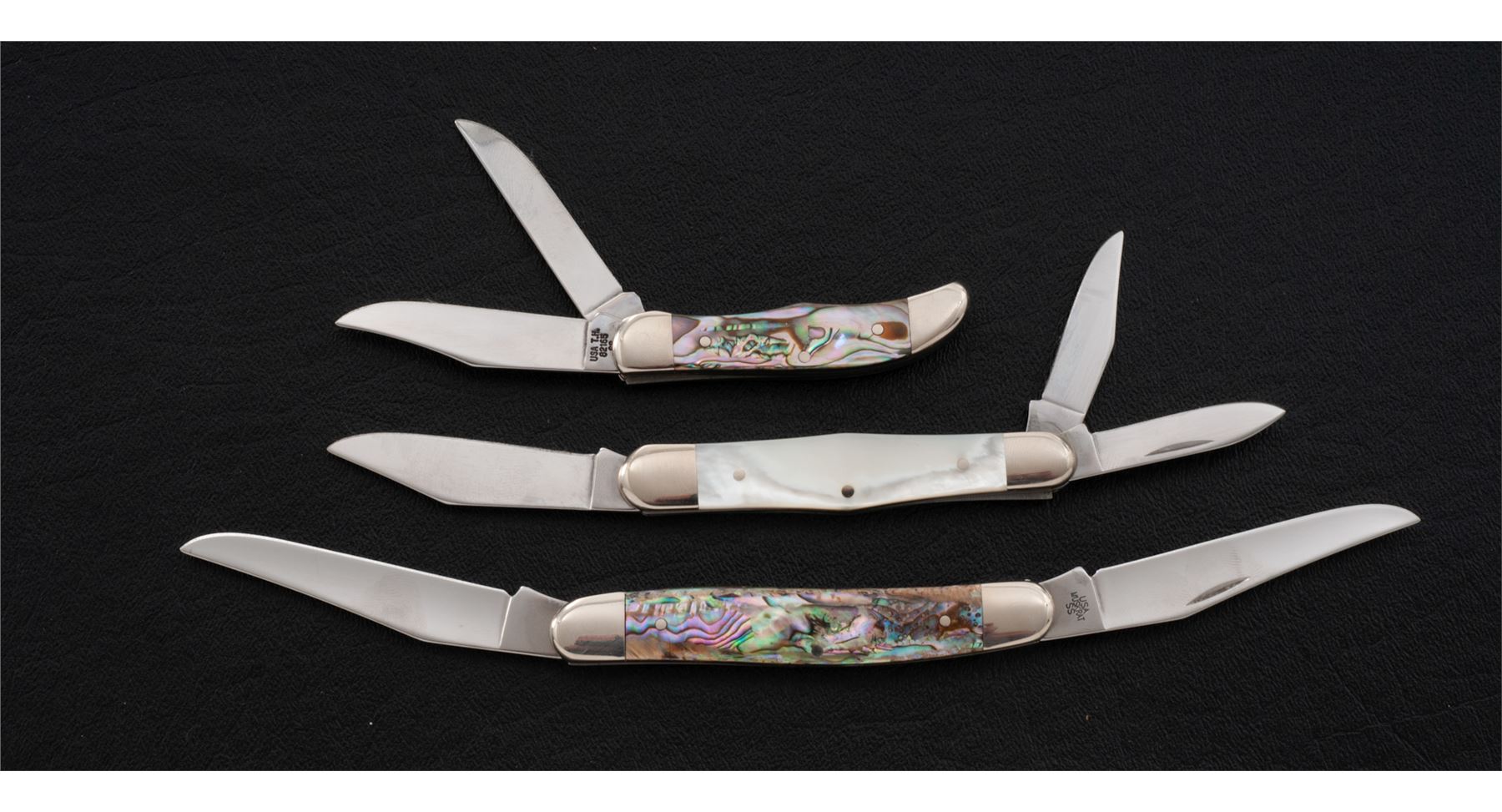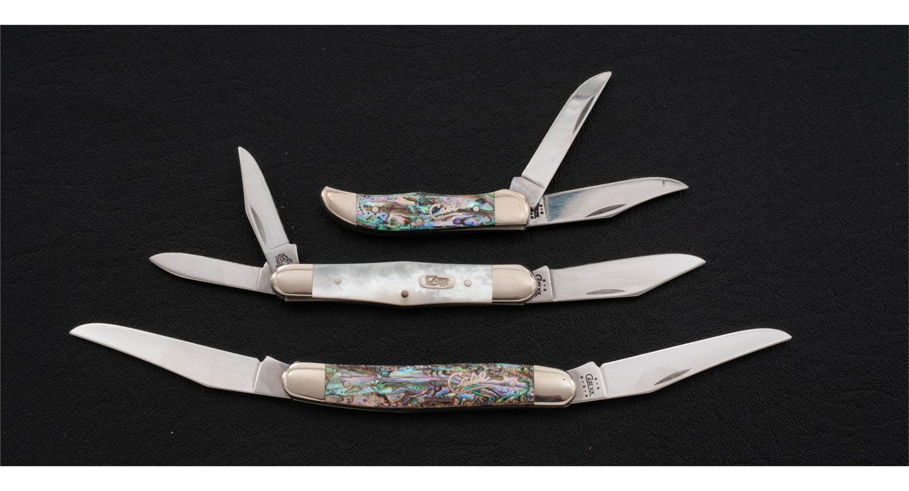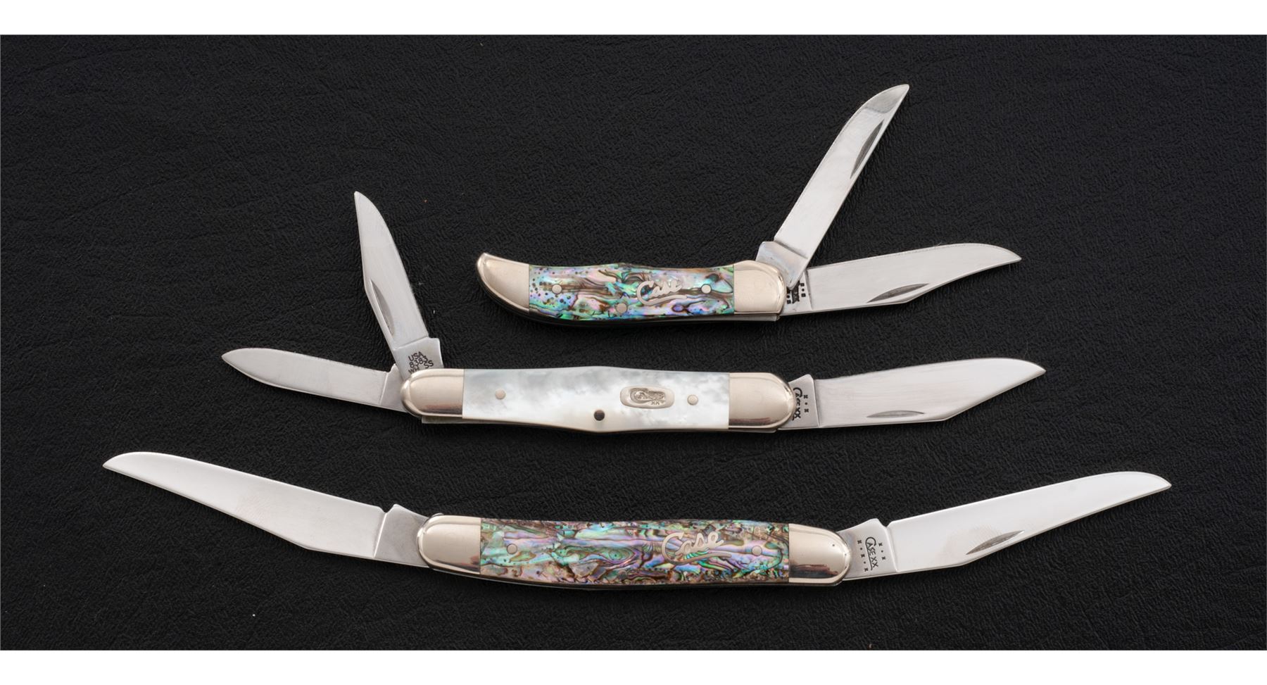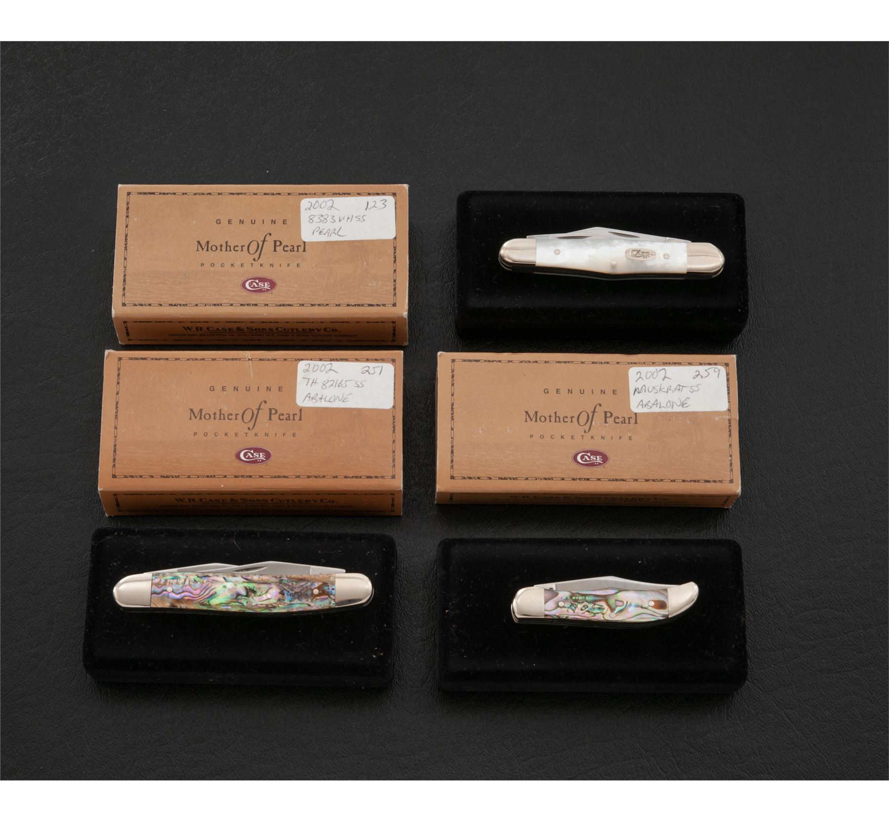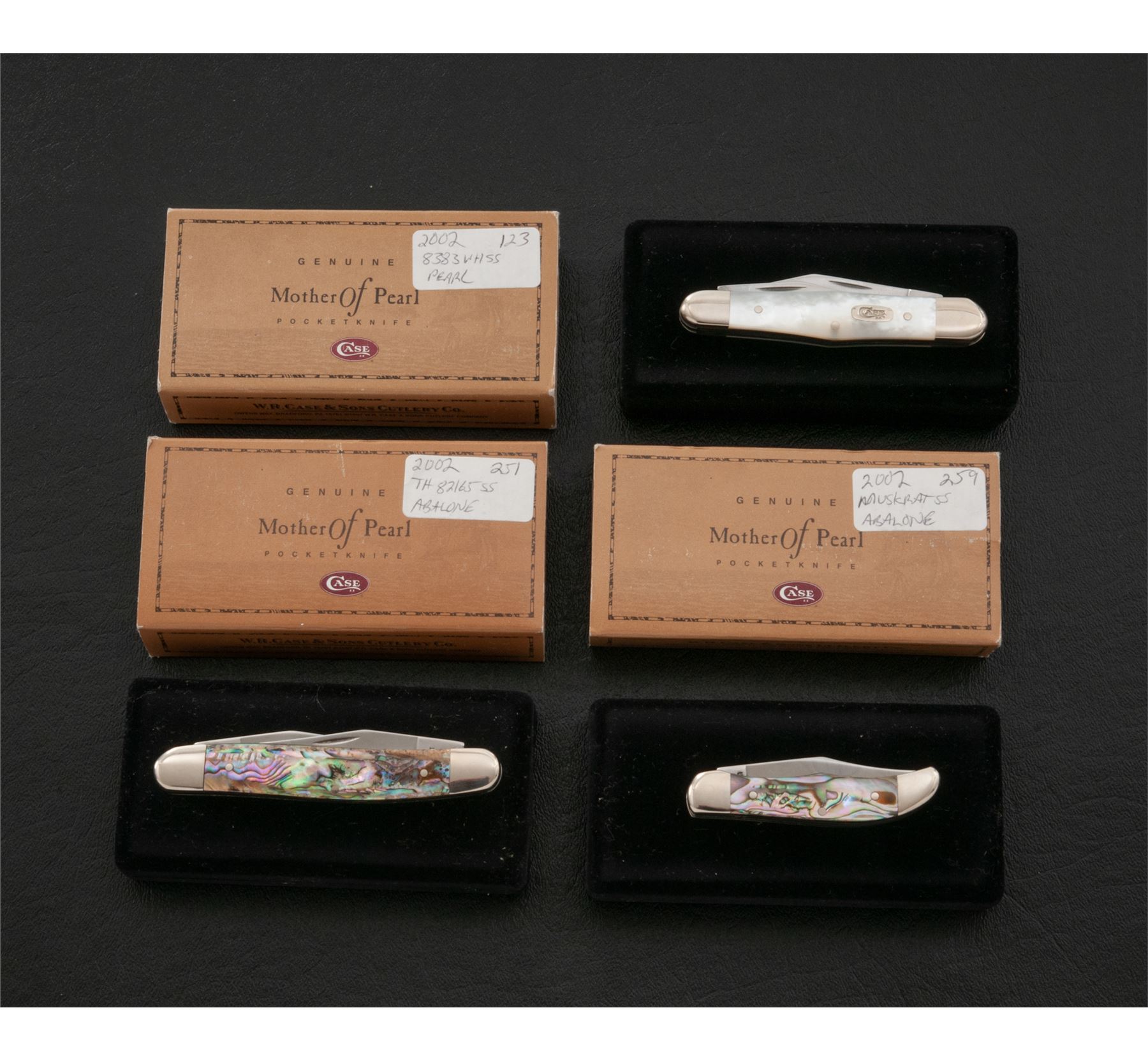 Lot of Three (3) Limited Edition Case ''Mother of Pearl'' Series Folding Knives: 1.) Whittler pattern, #8383WH SS, with pearl handles. Mfg'd 2002. 2.) Pocket Hunter, #TH82165 SS, with vibrant abalone handles. Mfg'd 2002. 3.) Muskrat SS, with vibrant abalone handles. Mfg'd 2002. Each knife comes in its original black velvet box with correct slip cover and folding pamphlet. All of the knives are in excellent as new condition, never carried or sharpened. Blade on the Whittler shows a few slight scratches. Beautiful pearl and abalone handles are free of chips or cracks. Est.: $300-$500/lot.