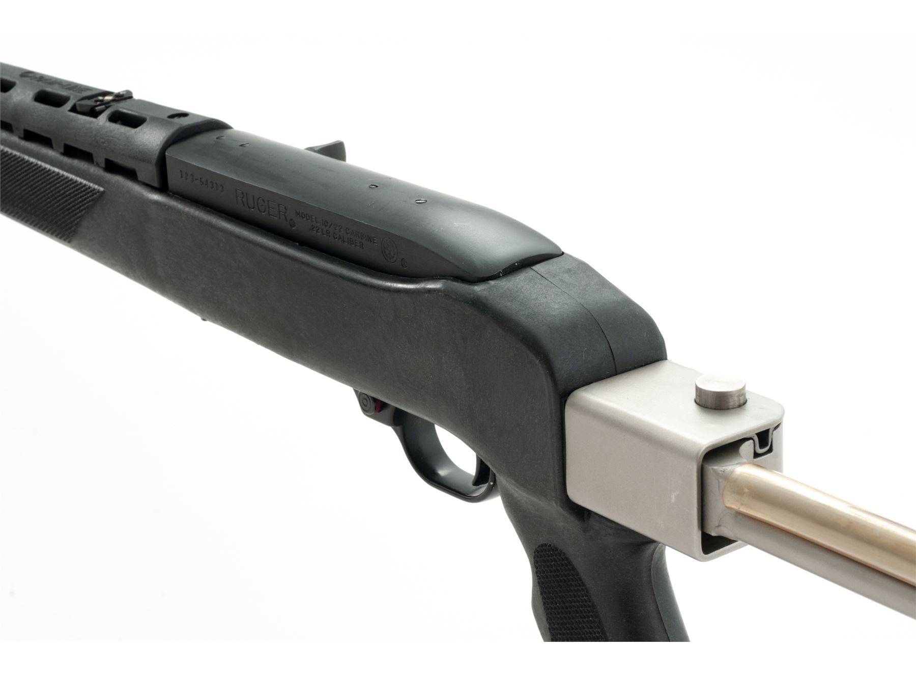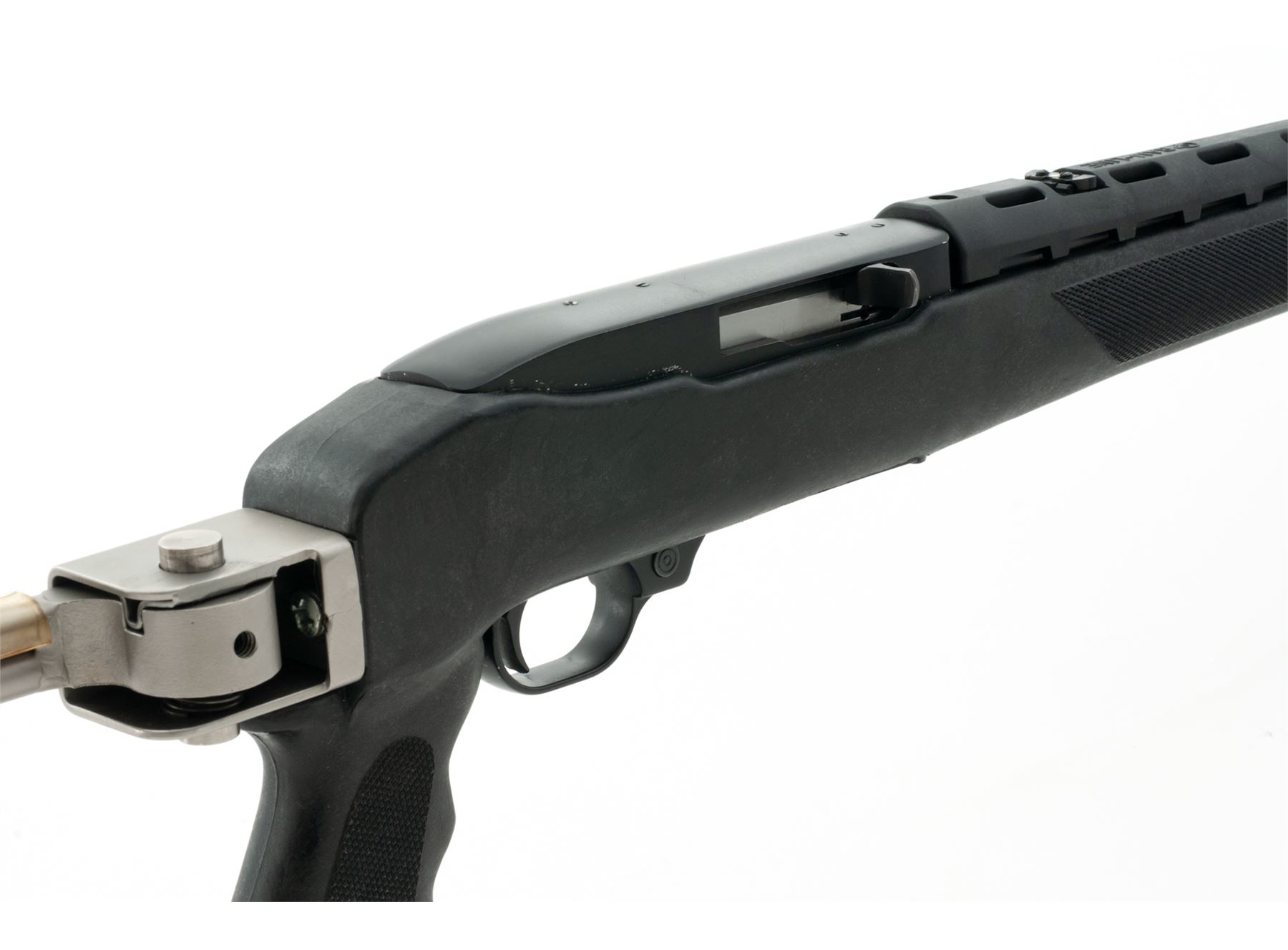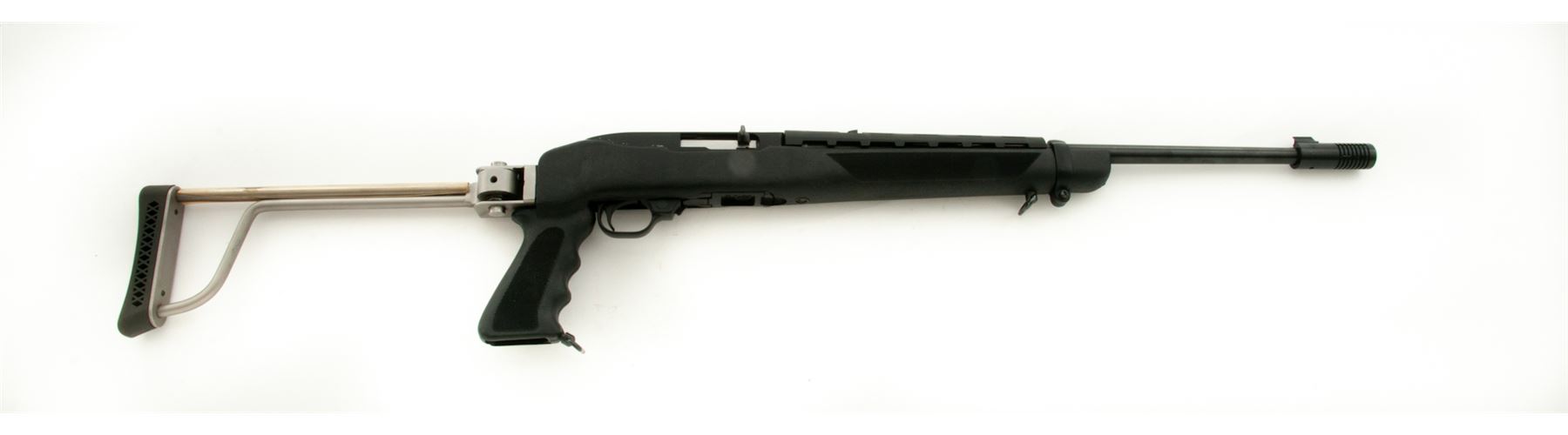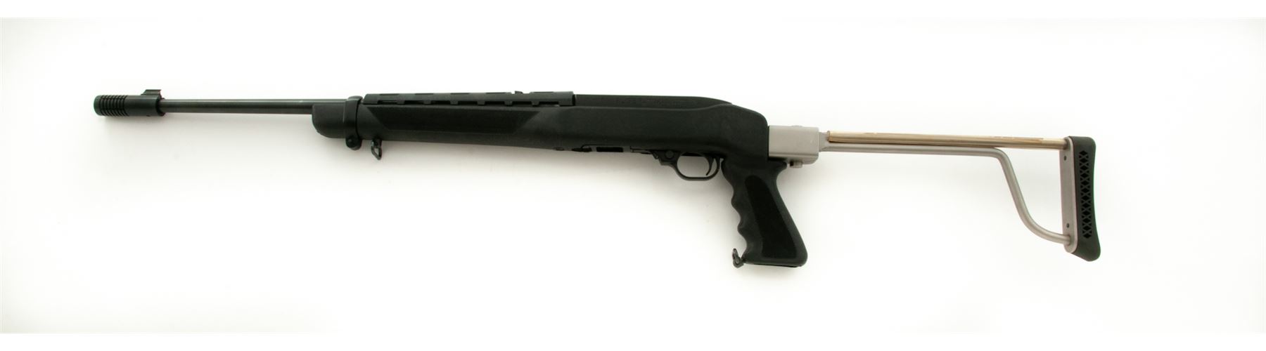 Ruger 10/22 Semi-Automatic Carbine, #123-54313, .22 LR cal., 18.5'' barrel with muzzle brake, blue finish, folding black synthetic full pistol-grip stock with metal buttstock frame, vented Ramline handguard, sling swivels, blade front sight with brass bead, folding rear sight, and one 10-round Ruger magazine. Included is the original box. Overall condition is near excellent with approx. 98% factory finishes. Top of receiver with a few small scratches; right side with a few spots of finish that is right above the new stock line. Stock shows intermittent normal light handling marks; metal bracket that mounts to the synthetic stock with horizontal hairline cracks at the retaining screw, remains solid and at this point appears cosmetic as it does not affect the folding or unfolding of the buttstock. Smooth action, excellent bore. Est.: $250-$400. (Modern)