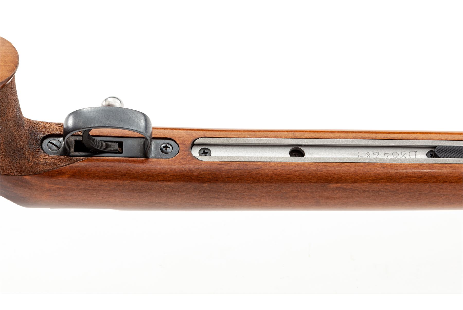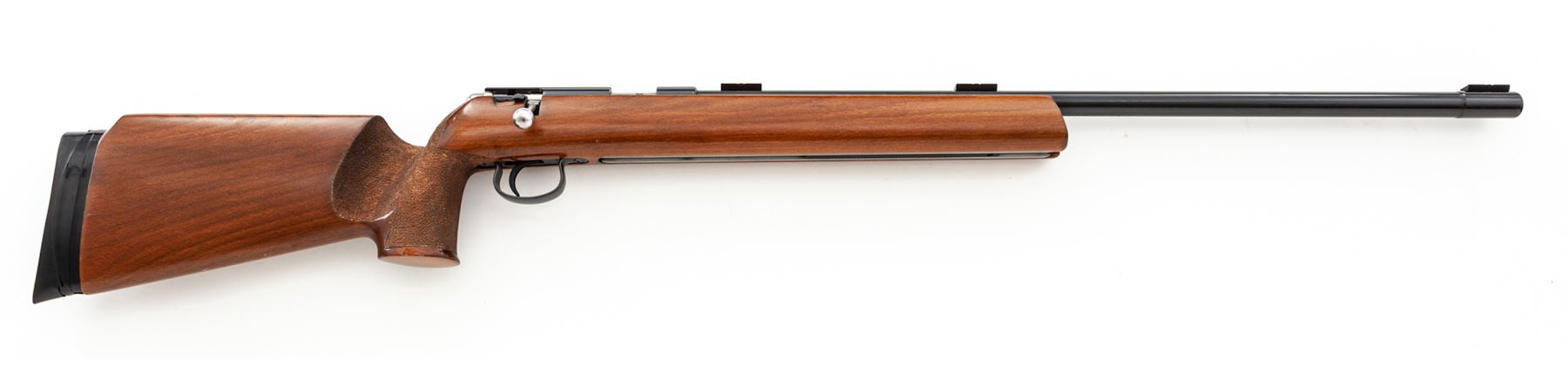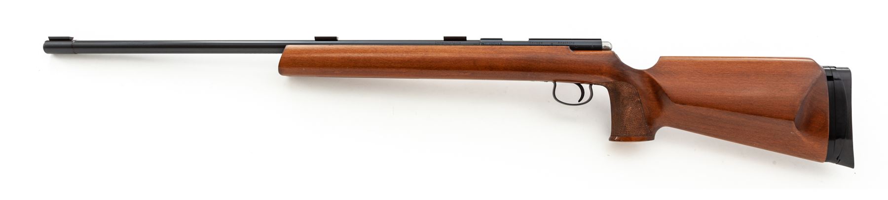 Savage Anschutz Match Model 64 Single Shot Bolt Action Rifle, #1035745A, .22 LR cal., 26'' barrel, blue finish, bright bolt, smooth walnut stock with right-hand pebblegrain pistol-grip area with relief cut for palm, adjustable buttplate, and track for handstop to bottom of stock. Top of receiver is factory grooved; rear half of barrel with dovetailed scope blocks, similarly appointed in front sight area. Condition is excellent showing little use, with some minor soiling in pistol-grip area and very slight impressions to wood. Inside of handstop groove and bottom of barrel with previous owner's driver's license number lightly electro-penciled. Action is crisp, bore is bright. Est.: $500-$650. (Modern)