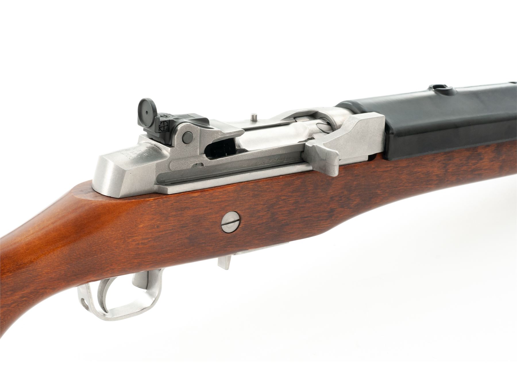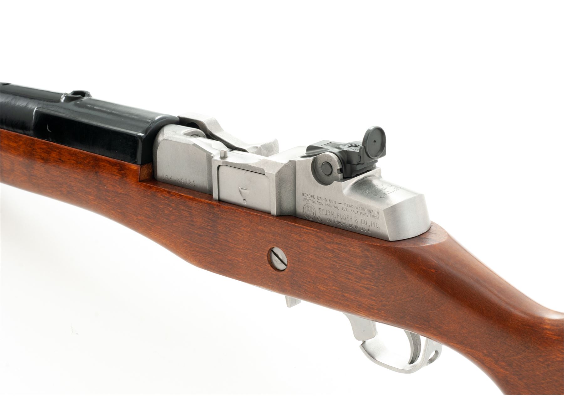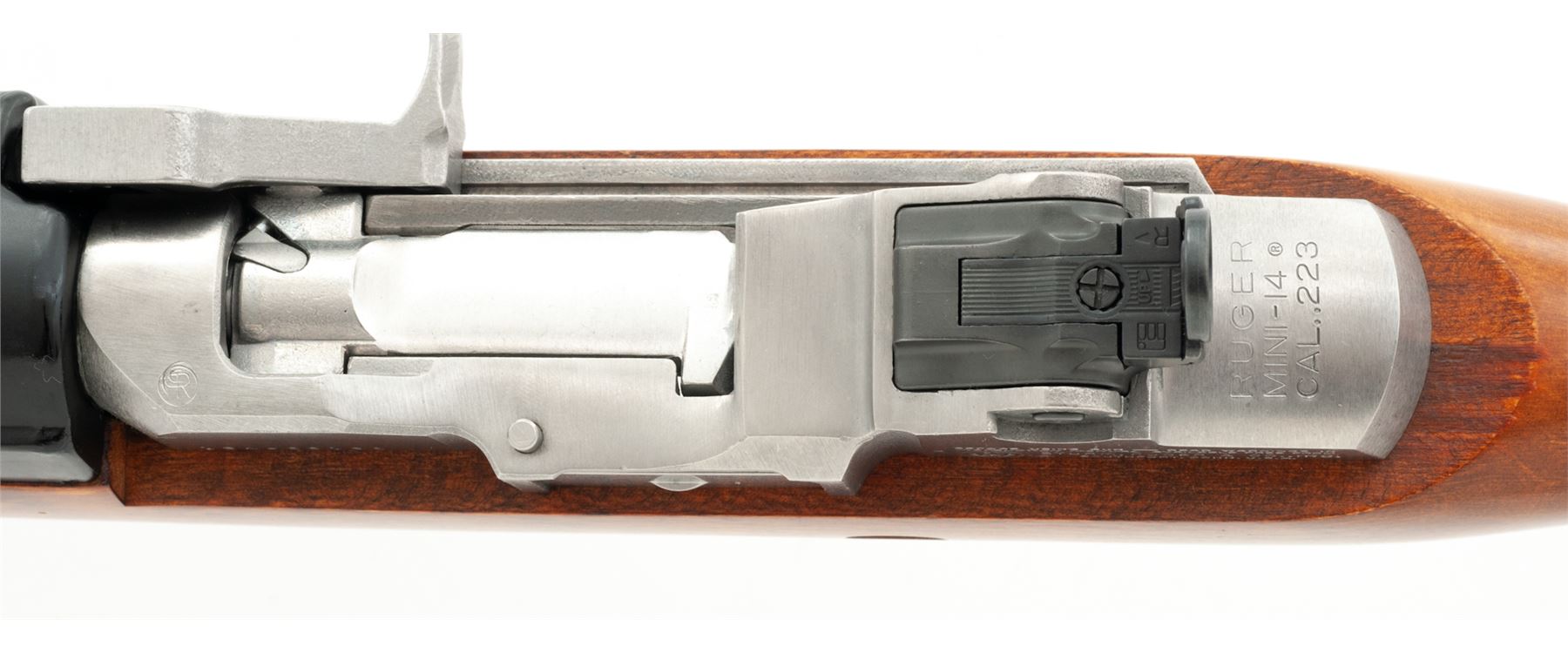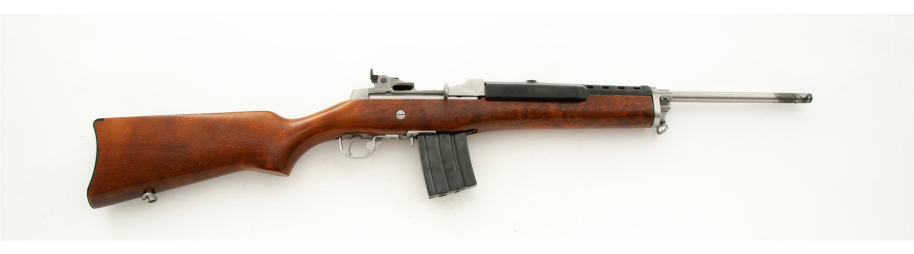 Ruger Mini-14 Semi-Automatic Rifle, #184-69180, .223 cal., 18'' barrel, stainless steel, factory birch stock and plastic upper handguard. Millet peep sight replacing original rear sight; front sight has been removed. Includes eight (8) high-cap magazines. Condition is excellent showing light marks from handling and very infrequent field use. Front sight needs replacement. Good action, fine bore. Est.: $400-$600. (Modern)(High-cap mags not available to Calif. residents.)