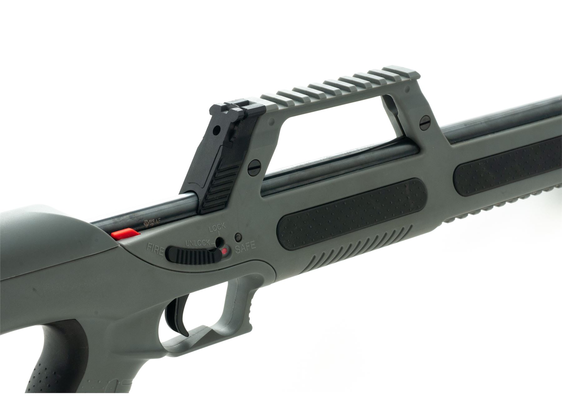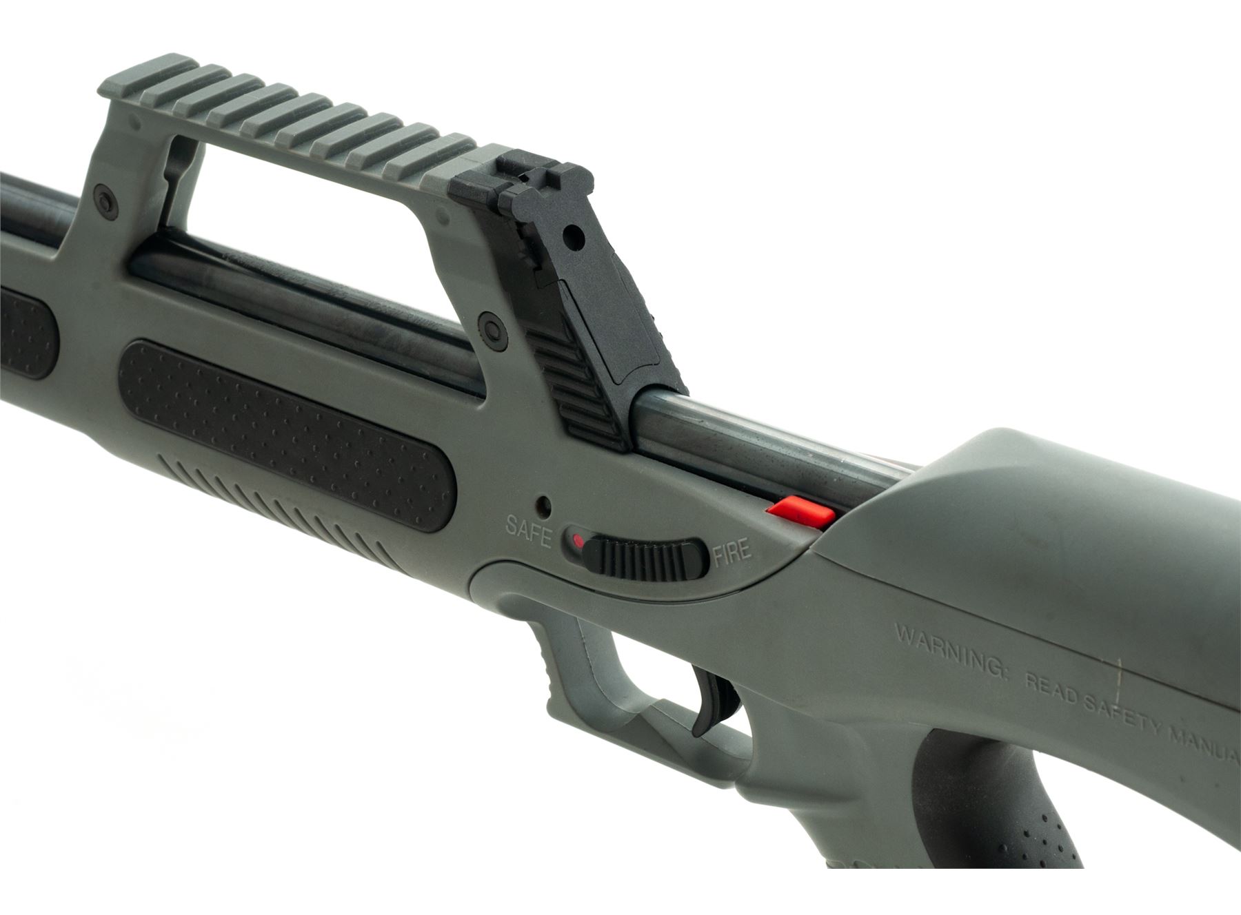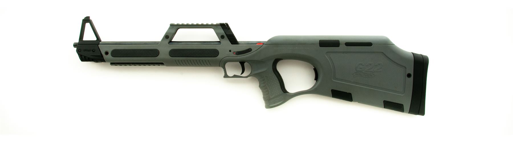 Walther G22 Semi-Automatic Rifle, with laser, #PW006544, .22 LR cal., bull pup design, 20'' barrel, dark blue finish, light gray synthetic stock, blade front sight, rotating rear disc sight, ambidextrous safety, with two (2) 10-round Walther magazines. Included is a Walther red laser sight that is mounted to the accessory rail below the barrel. Condition is very good. Synthetic stock with scattered shallow surface scuffs and scratches. Approx. 97% factory blue finish remains. Laser sight was tested and works properly, the rubber cap that covers the on and off switch is missing, this does not affect the overall function and is more of a cosmetic issue. Smooth action, bright bore with excellent rifling. Est.: $300-$450. (Modern)