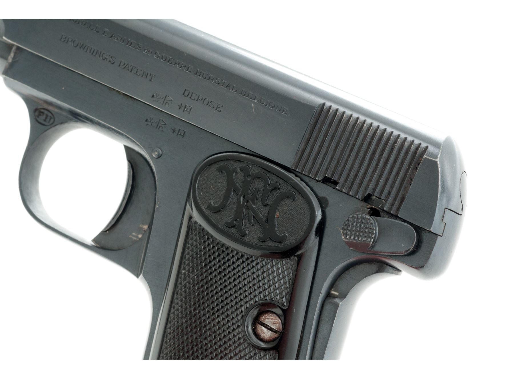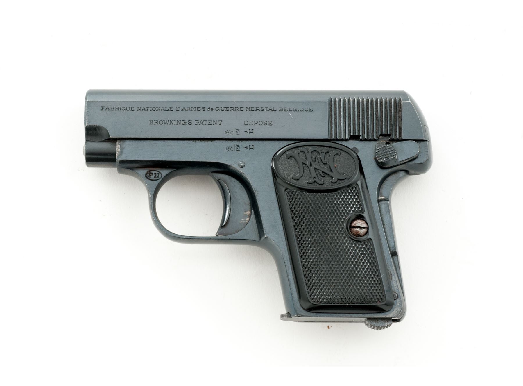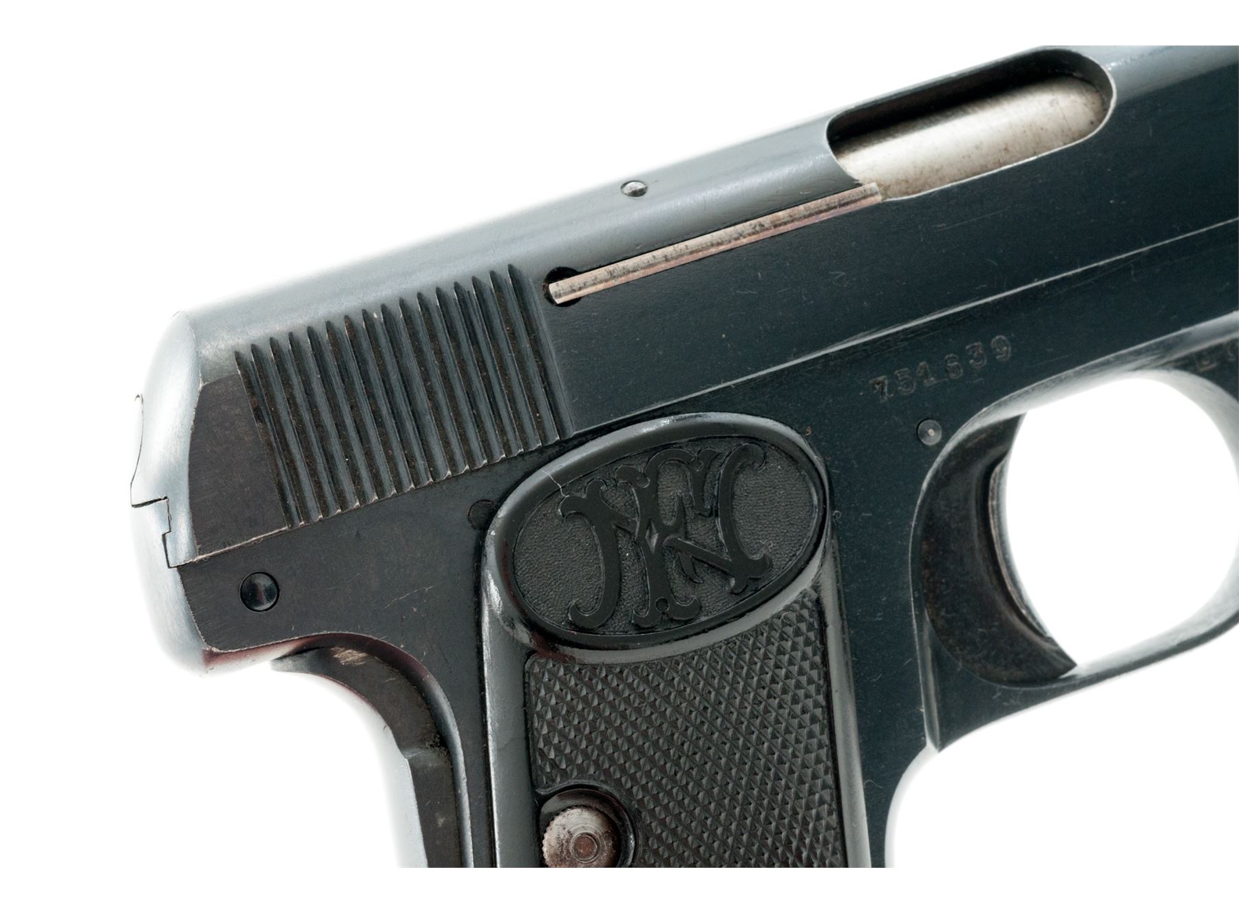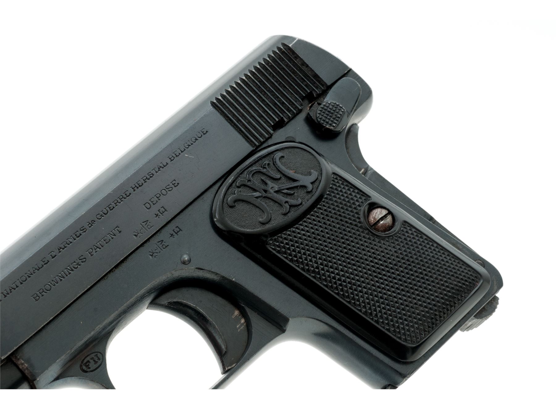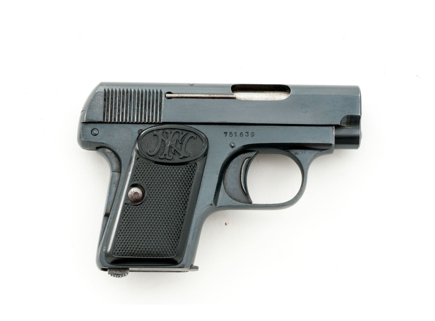 FN Model 1905 Vest Pocket Second Variation Semi-Automatic Pistol, #751639, .25 ACP cal., 2'' barrel, blue finish, checkered black plastic FN grips, slide lock, grip safety, with one ''FN'' marked magazine. Barrel, frame, and slide with matching numbers. Condition is near excellent with approx. 98% original blue finish, metal with some minor edgewear and scattered light micro-scratching from handling; factory lettering, proofmarks, etc. are clear. Grips with a few normal small handling marks, no chips or cracks. Smooth action, very good bore. Est.: $300-$500. (C&R)