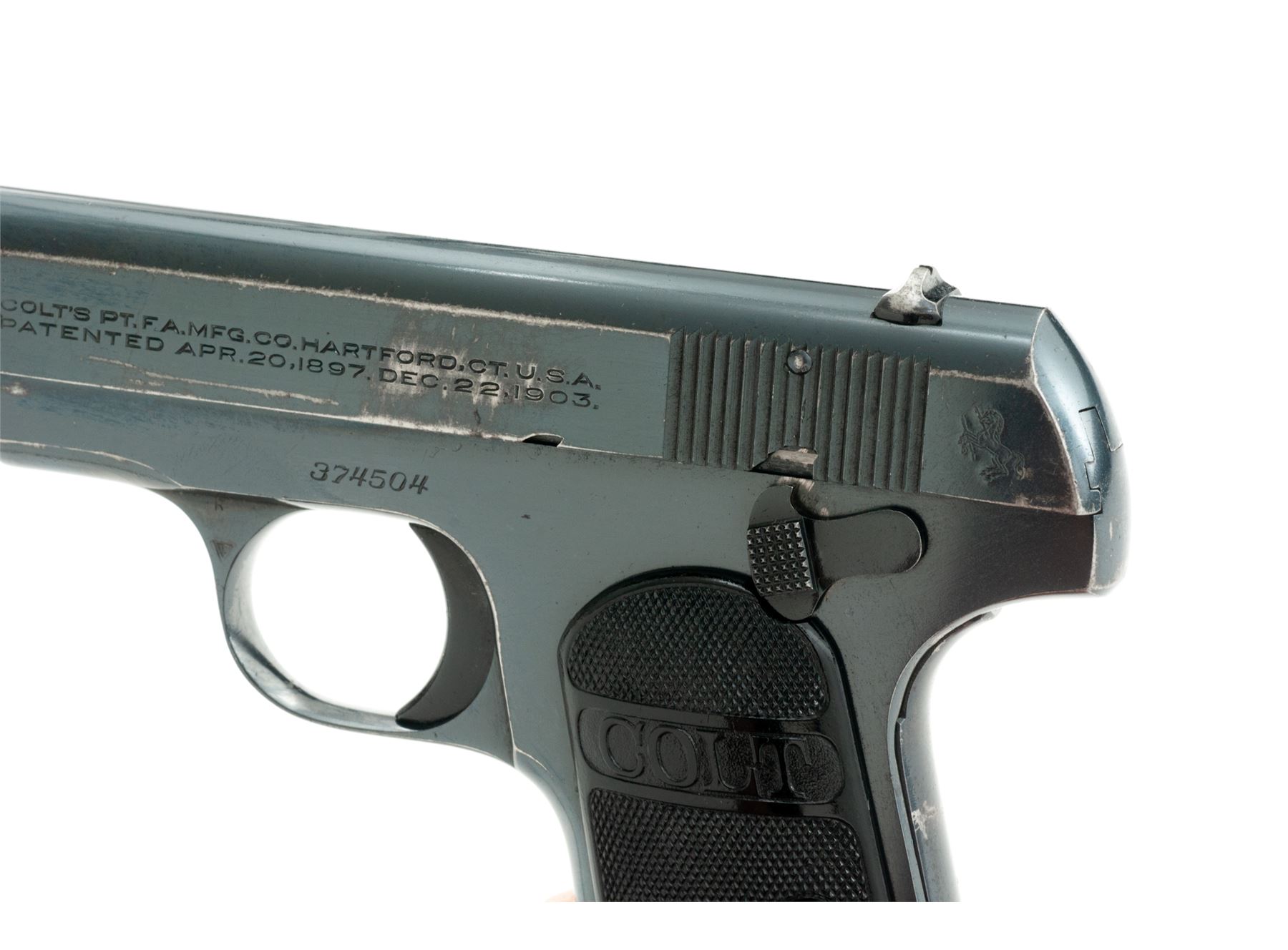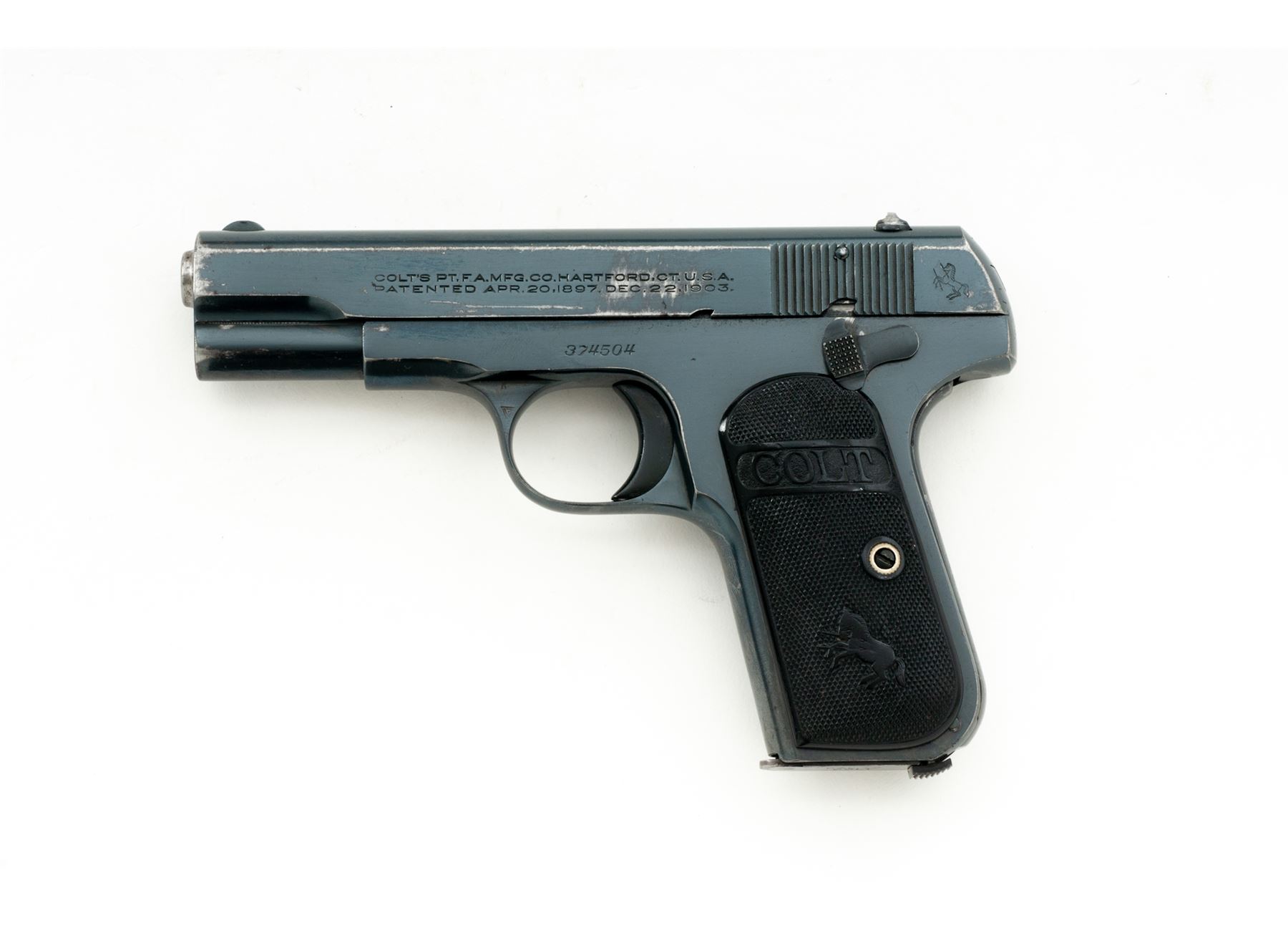 Colt Model 1903 Pocket Hammerless Semi-Automatic Pistol, #374504, .32 ACP cal., 3.75'' barrel, blue finish, hard rubber grips, with one factory two-tone magazine marked ''Cal.32/Colt''. Mfg'd 1921. Condition is very good retaining approx. 85%-90% original thinning blue, with most of the losses to the slide, with light general wear to front and back strap. Grips show light use. Good action, very good bore. Est.: $450-$650. (C&R/PPT)