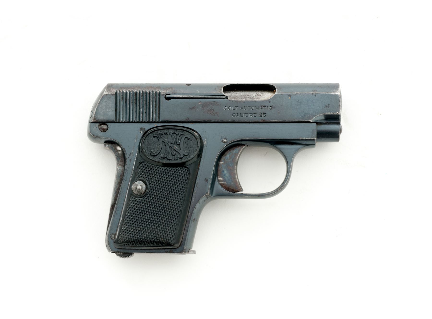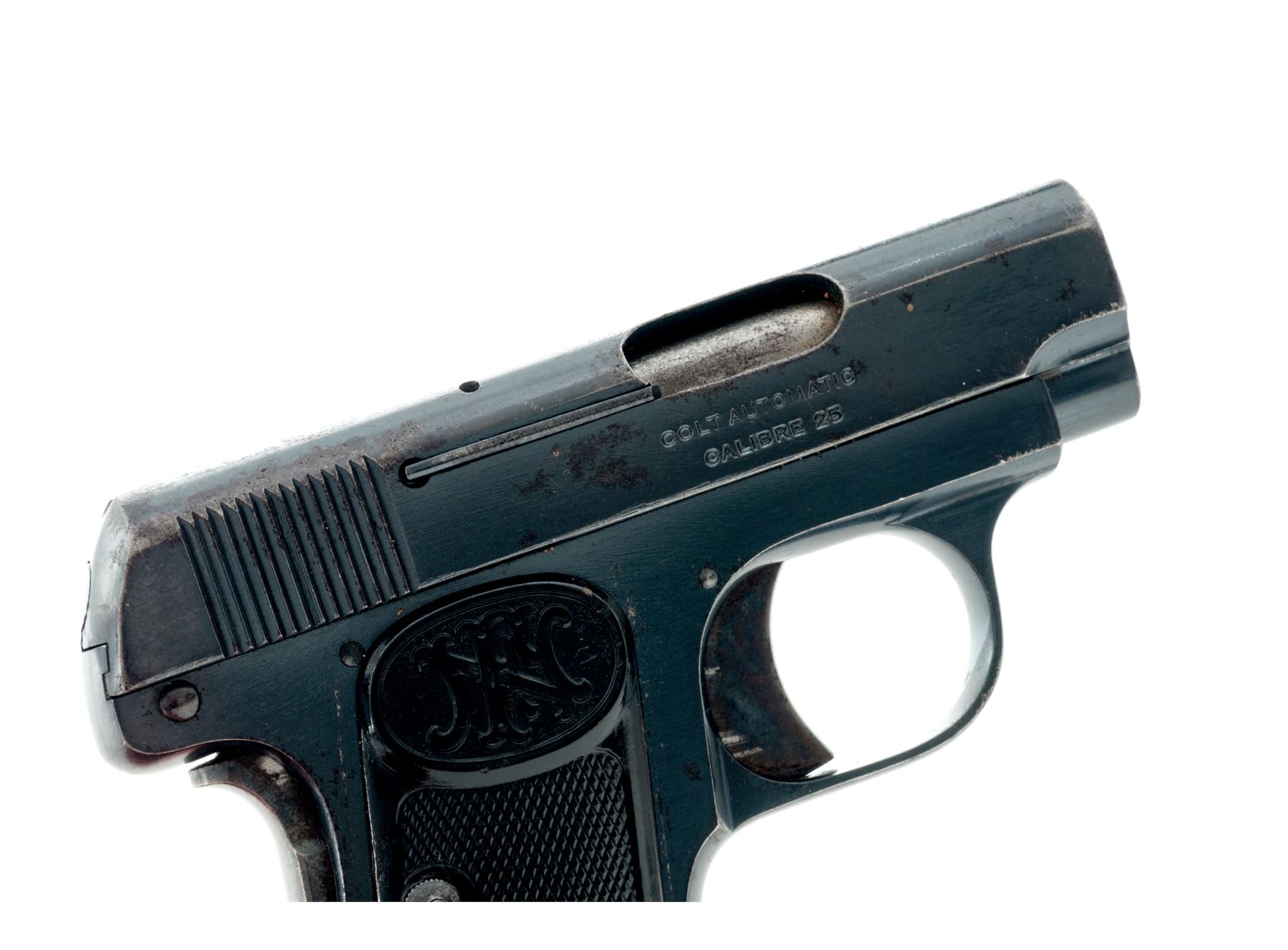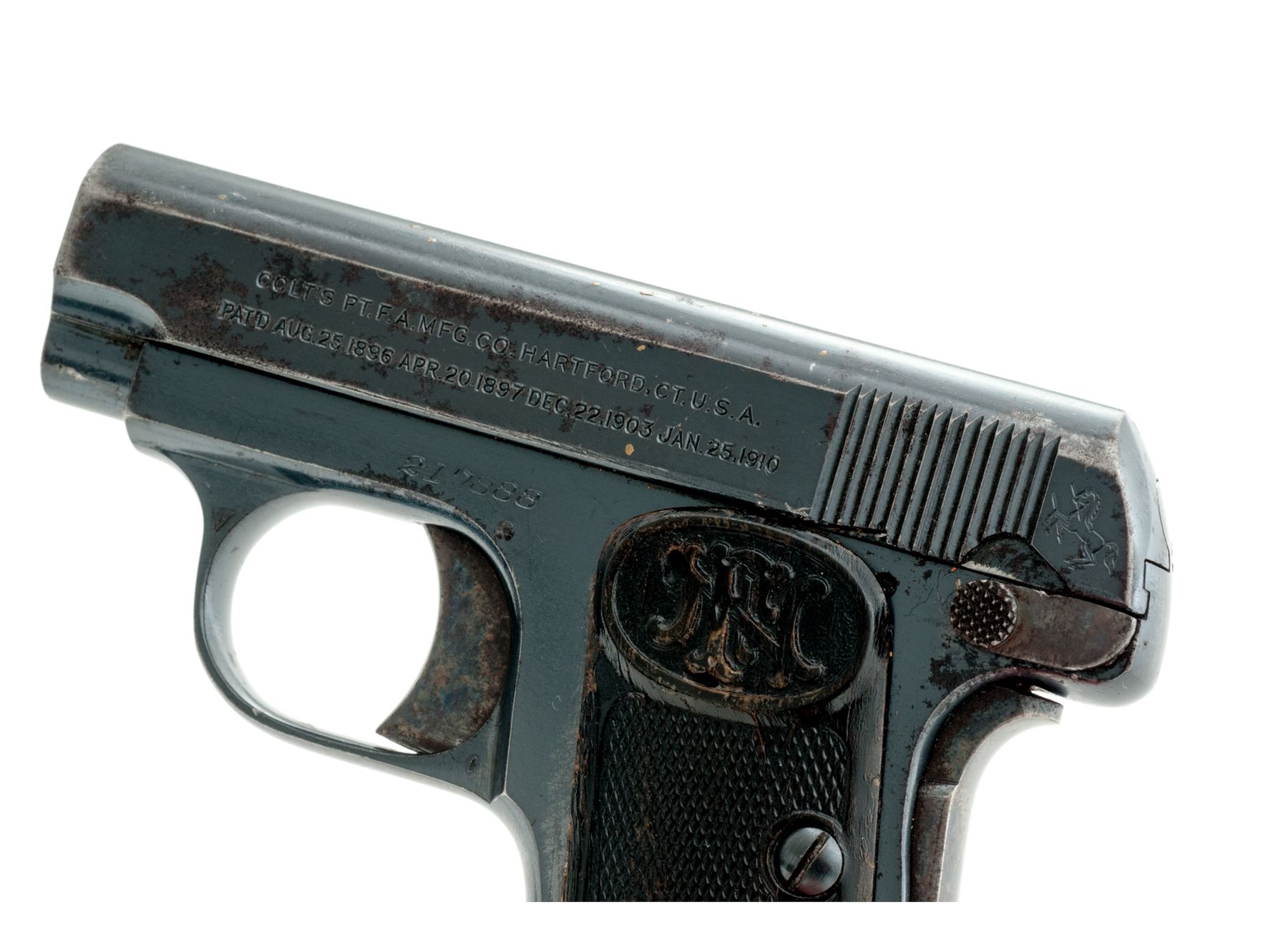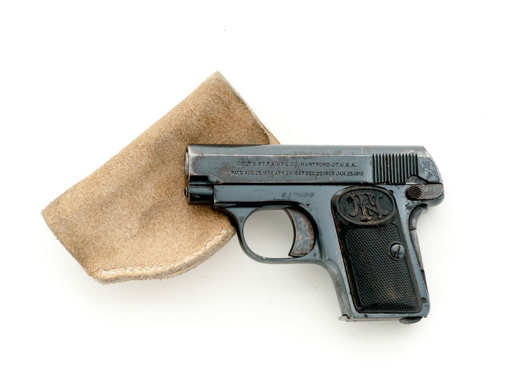 Colt Model 1908 Vest Pocket Semi-Automatic Pistol, #217888, .25 Auto cal., 2'' barrel, blue finish, with FN horn checkered grips, and one factory magazine marked ''Cal.25/Colt''. In buff suede Bianchi right-hand inside holster. Mfg'd 1919. Condition is very good retaining approx. 85% original factory blue with light pitting and flaking to slide. Grips and grip screw are from FN made pistol and fit surprisingly well, exhibiting mild flattening to checks and some worming to horn material. Good action, fair bore. Holster is fine with mild soiling. Est.: $250-$450. (C&R/PPT)