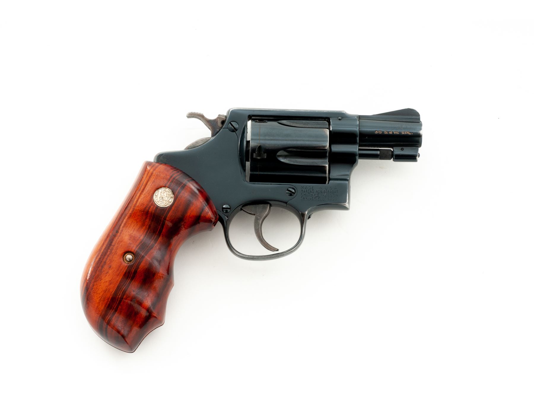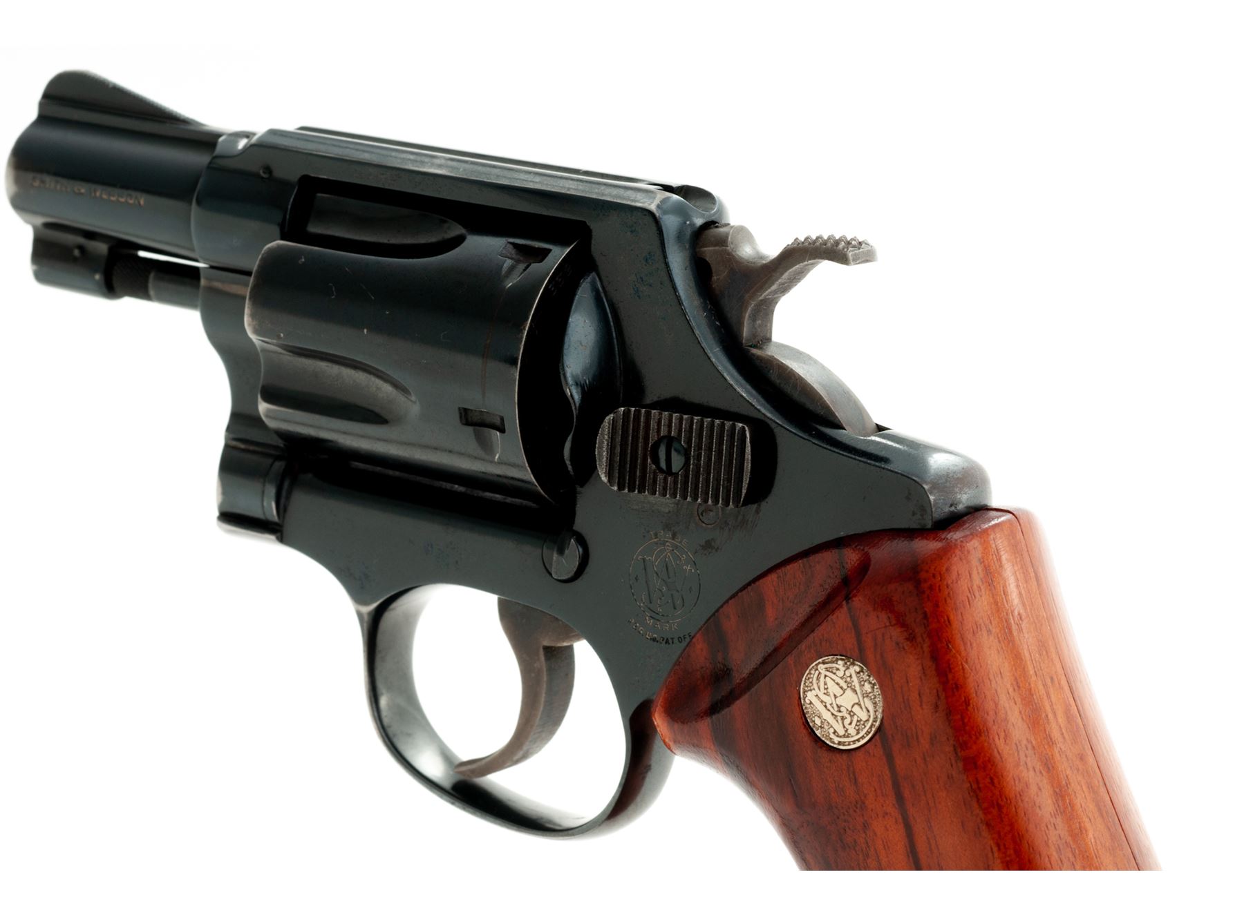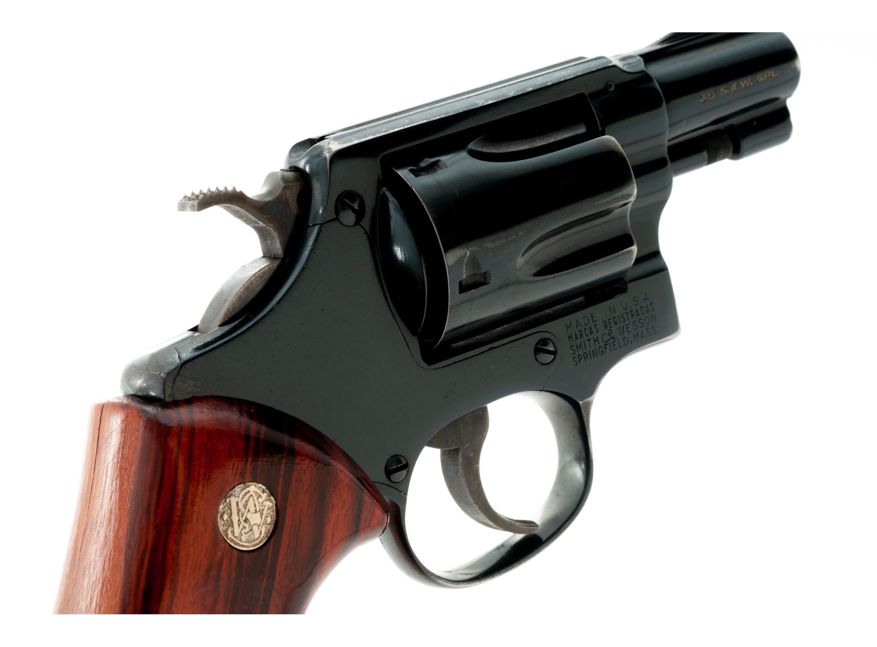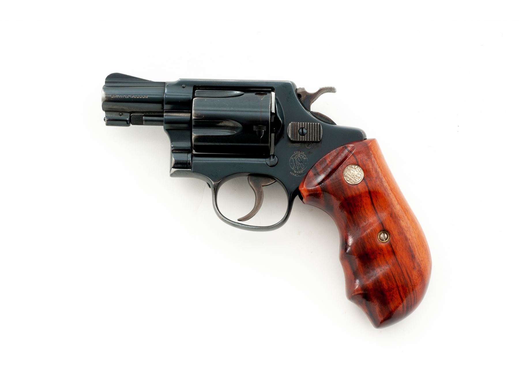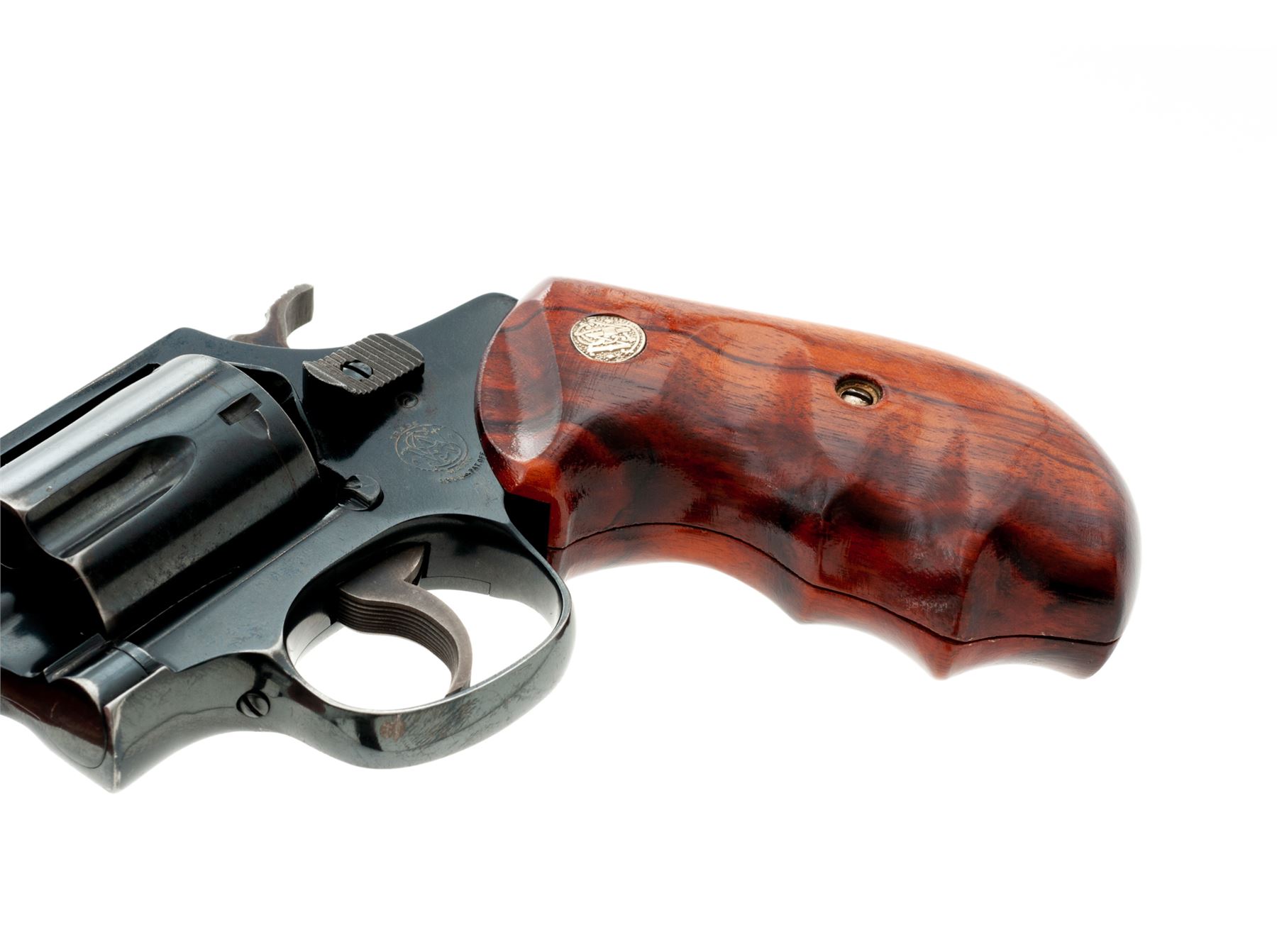 Smith & Wesson Pre-36 Double Action Revolver, #33217, .38 Spec. cal., 2'' barrel, blue finish, finger groove grips with S&W medallions. Condition is fine to near excellent as possibly refinished, showing a light index mark to cylinder. Action is crisp, bore is bright. Est.: $250-$400. (C&R)