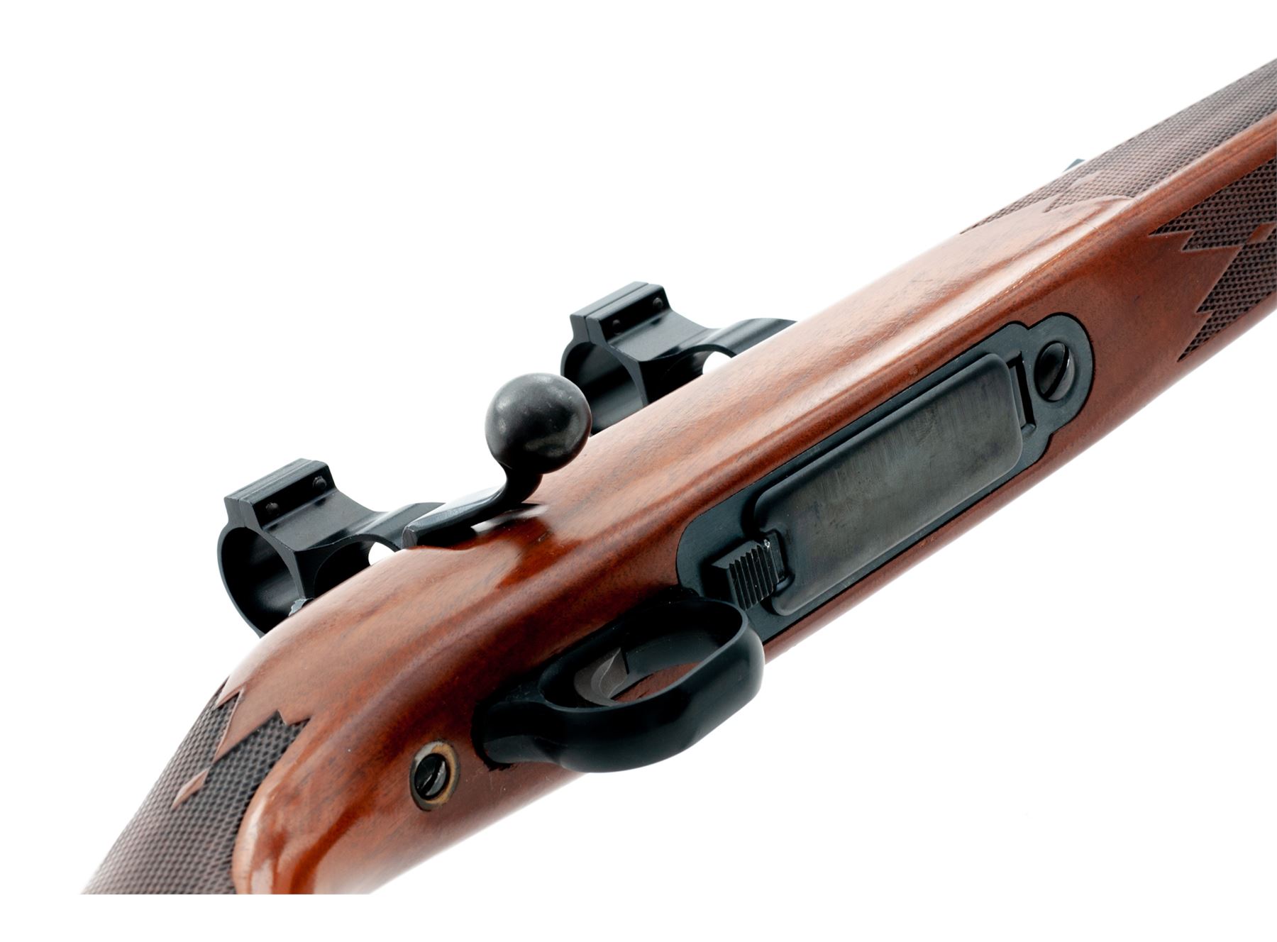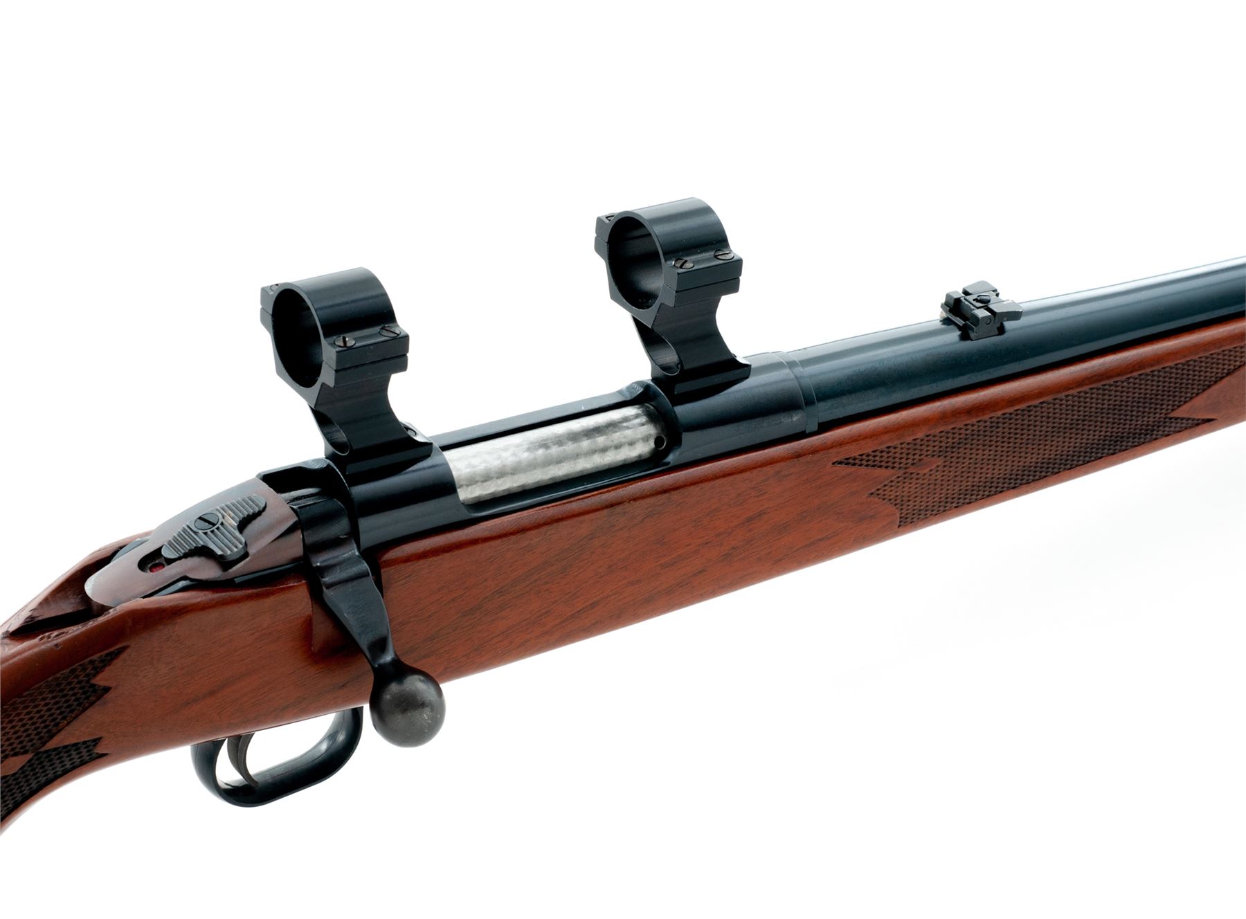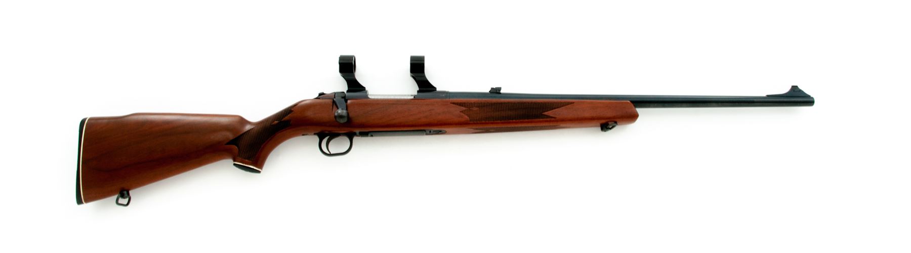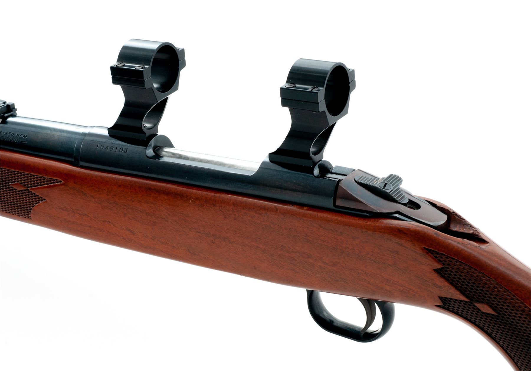 Mossberg Model 800C Bolt Action Rifle, #1049105, .22-250 cal., 22'' barrel, blue finish, dovetailed front sight with brass bead and folding rear sight; satin finished one-piece walnut stock with cheekpiece is checkered at both the wrist and pistol grip, black plastic buttplate and grip cap both with a white spacer, and sling swivel studs. Rifle is also fitted with two-piece scope rings and features a bolt mounted safety. Overall condition is excellent with approx. 98%+ factory finishes. Wood and metal with normal intermittent light handling marks; factory lettering is clear. Stock checkering shows no mentionable wear. Edge of pistol grip with a few small impressions. Excellent action and bright bore. Est.: $250-$400. (Modern)