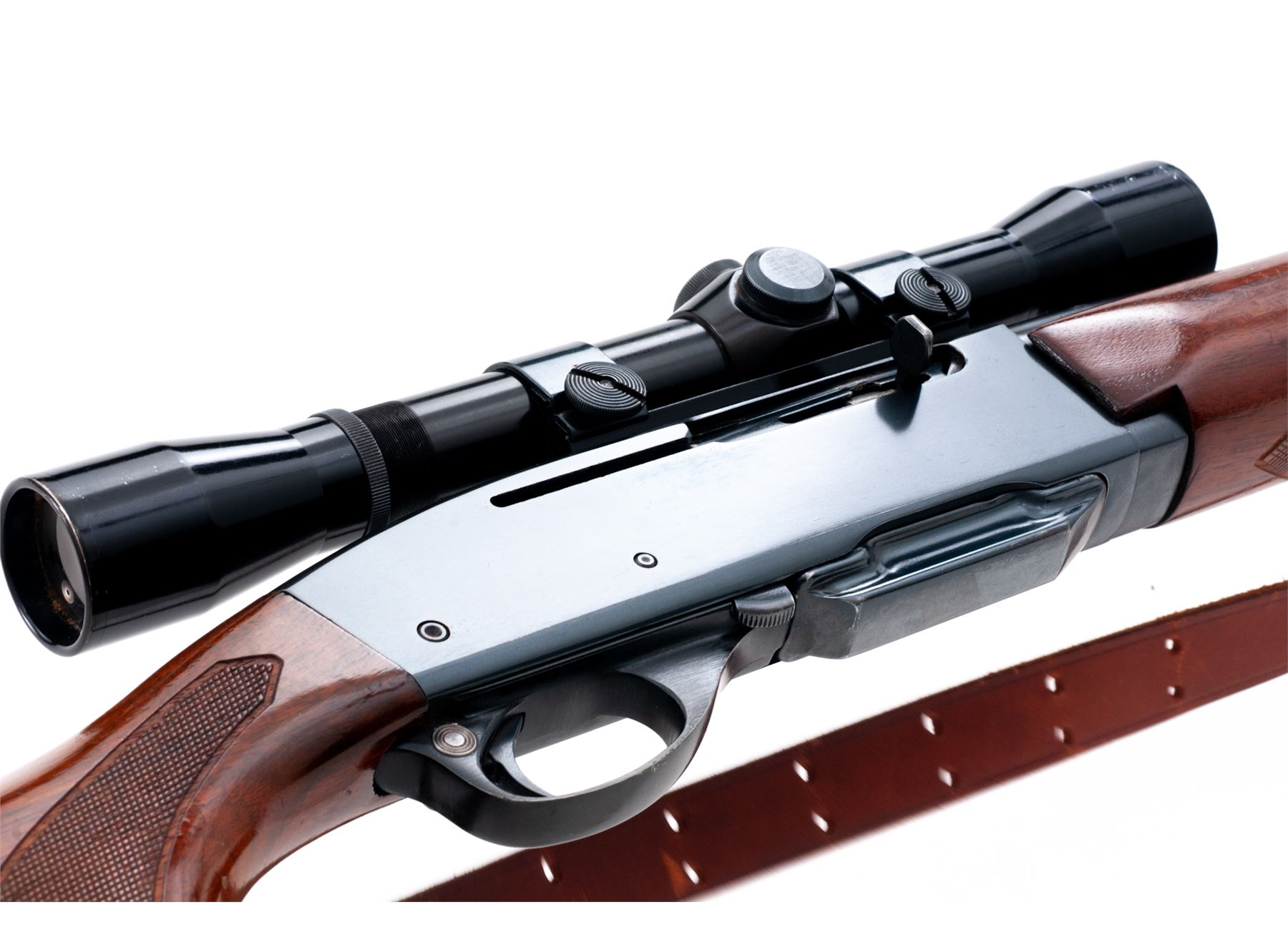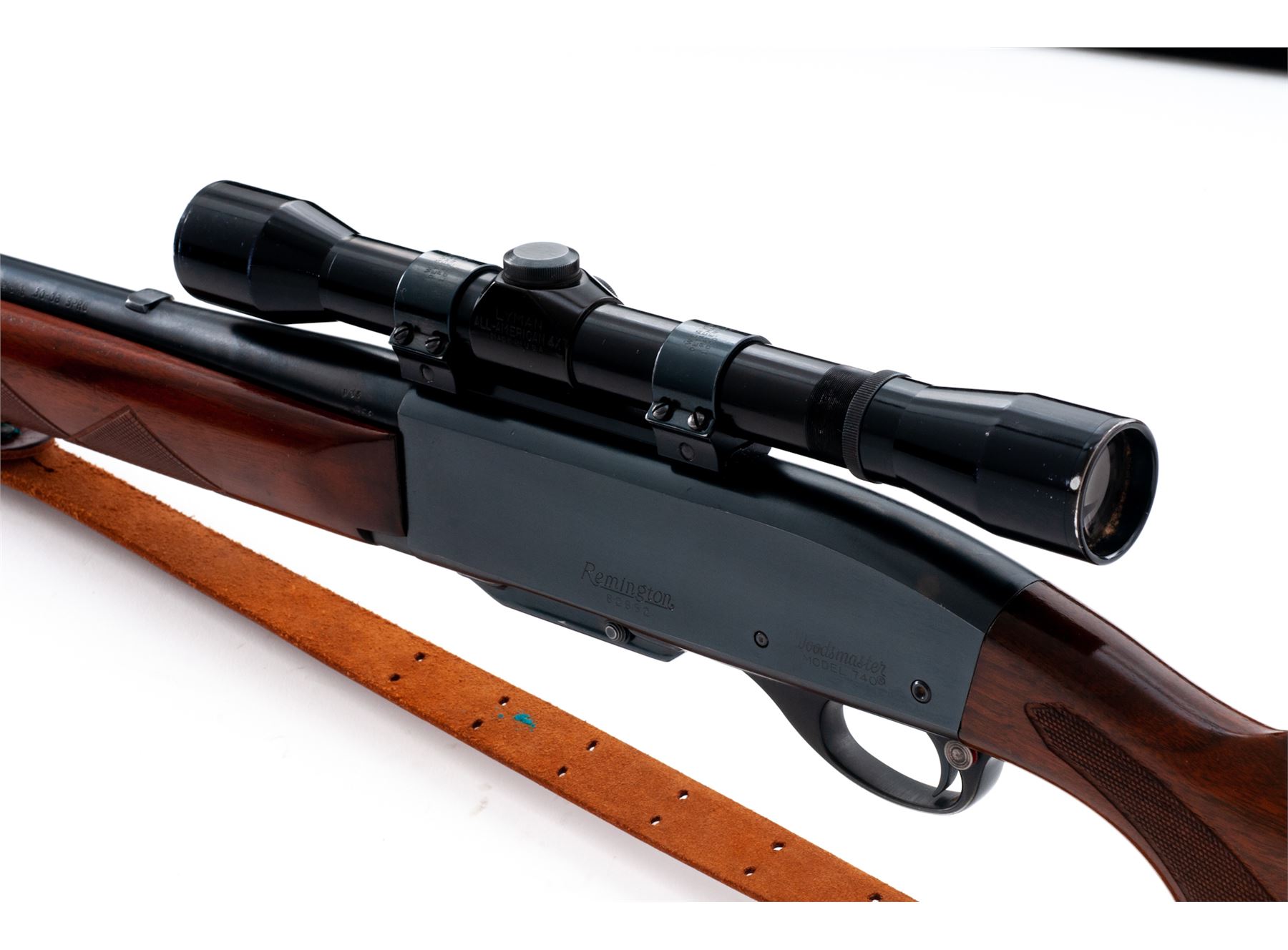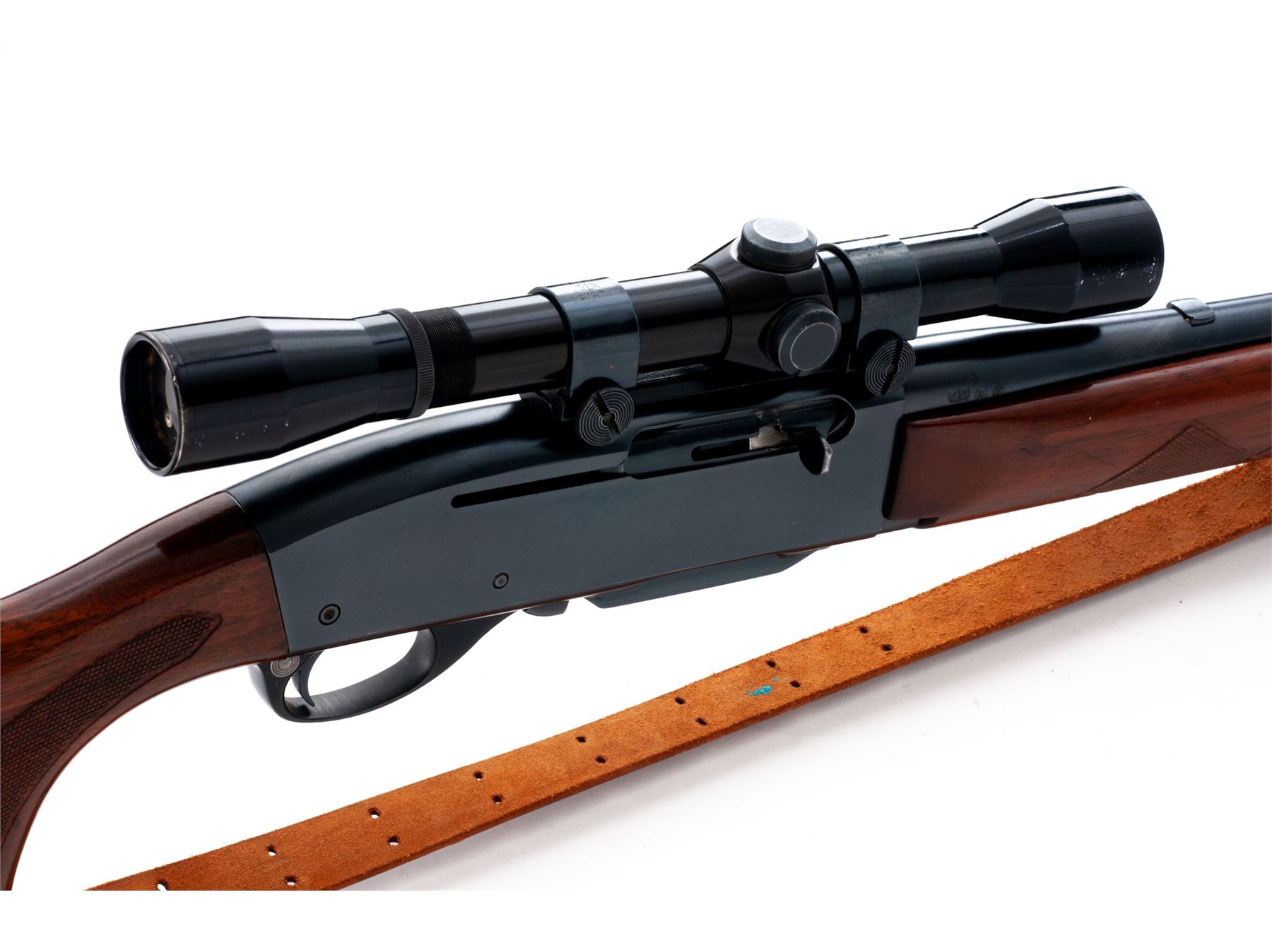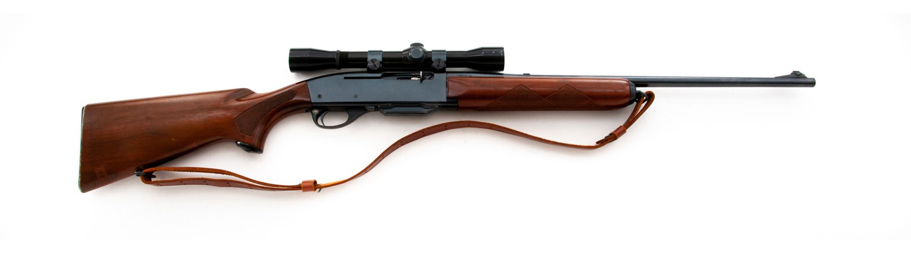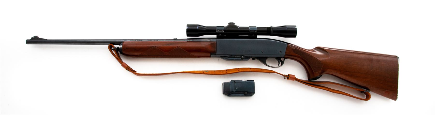 Remington Model 740 Semi-Automatic Rifle, #82852, .30-06 cal., 22'' barrel, blue finish, checkered walnut stock and forend, with two (2) factory magazines and commercial leather sling. Topped with a Lyman All-American 4x scope on Weaver rings and mounts. Condition is excellent showing light field use, retaining approx. 97% thinning blue. Stock with minor scuffs and scratches. Good action, bright bore, clean optics. Est.: $350-$500. (C&R)
