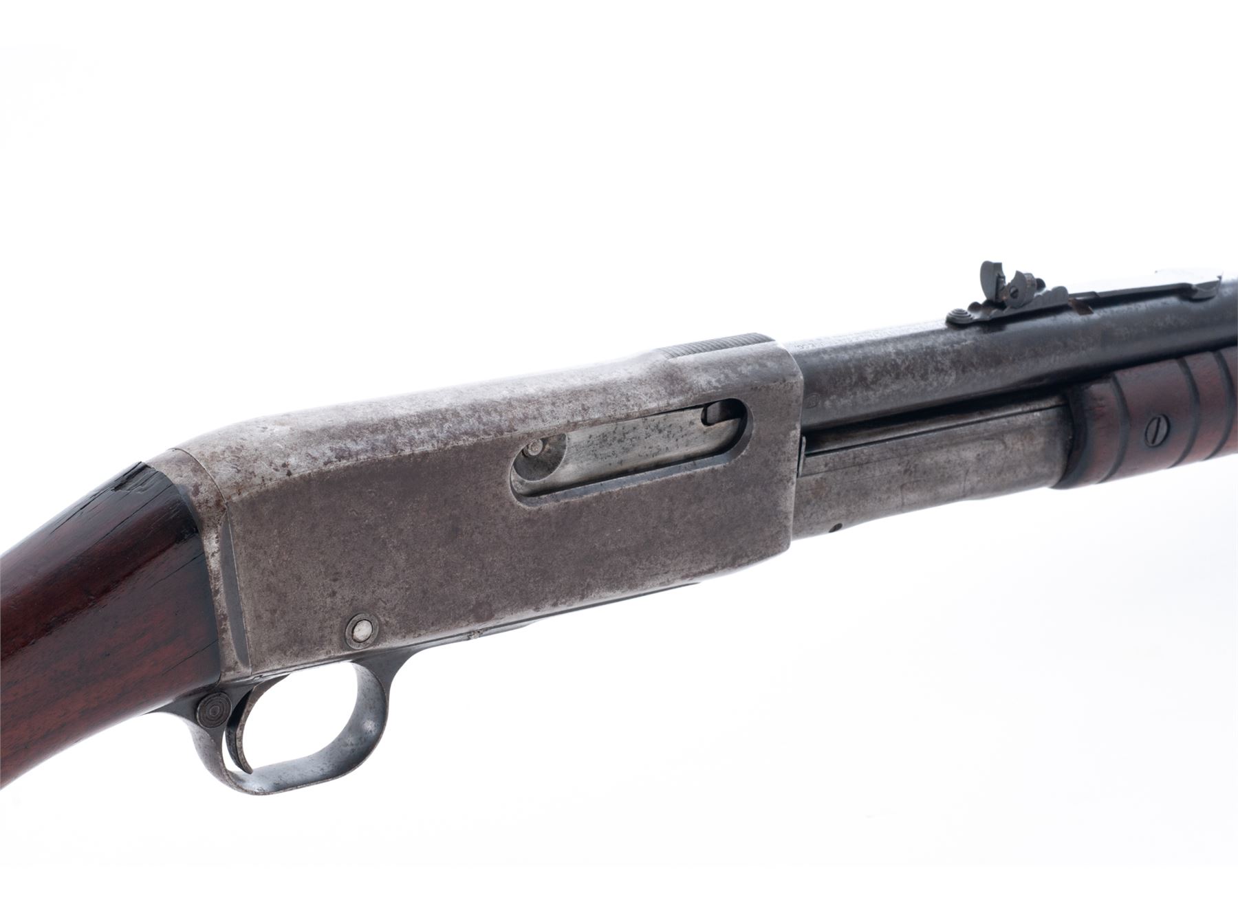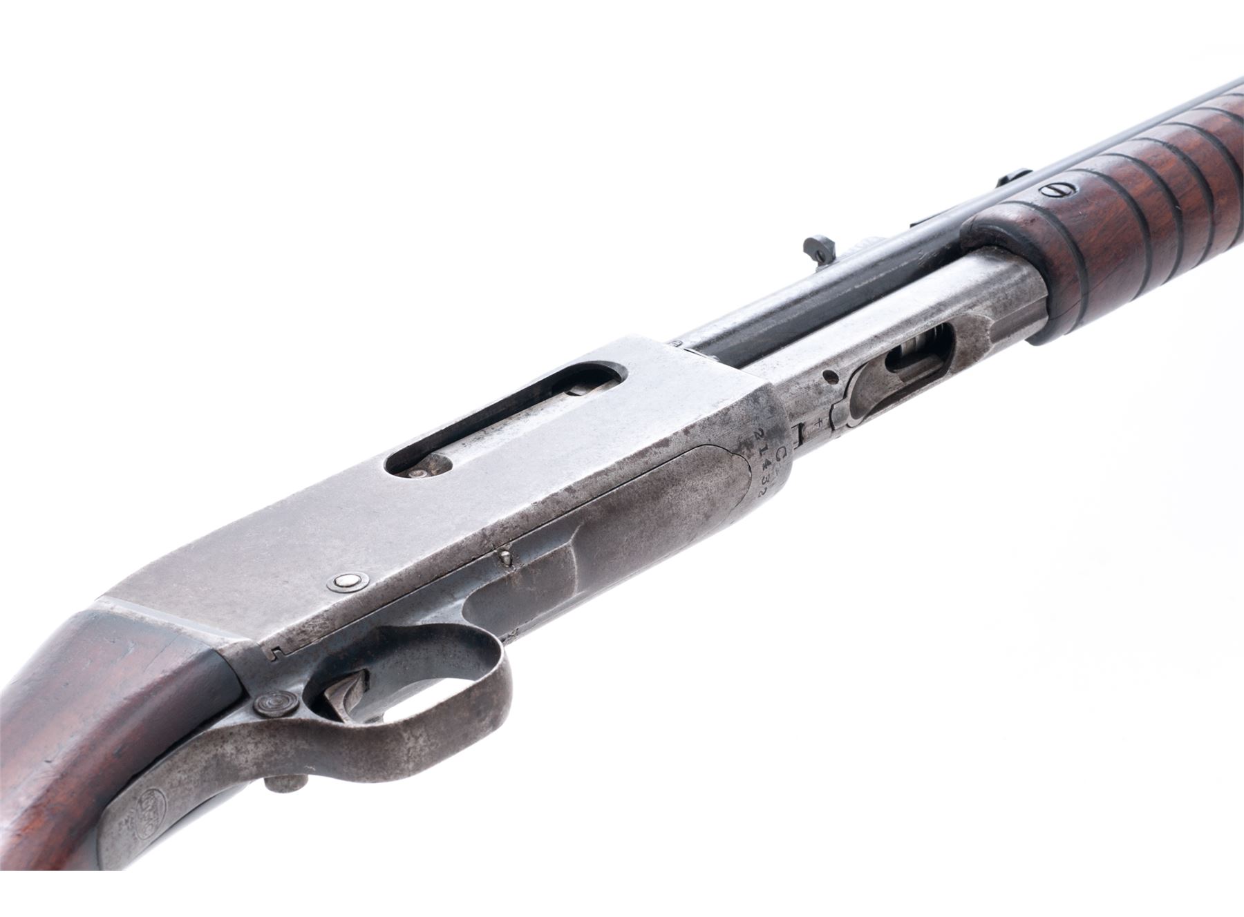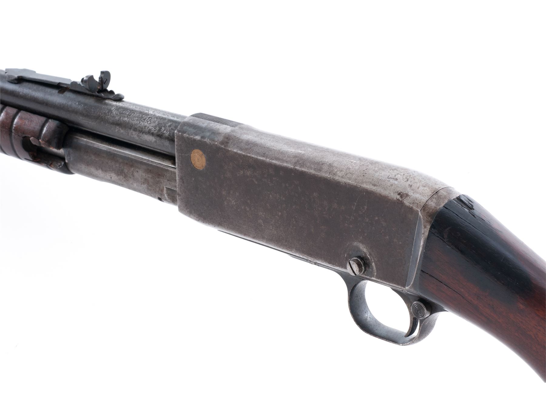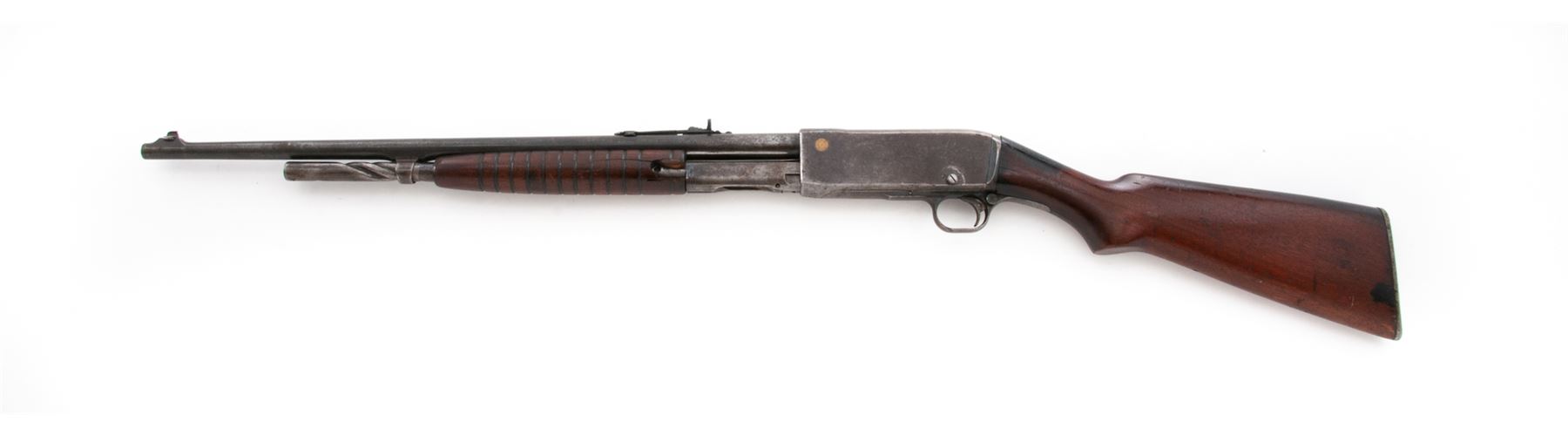 Remington Model 14 Slide Action Rifle, chambered in rare .25 Rem. caliber, #21432C, 22'' round barrel, blue finish, smooth pistol-grip walnut stock and grooved forend, checkered metal Remington-UMC buttplate, dovetailed front sight with brass bead and semi-buckhorn rear sight. Barrel with the correct earlier type ''Nov. 19, 12'' address; cartridge case caliber indicator on the left side is early ''UMC'' type that sits flush with the frame. Mfg'd circa 1914. Condition overall is good. Metal is lightly pitted with a little bit of toning blue finish remaining on the barrel, the balance a combination gray-brown patina; factory lettering is legible. Wood shows age and wear consistent with the overall condition of the rest of the rifle. Buttstock shows darkening along the top edge and wrist; wrist with a moderate chip at the top edge and cracking from age but remains solid; left side of the forend with a piece missing around the retaining screw. Good action; bore with a few small pits and in nice shape for its age, rifling is excellent. Est.: $200-$350. (C&R)
