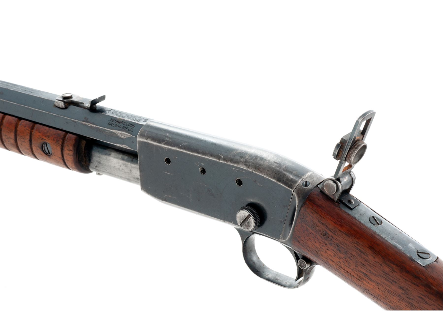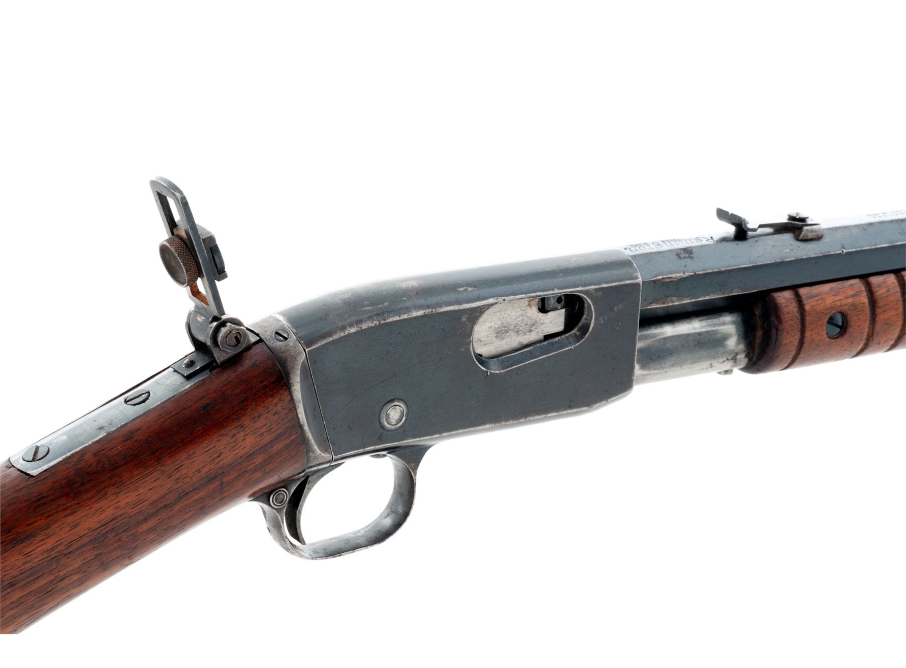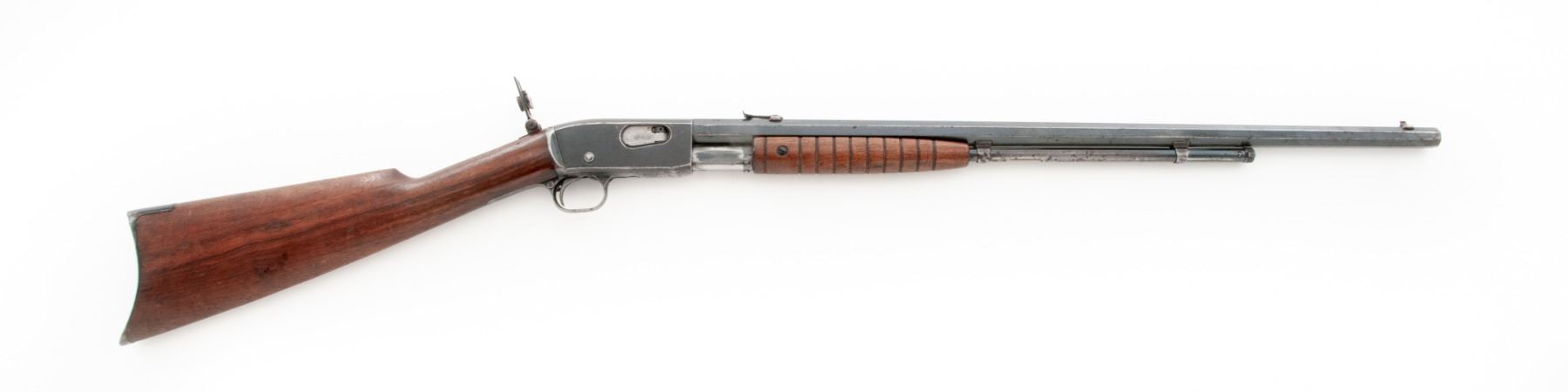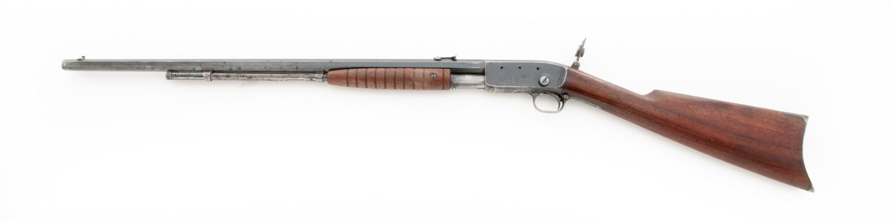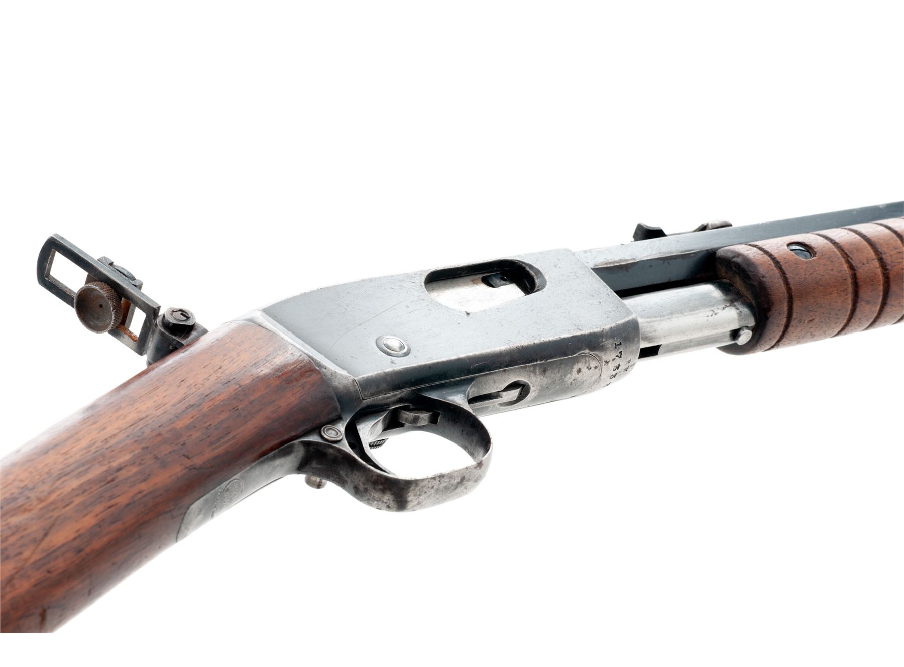 Remington Model 12C Pump Action Rifle, #173330, .22 S-L-LR cal., 24'' octagonal barrel, blue finish, walnut stock and forend, with standard sights and tang sight. Condition is about good retaining approx. 80%-85% blue. Witness marks to barrel flats near frame; receiver with three drilled and tapped holes from old side-mount scope (no longer present). Stocks are very good with just light scuffs, no evidence of sanding. Action and bore are good. Est.: $150-$300. (C&R)