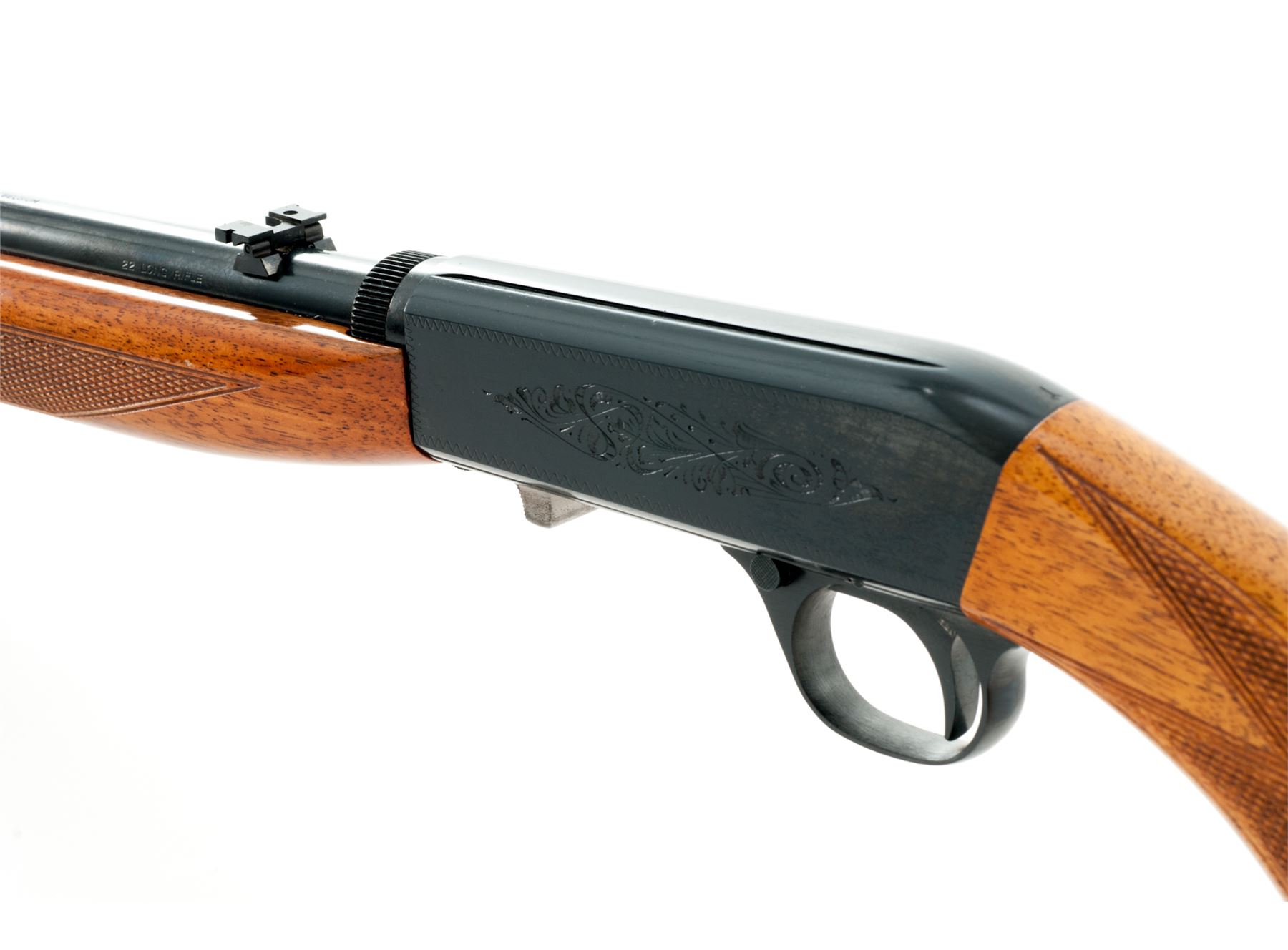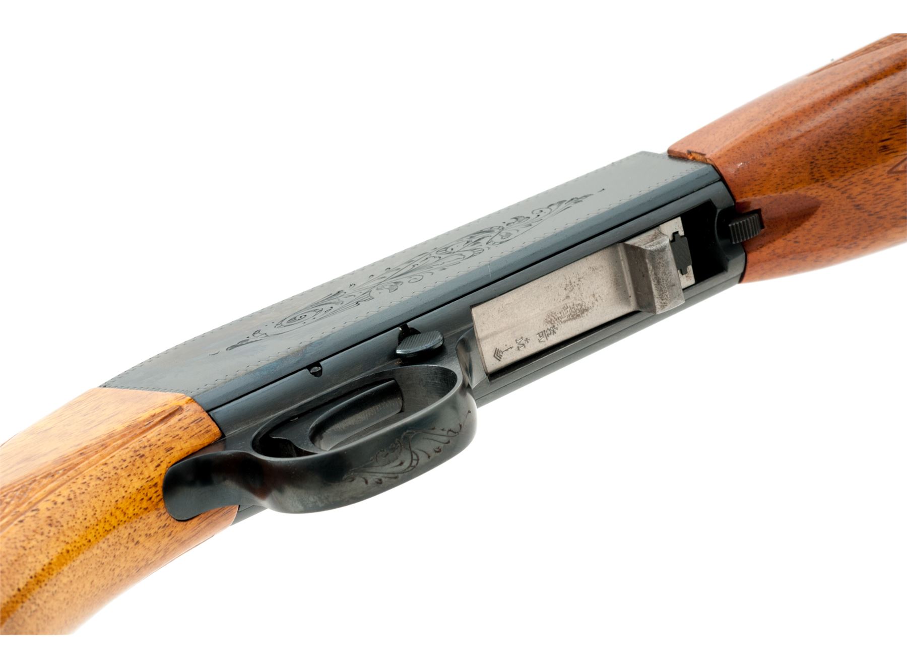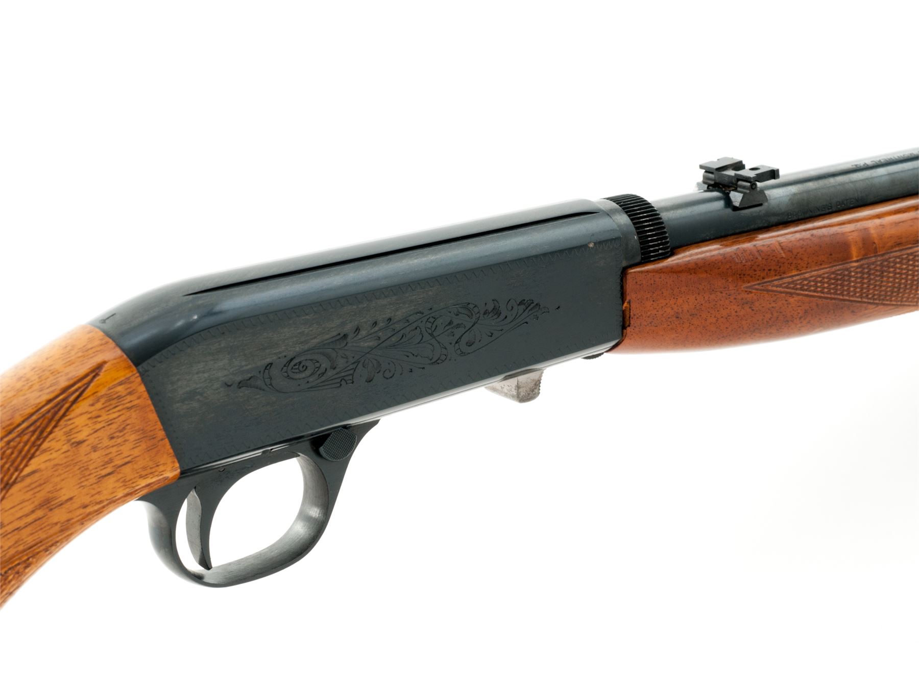 Belgian Browning .22 Semi-Automatic Rifle, #4T415, .22 LR cal., 19'' barrel, lightly engraved blue finish, checkered European walnut stock and forend. Condition is excellent with only the smallest mark to the forward top right edge of frame near border engraving. Stock with very slight pressure marks. Crisp action, bright bore. Est.: $450-$650. (C&R)