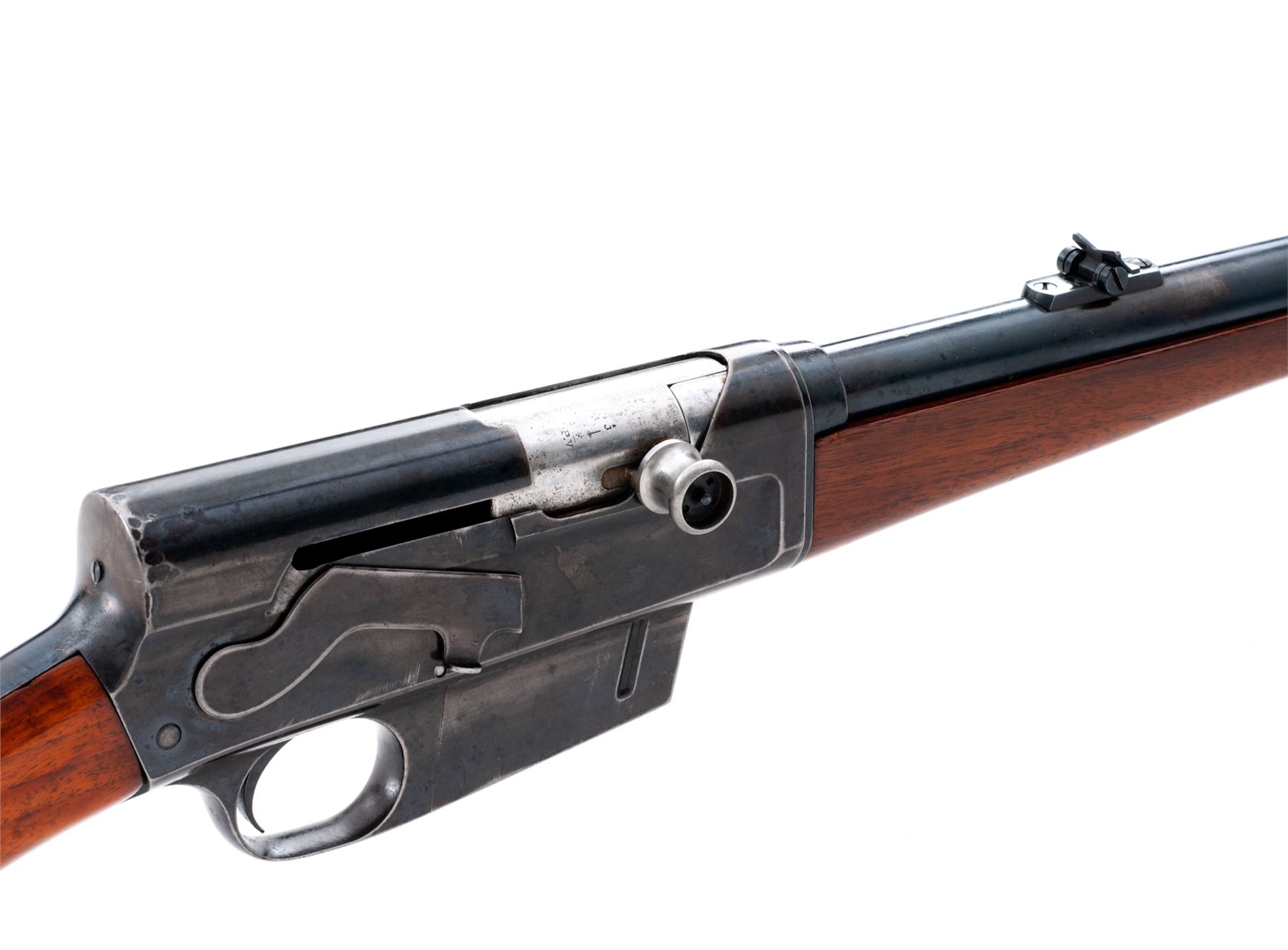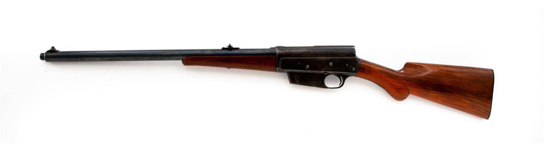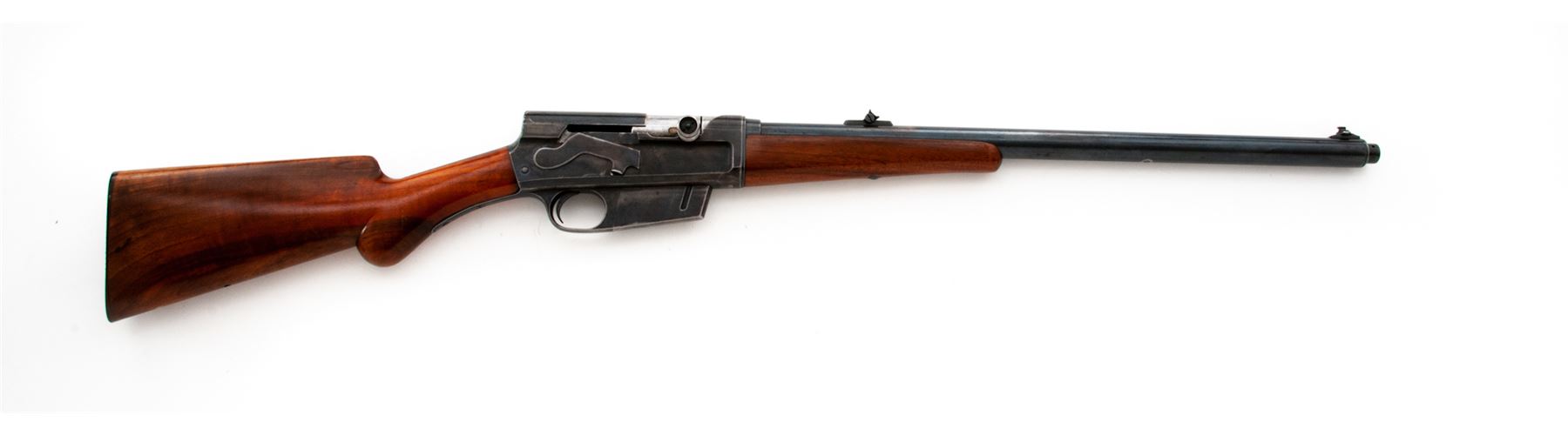 FN Browning Model 1900 Semi-Automatic Rifle, #1098, .35 Rem. cal., 22'' barrel, blue finish, smooth pistol-grip European walnut stock and handguard, with gold bead front and two-leaf rear sight. Originally mfg'd probably 1901. Condition is very good to near fine retaining approx. 85%-90% blue to barrel assembly; receiver, magazine and triggerguard with approx. 75% thinning blue. Stock and forend have been lightly sanded; lower edge of buttstock has had a sling swivel removed. Horn buttplate is excellent showing no worming and very slight wear to heel. Action is good, bore is fine. Est.: $450-$650. (C&R)