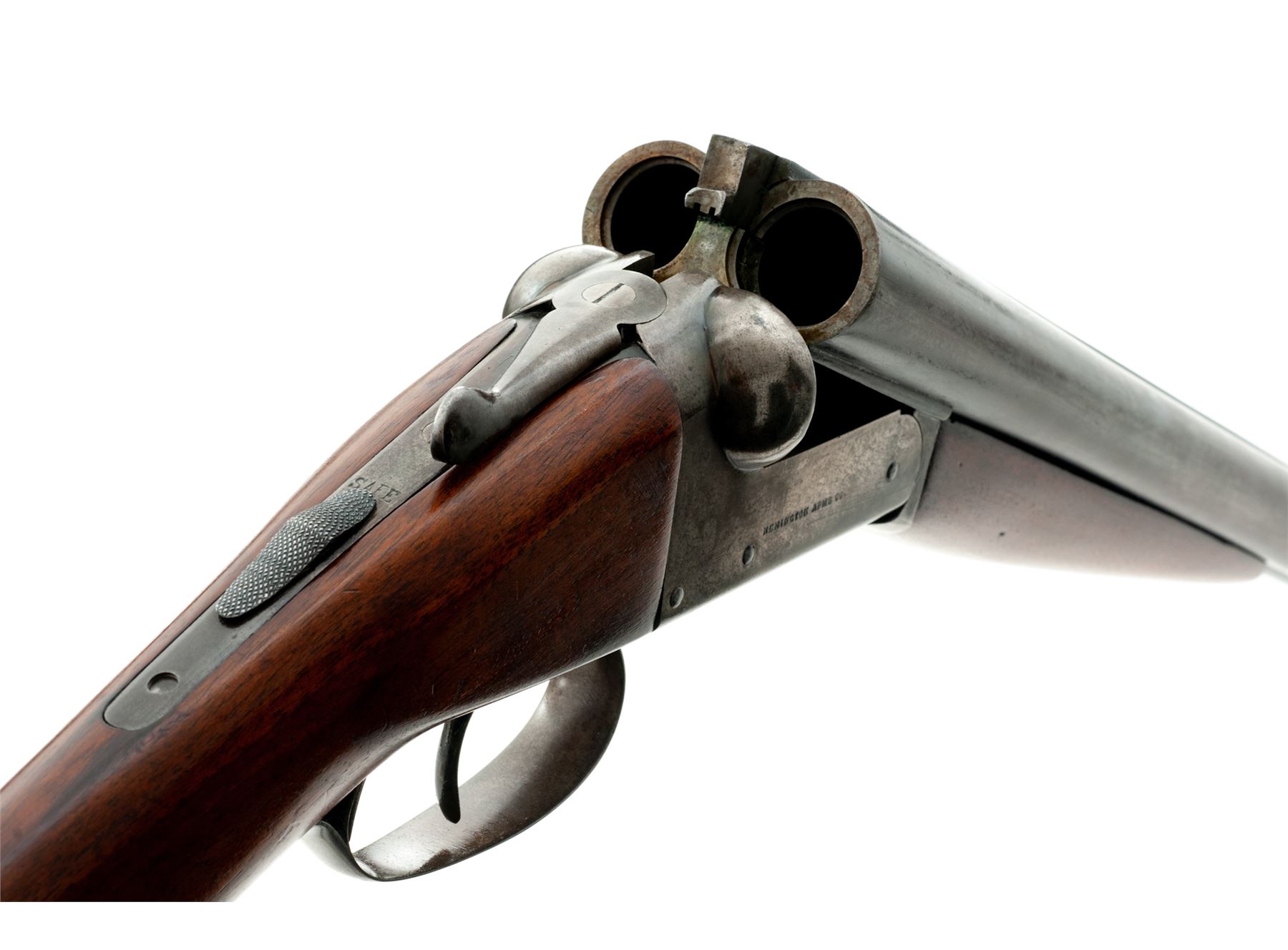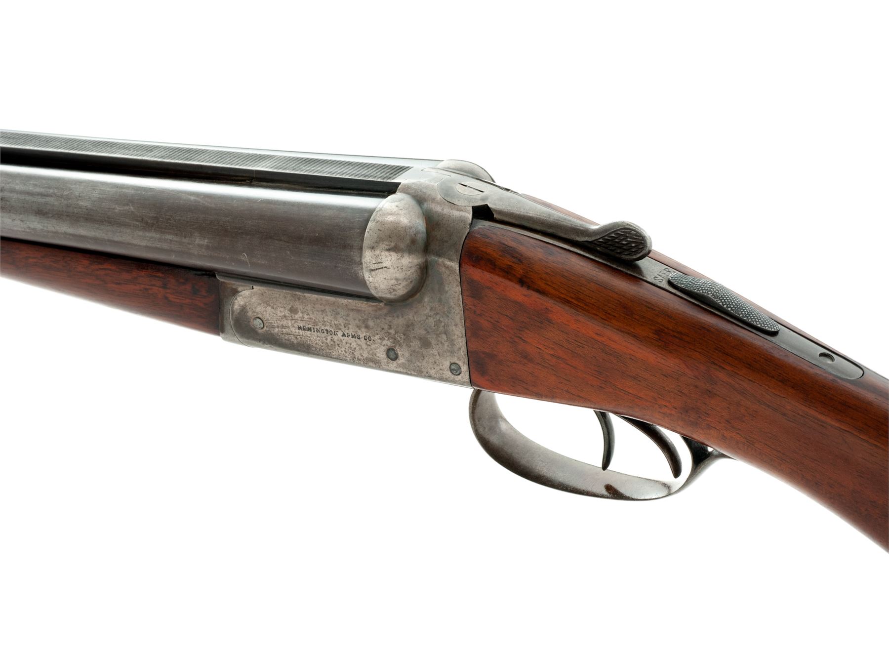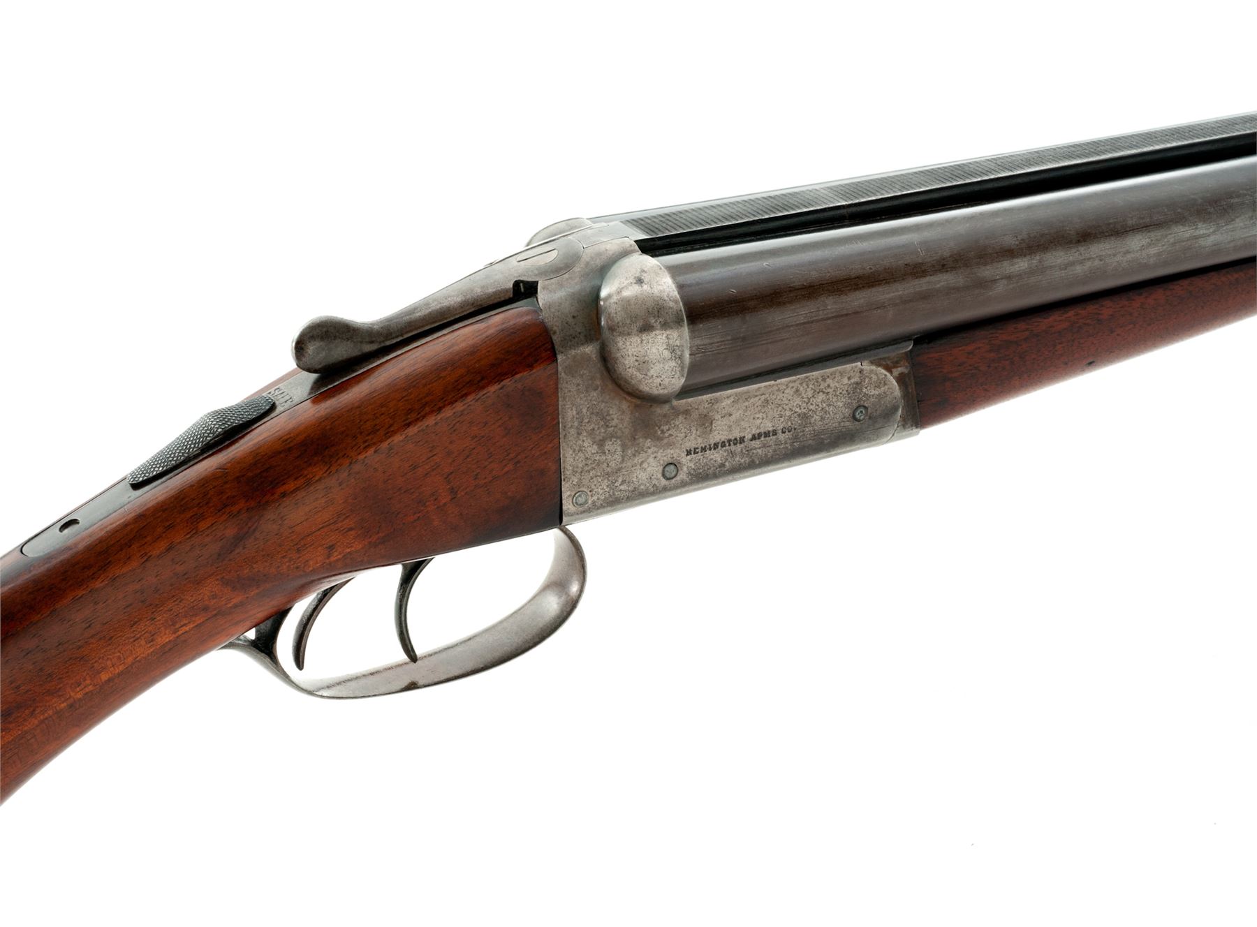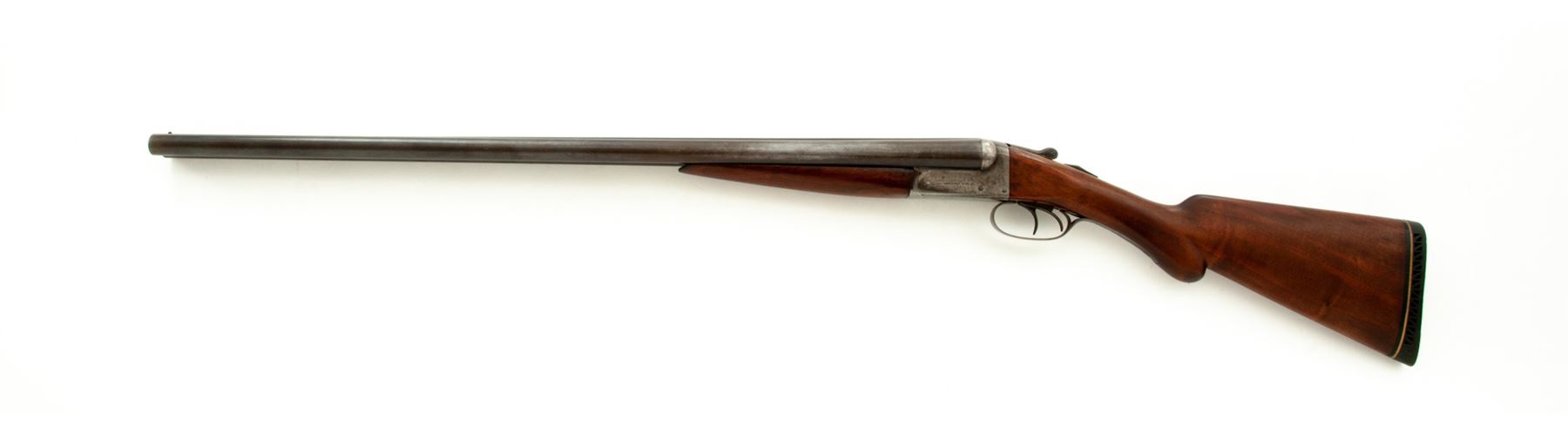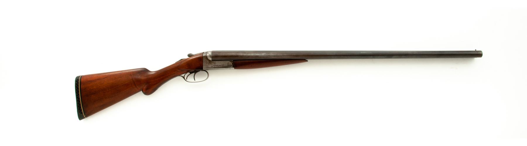 Remington Model 1900 K Grade Side-by-Side Shotgun, #317839. 12 ga. 30'' steel barrels have 2-5/8'' chambers, flat milled rib, and are choked IM/IM. Boxlock action features double triggers, simple extractors and auto safety. Field Grade walnut forend and pistol-grip buttstock have no checkering, but do have a rounded grip and Pachmayr Whiteline recoil pad. Mfg'd 1902. Condition is very good for a Field Gun. Wood may have been refinished, but action still locks tight and bores are bright. Est.: $250-$400. (C&R)