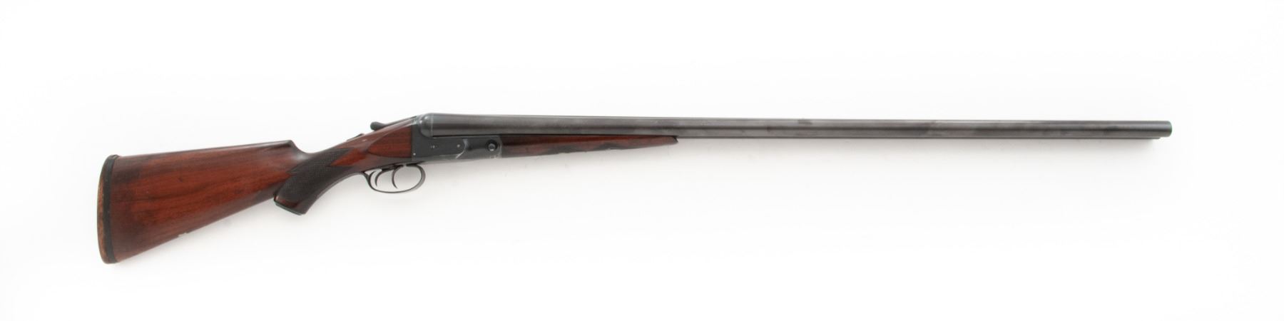 Parker VHE Grade Side-by-Side Shotgun, #208437. 12 ga. 34'' barrels have 3'' chambers, ivory target beads, and are choked Full/Full. Top rib is marked ''Parker Bros. Makers. Meriden. CT. U.S.A. Vulcan Steel''. This Parker hammerless boxlock features double triggers, auto ejectors and auto safety. Receiver, triggerguard, lower tang, forend iron and barrel escutcheons have simple border engraving in the VH style. Splinter forend and pistol-grip buttstock are of Standard Grade walnut, with plastic Parker grip cap and aftermarket butt pad. Mfg'd 1924. Condition is very good, with expected handling marks to wood, reblue to receiver, several small repair marks on left-hand barrel, and deterioration of butt pad. However, action locks tight, ejectors work correctly, and bores are bright. Est.: $500-$750. (C&R)