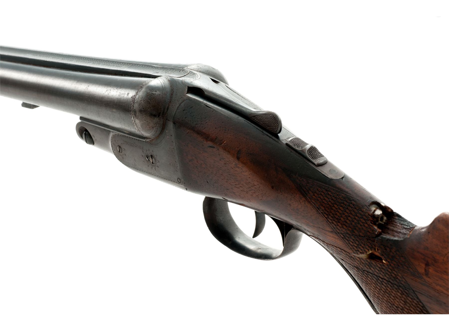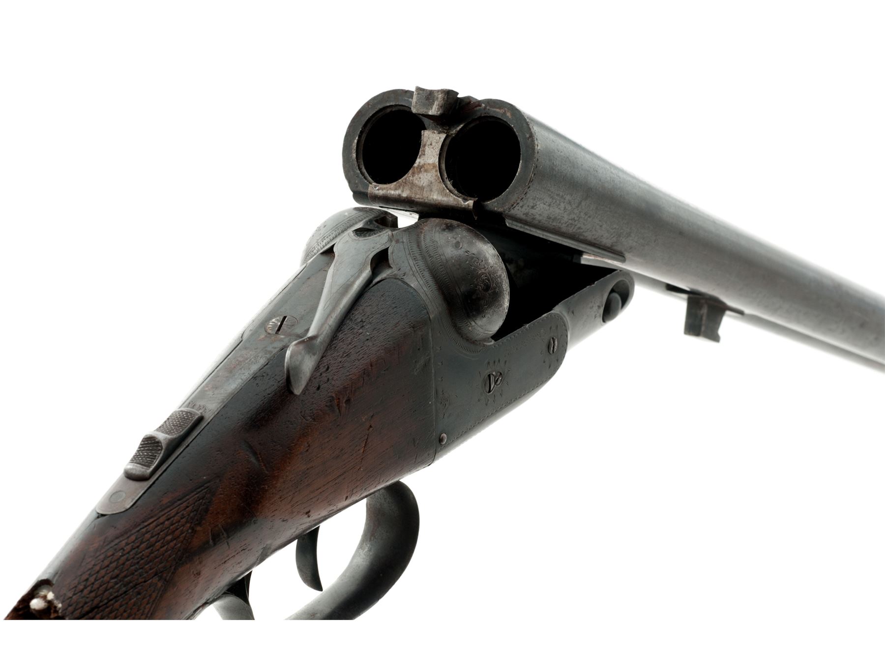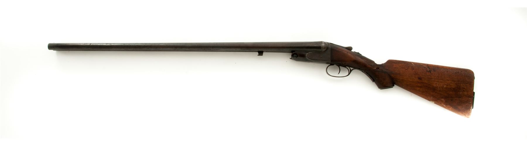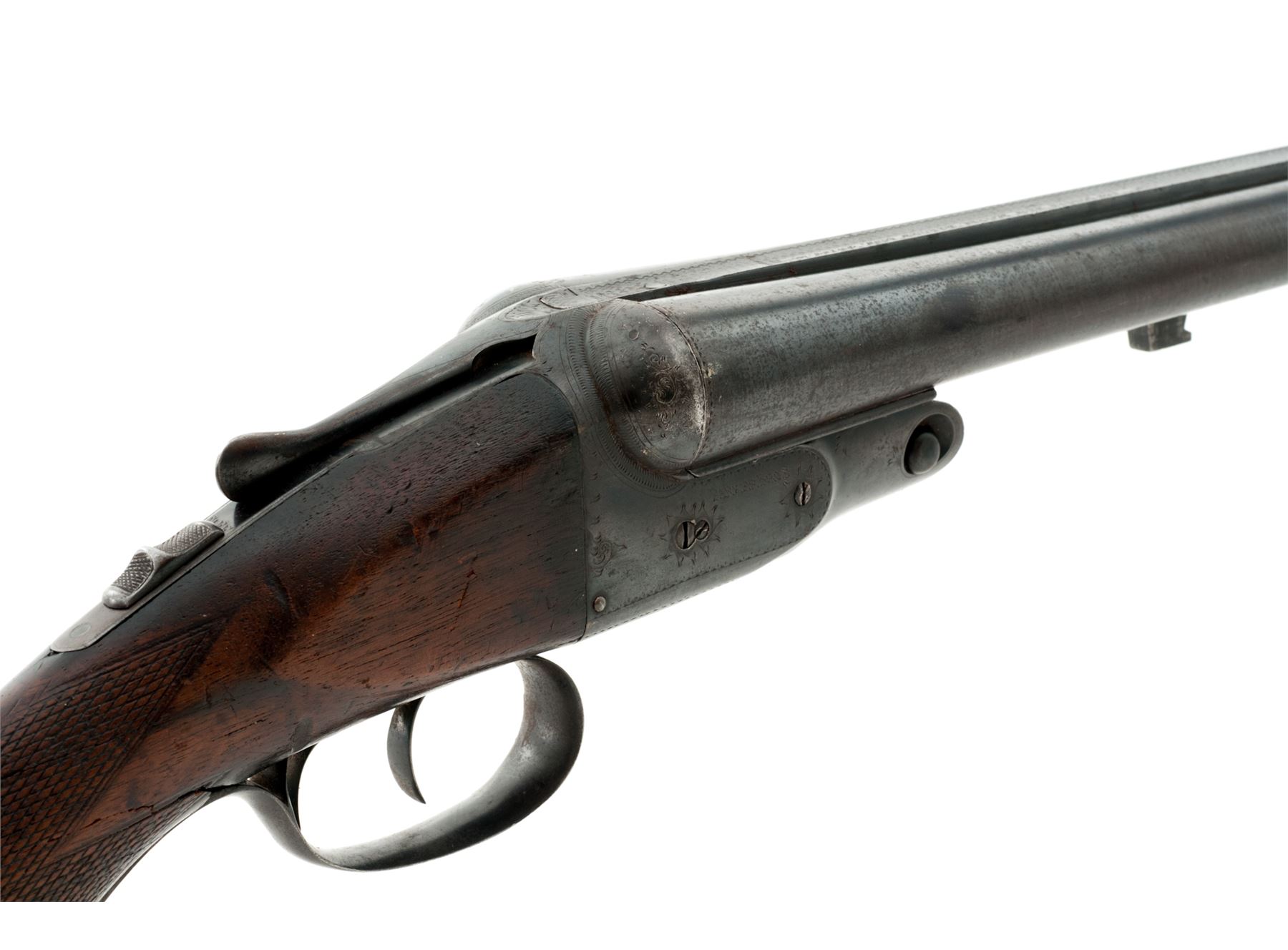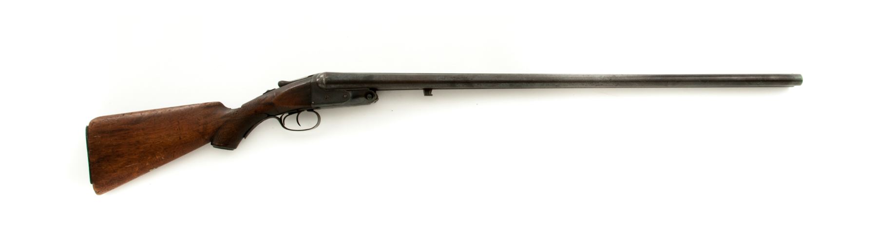 Parker Bros. Side-by-Side Double Barrel Shotgun, #108501, 12 ga., blued 30'' barrels with bead front sight are choked F/F and marked on matted top rib at breech, ''Parker Bros. Makers, Meriden, Conn. Twist'' flanked by fancy brackets; border engraved blued steel receiver with sliding safety is marked ''Parker Bros.'' on both sides; varnished and checkered pistol-grip walnut buttstock with ''Parker Bros.'' hard rubber pistol gripcap and matching buttplate. Condition is about good, the barrels retaining much blue with scattered beginning rust, several tiny dents and slight misshaping at muzzle; the receiver with a smooth dark bluish tone and missing bottom tang screw, missing the forend. Buttstock with wear to checkering with three longitudinal cracks and a 1'' chip out at top of wrist, the hard rubber buttplate broken and missing two large chips. Action functions; bores are extremely bright and shiny. Est.: $200-$400. (C&R)