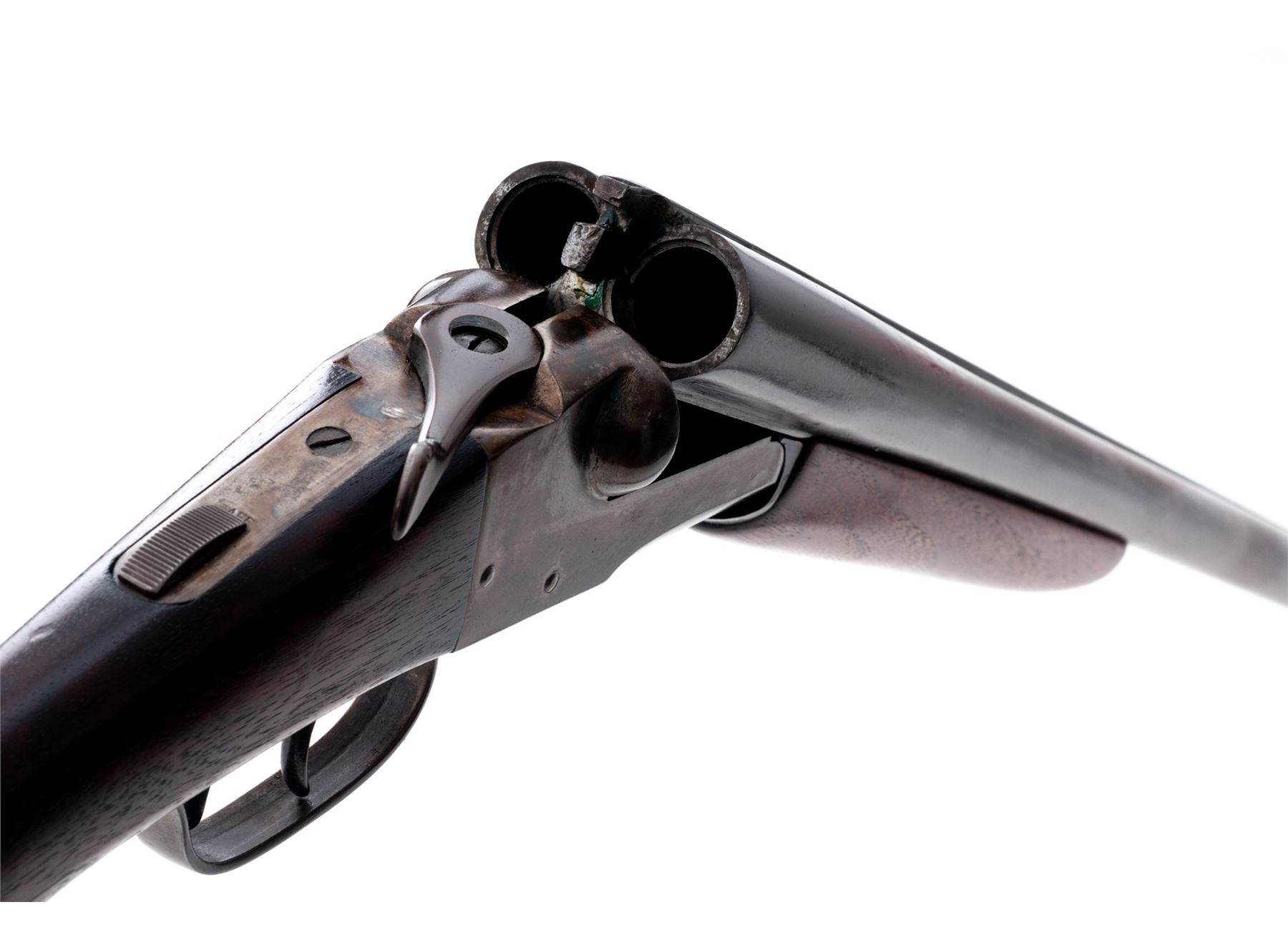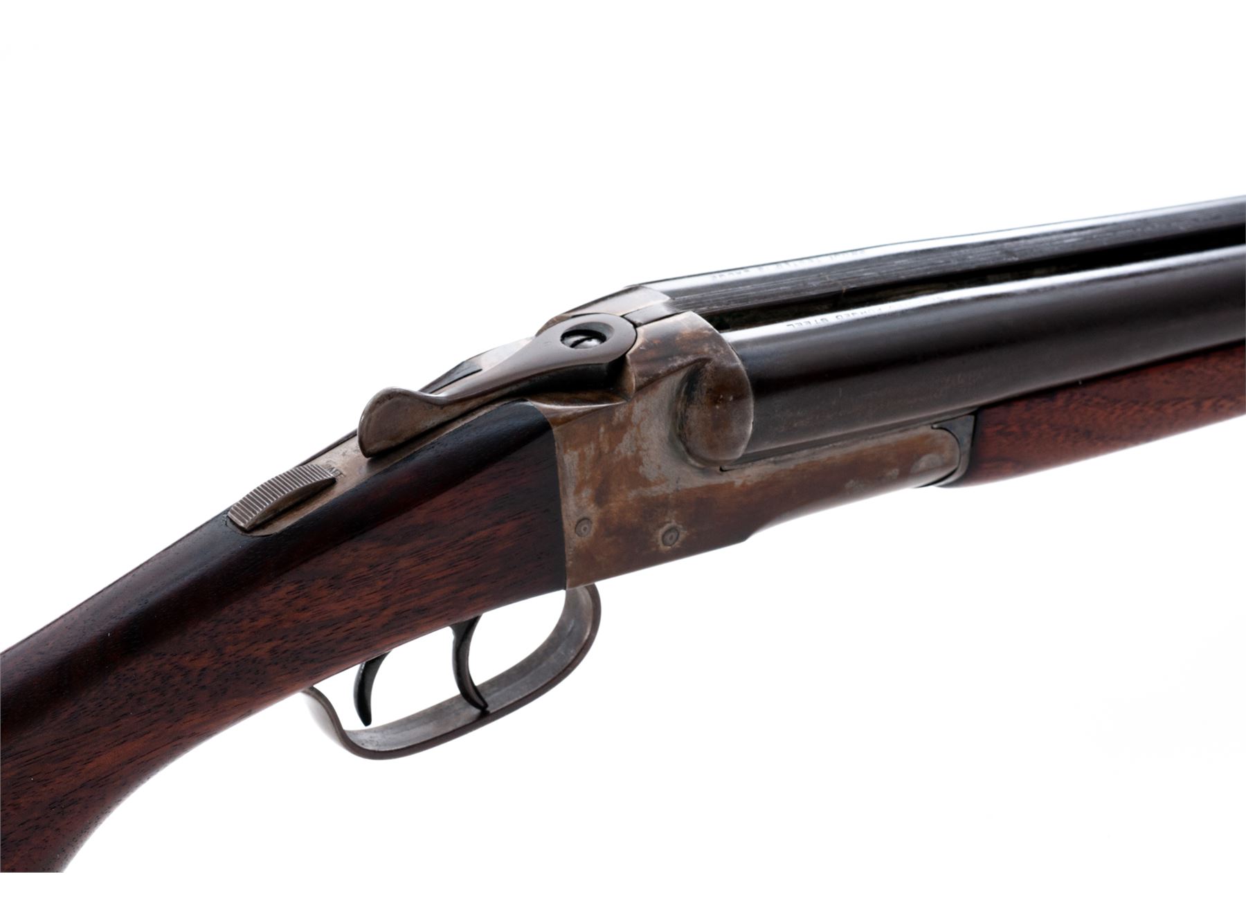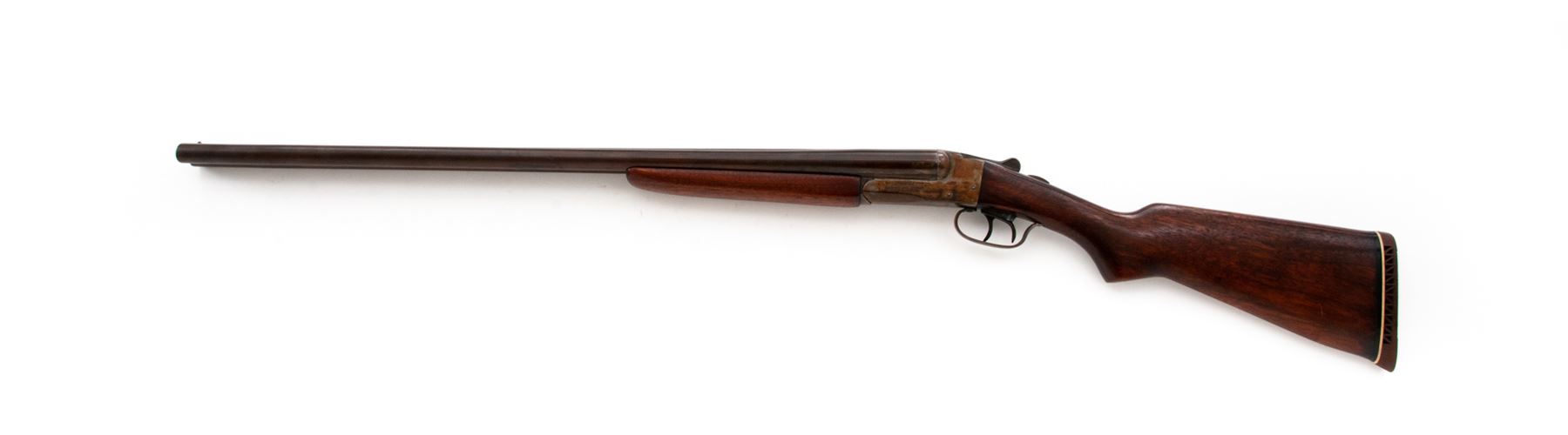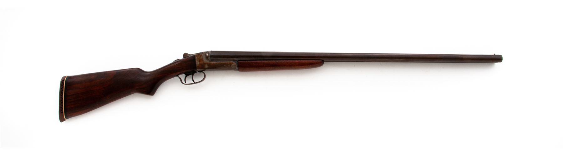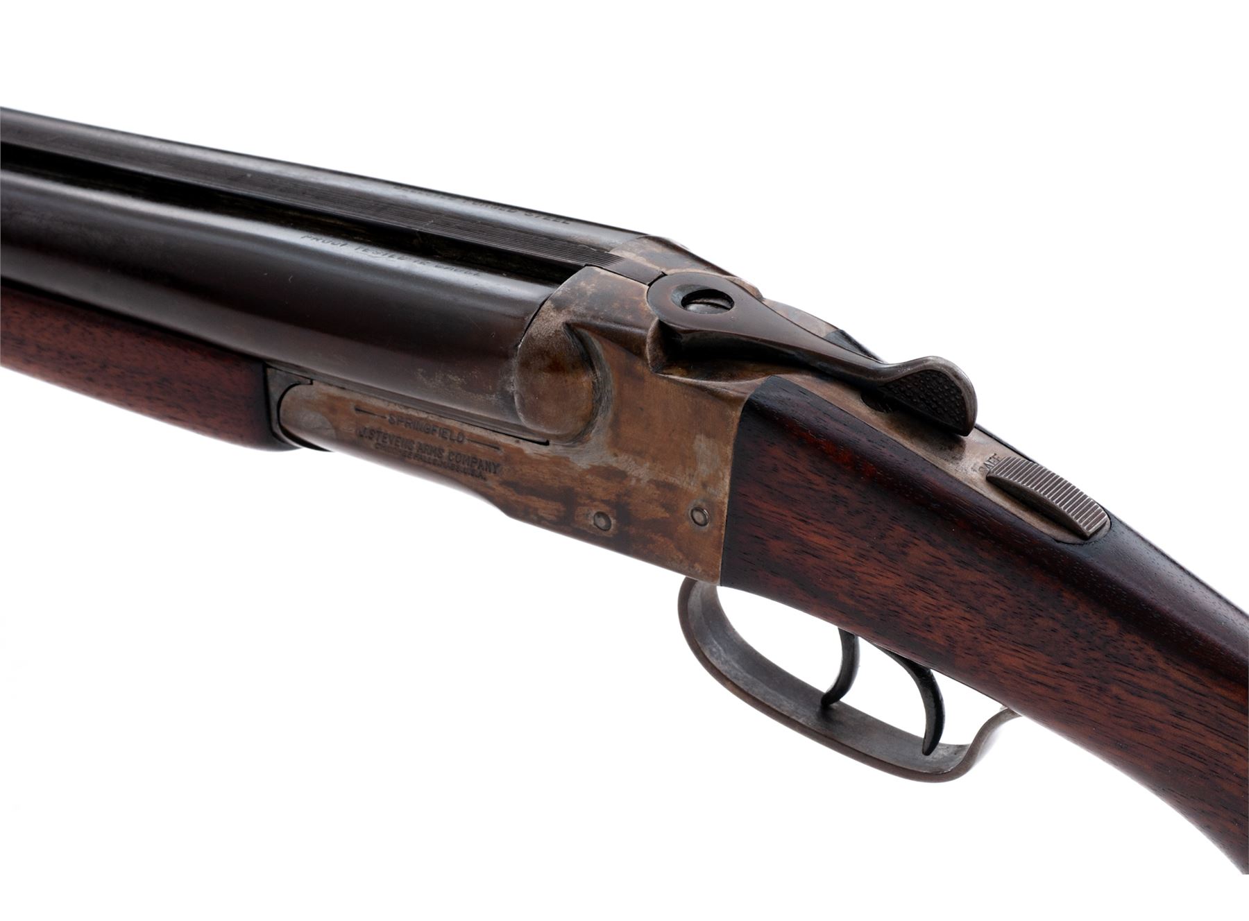 Stevens-Springfield Side-by-Side Double Barrel Shotgun, #E76418, 12 ga., 30'' barrels with bead front sight on full-length grooved rib and auto extractors are choked M/IM, marked ''Selected Forged Steel'' on right and ''Proof Tested 12 Gauge'' on left; steel receiver marked ''Springfield'' over J. Stevens name and address in three lines; plain varnished walnut forend and pistol-grip buttstock with rubber pad. Condition is very good, the barrels retaining most of what may be a later brown finish, the receiver gunmetal gray with what appears to be a wiped brownish stain overall. Stocks are smooth and solid having pleasing grain and color. Action functions, bores are bright. Est.: $250-$350. (C&R)