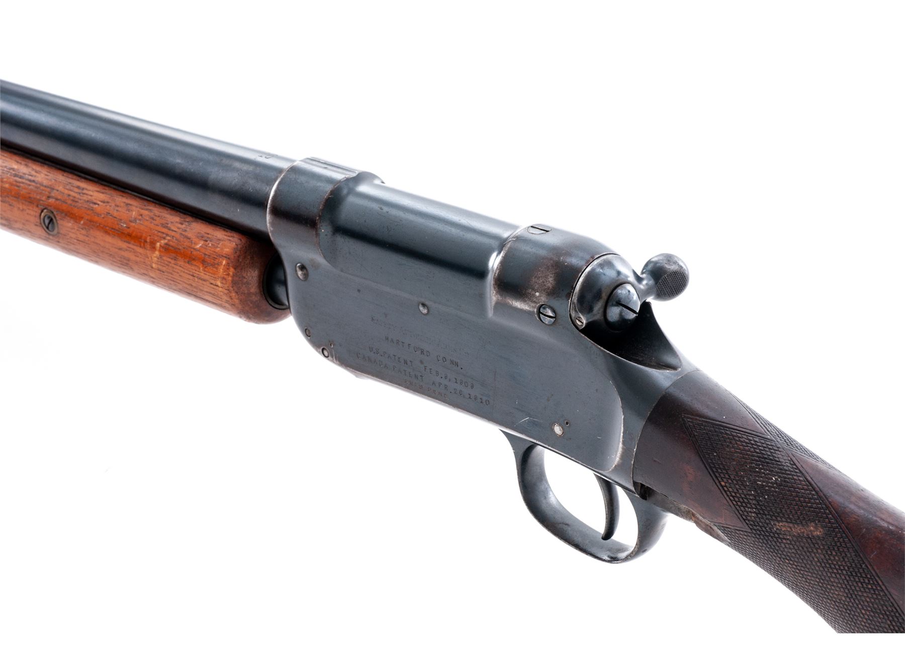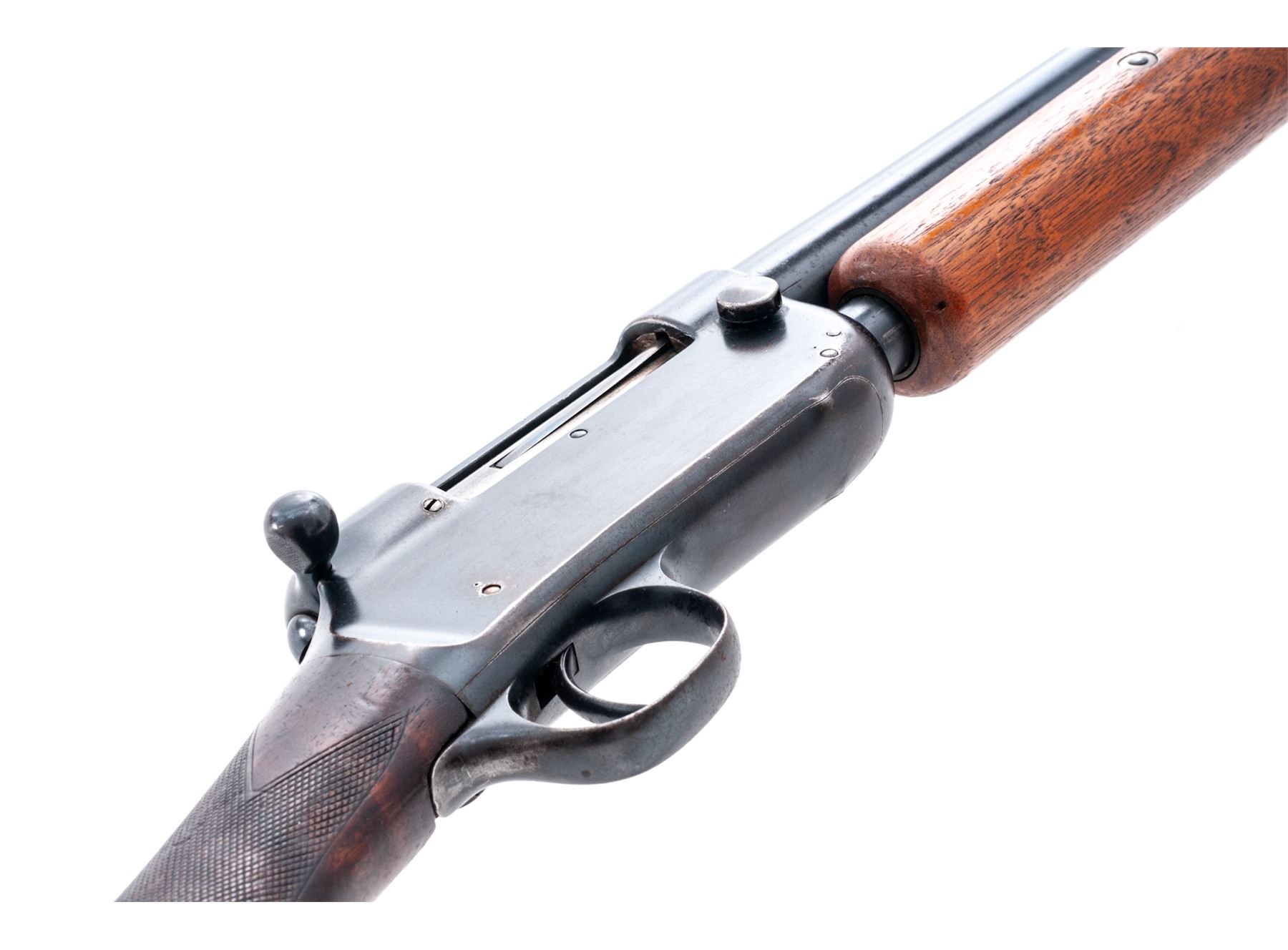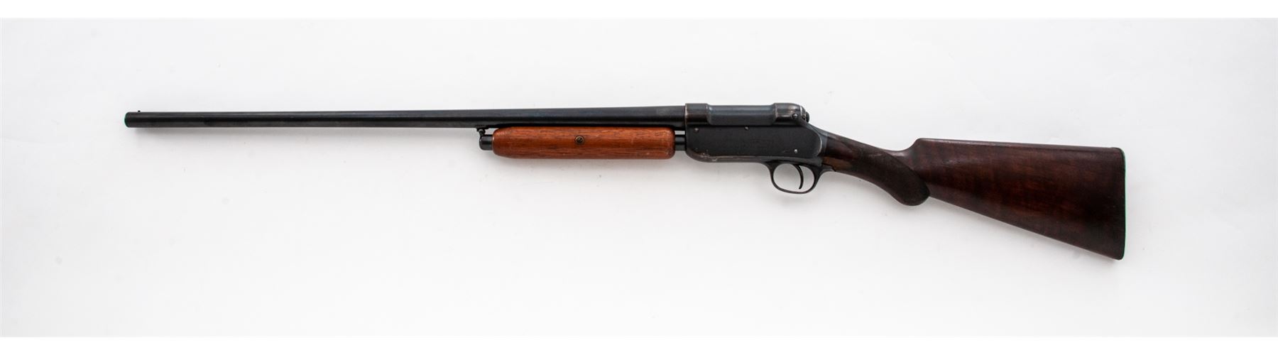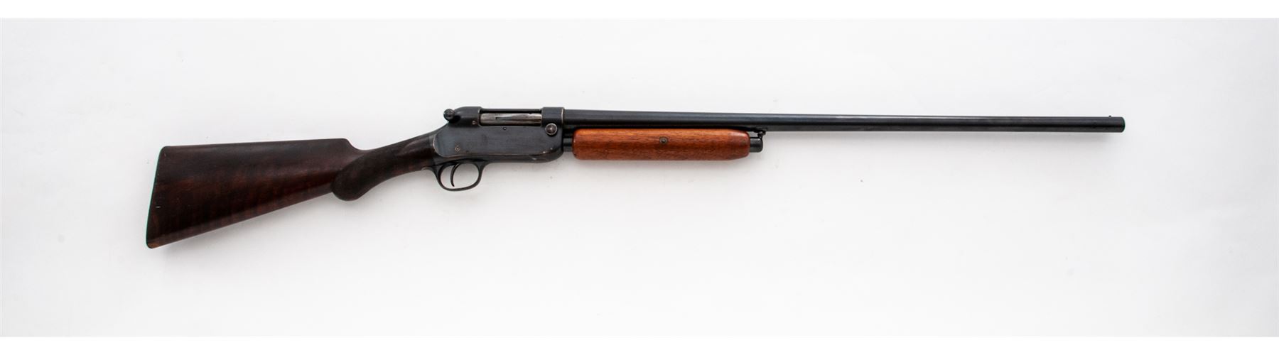 Safety Automatic Arms Co. Bolt Action Single Shot Shotgun, NVSN, 16 ga., blued 28'' barrel with post front sight choked IM; blued steel receiver marked on left side ''Safety Automatic Arms Co.'', with company address and U.S. and Canadian patents stamped with individual digits in 5 lines; blued actuating bolt with cartridge extractor, trigger and triggerguard; oil-stained hardwood forend and finely-checkered pistol-grip buttstock with plain steel buttplate. Condition is very good, the barrel retaining approx. 95% blue, the receiver and triggerguard with 75% blue blending with smooth brown patina. Forend is a lighter color (perhaps a replacement), buttstock with a deep chip out at left wrist and otherwise smooth age patina. Action is functional; bore is shiny. A rare one. Est.: $200-$400. (C&R)