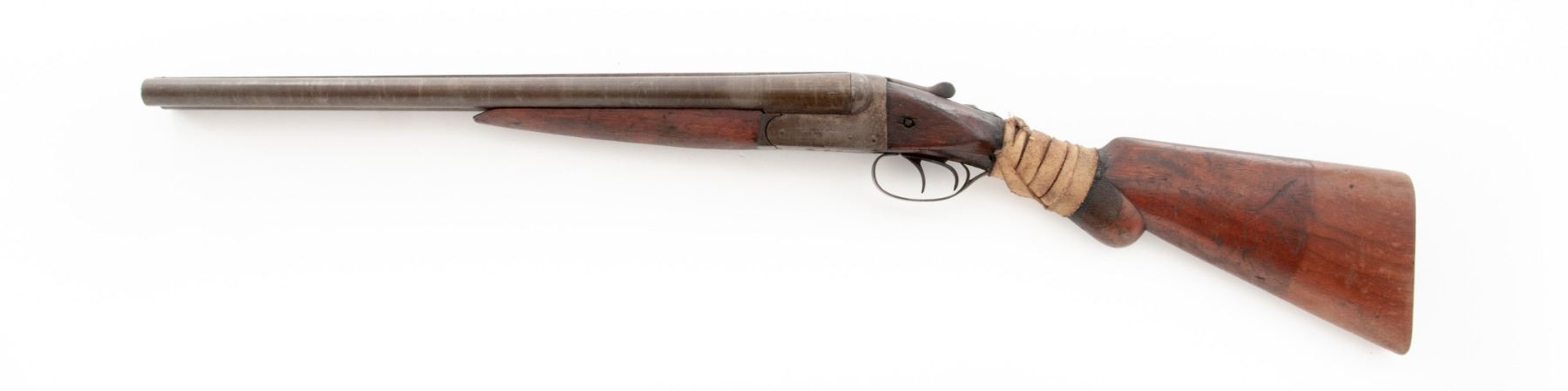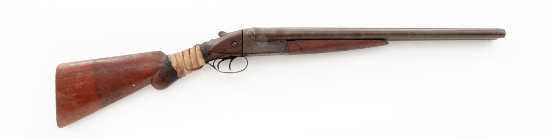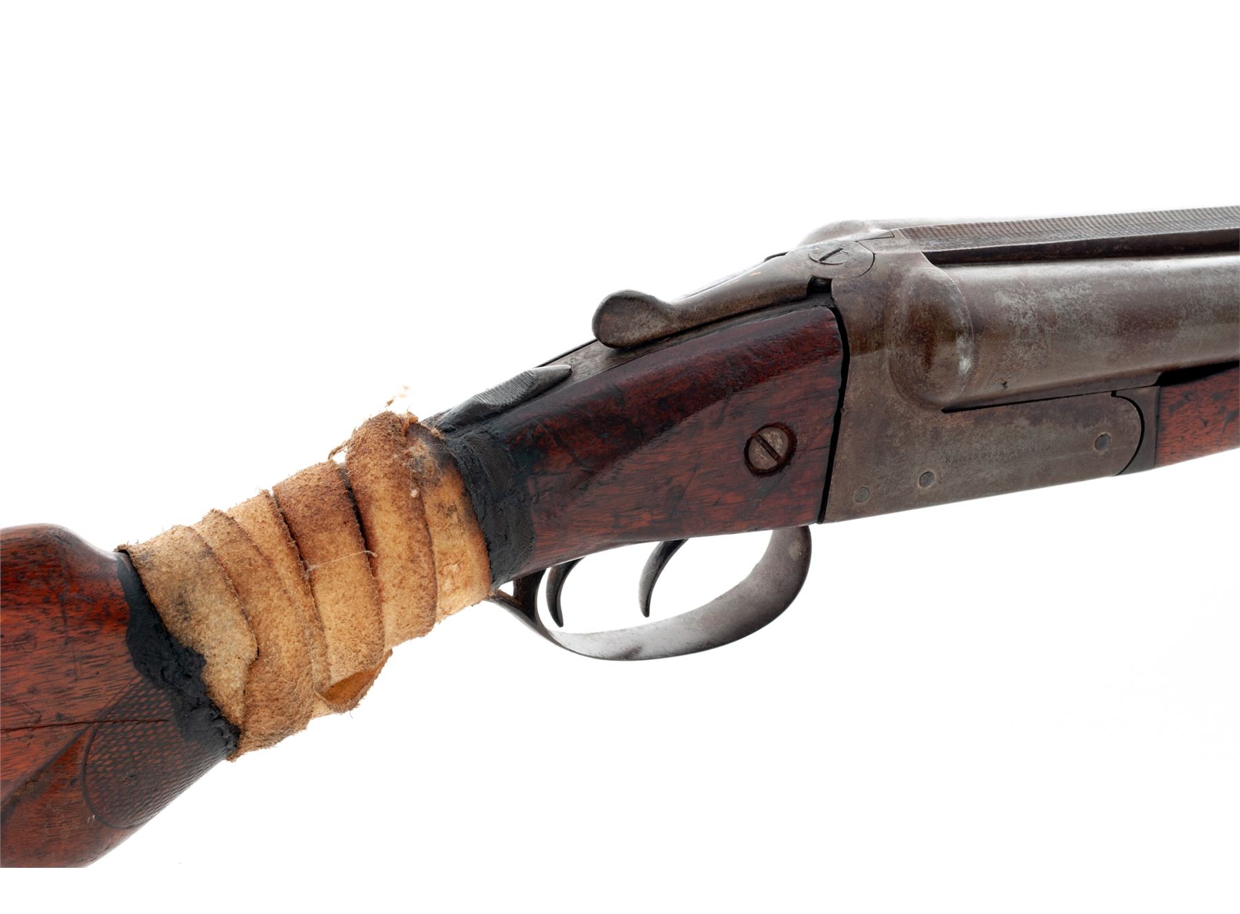 Remington Model 1900 Hammerless Double Barrel Cartridge Coach Gun-Shotgun, #366172, 12 ga., 20'' Damascus twist barrels with brass bead front sight on matted top rib and automatic ejectors; steel receiver with sliding rear safety is marked ''Remington Arms Co.'' on both sides; double triggers; oil-stained and checkered walnut splinter-type forend and pistol-grip buttstock. Condition is about good, the metal parts smooth gunmetal gray and the stocks showing wear and a leather wrap at wrist where likely once broken. Receiver with spurious ''W F & Co/Express'' markings on bottom. Missing buttplate. Sliding safety is frozen; action does not function; bores are mostly bright. Est.: $150-$250. (C&R)