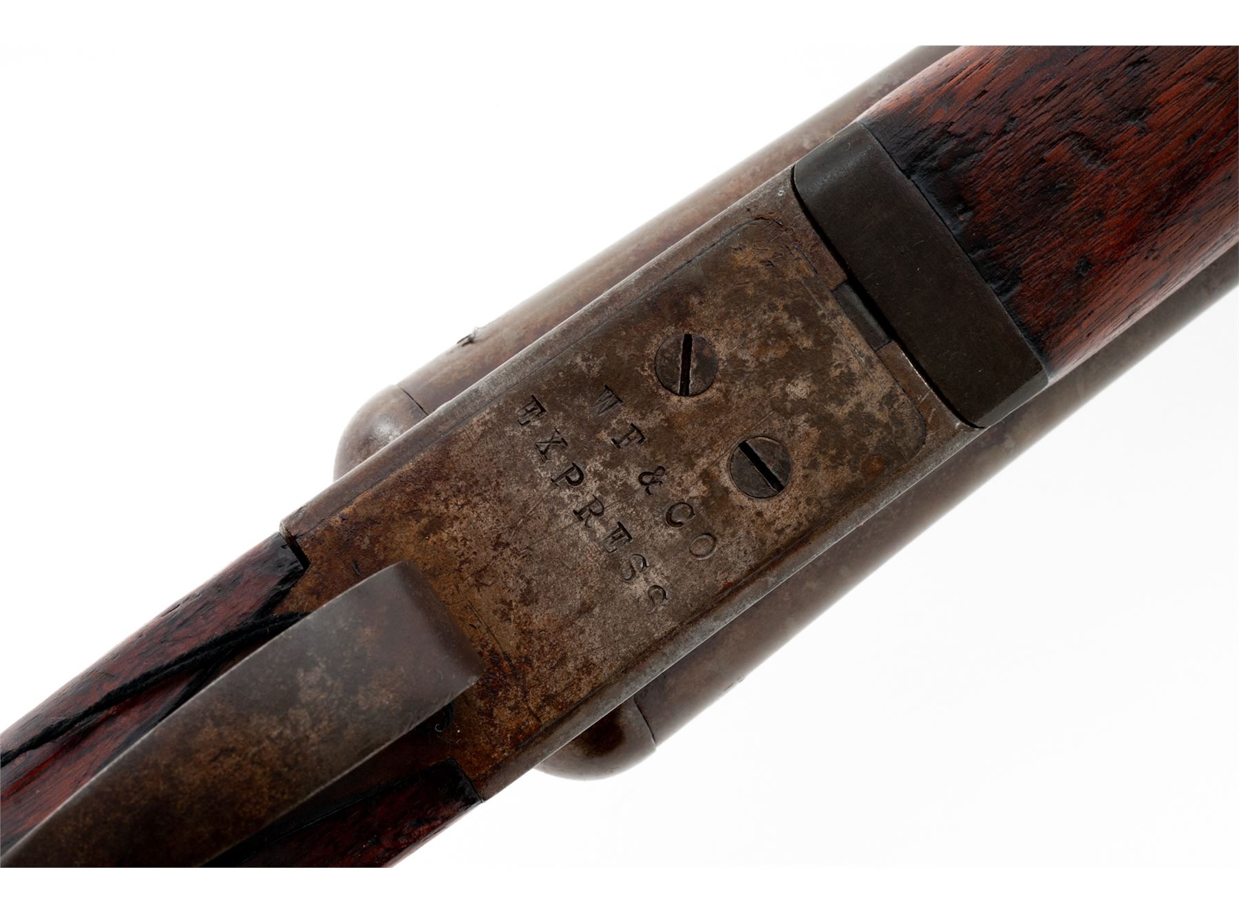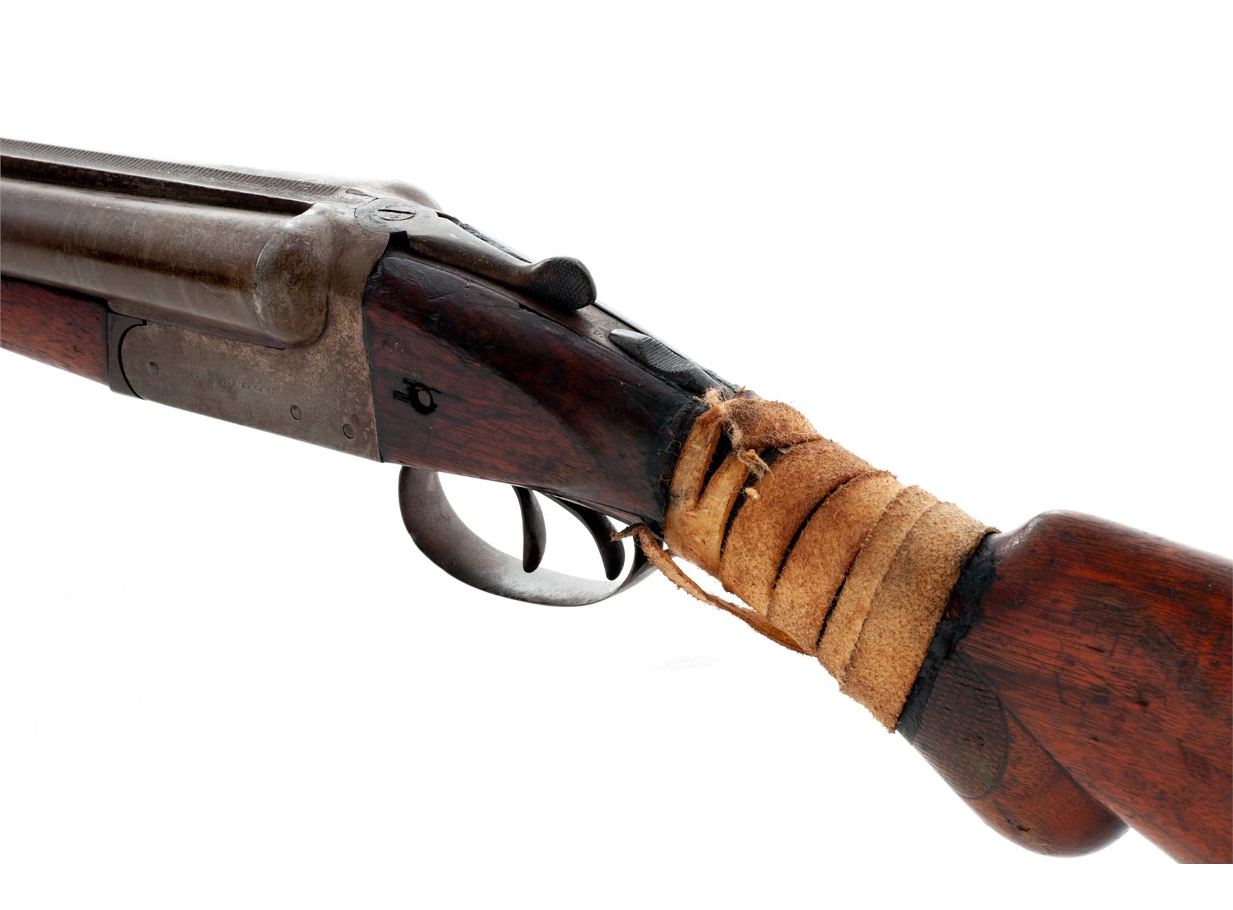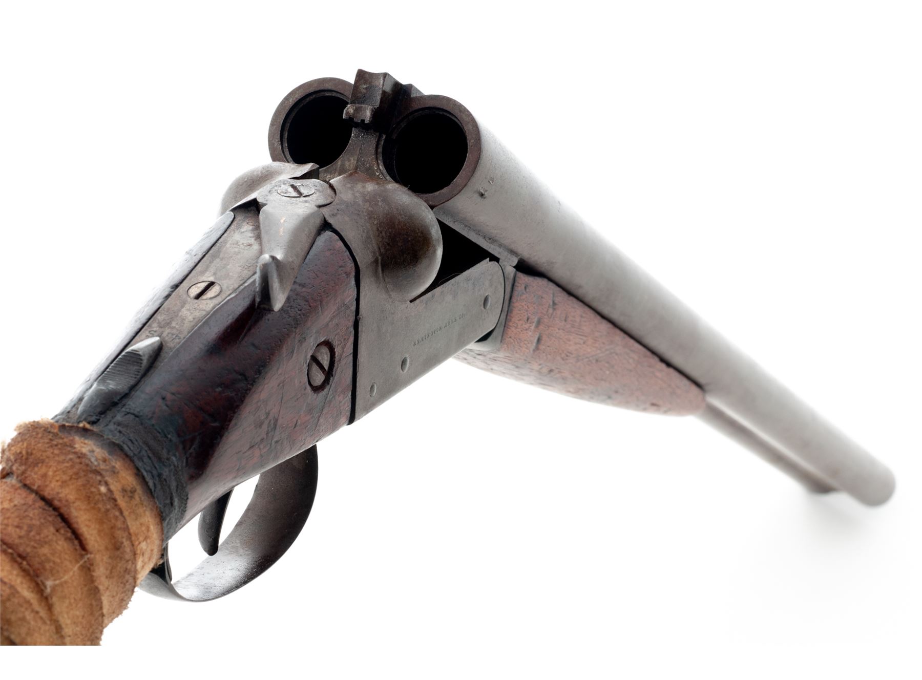 Remington Model 1900 Hammerless Double Barrel Cartridge Coach Gun-Shotgun, #366172, 12 ga., 20'' Damascus twist barrels with brass bead front sight on matted top rib and automatic ejectors; steel receiver with sliding rear safety is marked ''Remington Arms Co.'' on both sides; double triggers; oil-stained and checkered walnut splinter-type forend and pistol-grip buttstock. Condition is about good, the metal parts smooth gunmetal gray and the stocks showing wear and a leather wrap at wrist where likely once broken. Receiver with spurious ''W F & Co/Express'' markings on bottom. Missing buttplate. Sliding safety is frozen; action does not function; bores are mostly bright. Est.: $150-$250. (C&R)