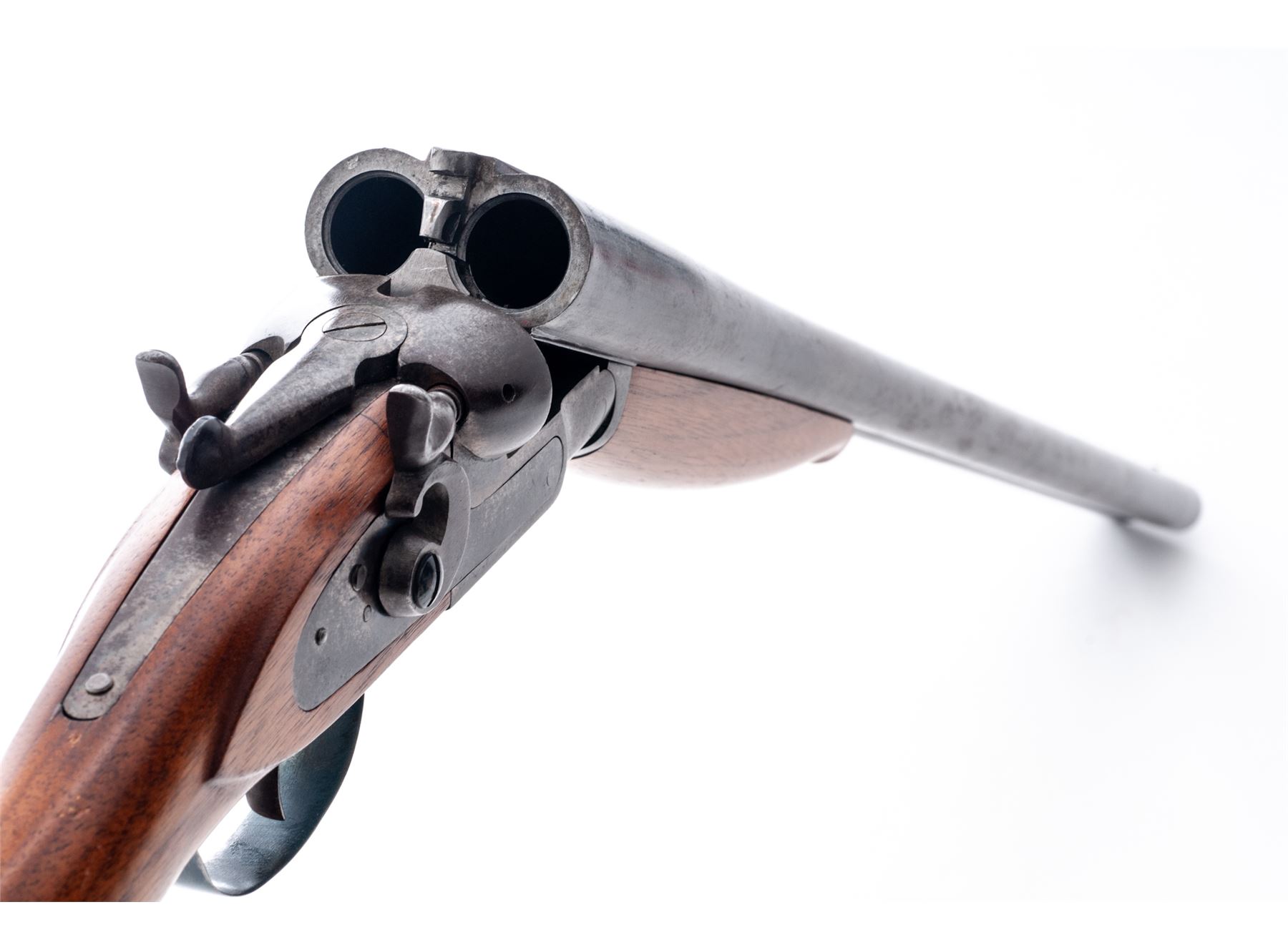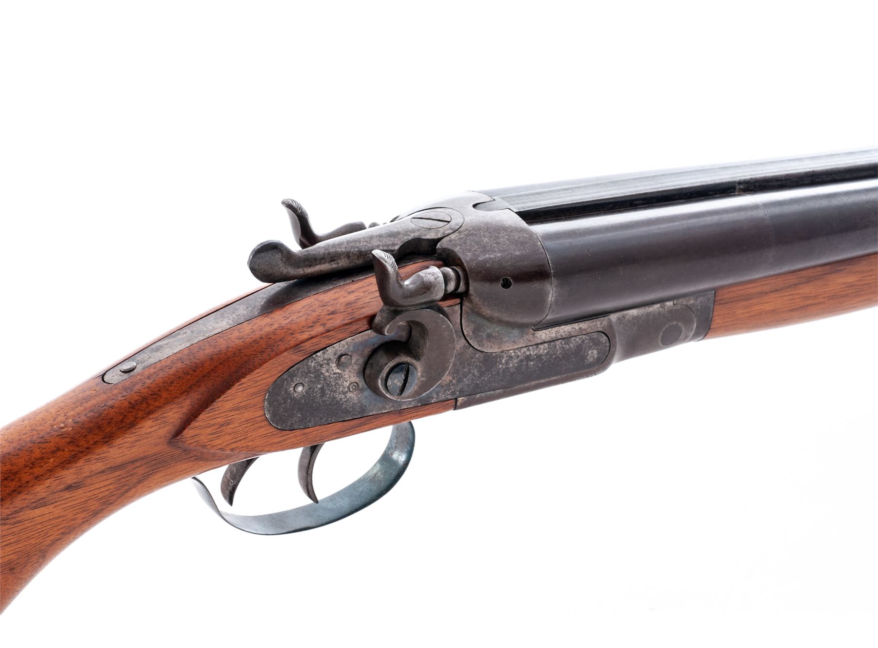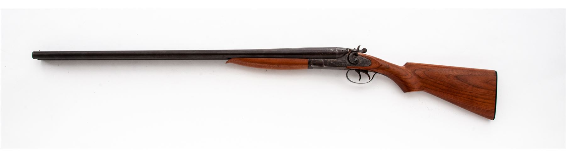 Hopkins & Allen Side-by-Side Double Barrel Shotgun, #23942, 12 ga., 30'' barrels with brass post front sight on matted top rib and auto extractors are choked IM/IM; exposed hammers, case hardened receiver with rebounding firing pins; varnished walnut forend and pistol-grip buttstock with checkered plastic buttplate. Condition is fine, the barrels retaining approx. 80% original blue blending into a smooth brown patina; the loop triggerguard with bright fire blue; the receiver showing traces of case colors. Stocks are sound and smooth showing a few use marks mainly to stock comb. Action is smooth; bores are shiny. Est.: $200-$350. (C&R)